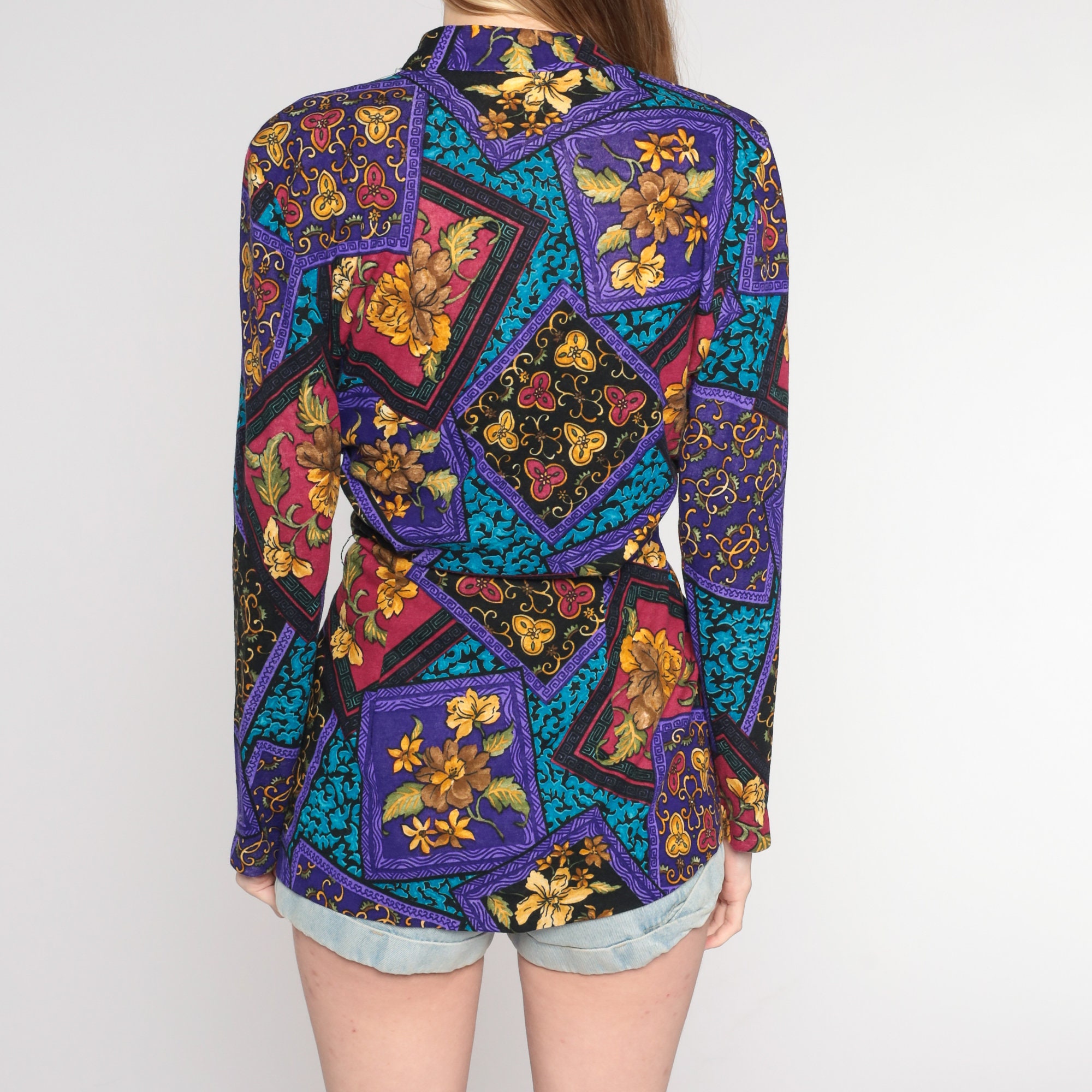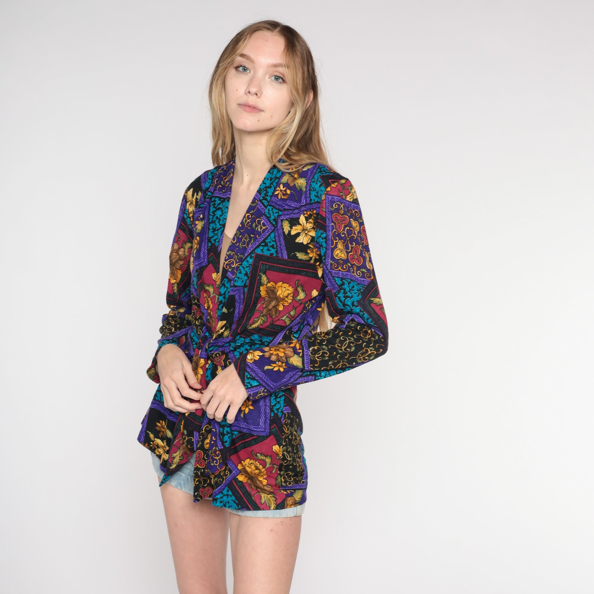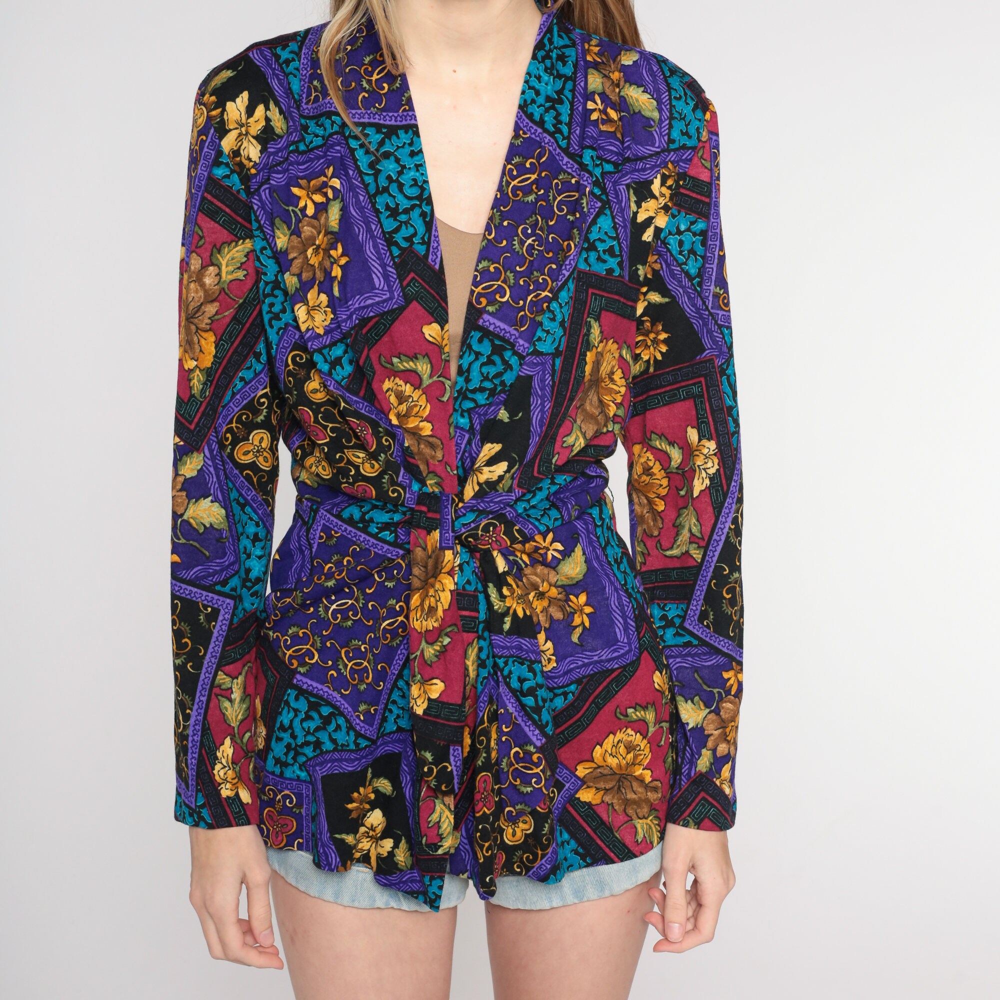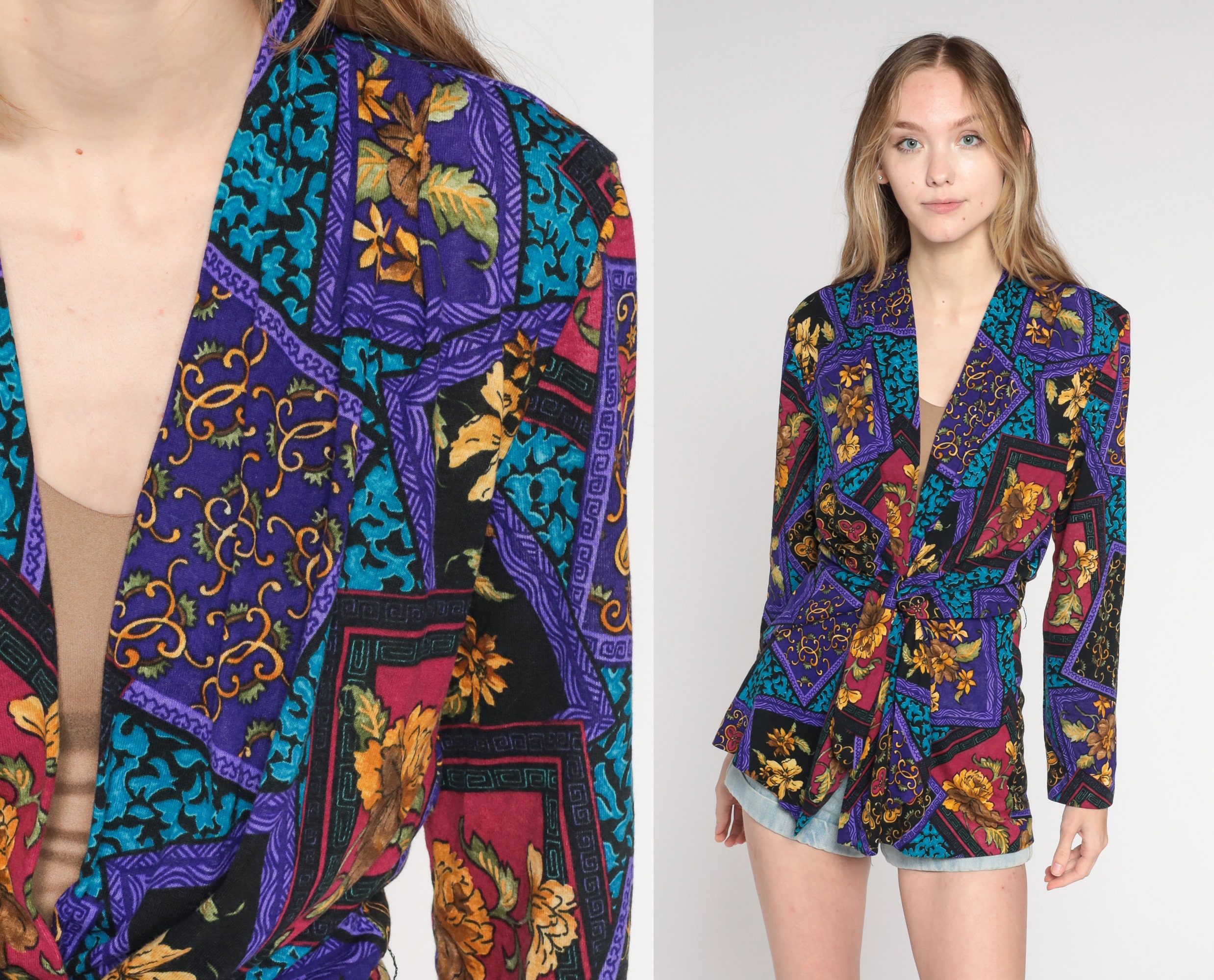 Vintage 80s blazer jacket in purple with a baroque floral print and a tie front.