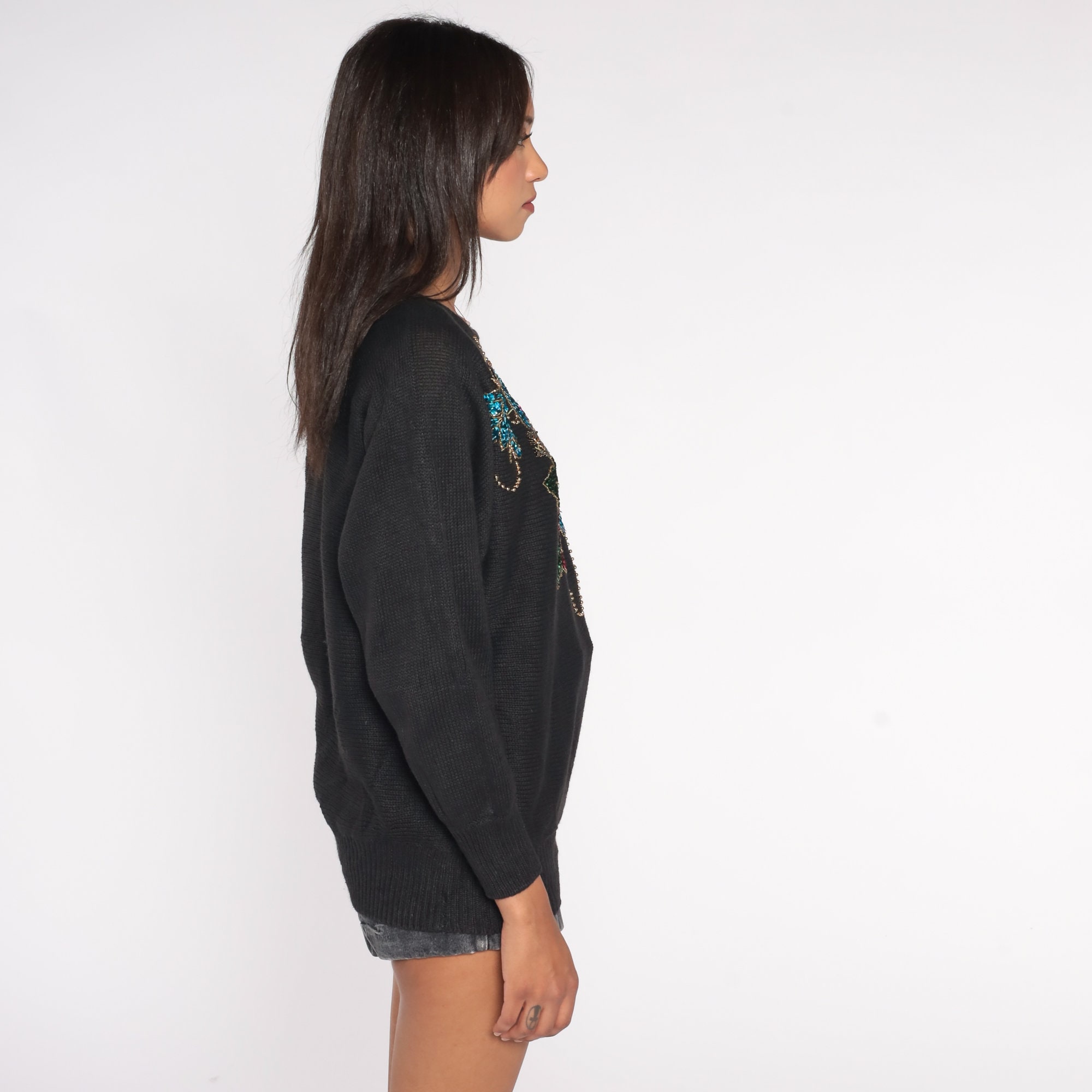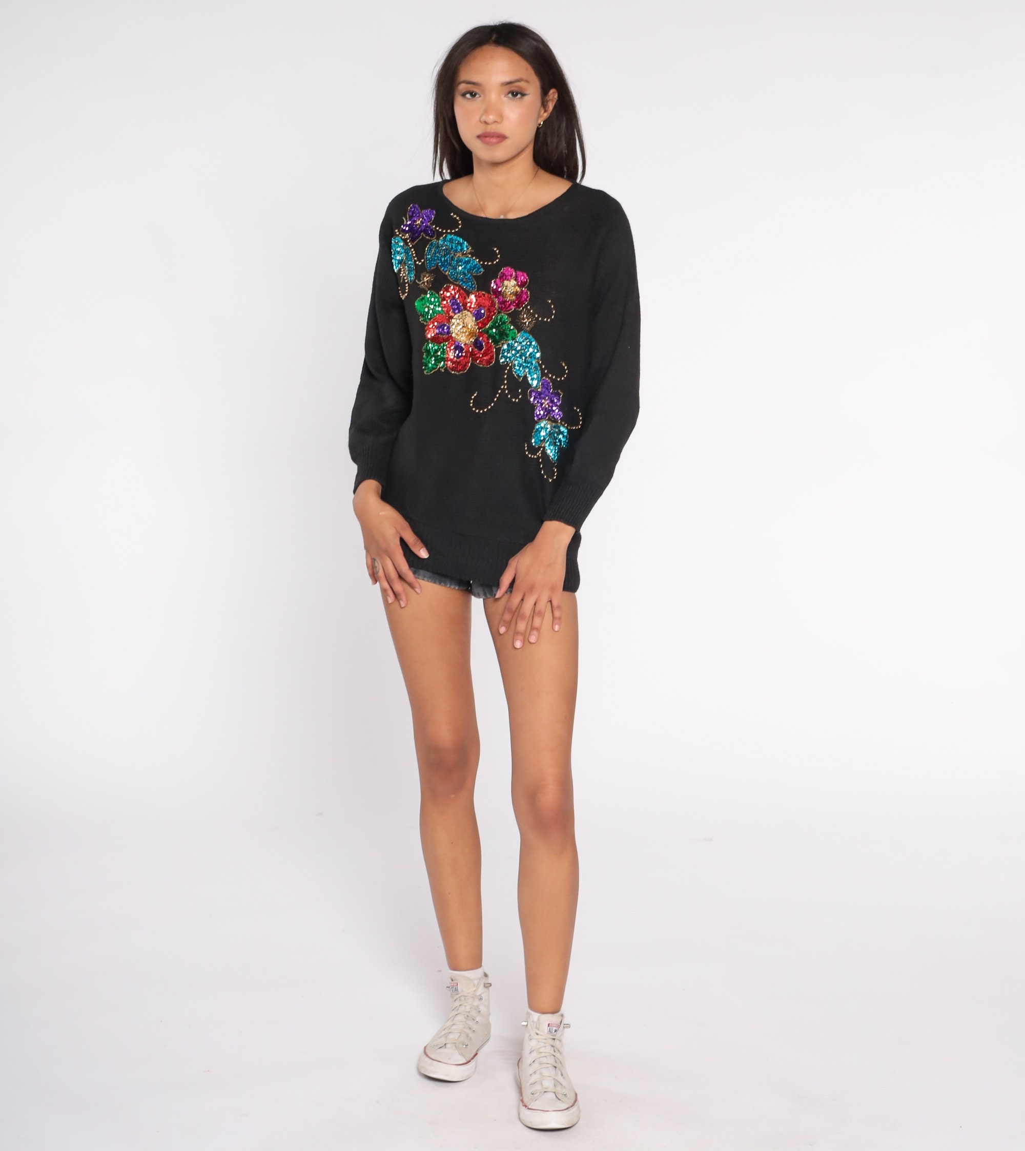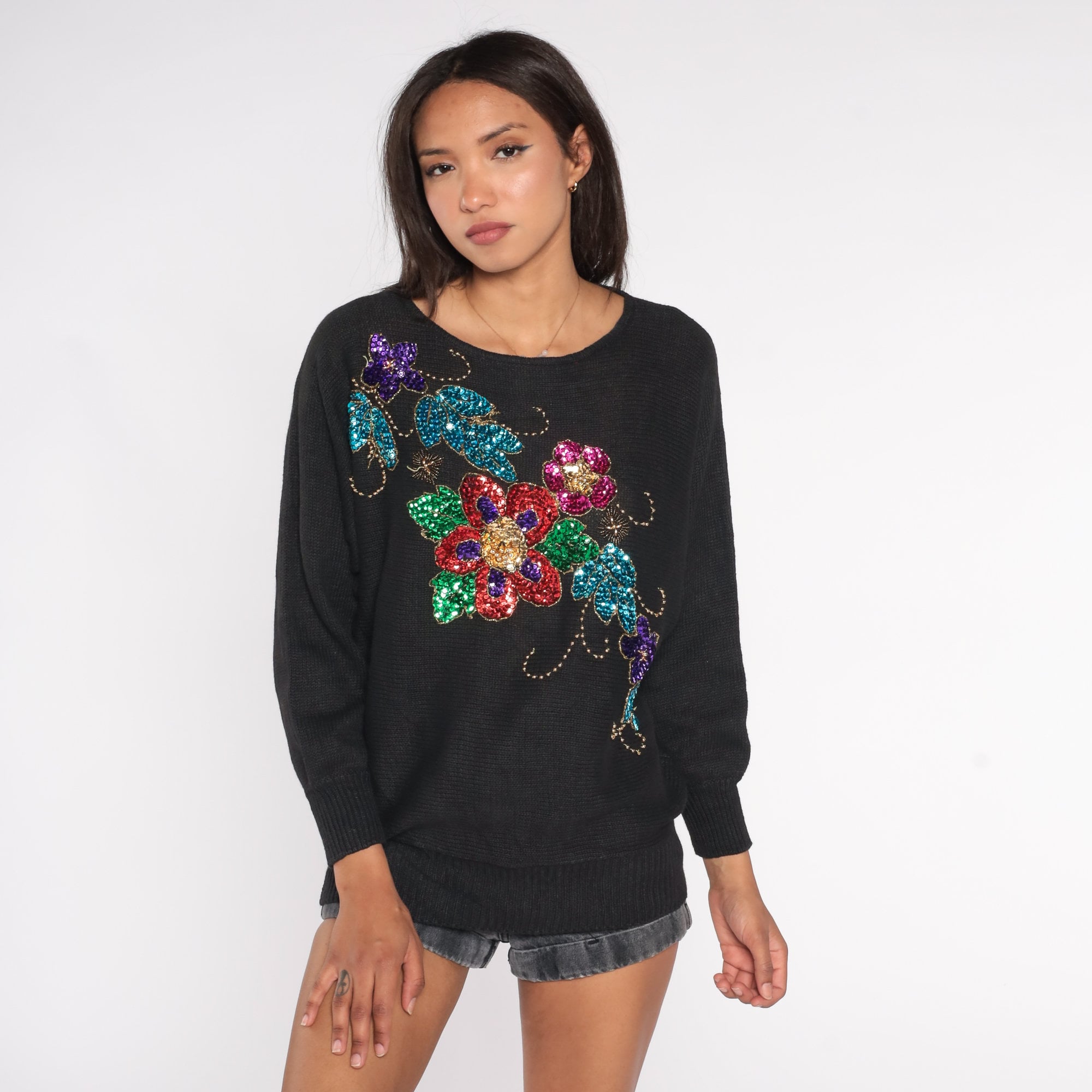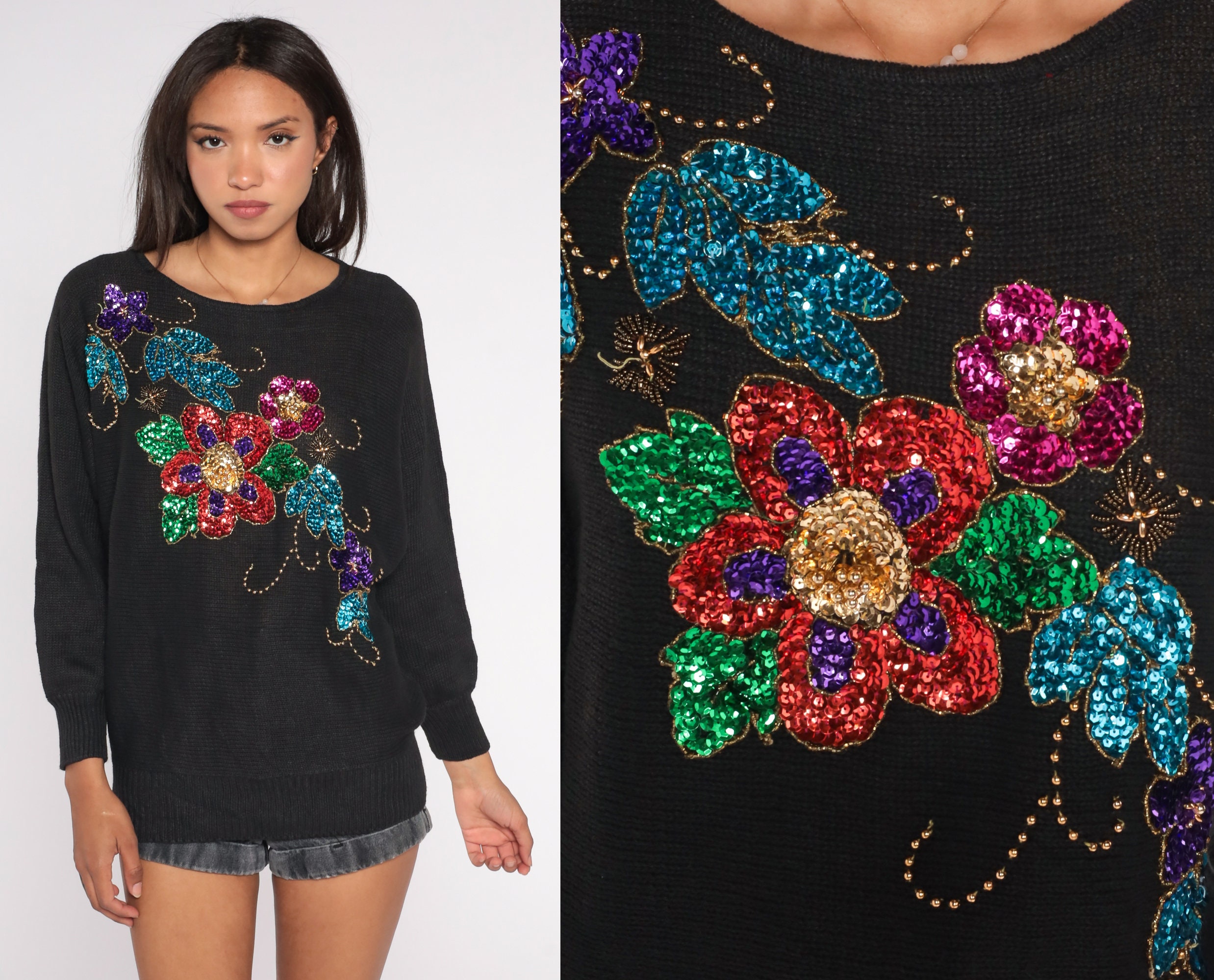 Vintage 90s sweater in black with a sequin floral print.