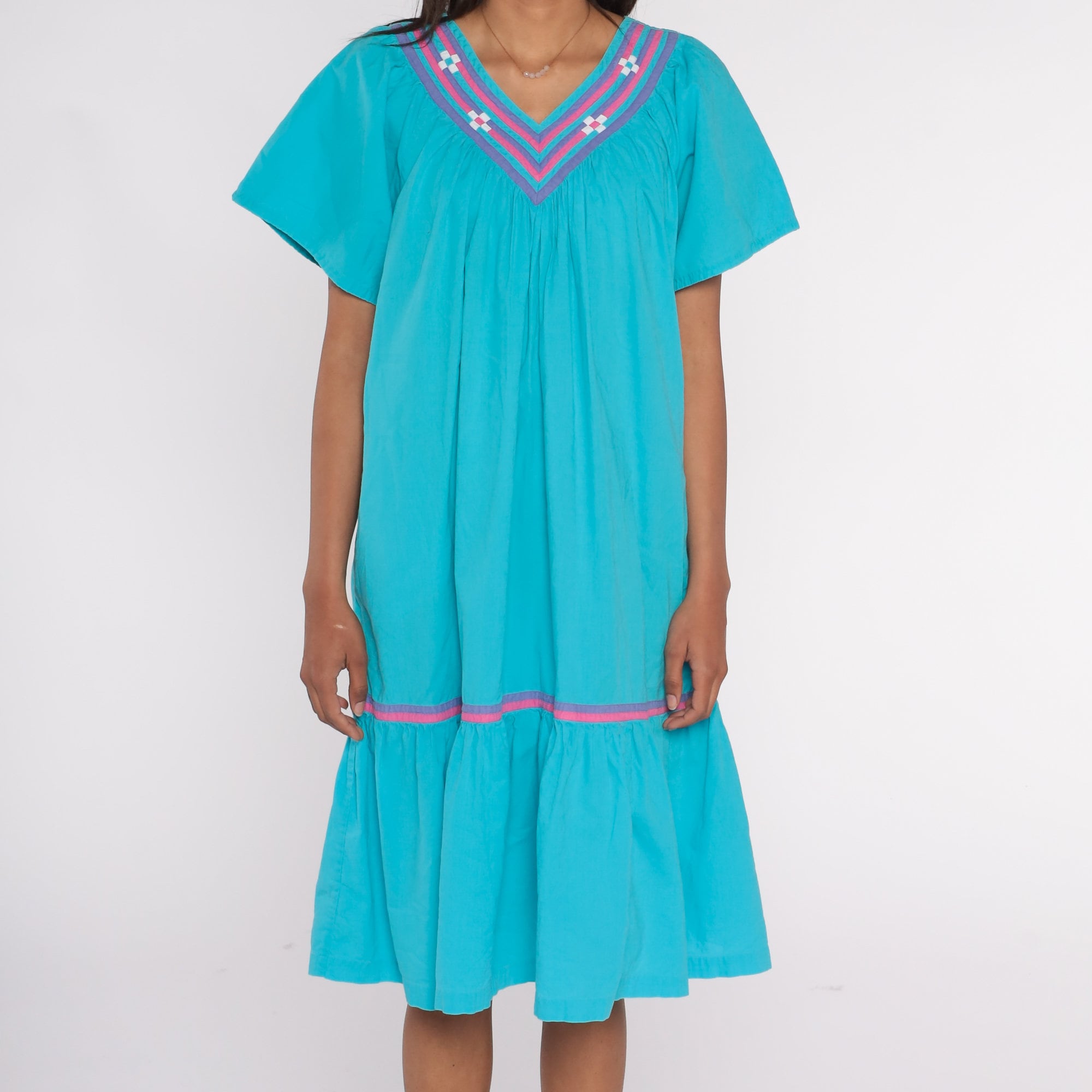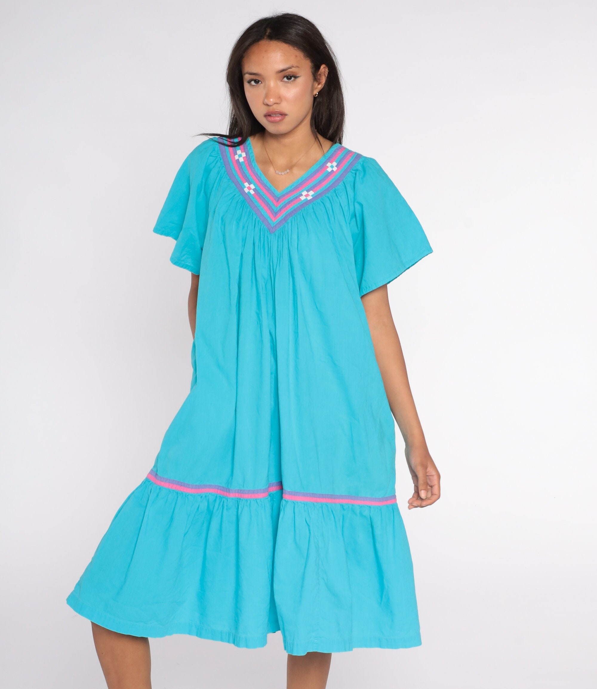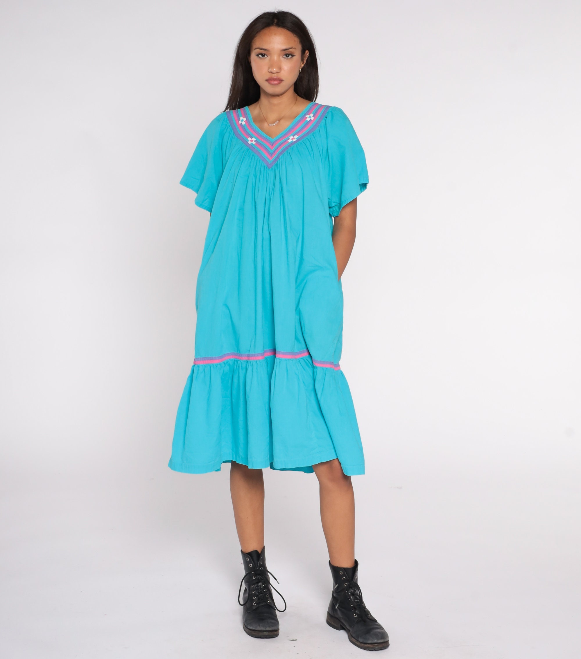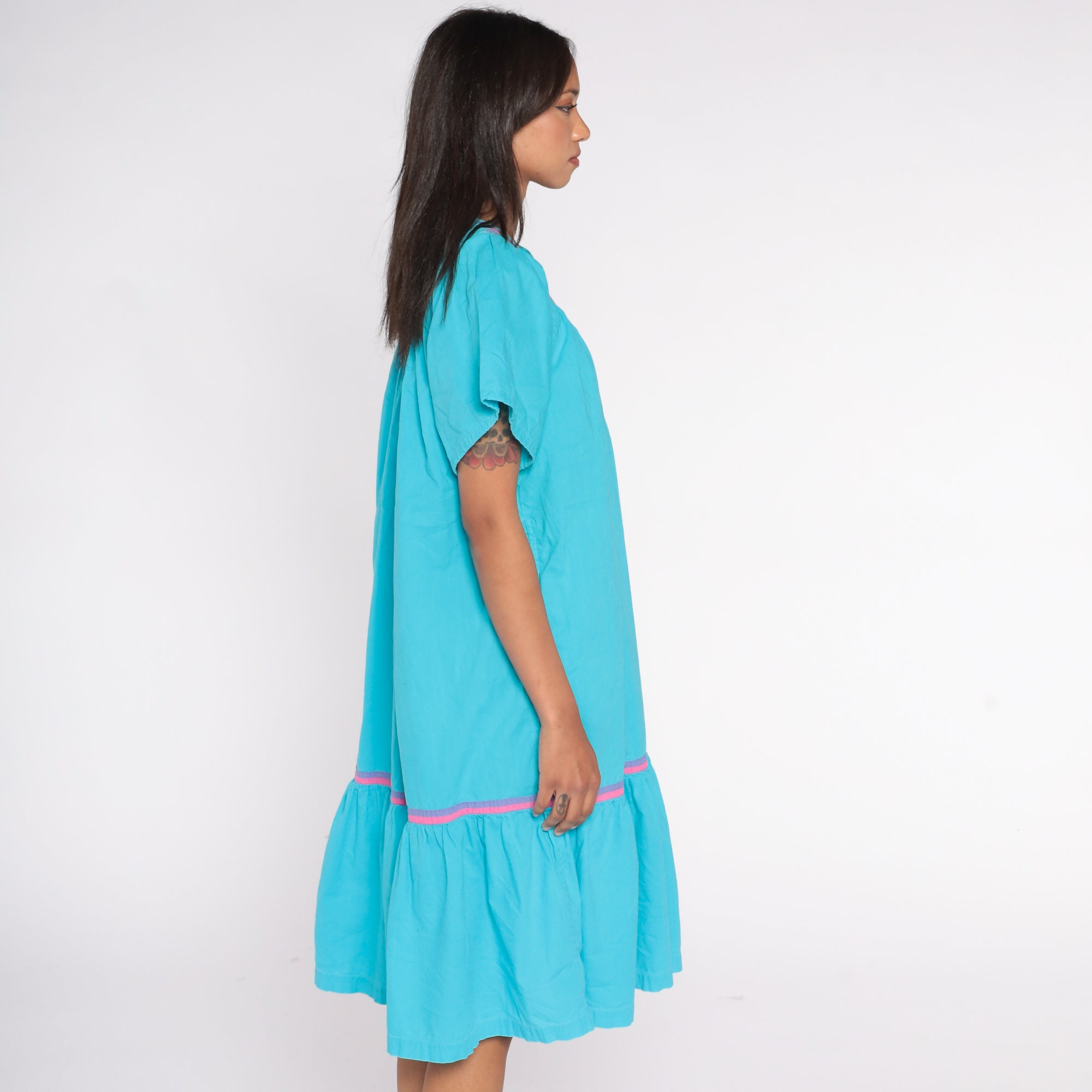 Vintage 90s dress in turquoise blue cotton with purple and pink trim. Trapeze tent cut with short sleeves and a tiered skirt. Midi length.
