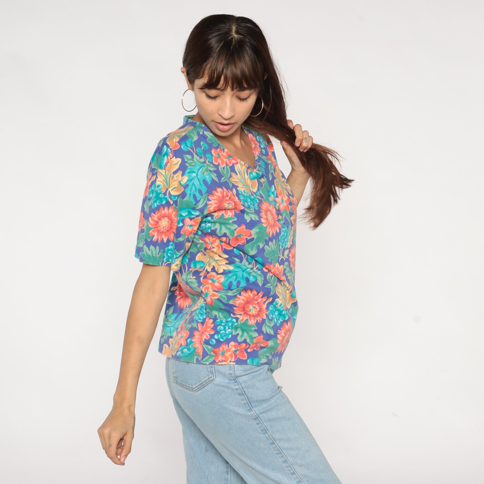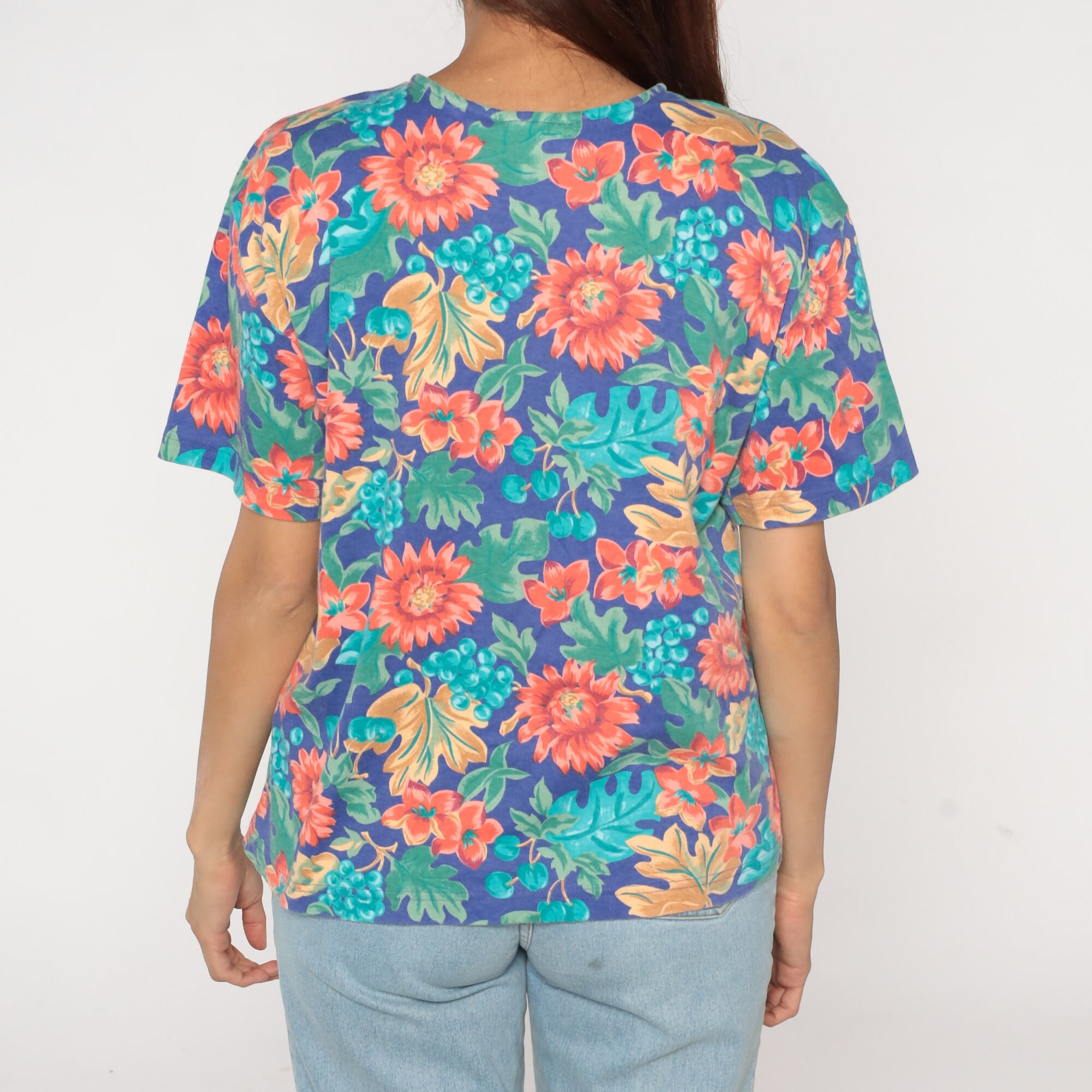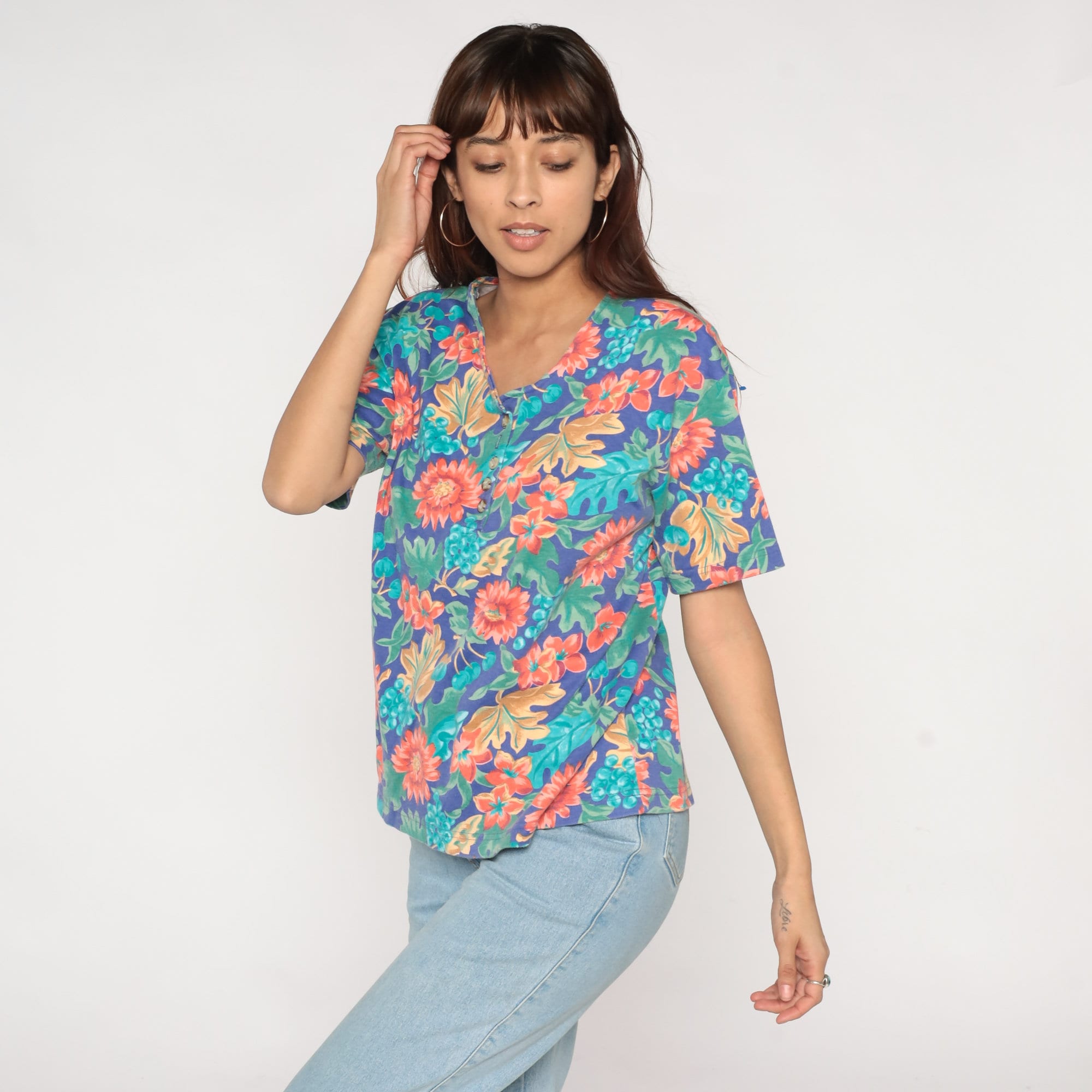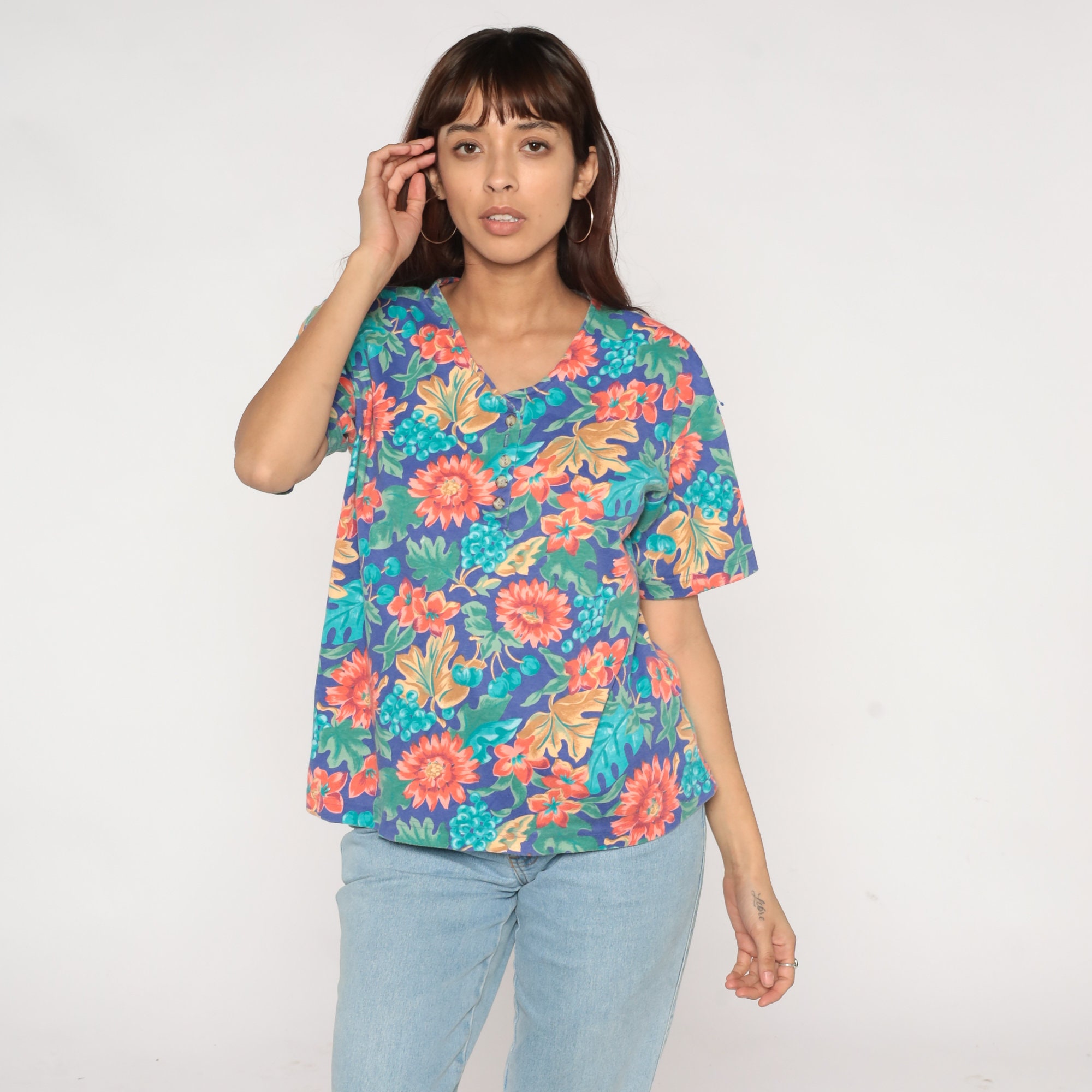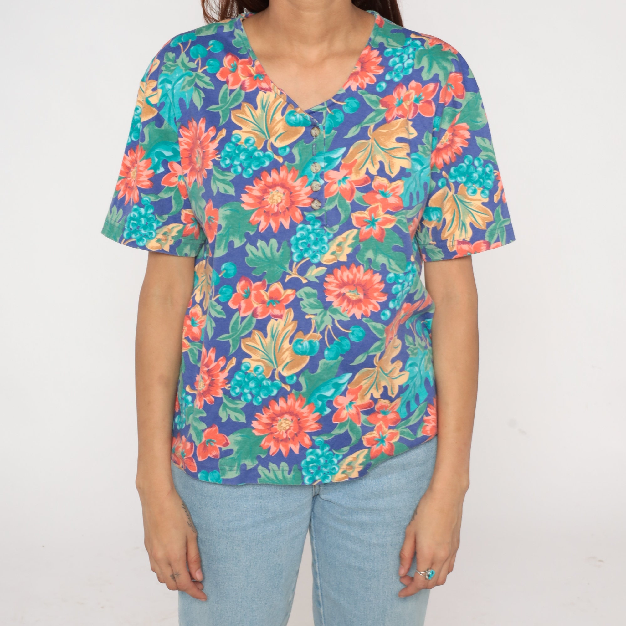 Vintage 90s shirt with a fruit and floral print. It has short sleeves and buttons up the front.