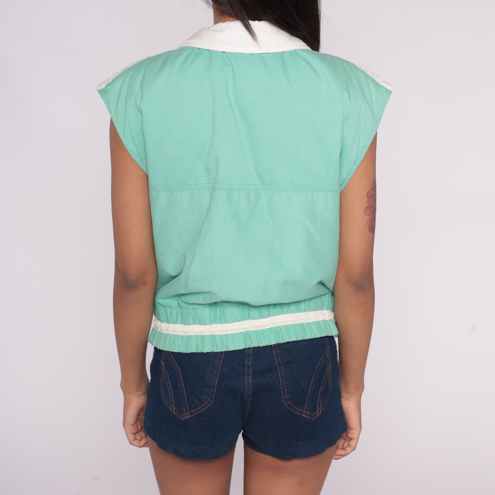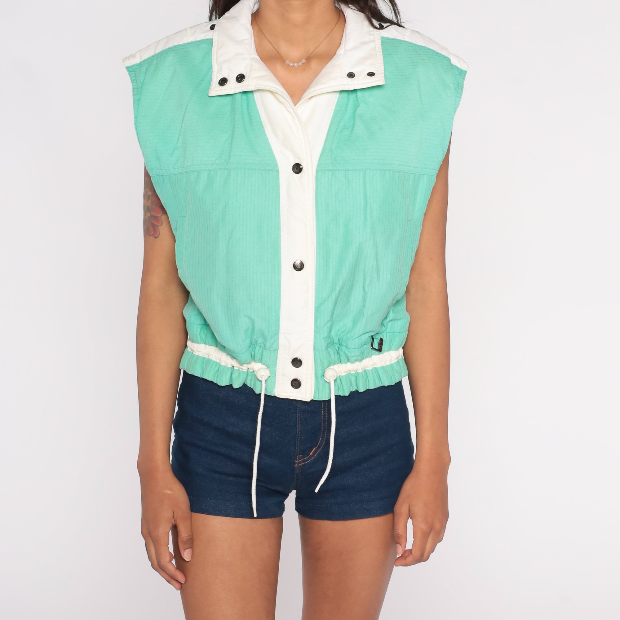 Vintage 80s ski vest in ribbed green with white trim. Snaps up the front with a drawstring at the waist.