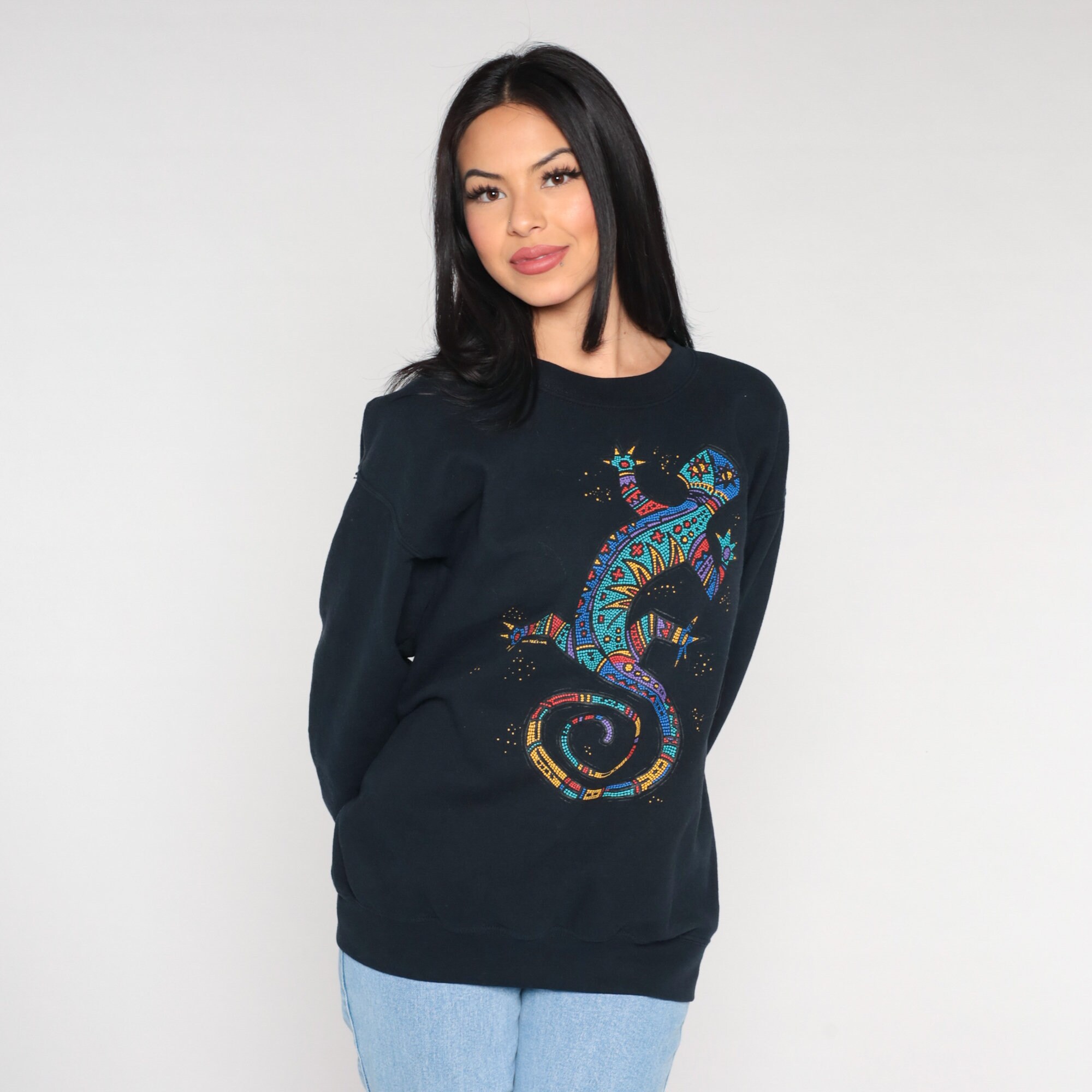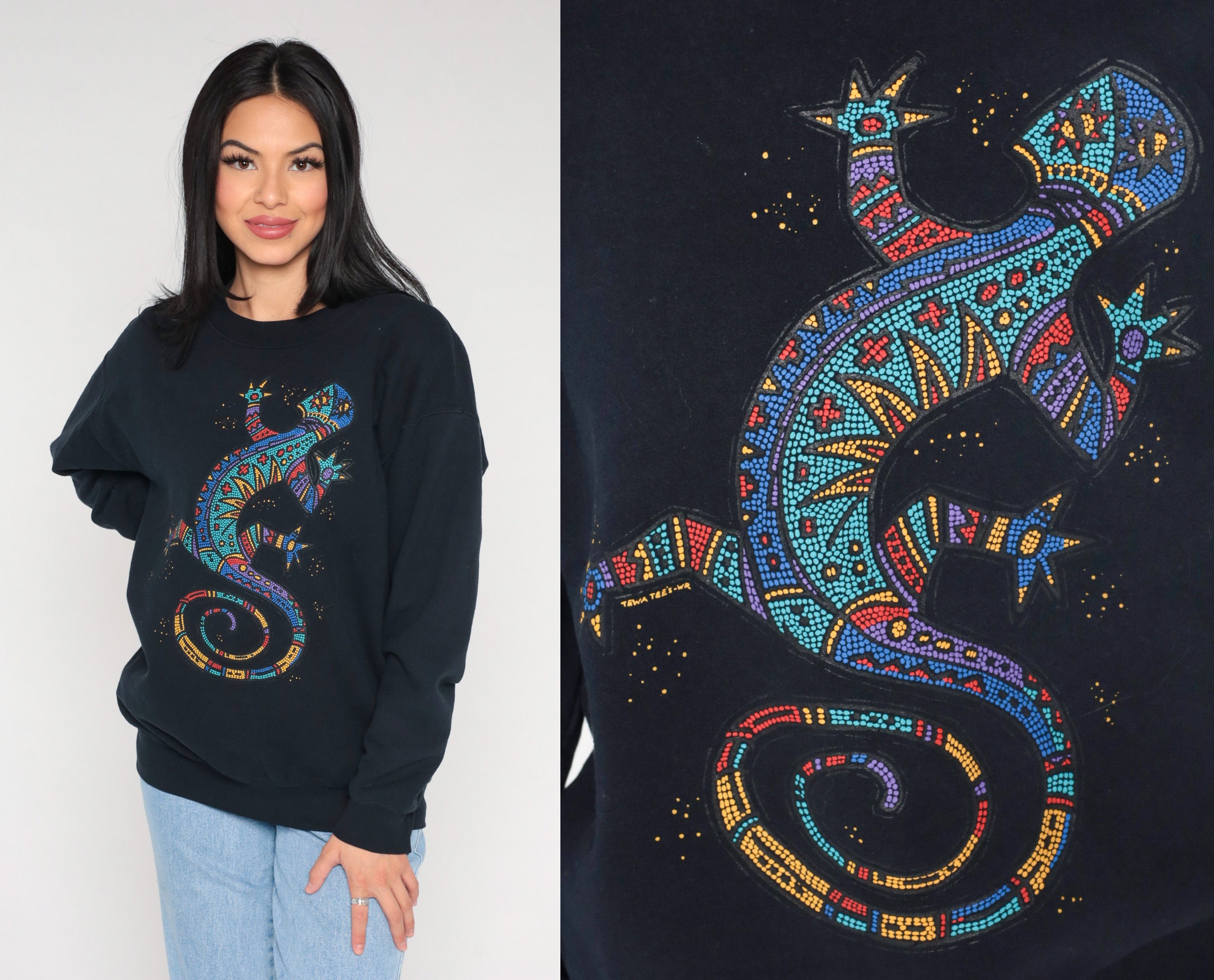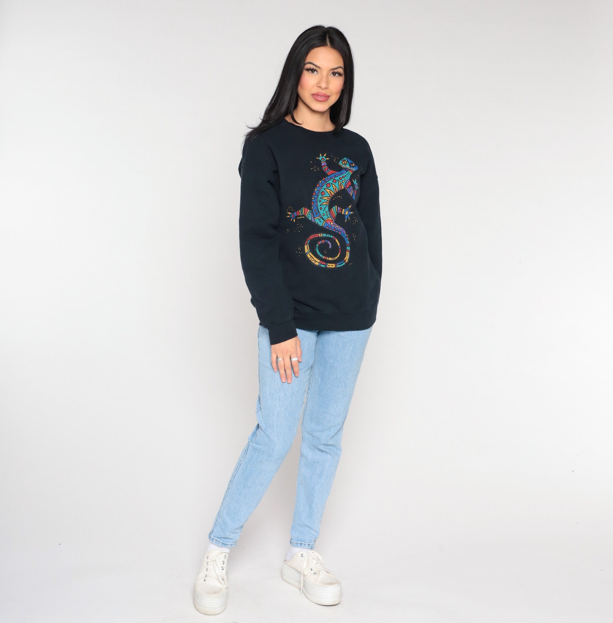 Y2k sweatshirt in black by Tewa Tees with a lizard or gecko print on the front.