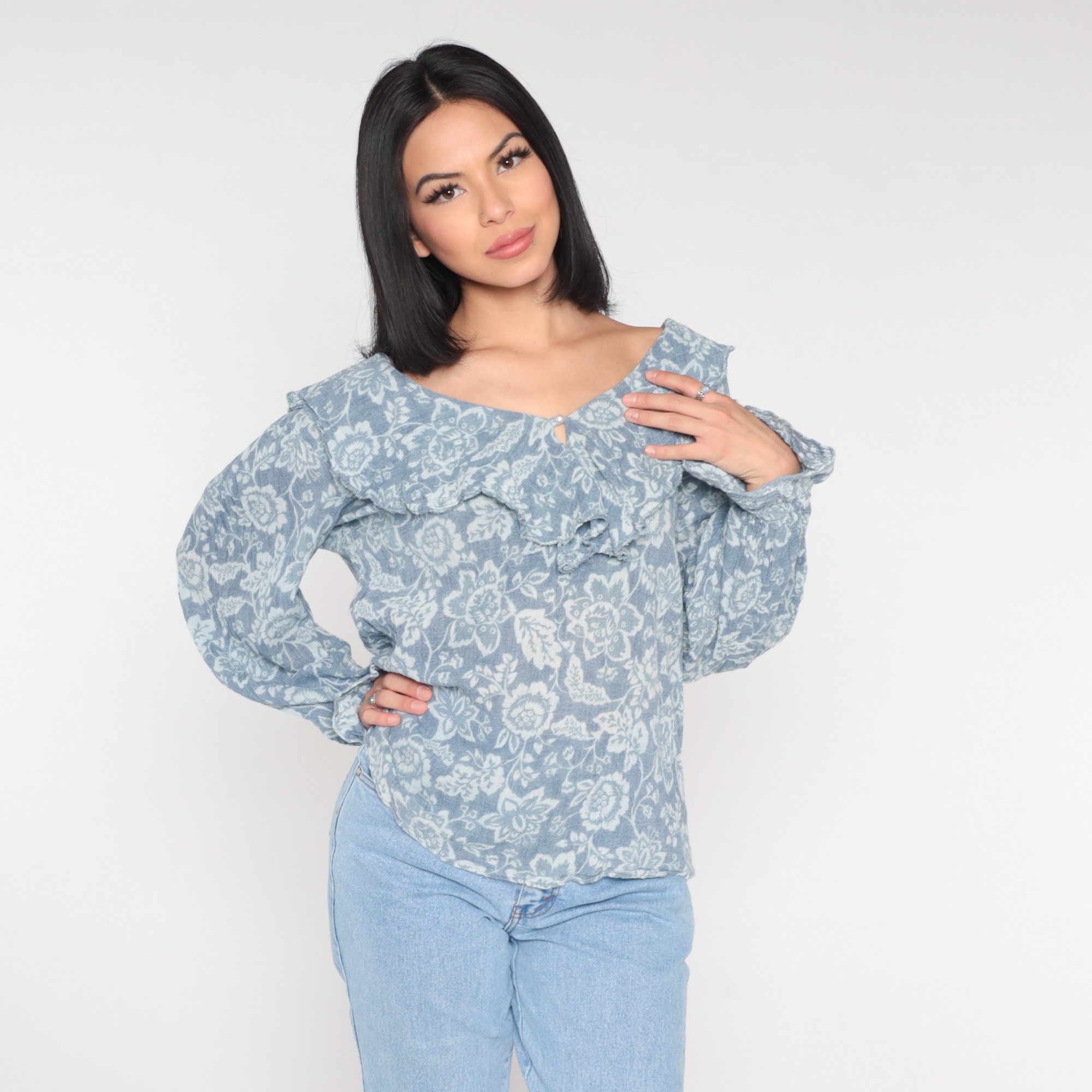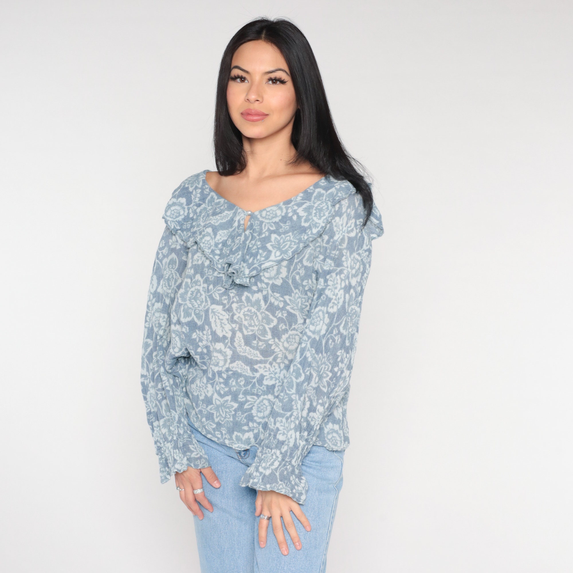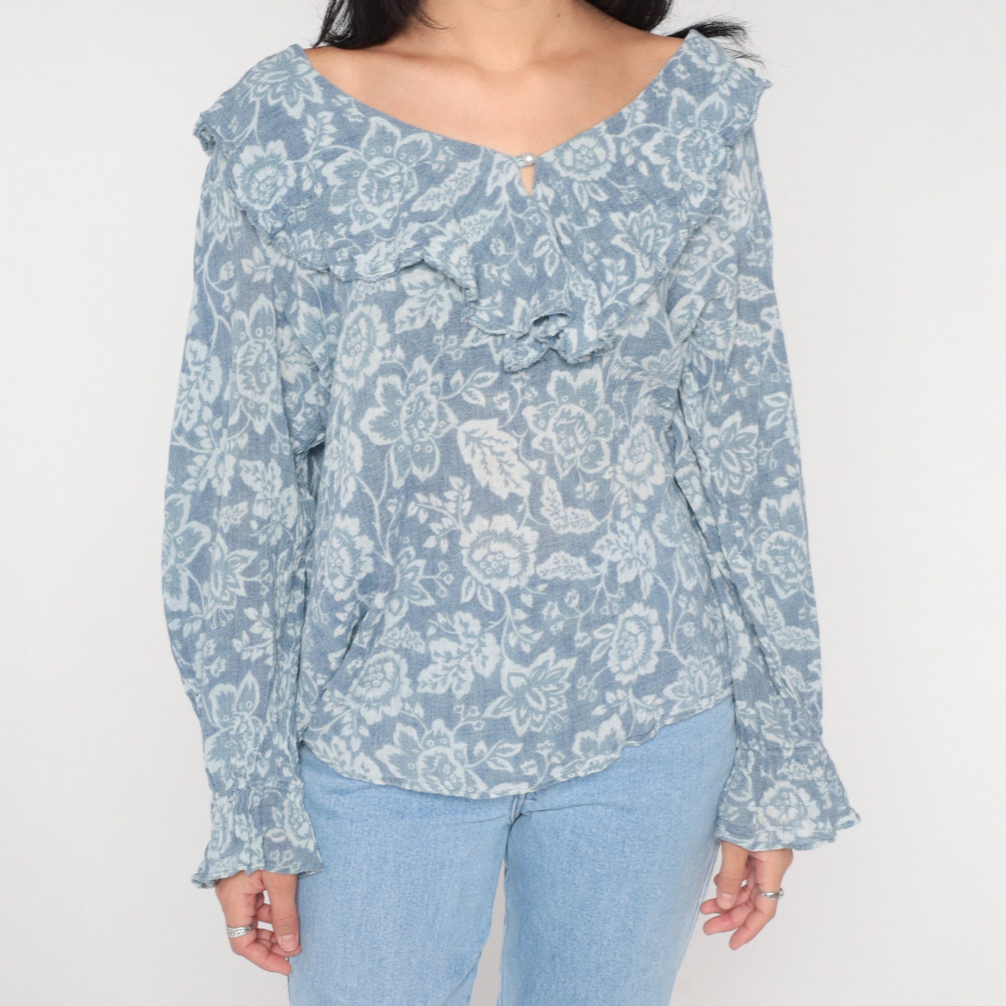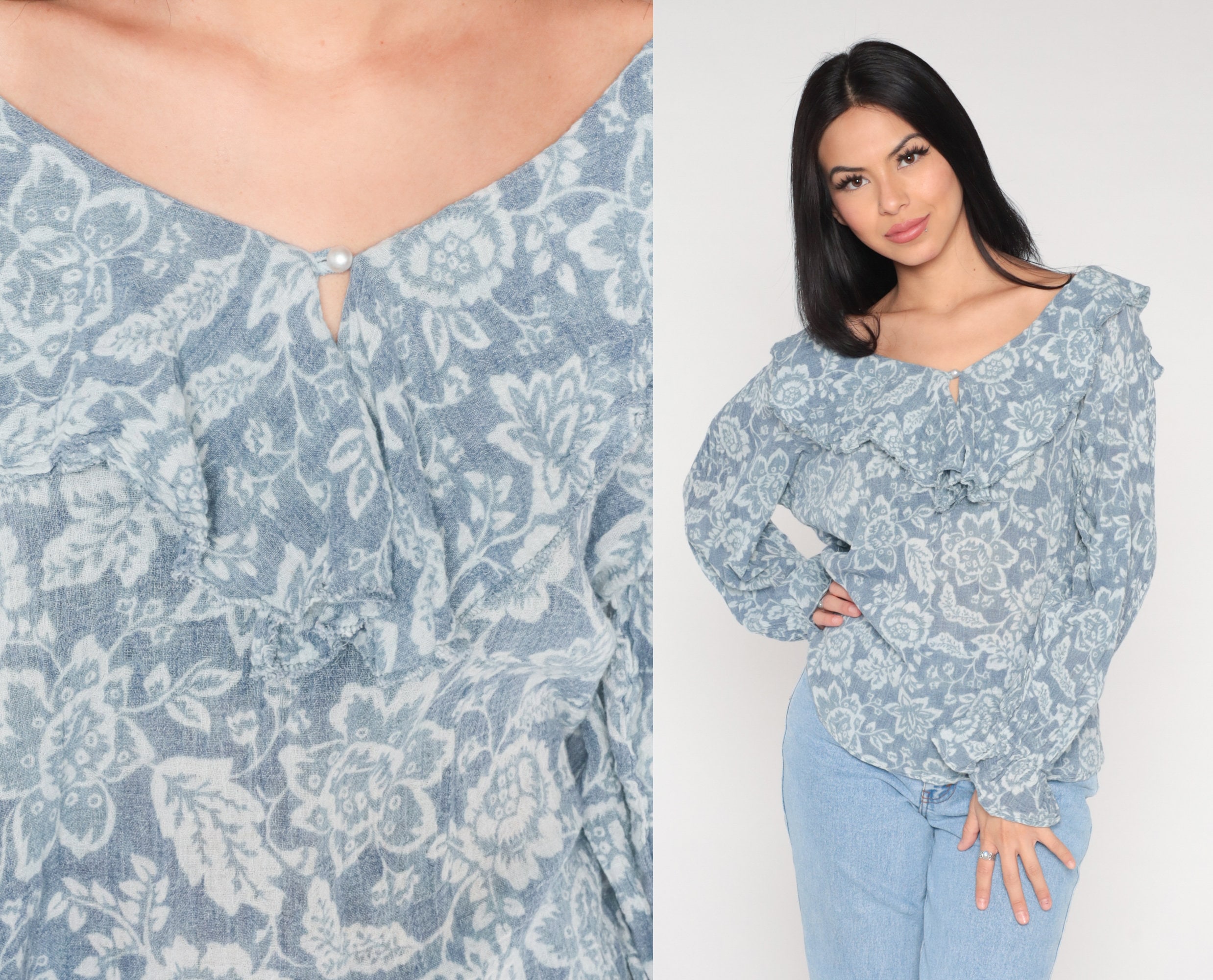 Vintage 90s blouse in blue with a floral print, a ruffled collar and poet sleeves. It has a pearl button with a keyhole at the neck.