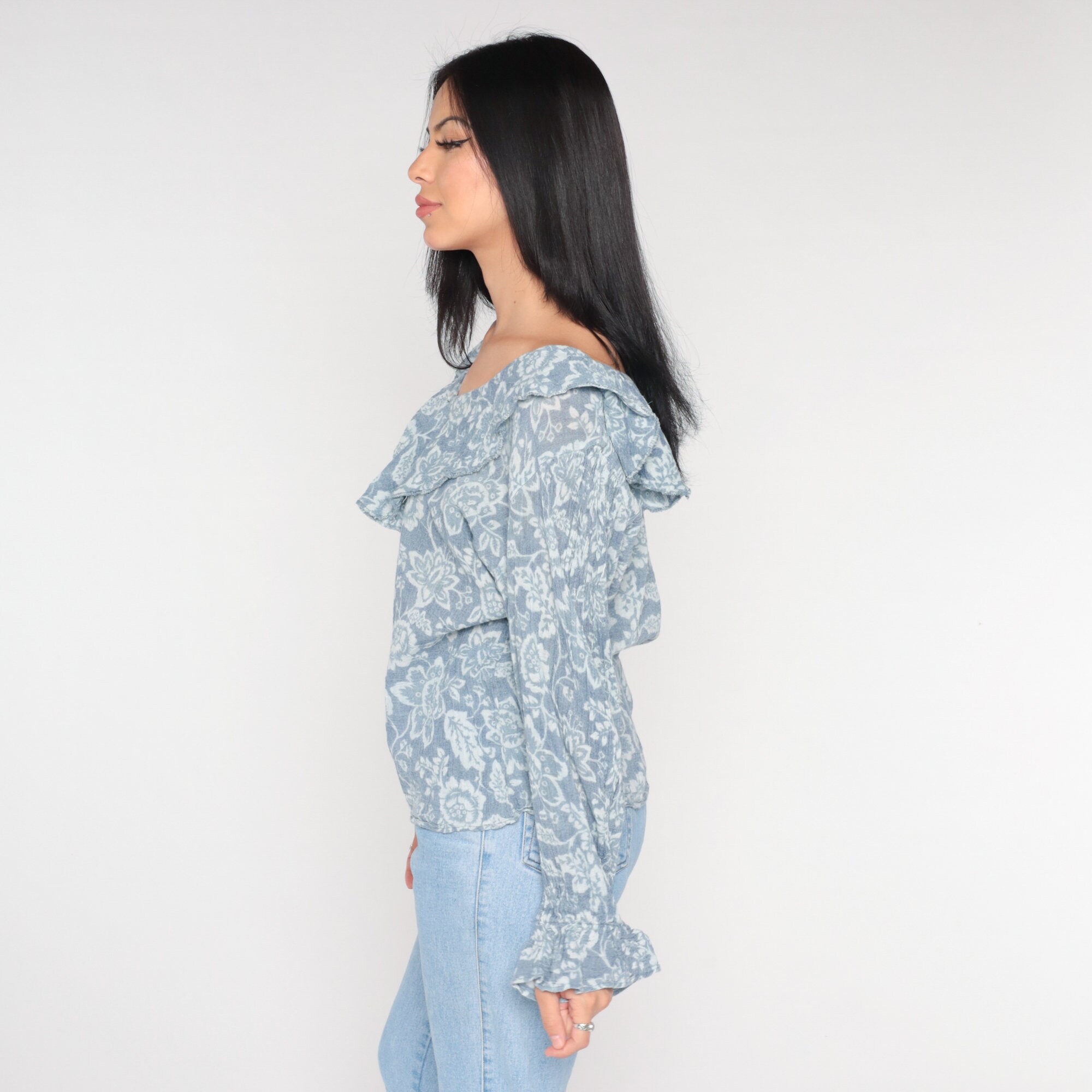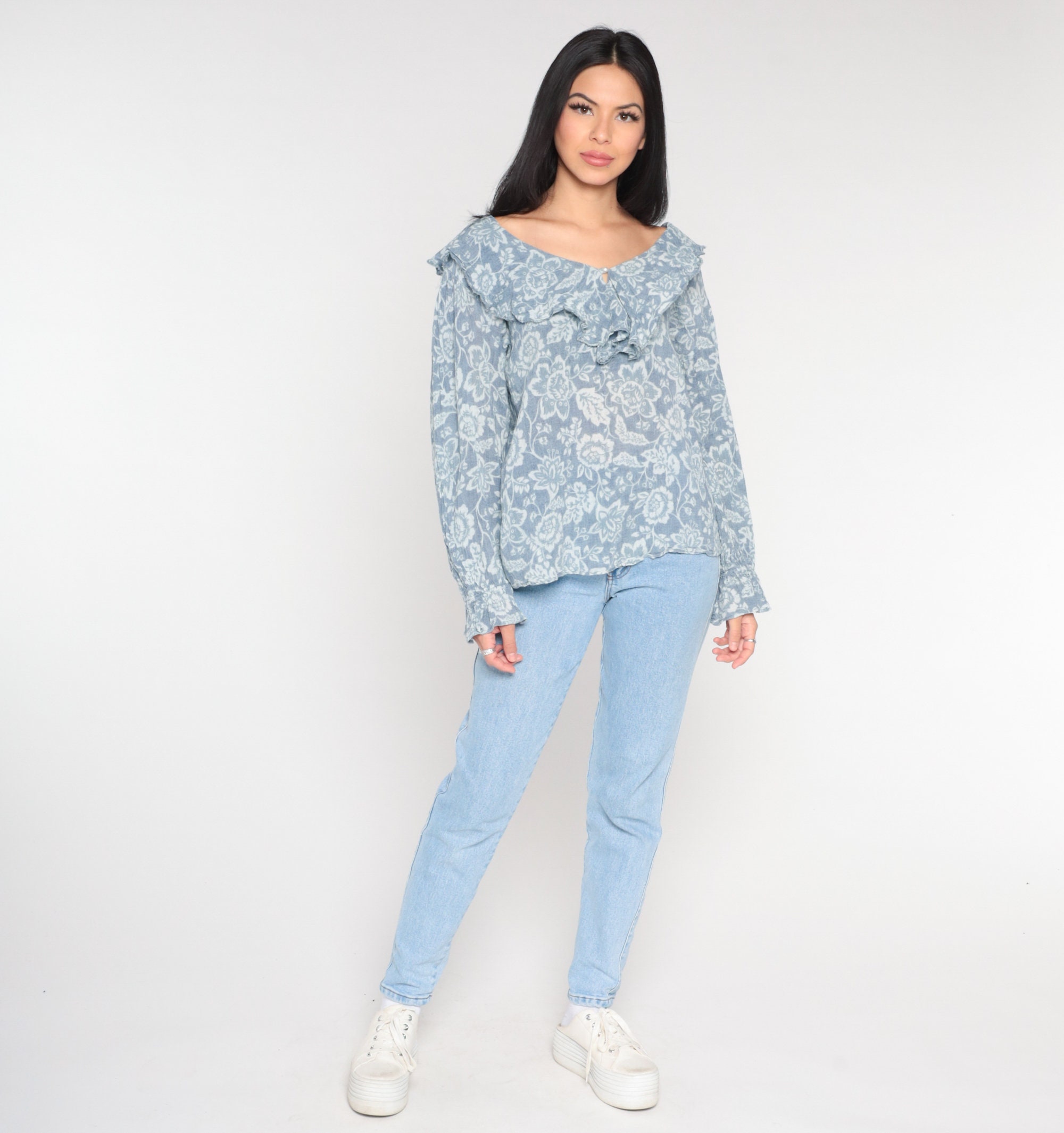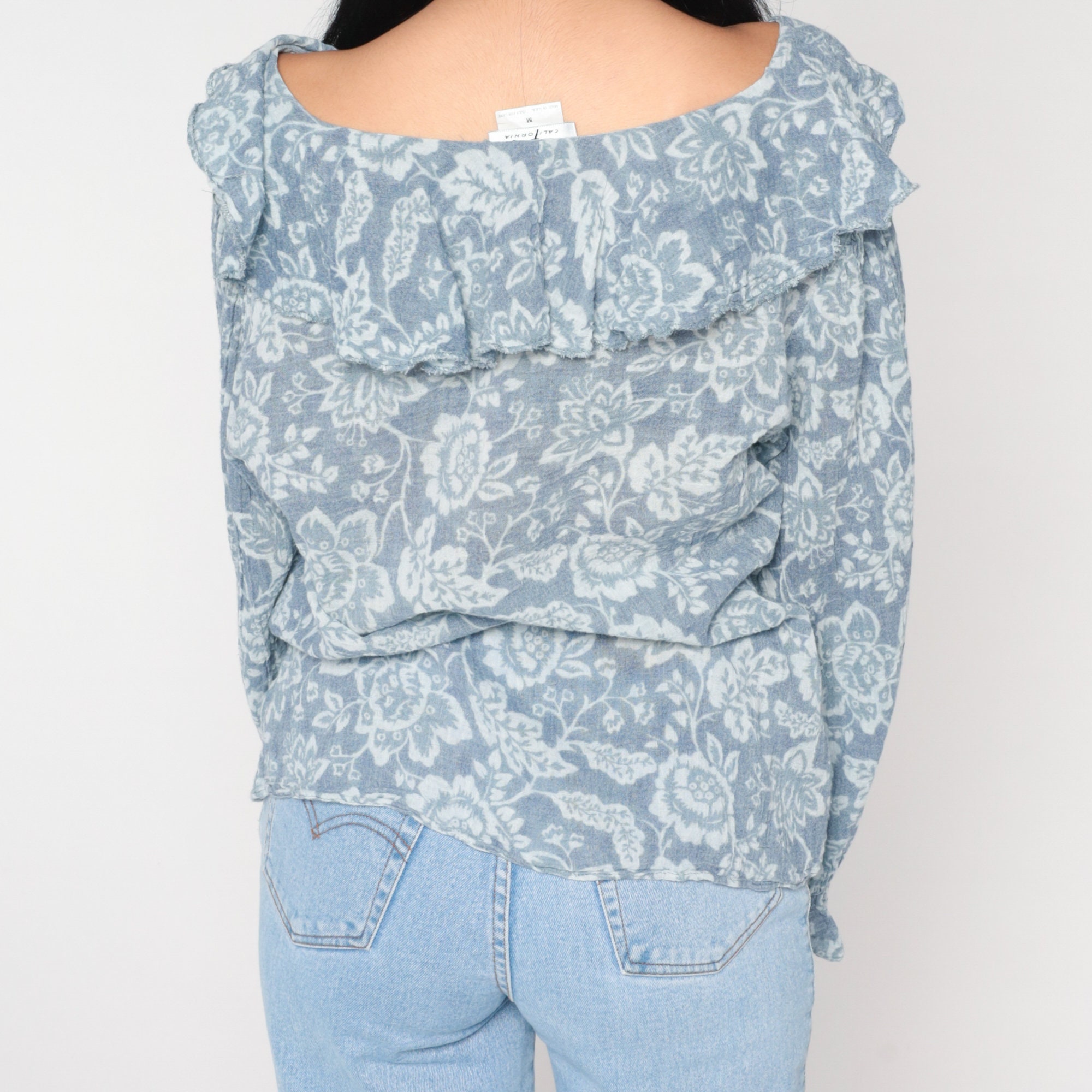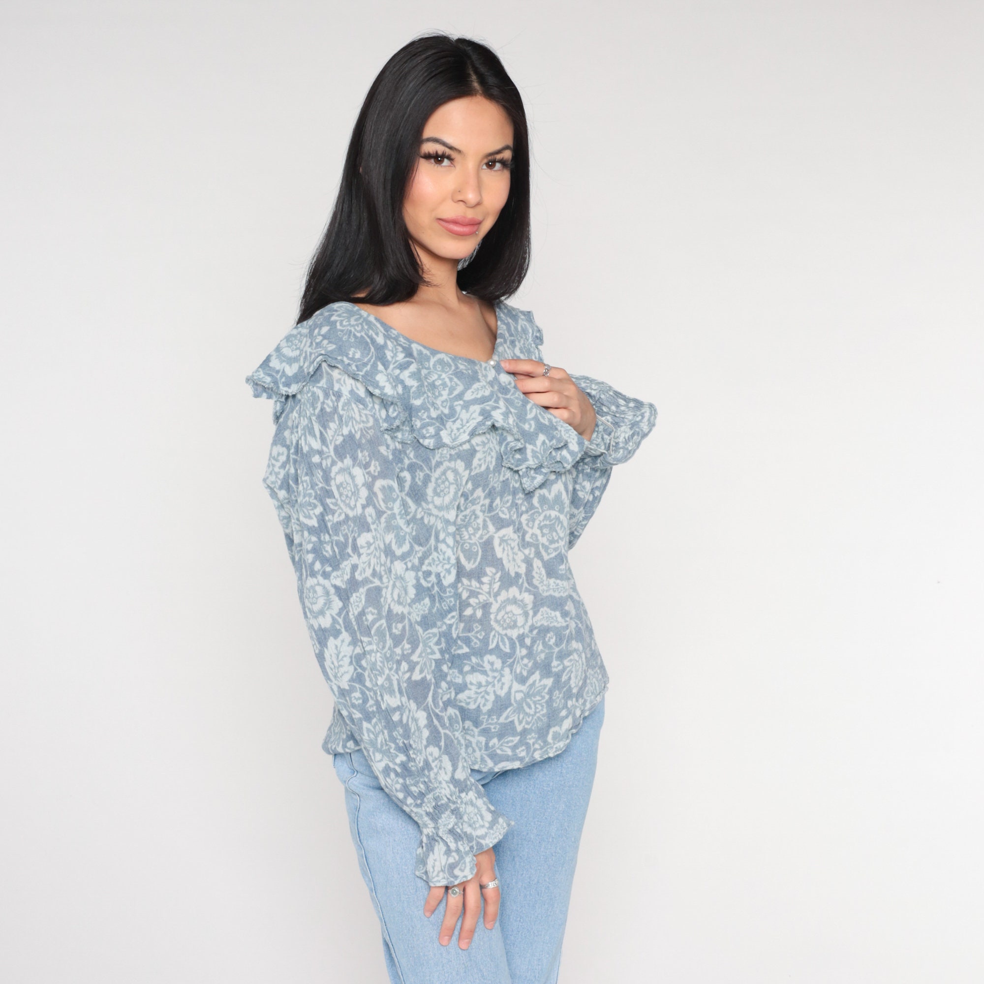 Vintage 90s blouse in blue with a floral print, a ruffled collar and poet sleeves. It has a pearl button with a keyhole at the neck.