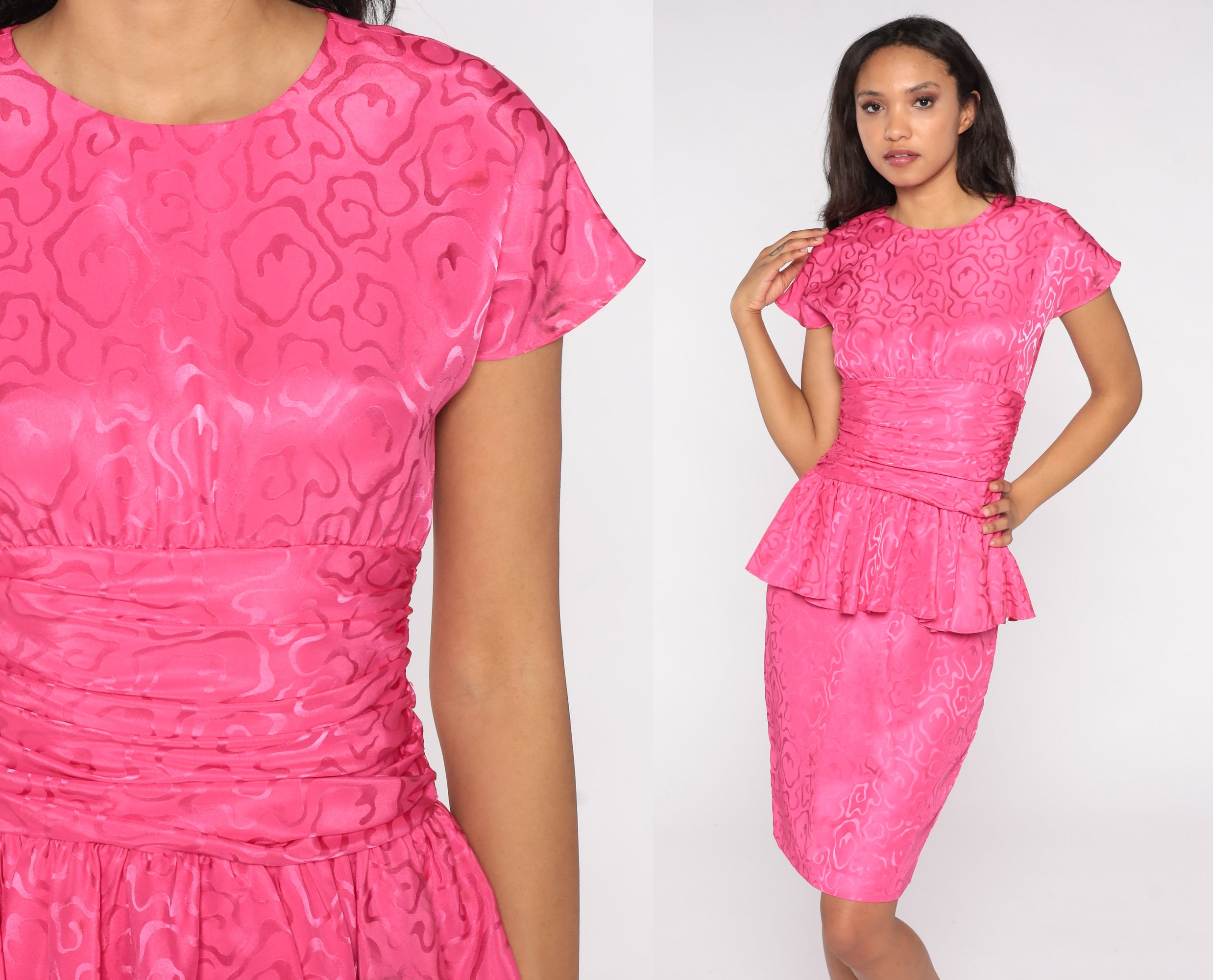 Vintage 80s dress in a pink abstract print with cap sleeves and a wiggle peplum skirt. Zipper up the back.