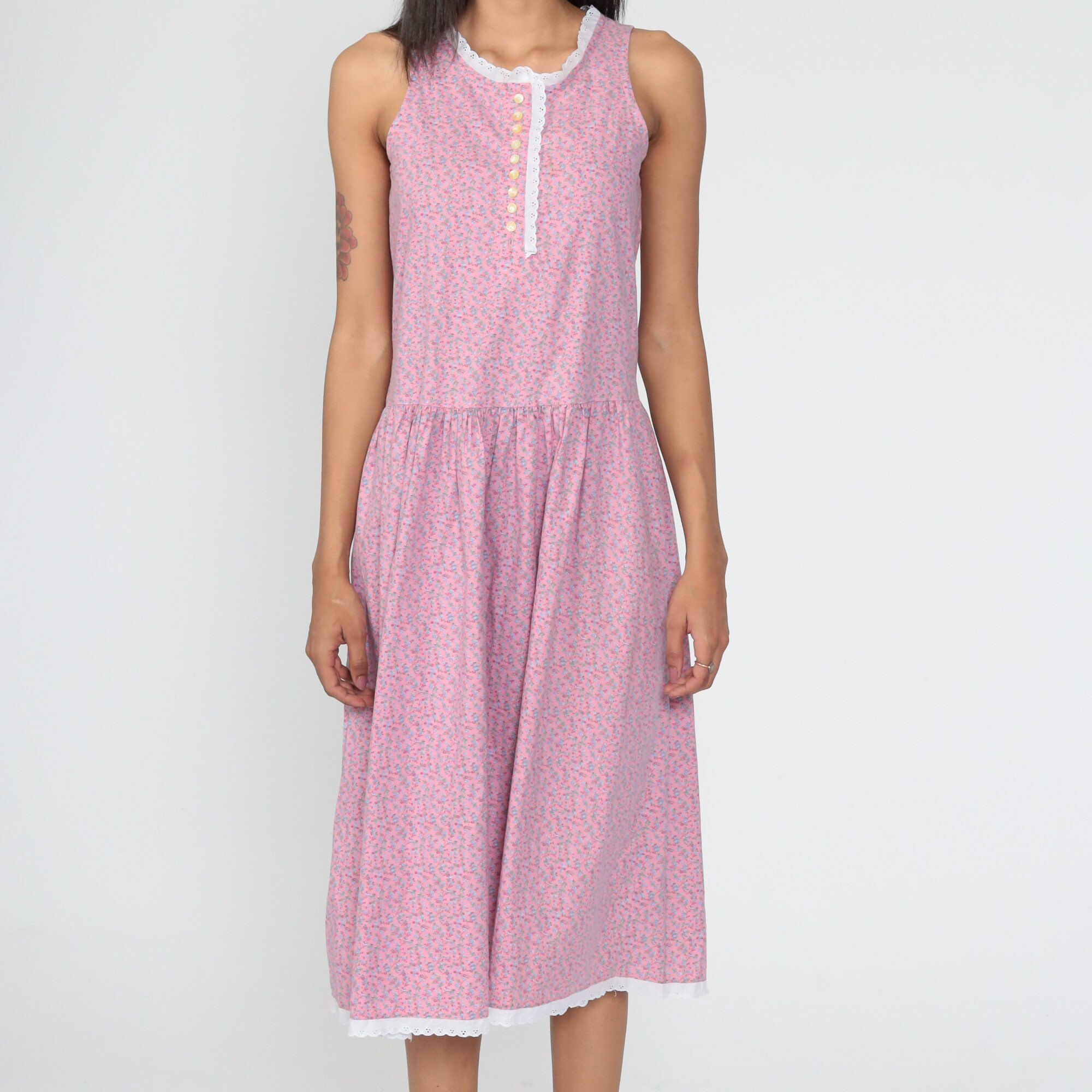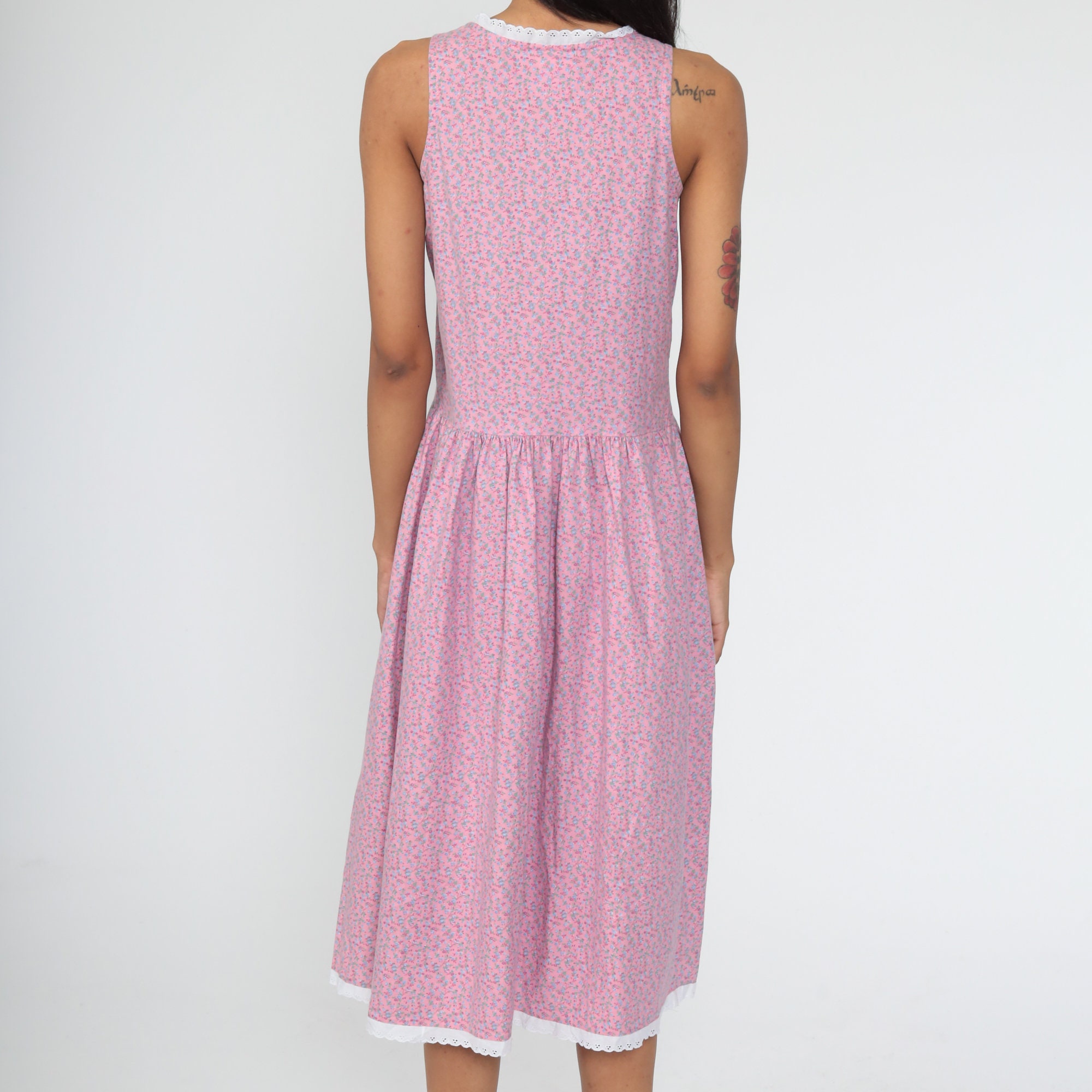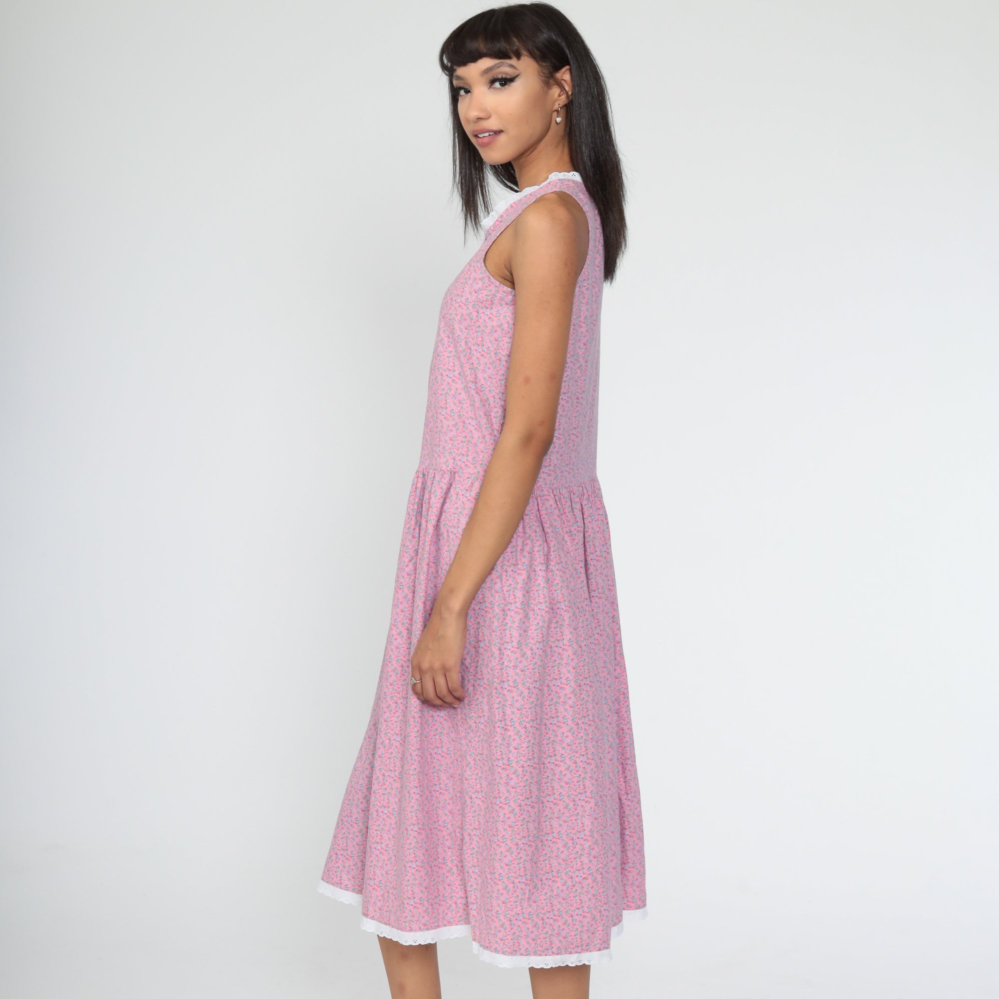 Vintage 80s dress in pink with a calico floral print and eyelet lace trim. Sleeveless with a low waist and a midi length skirt.