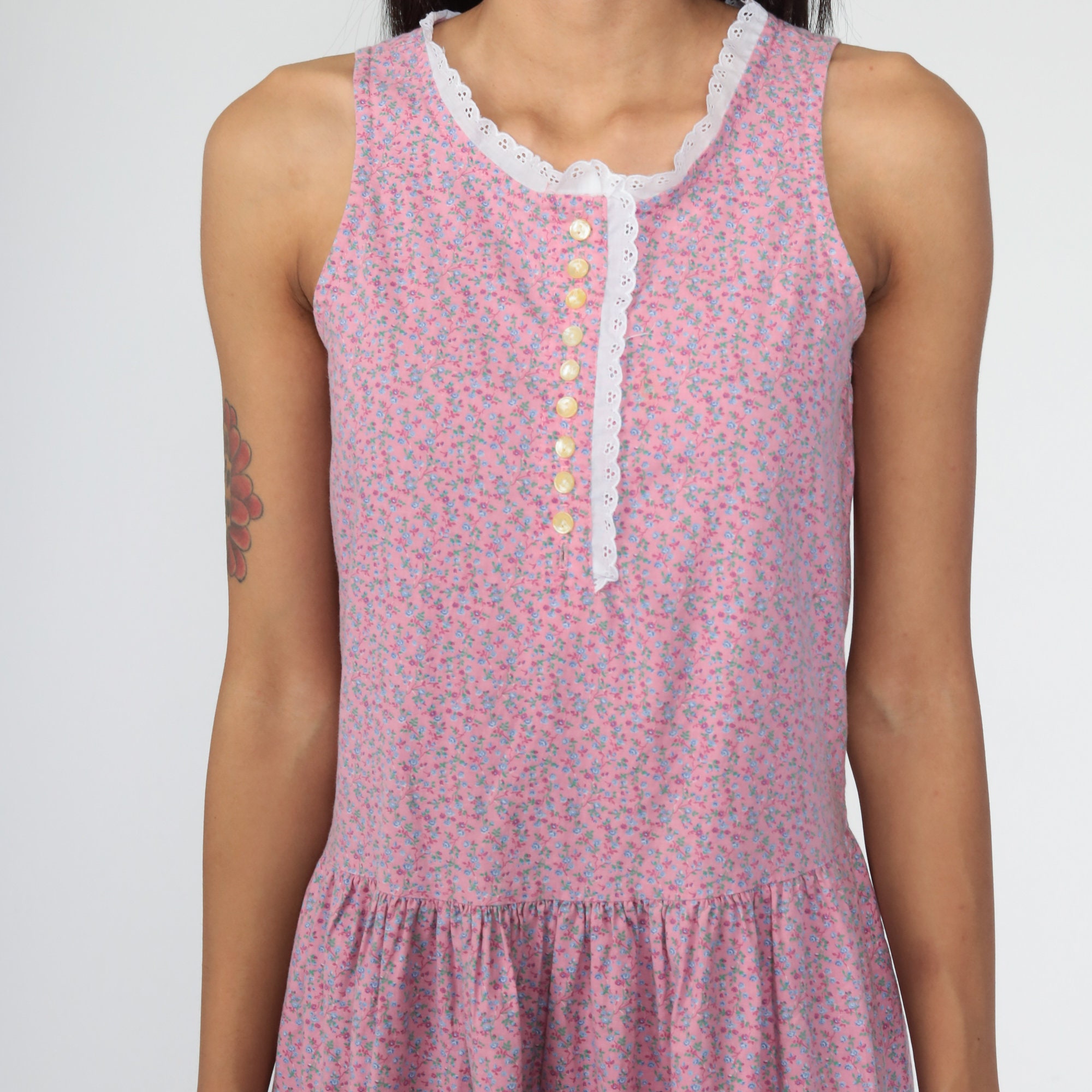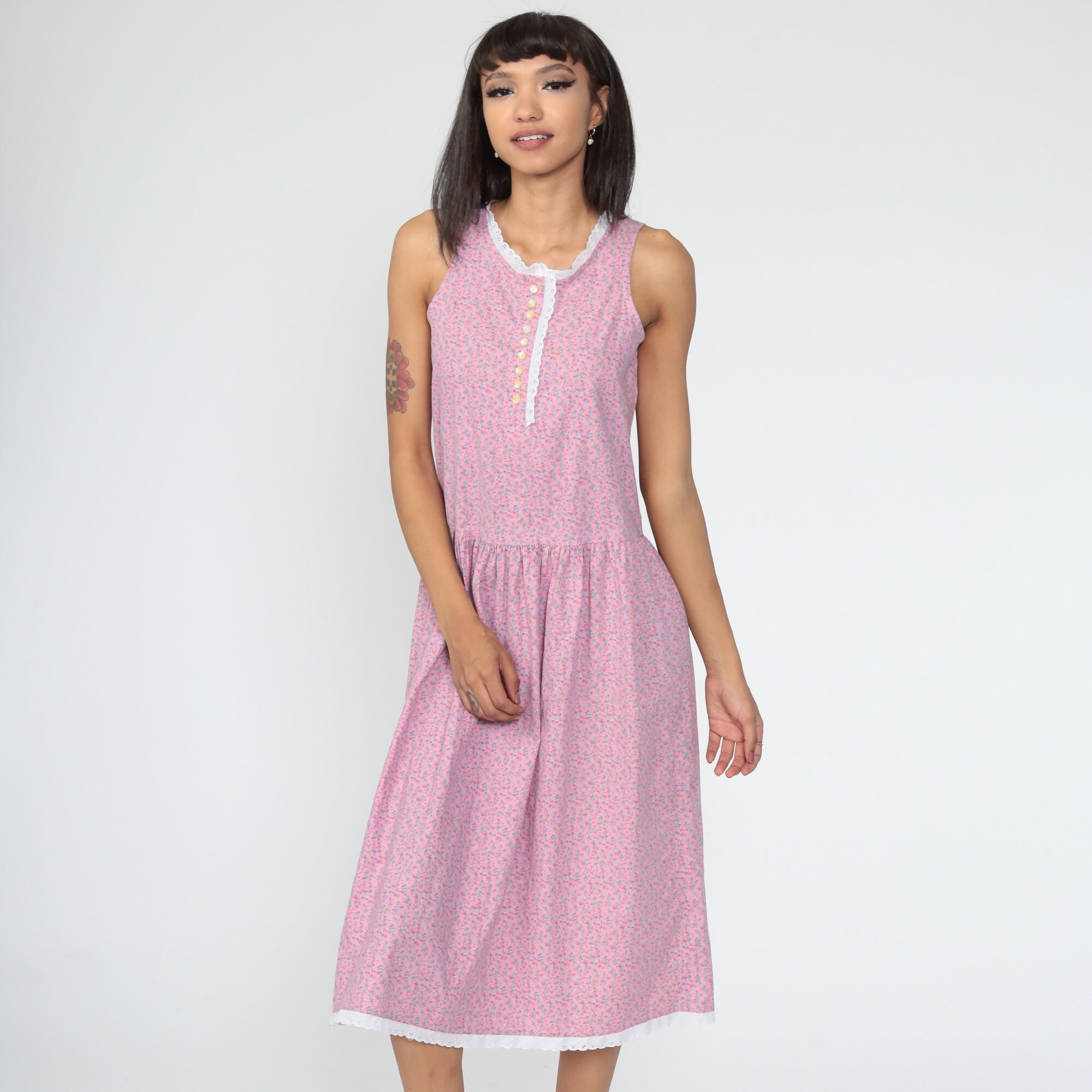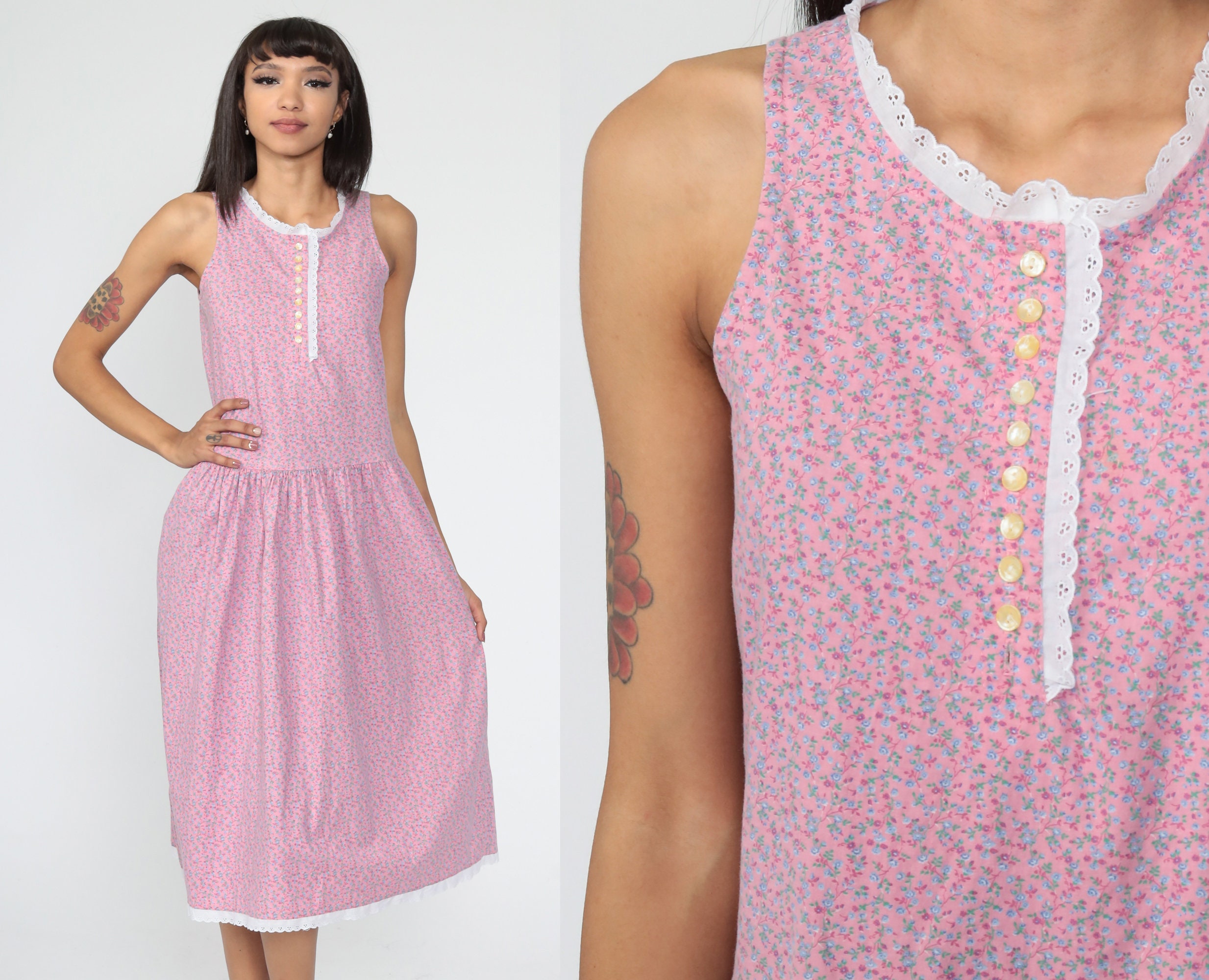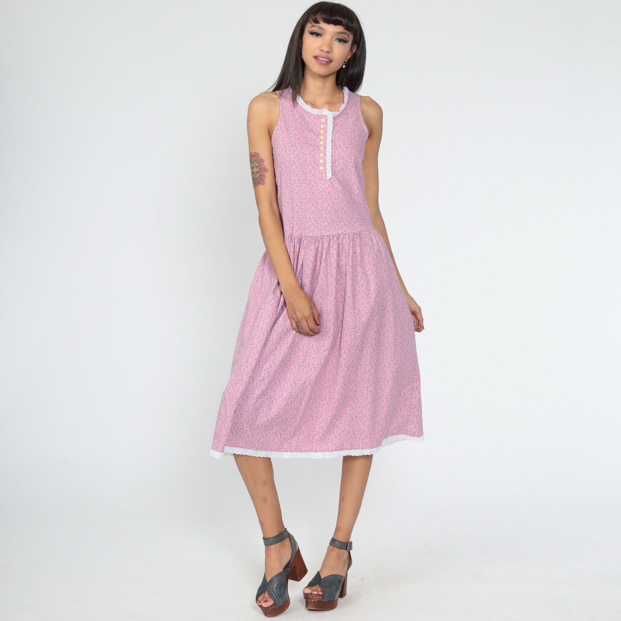 Vintage 80s dress in pink with a calico floral print and eyelet lace trim. Sleeveless with a low waist and a midi length skirt.