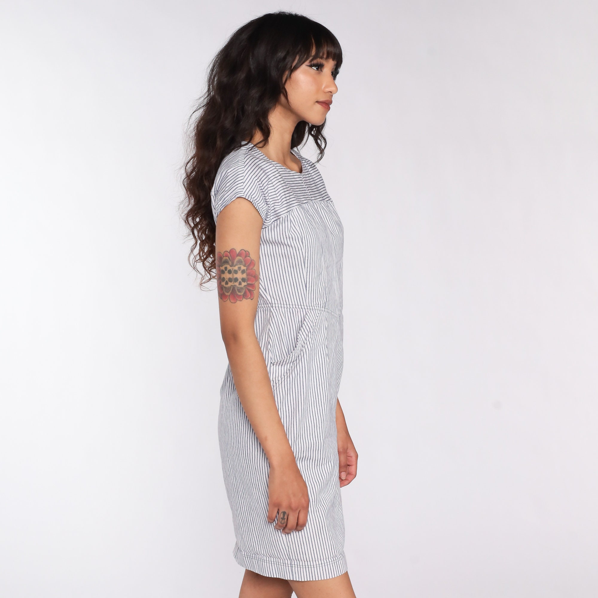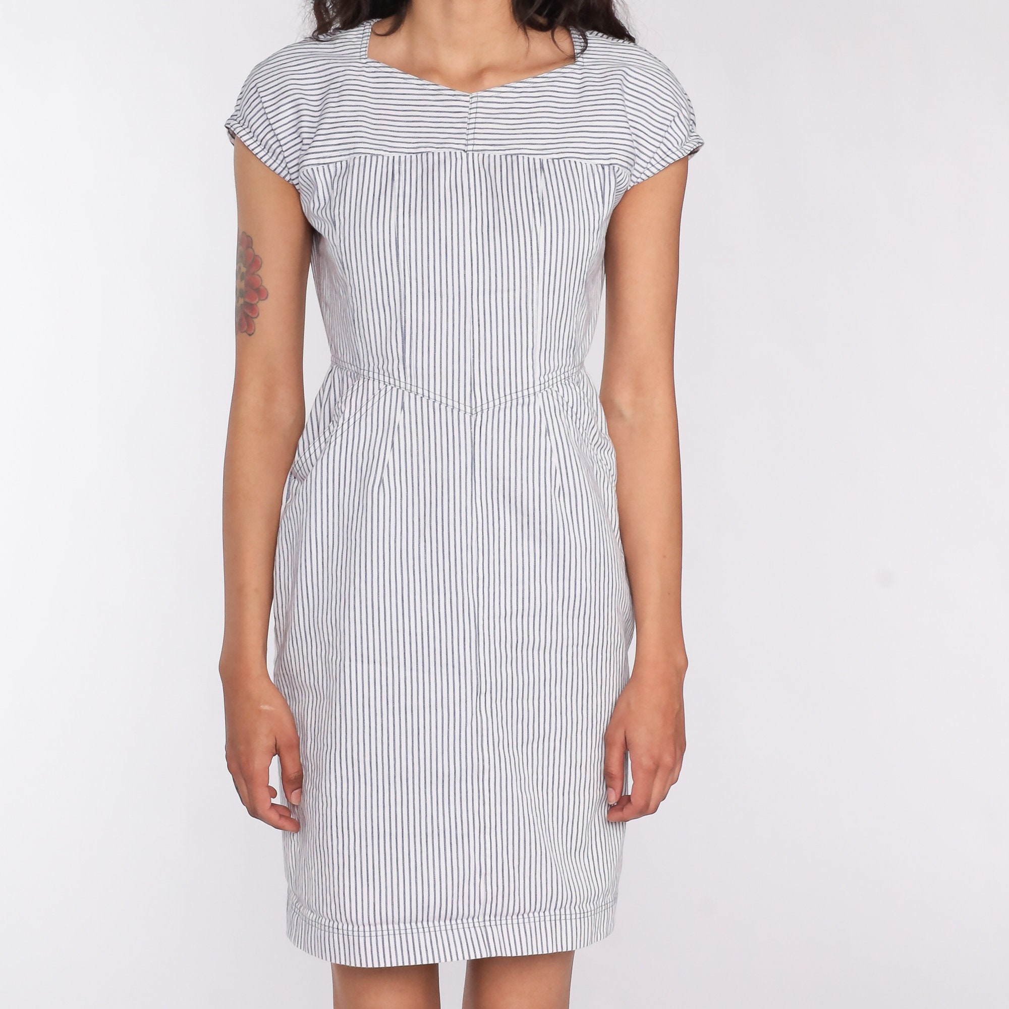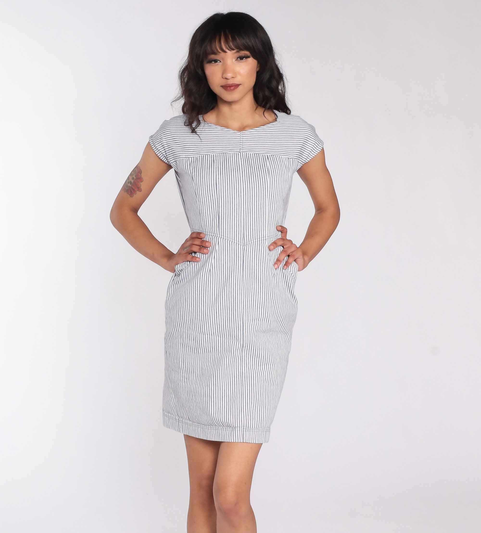 Vintage 00s dress in white with grey stripes, a high waist, sheath cut, and pockets.