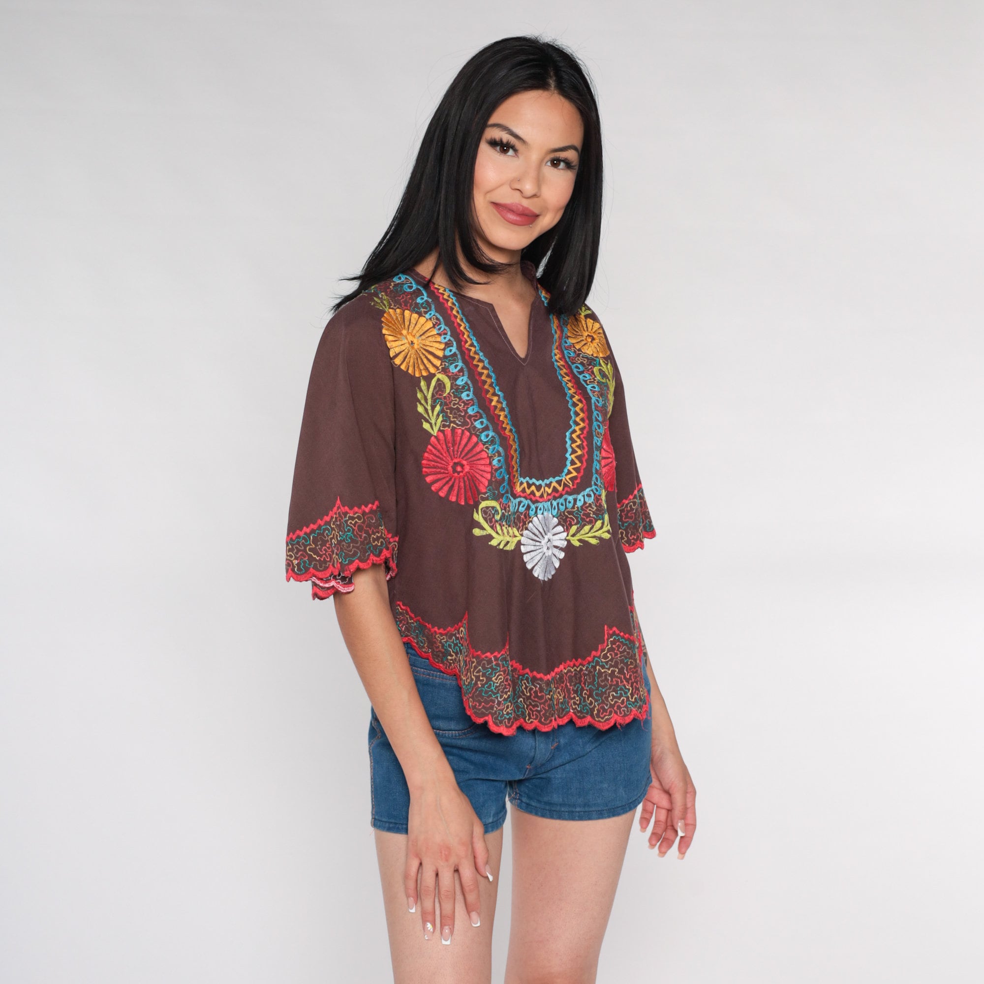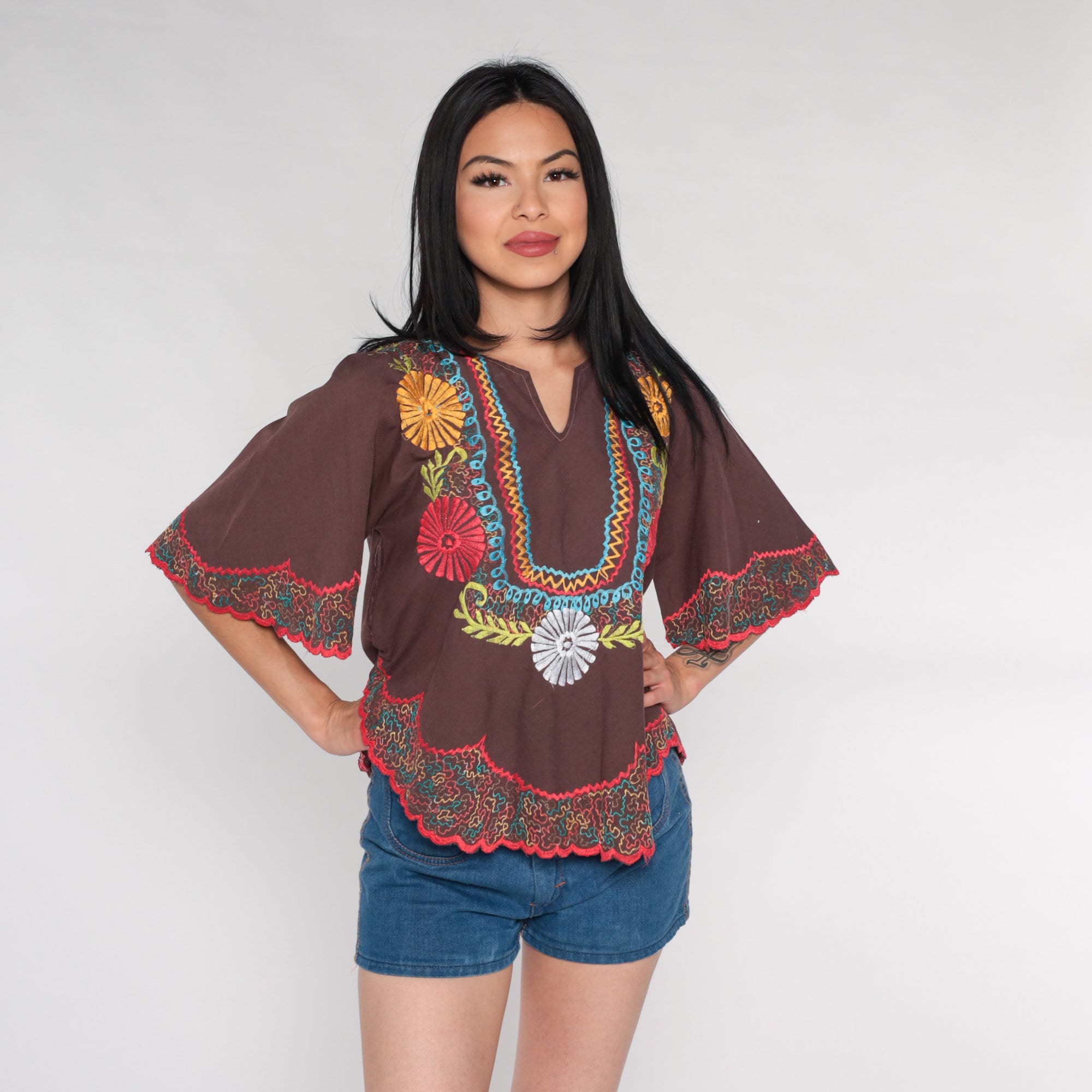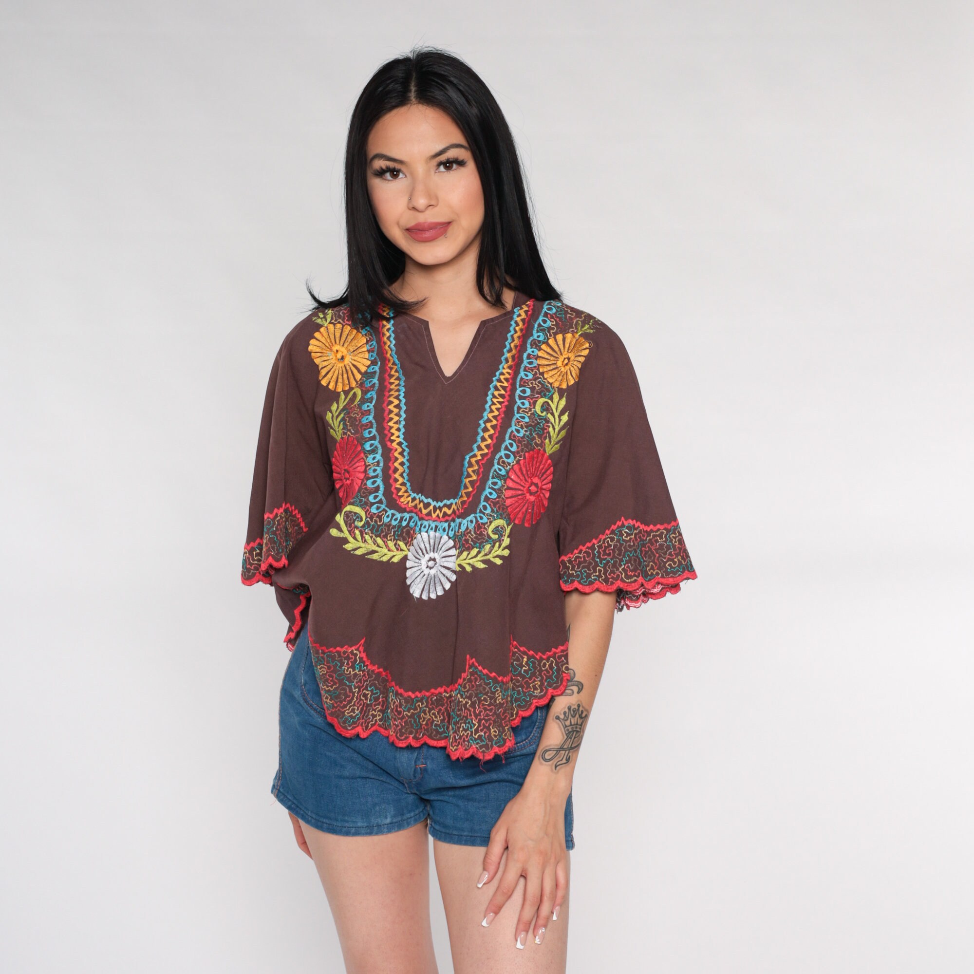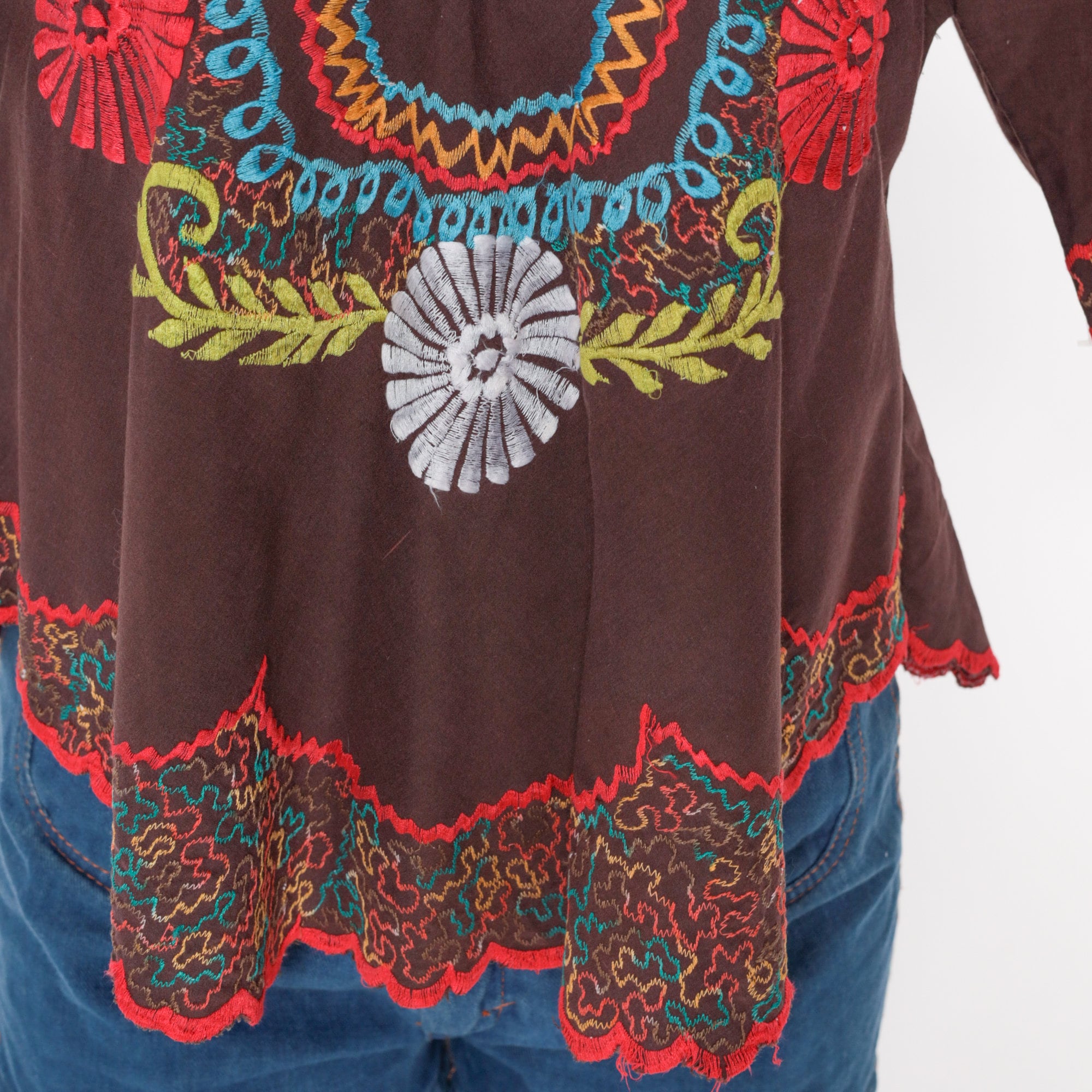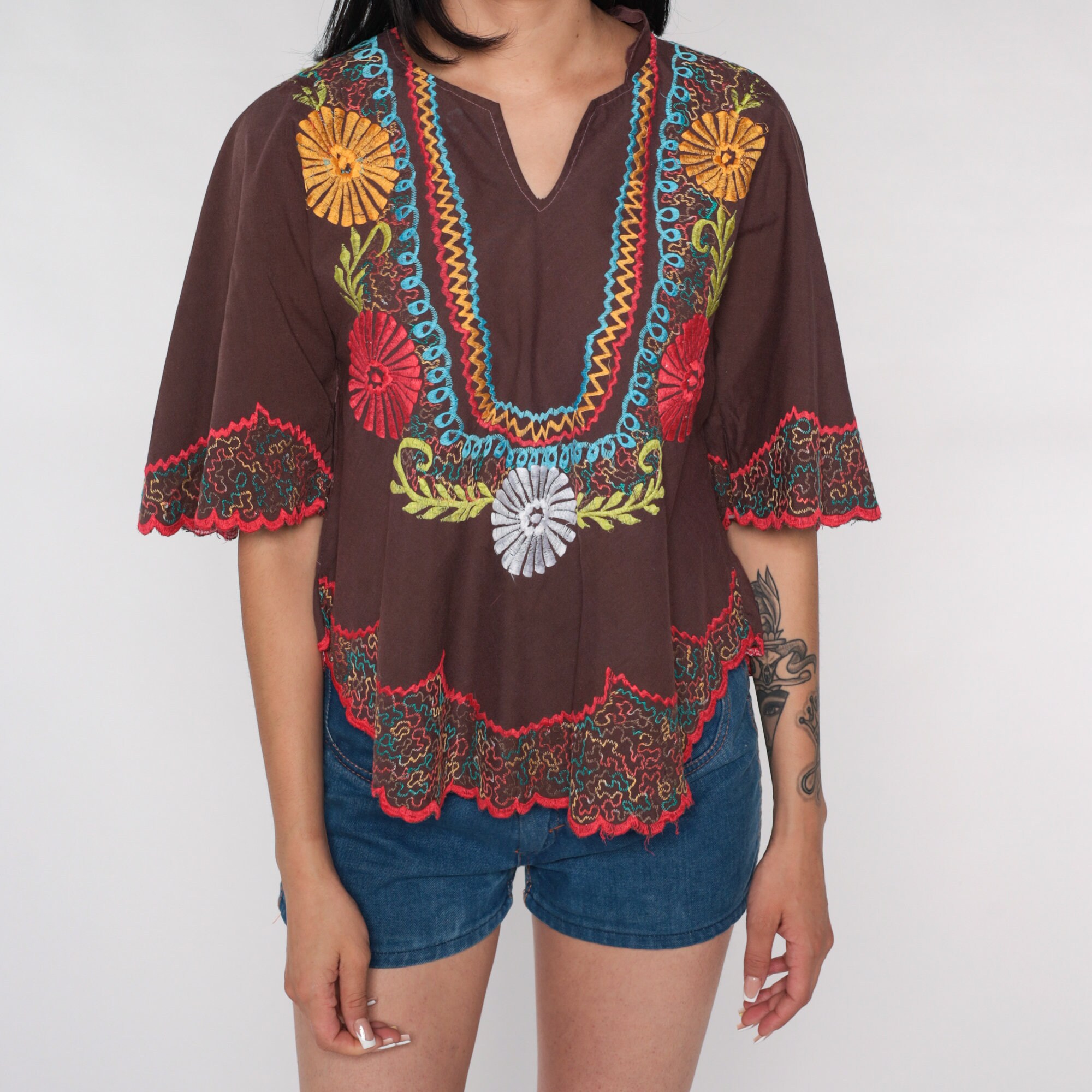 Vintage 00s tunic top in white with floral embroidery and bell sleeves.