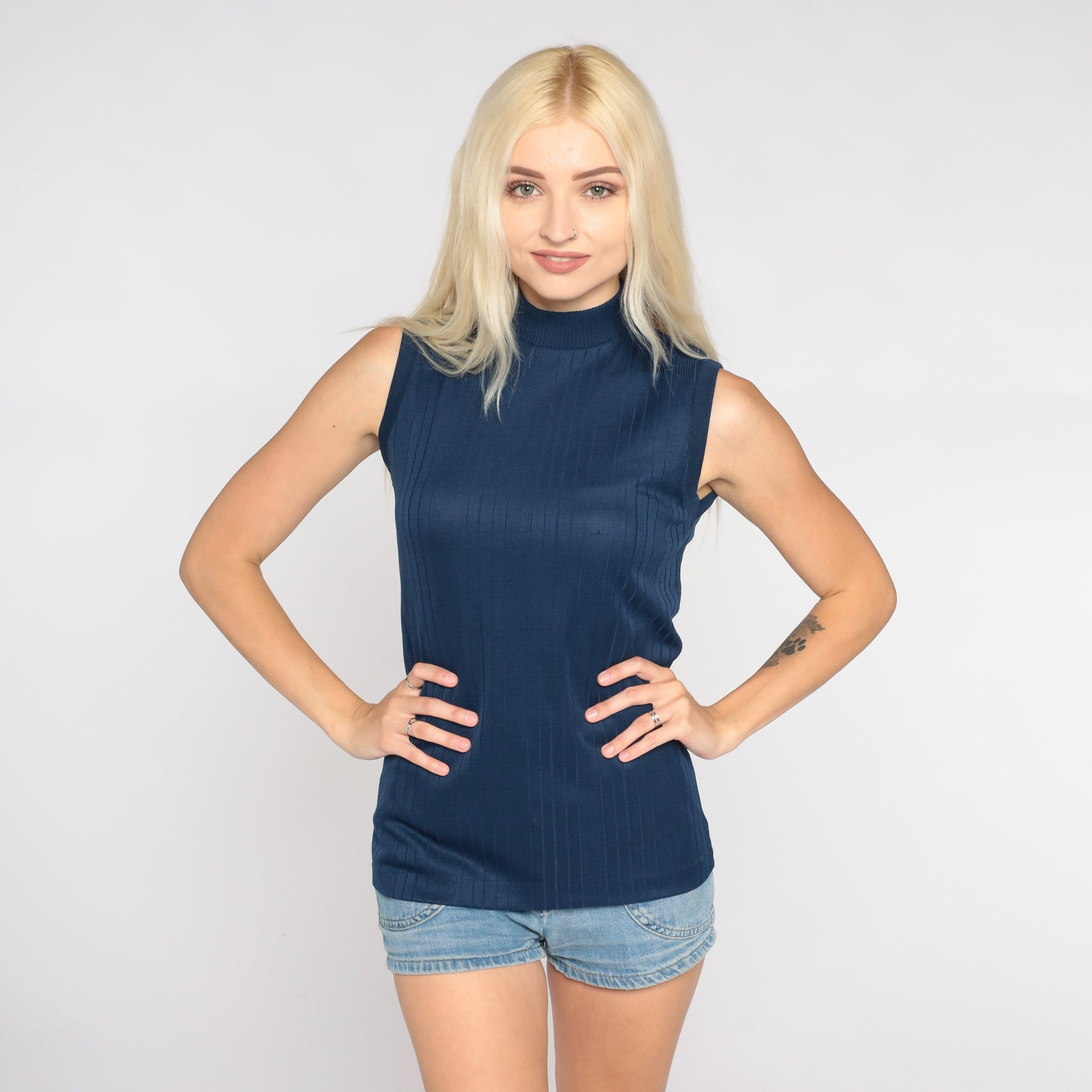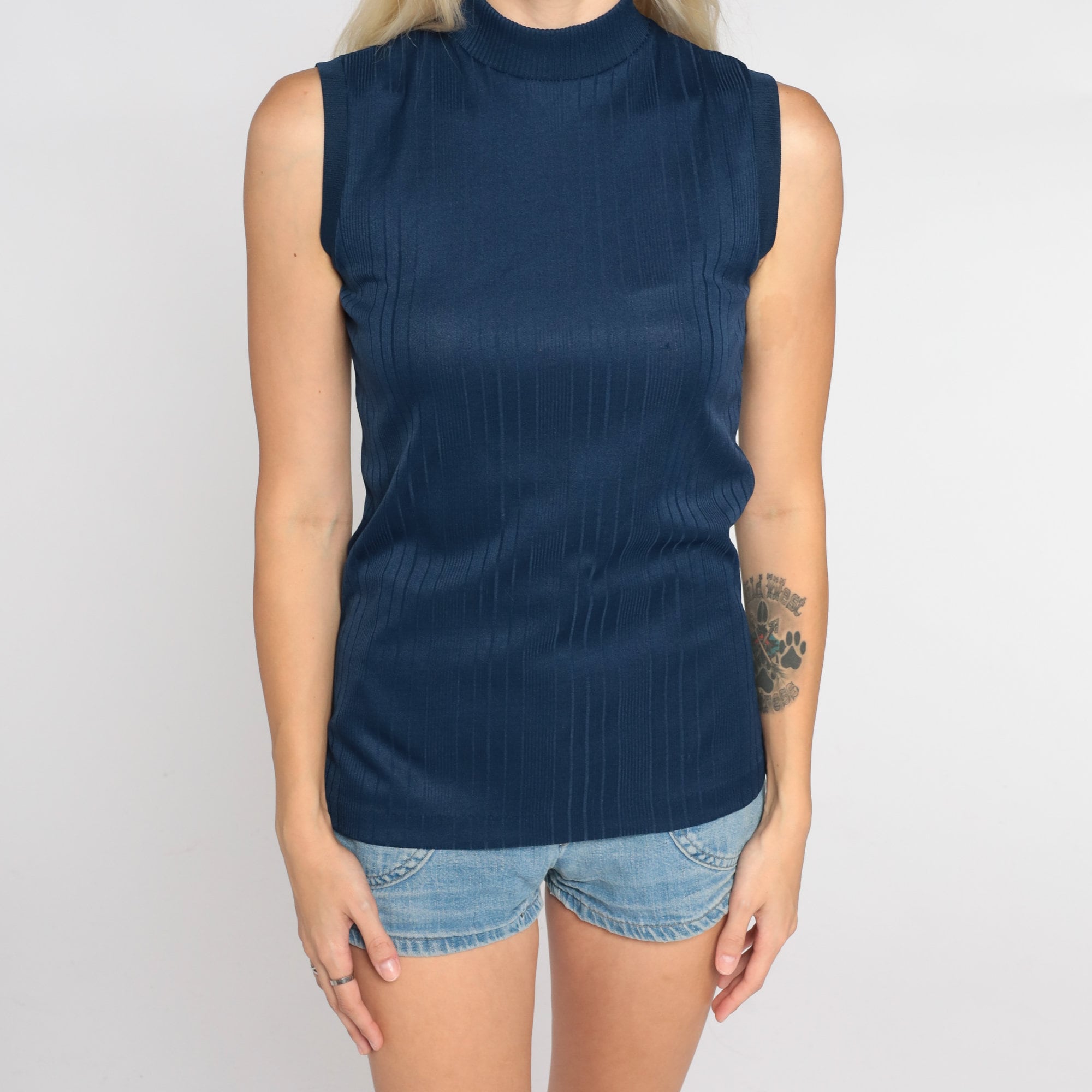 Vintage 70s tank top in ribbed navy blue with a mock neck and a rear zipper.