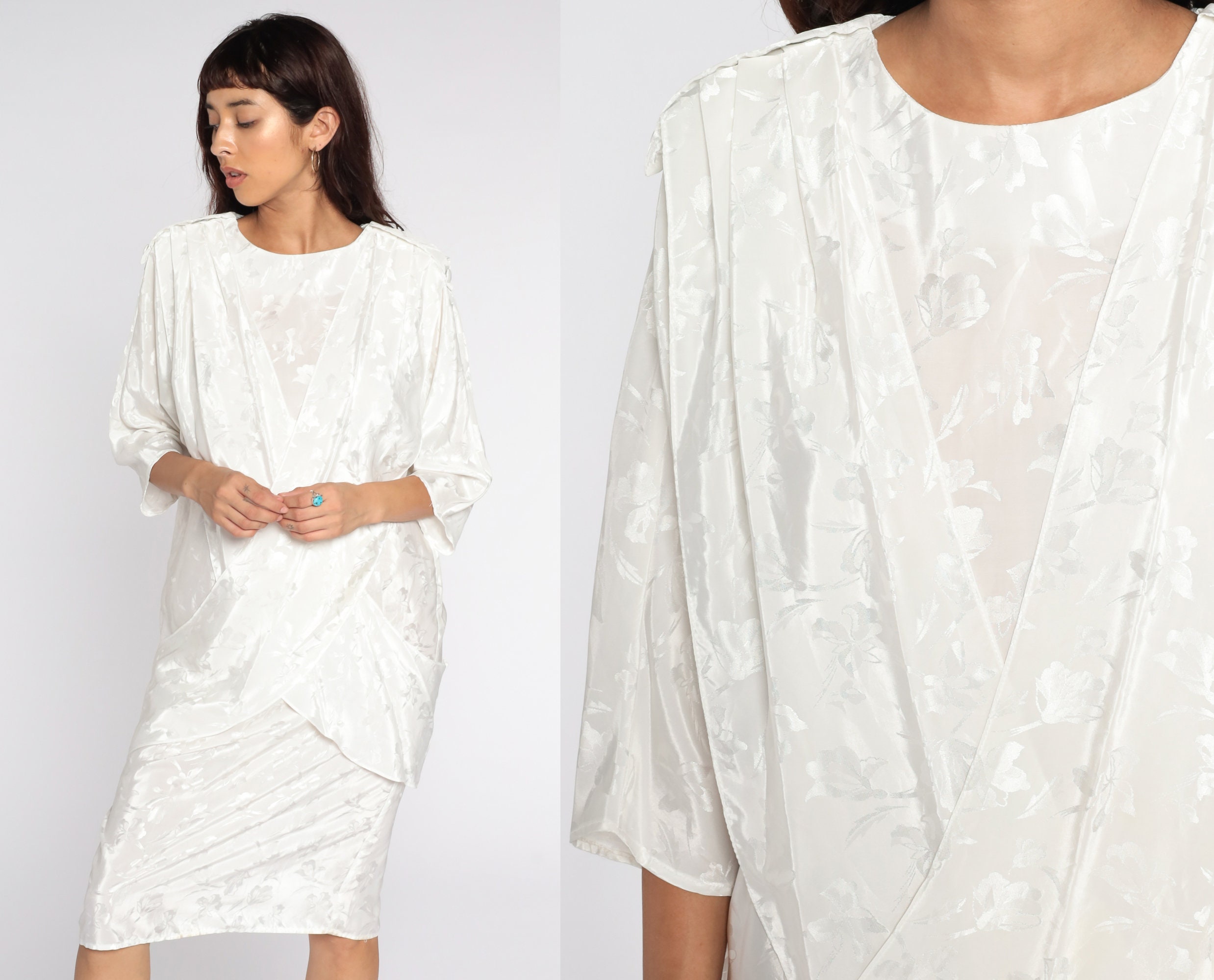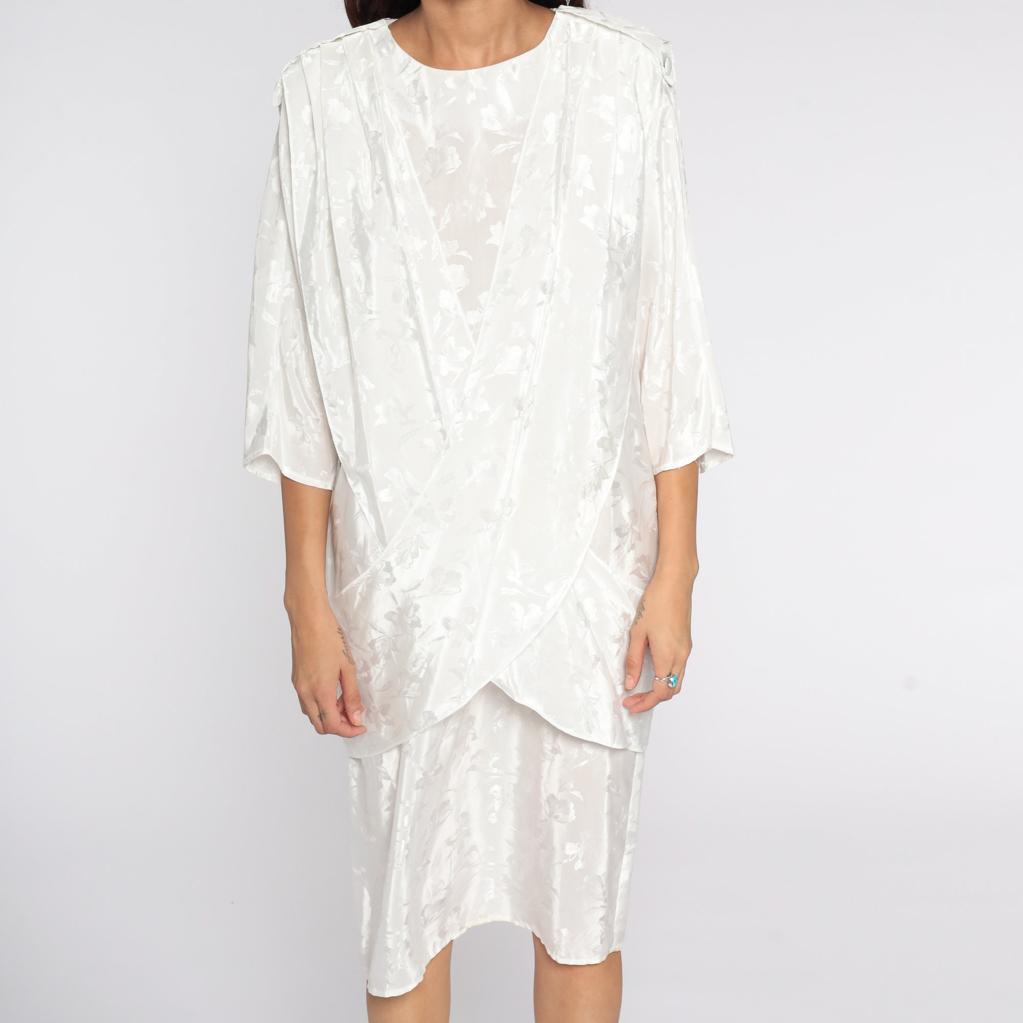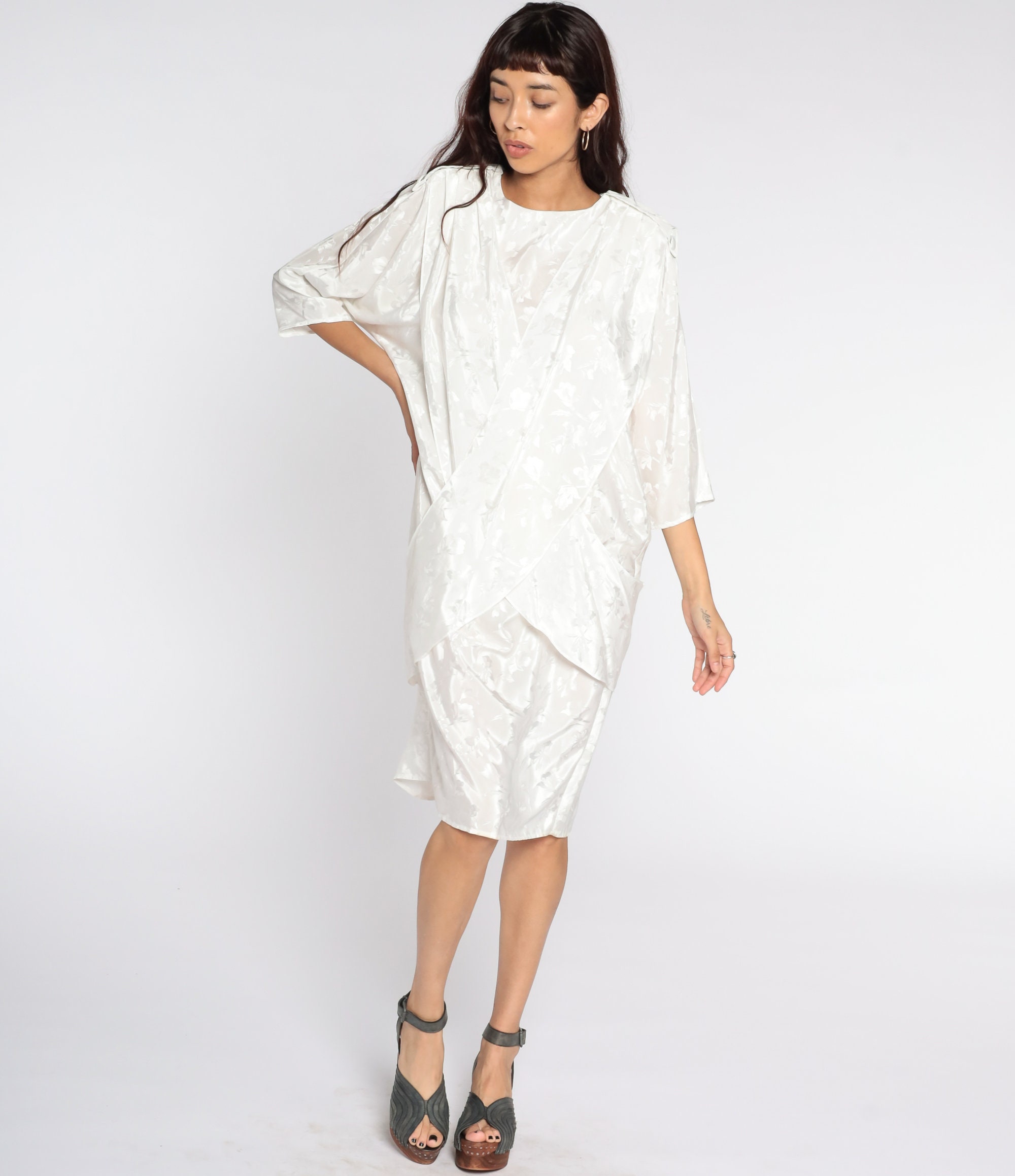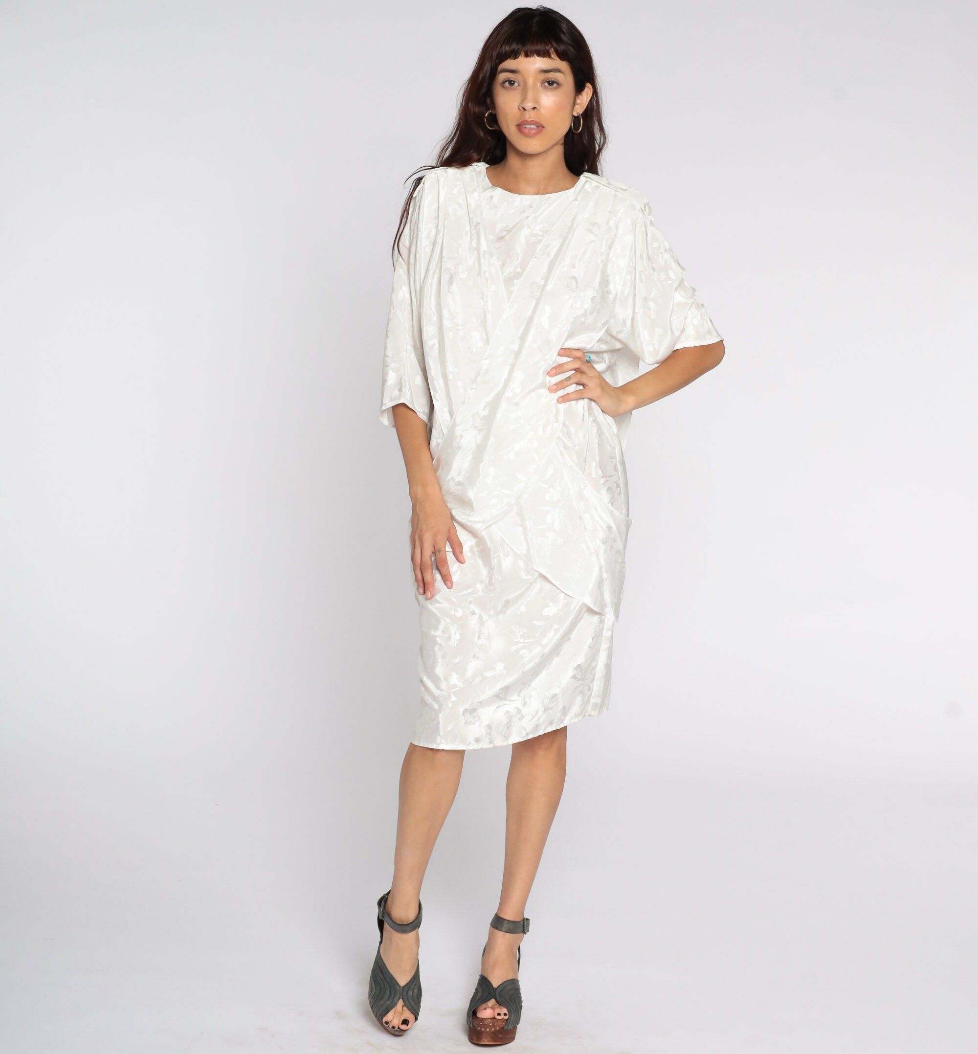 Vintage 80s dress in white with an embossed floral print. It has a shift cut with a draped panel in the front and a pencil skirt. Midi length.