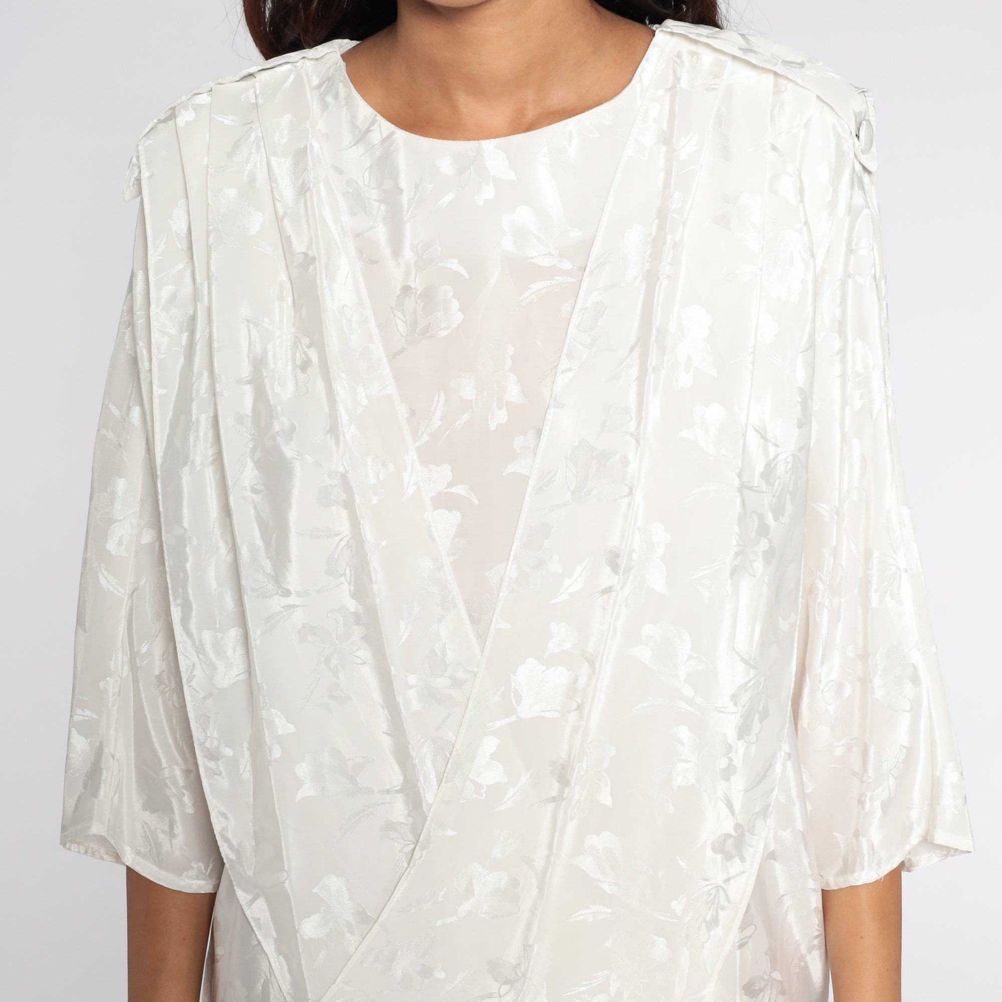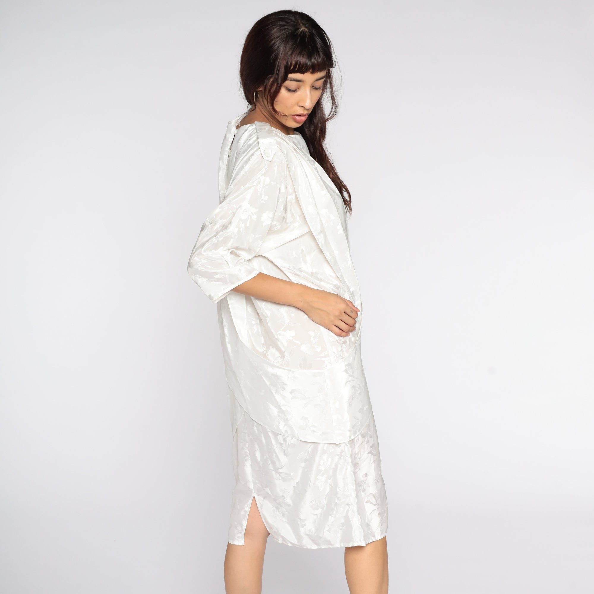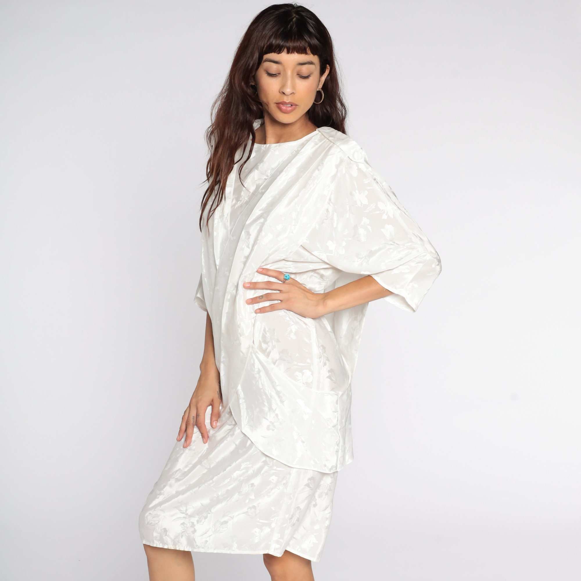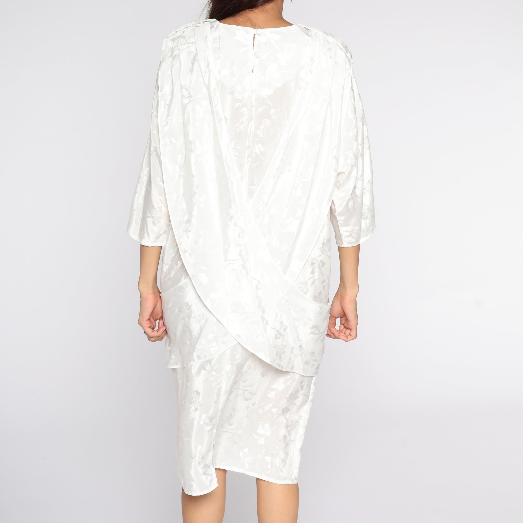 Vintage 80s dress in white with an embossed floral print. It has a shift cut with a draped panel in the front and a pencil skirt. Midi length.