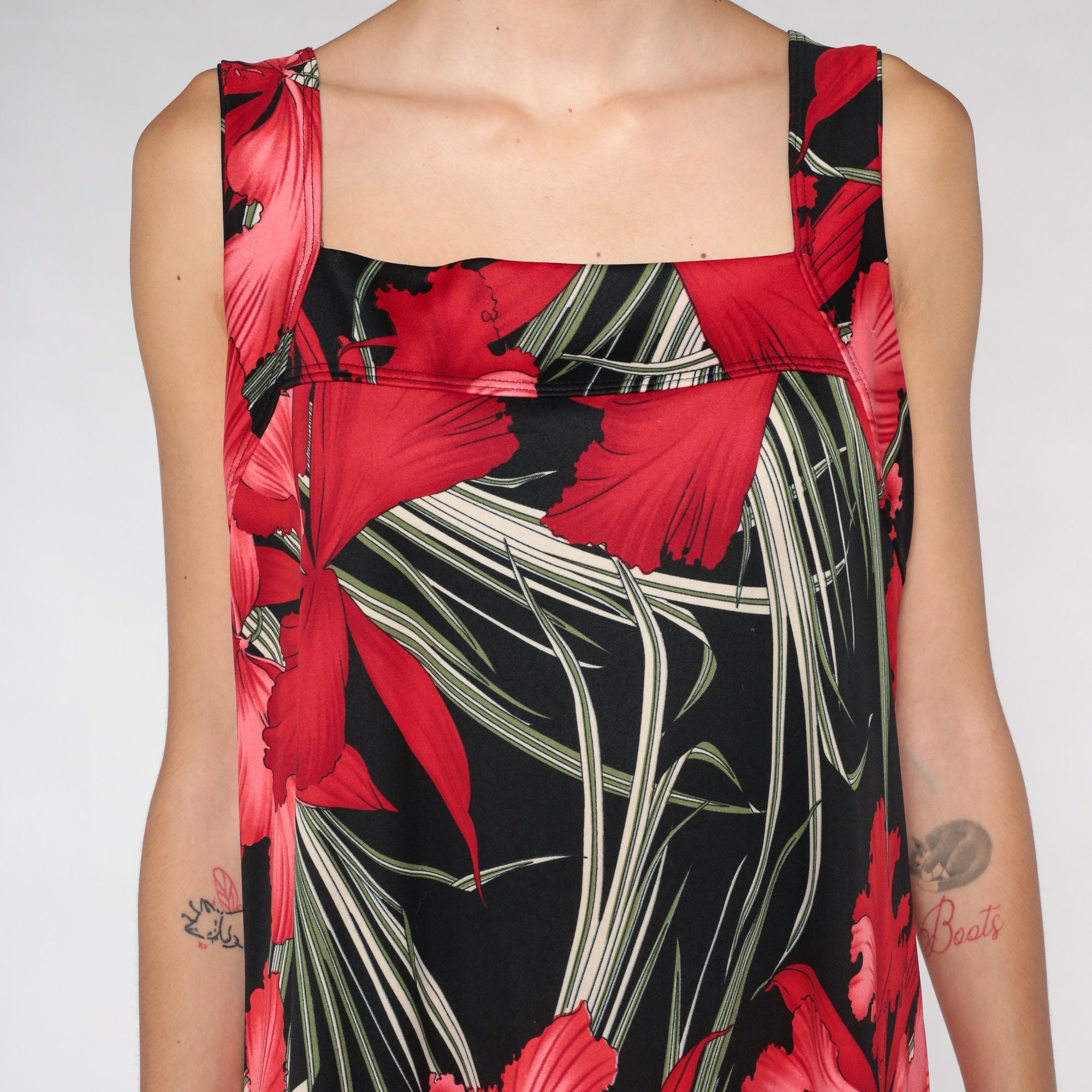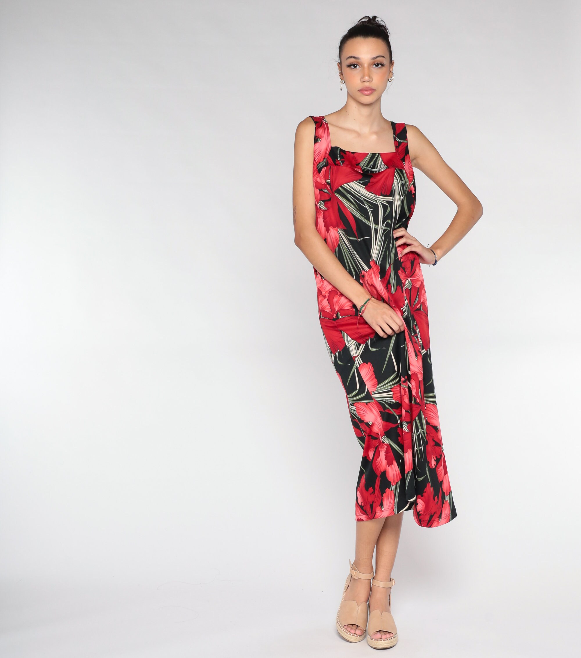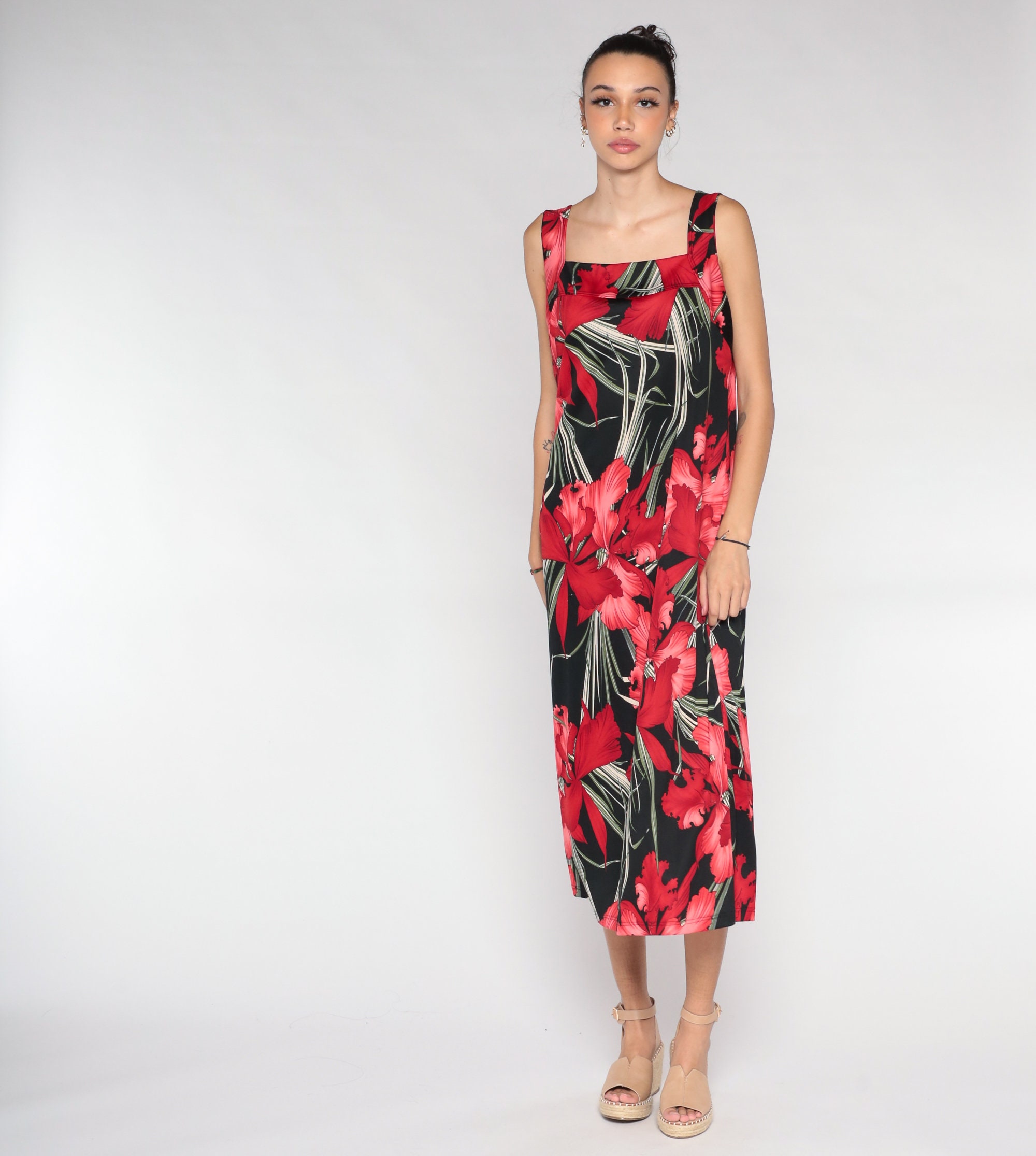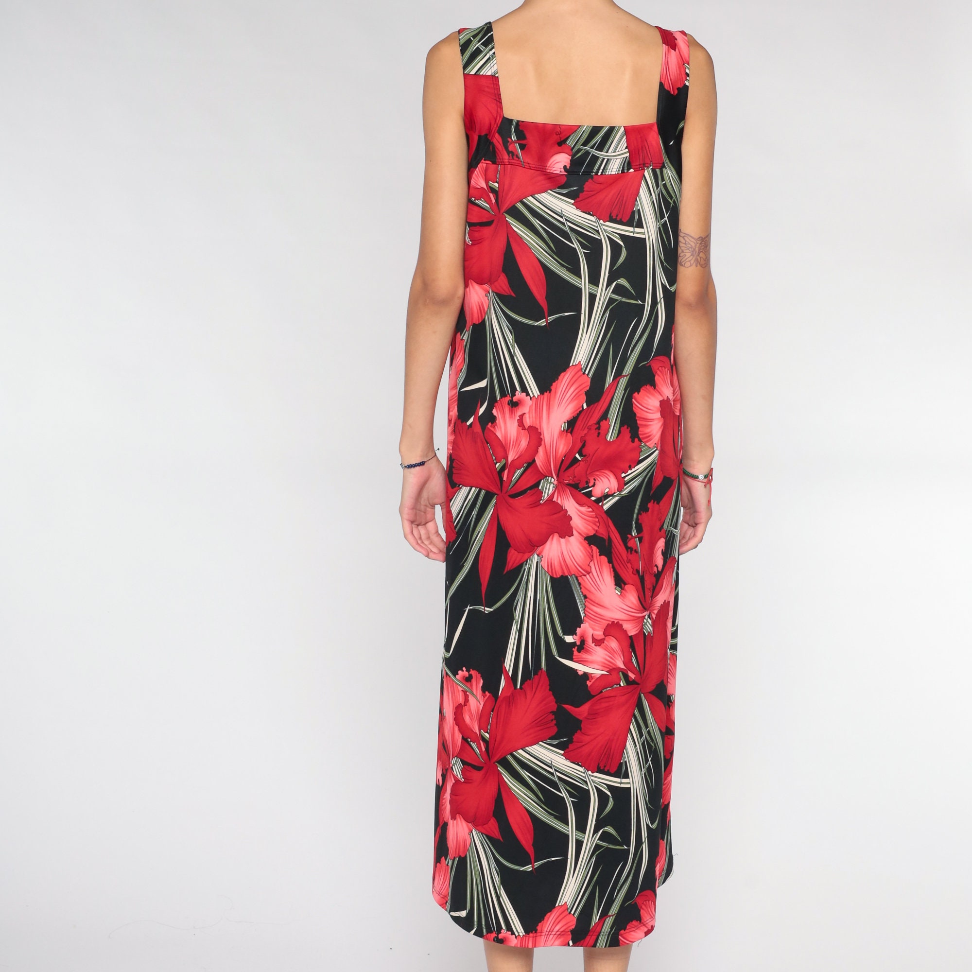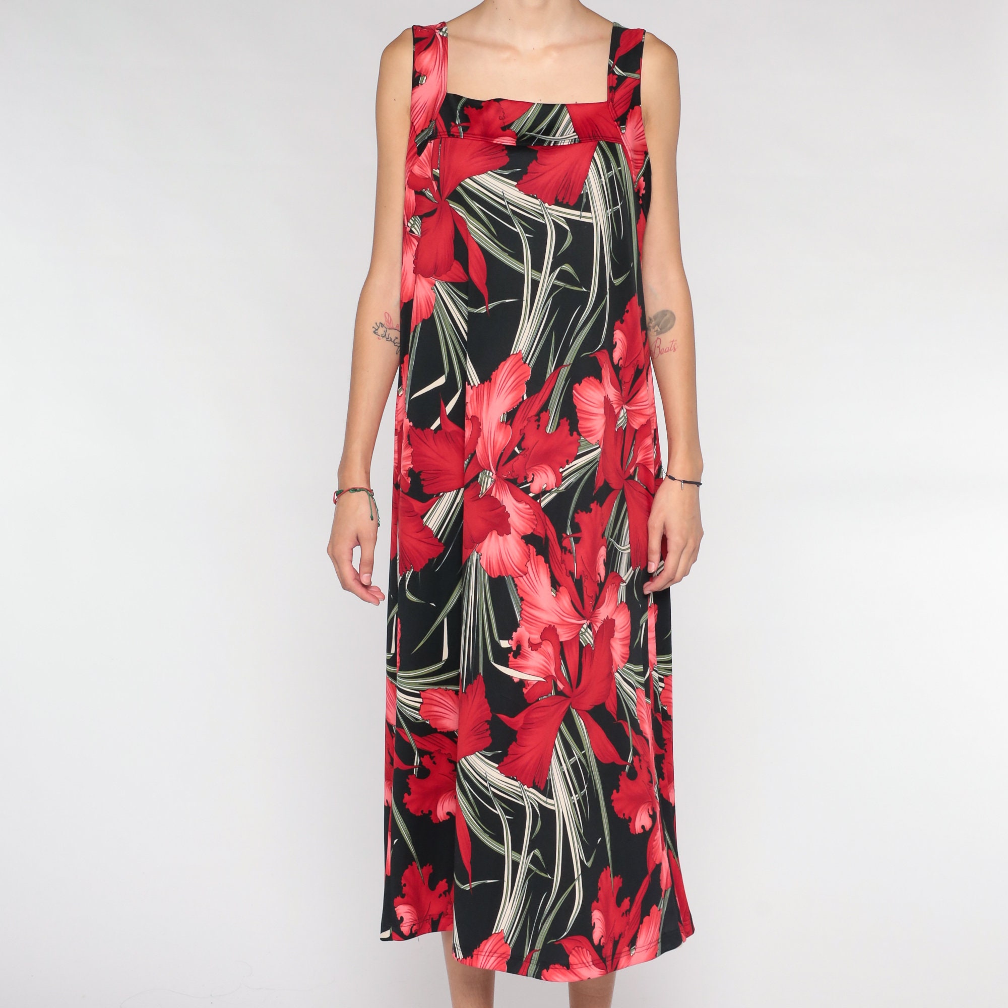 Vintage 90s dress in black with a red and white floral orchid print. Sleeveless; Midi length.