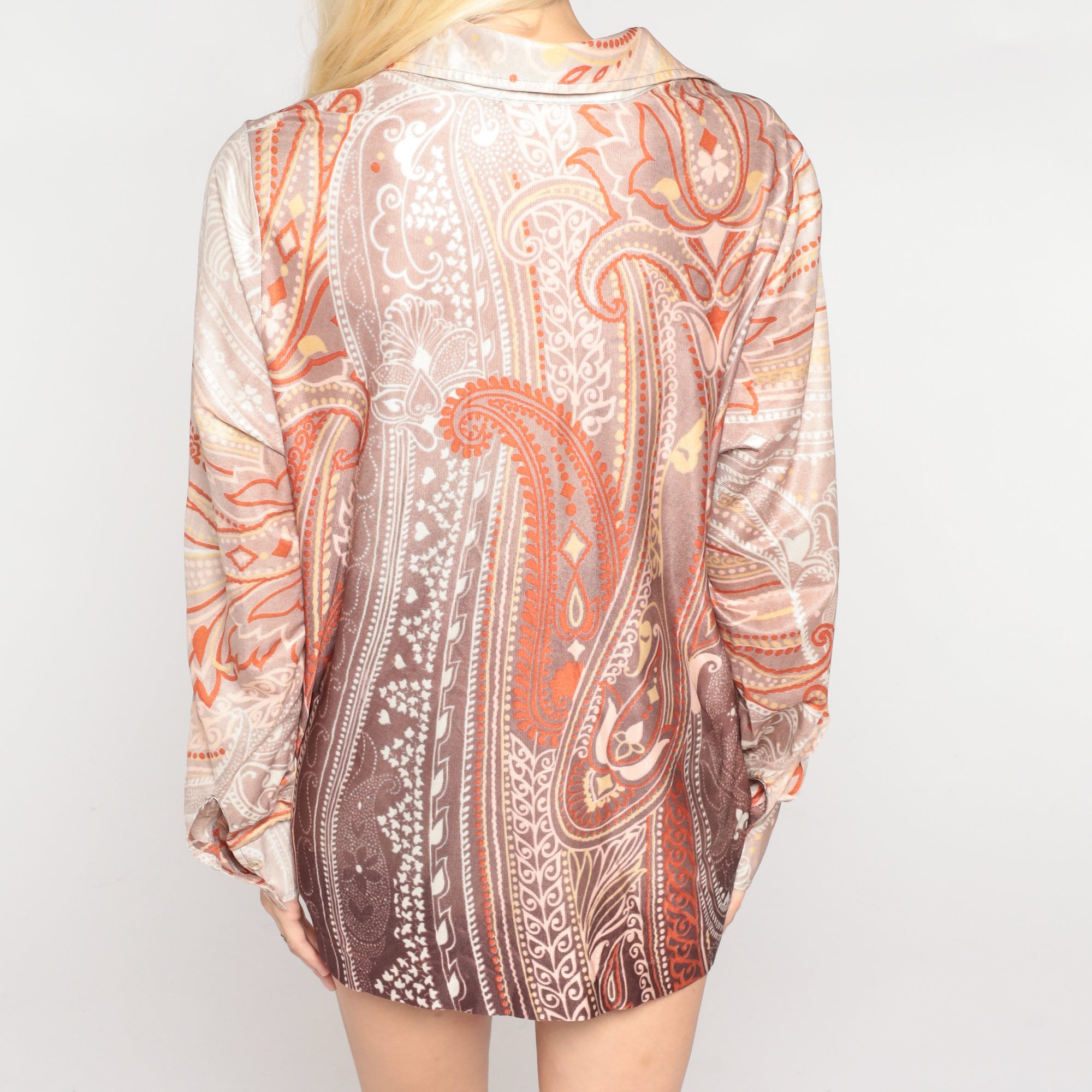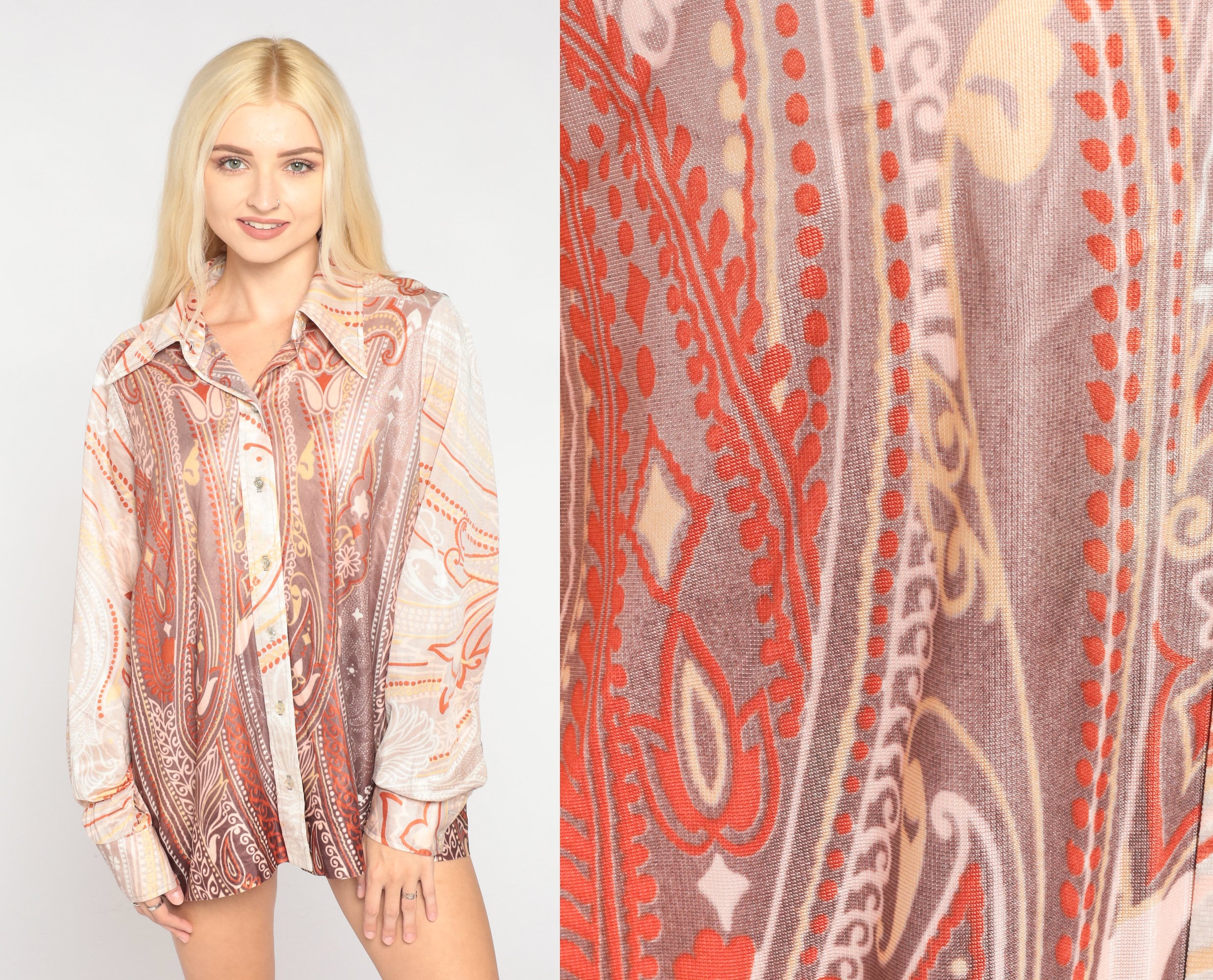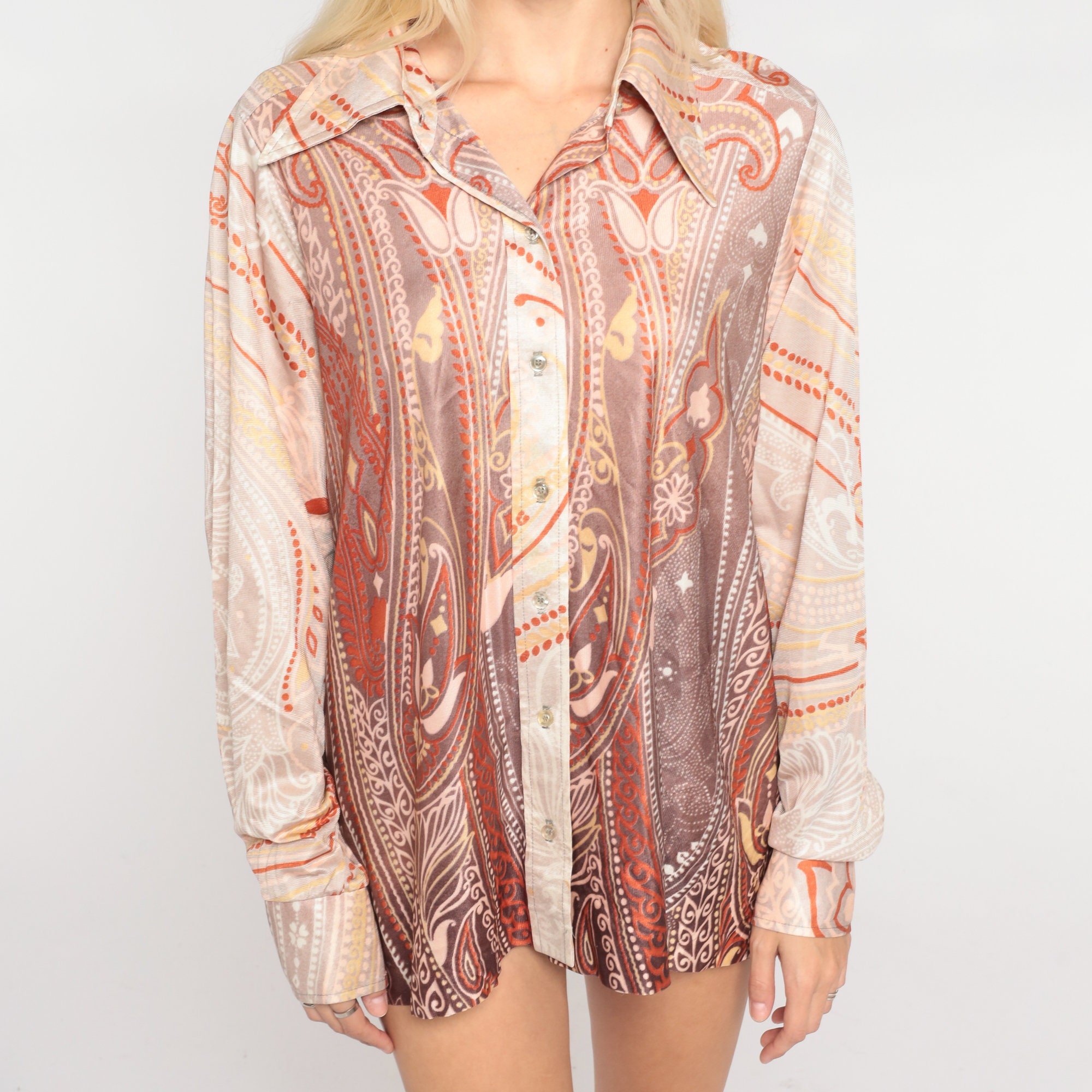 Vintage 70s blouse in an abstract paisley floral print. Long sleeves, a dagger collar, and buttons down the front.