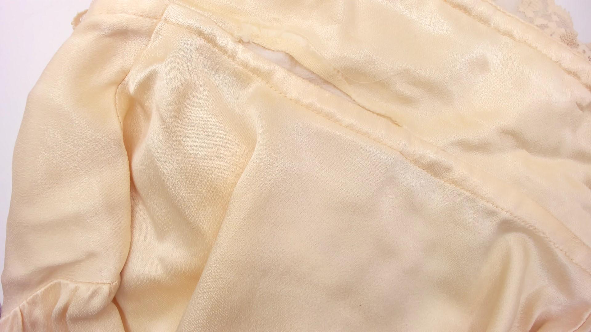 Vintage 70s blouse by Jessica's Gunnies in a cream satin with floral embroidery and cutouts. Long puff sleeves, buttons up the front.