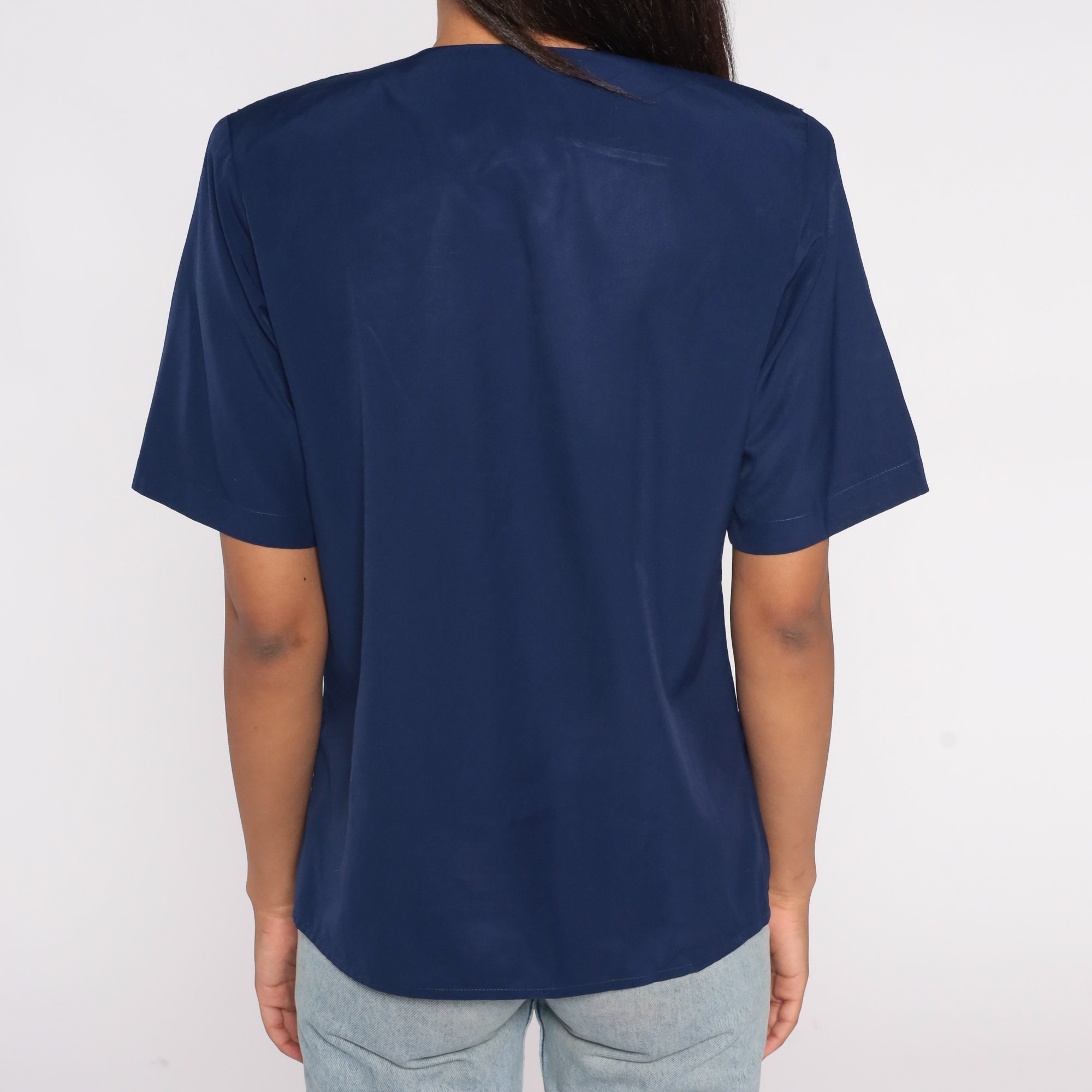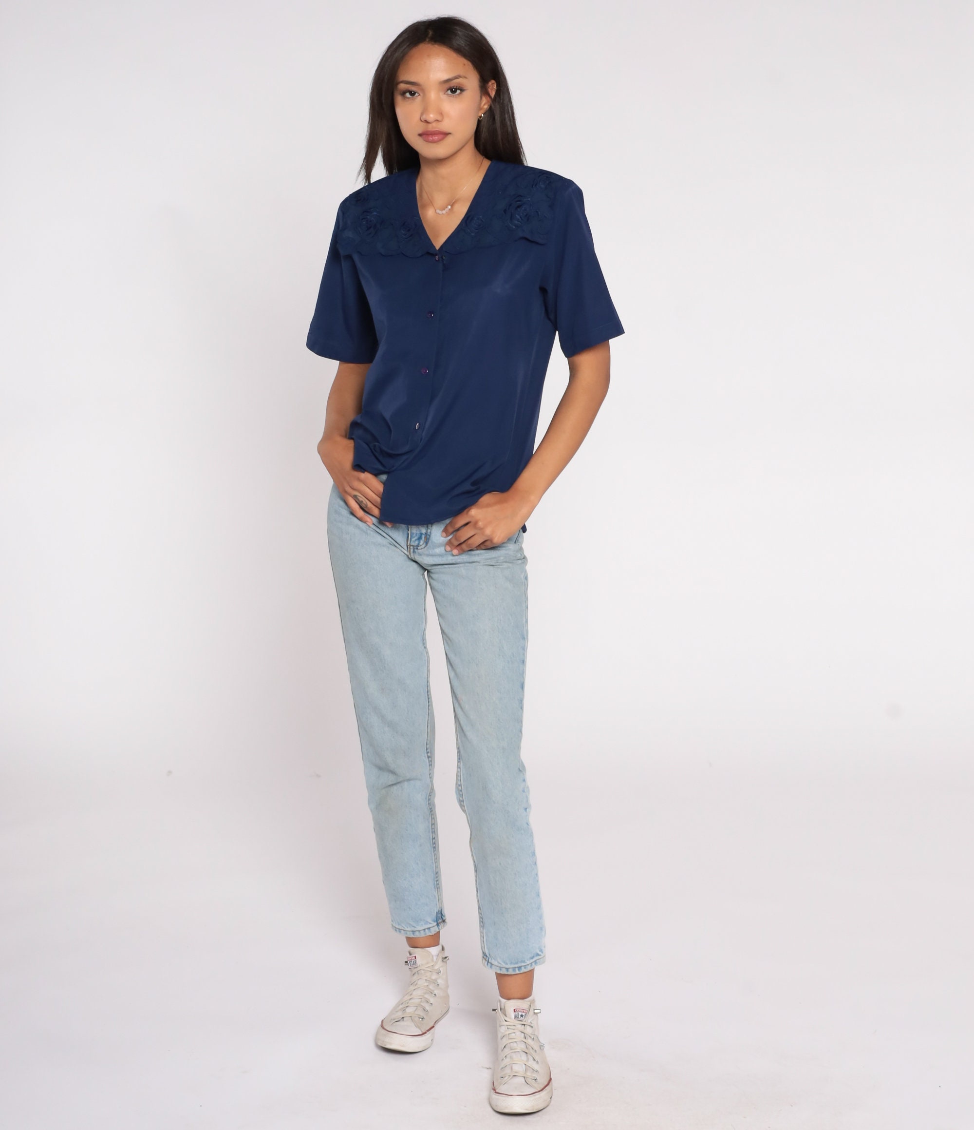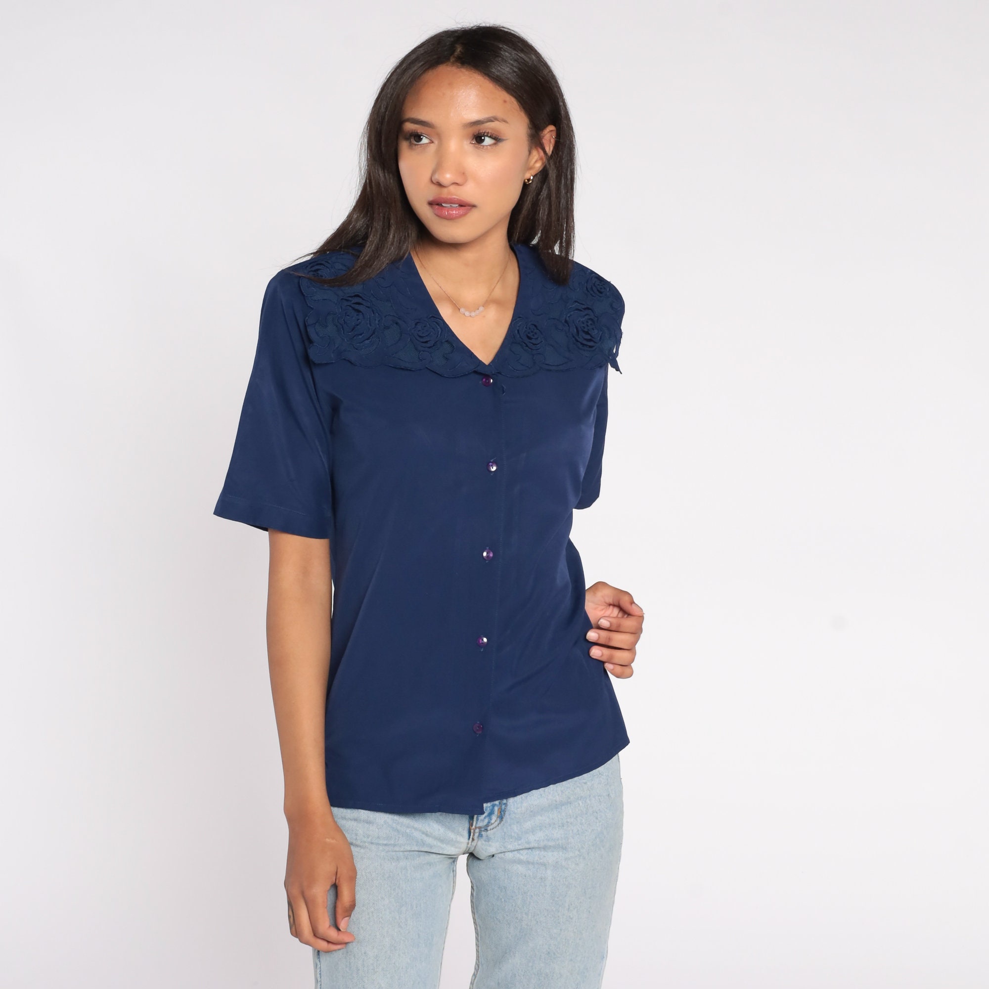 Vintage 90s shirt in navy blue with floral embroidery on the collar. Buttons up the front with short sleeves.
