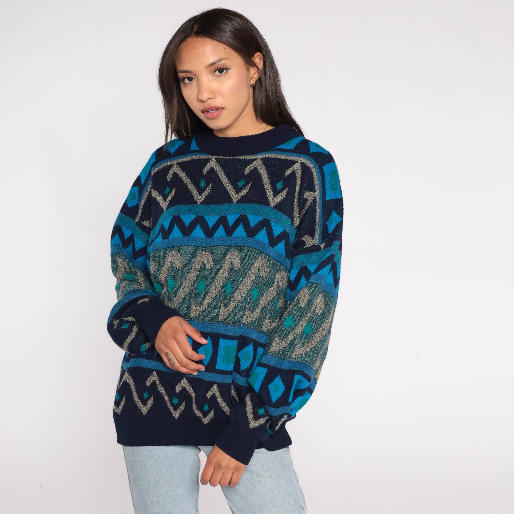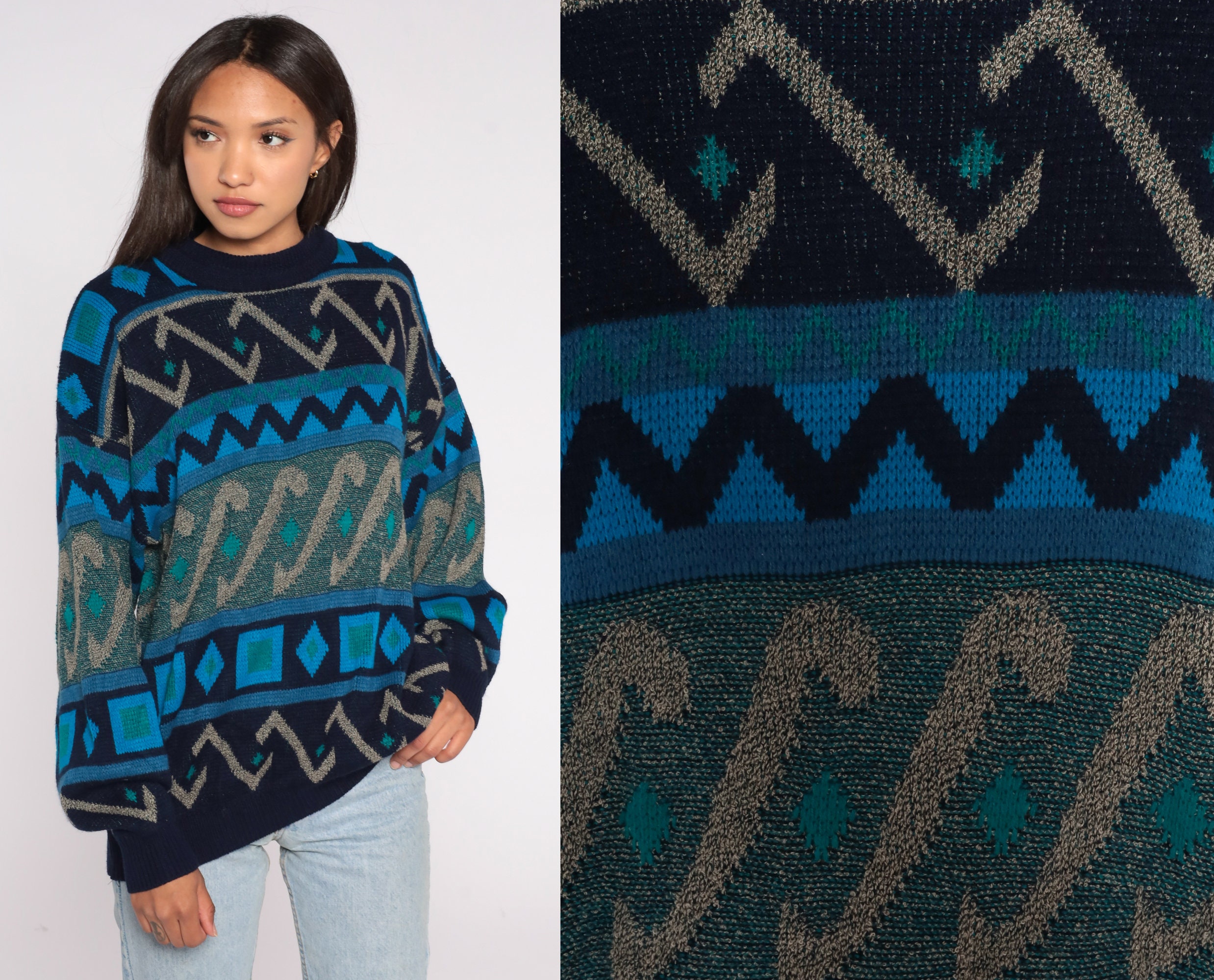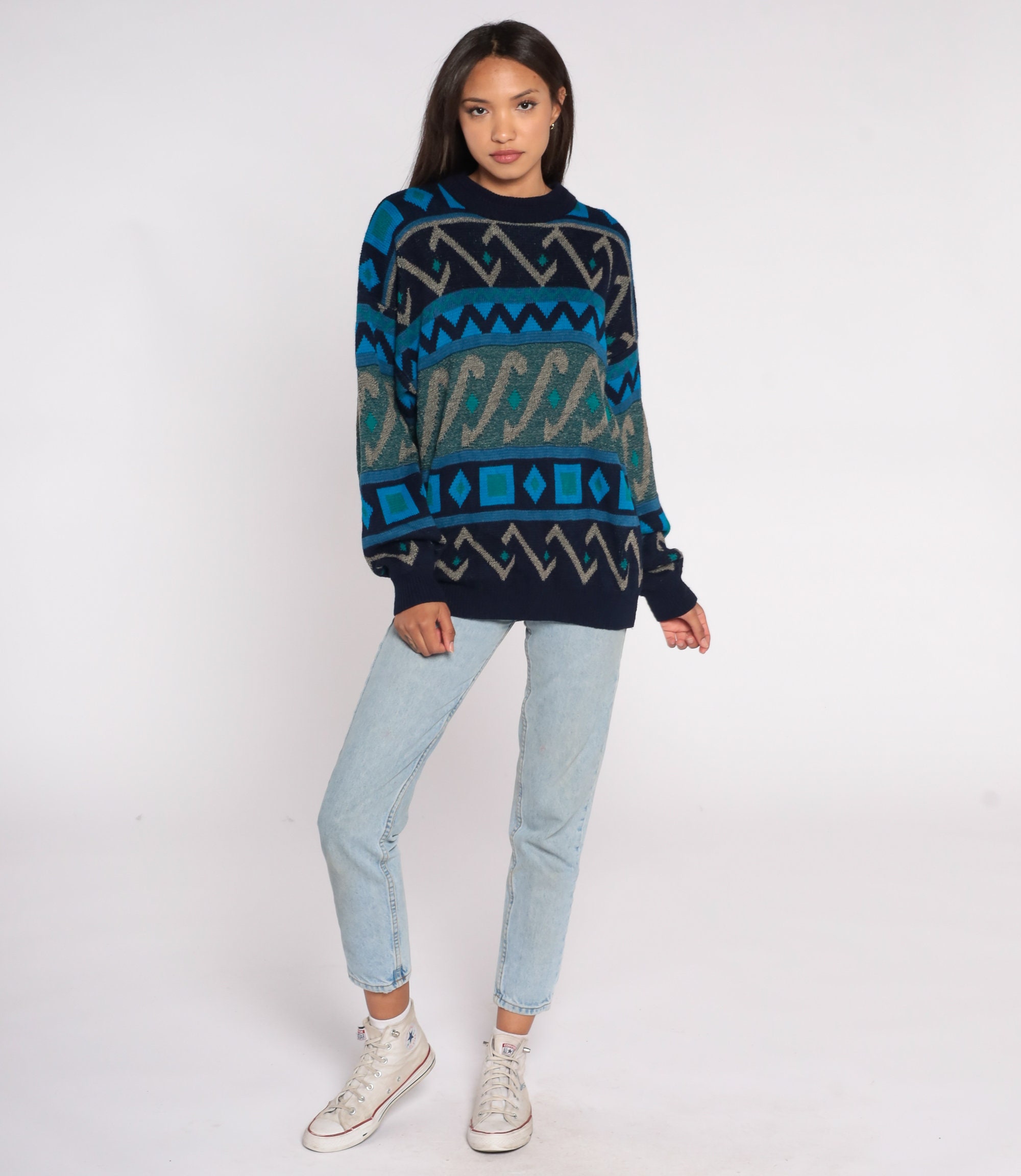 Vintage 90s sweater with a geometric striped print. Slouchy fit.