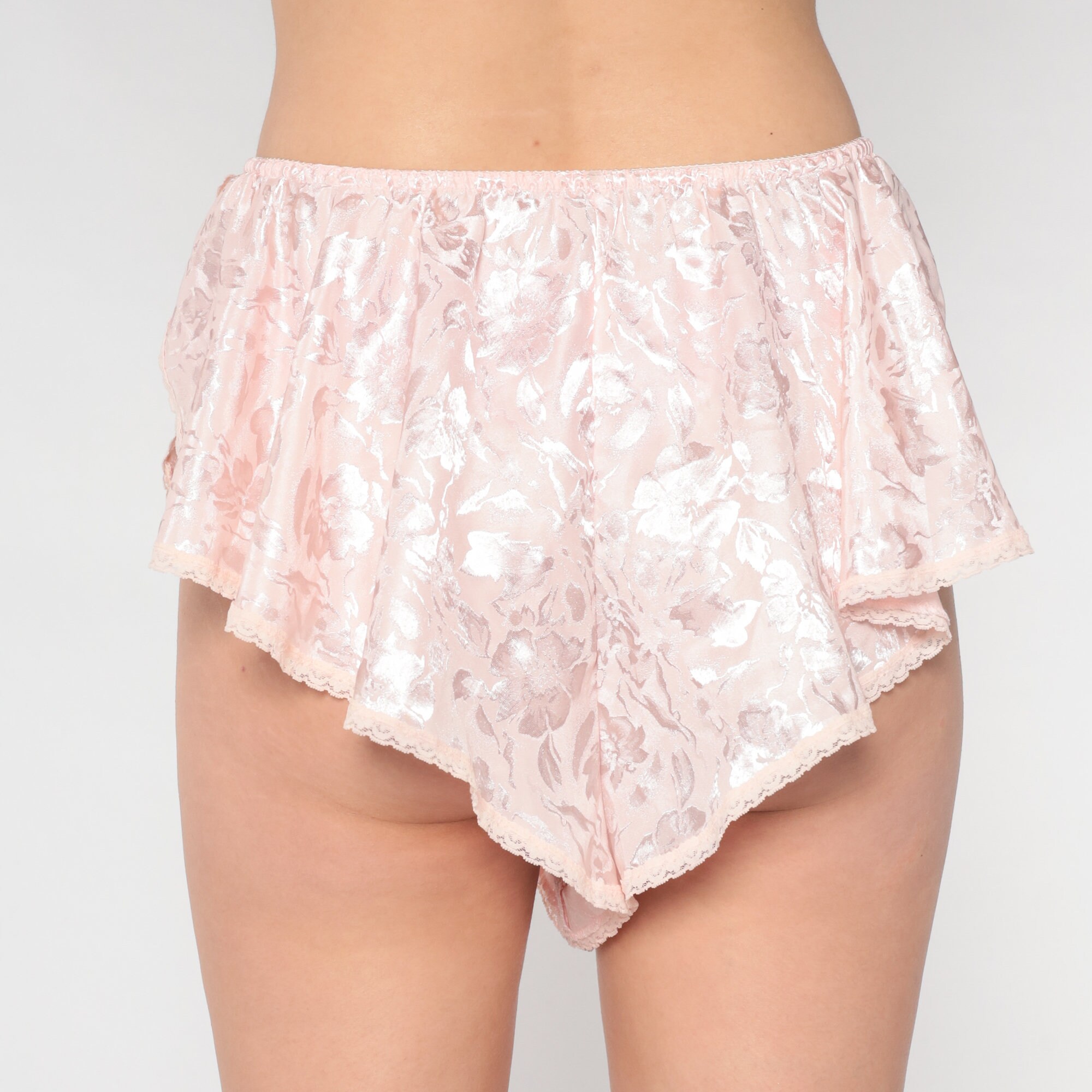 Vintage 90s sleep shorts in baby pink with an embossed floral print, high cut fluttery sides and an elastic waist.