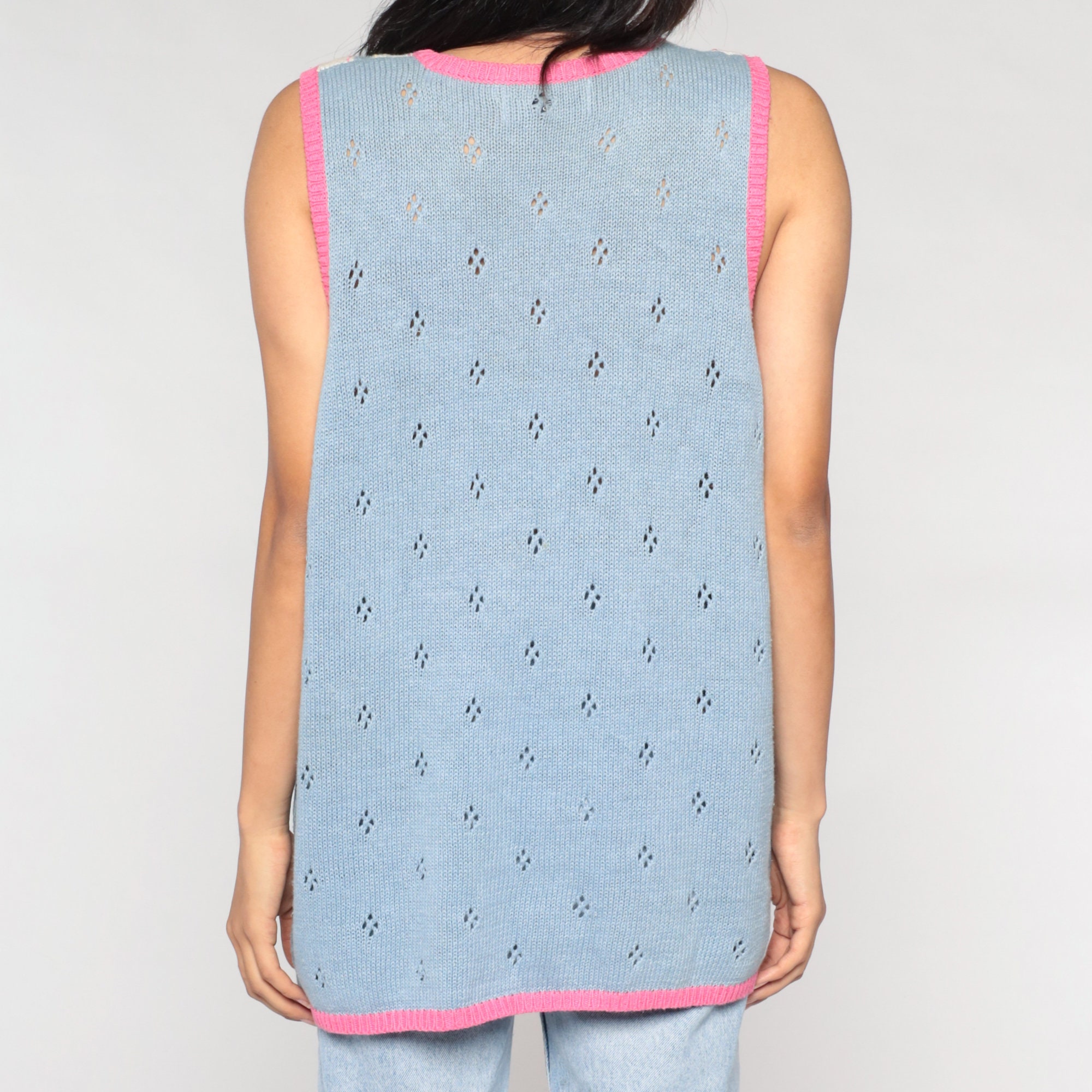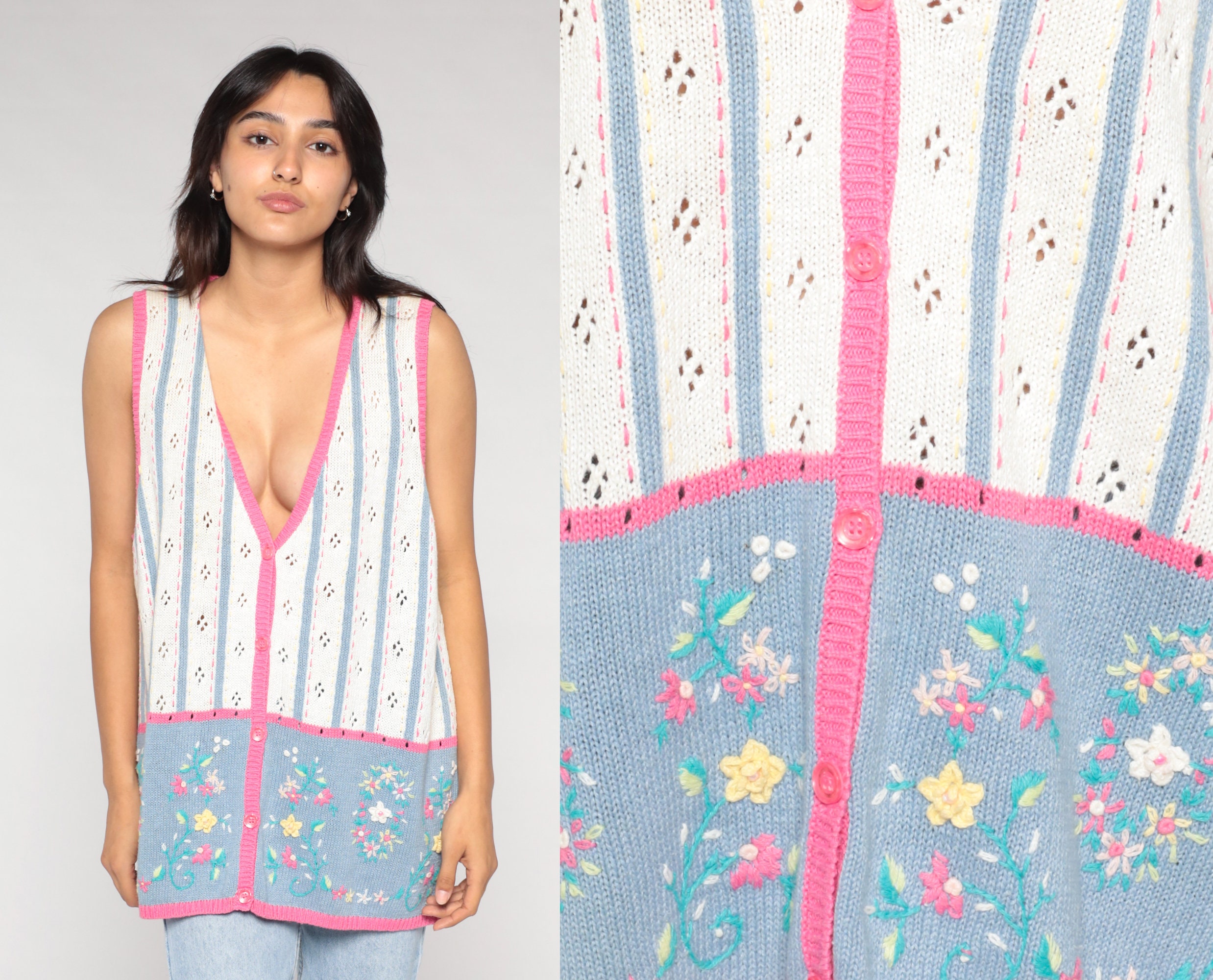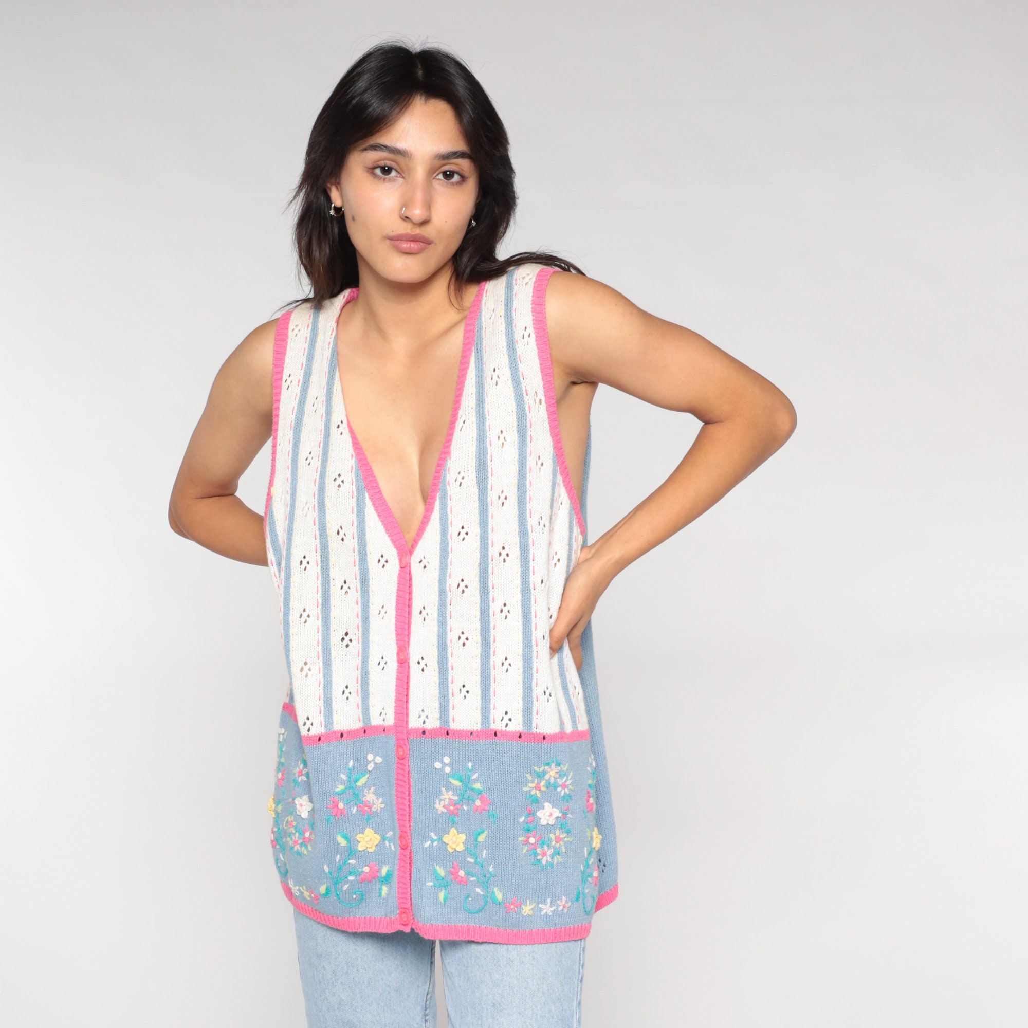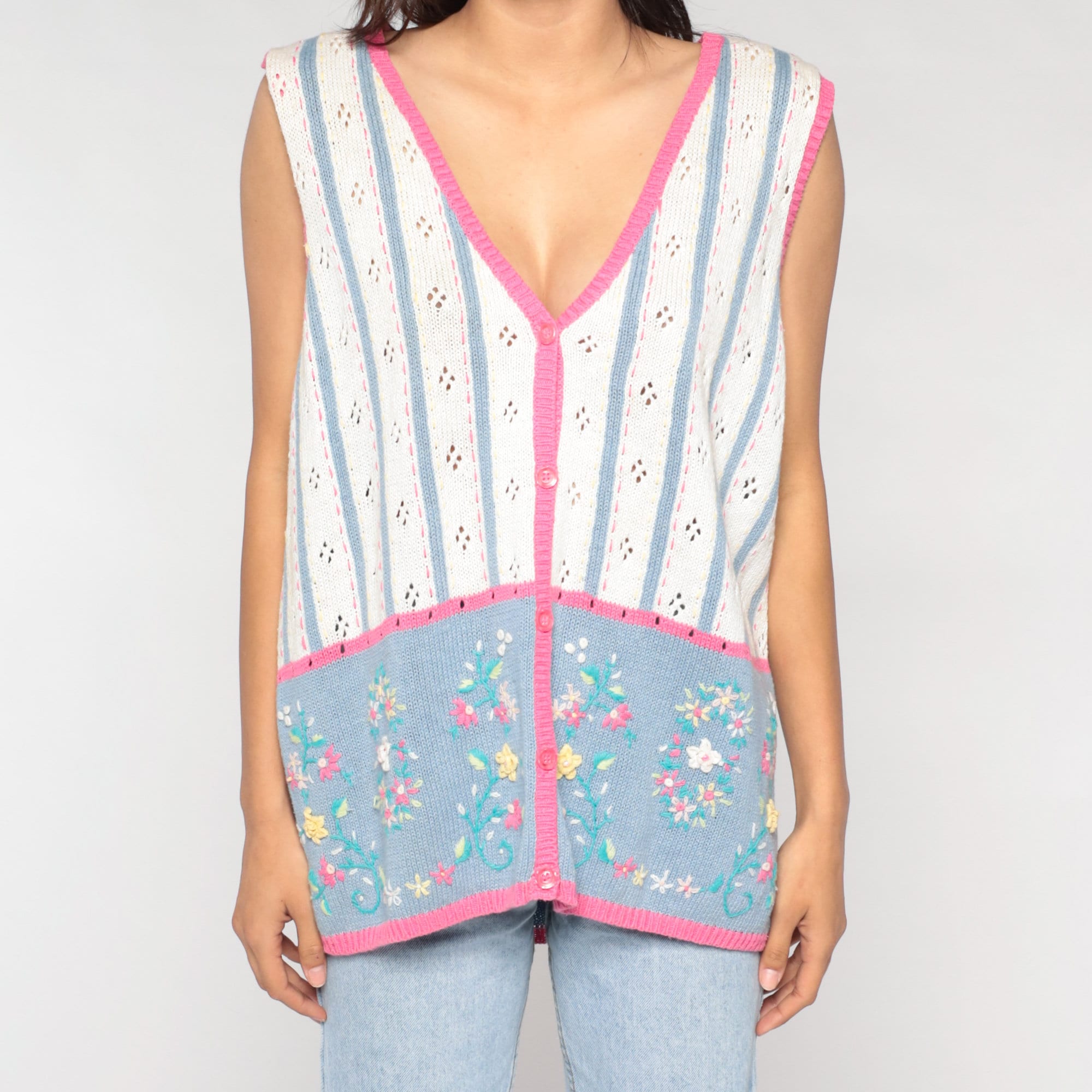 Vintage 90s sweater vest top in blue, pink, and white pointelle knit with a floral design and buttons up the front.