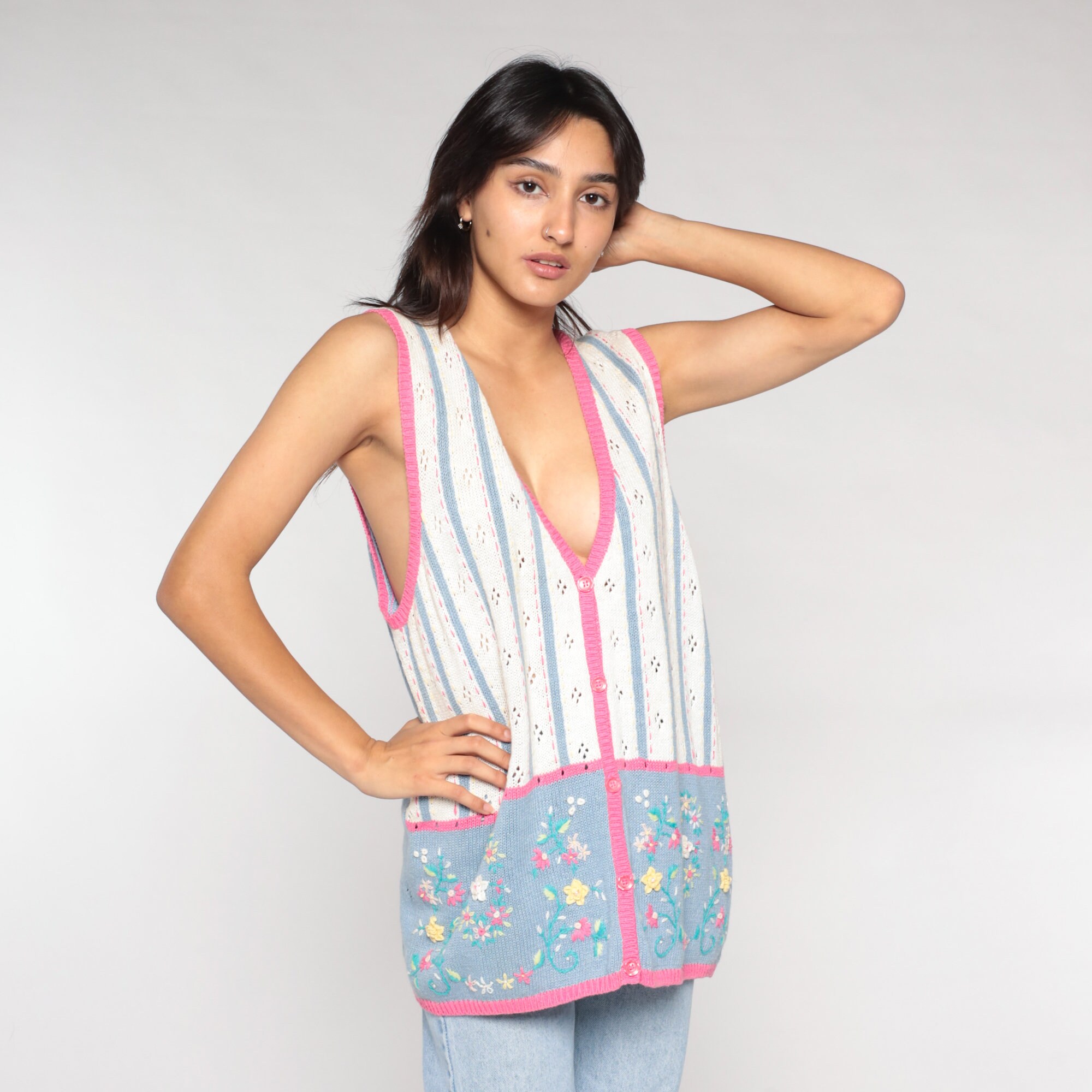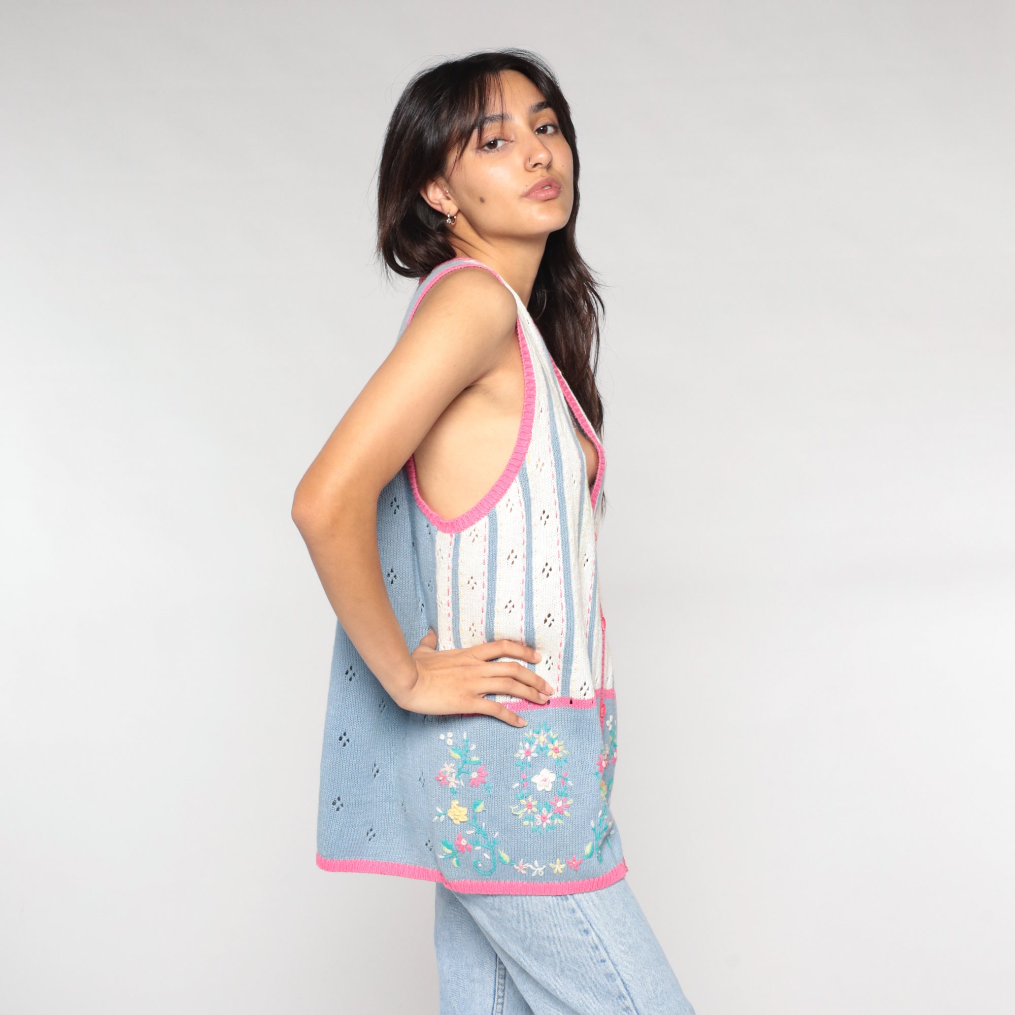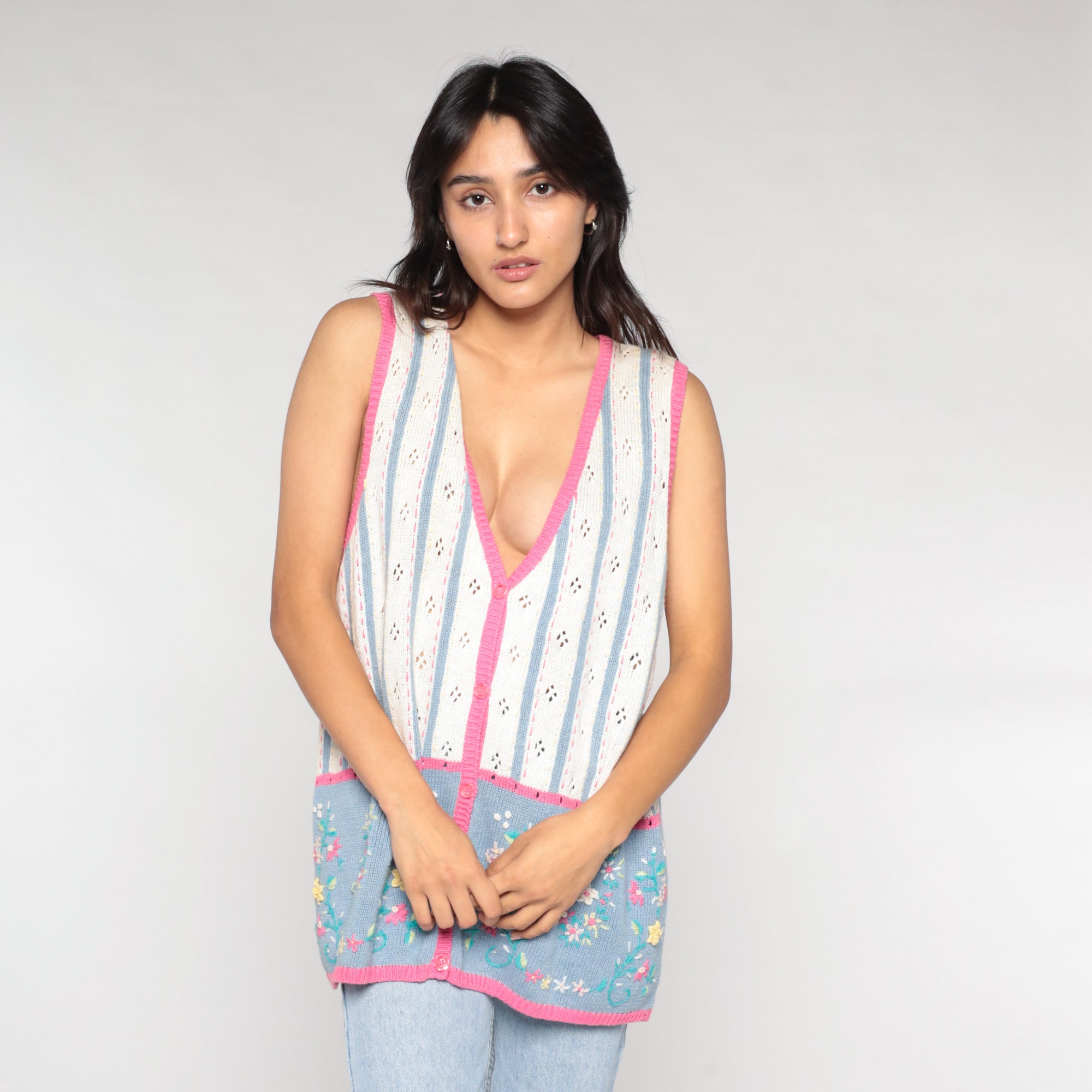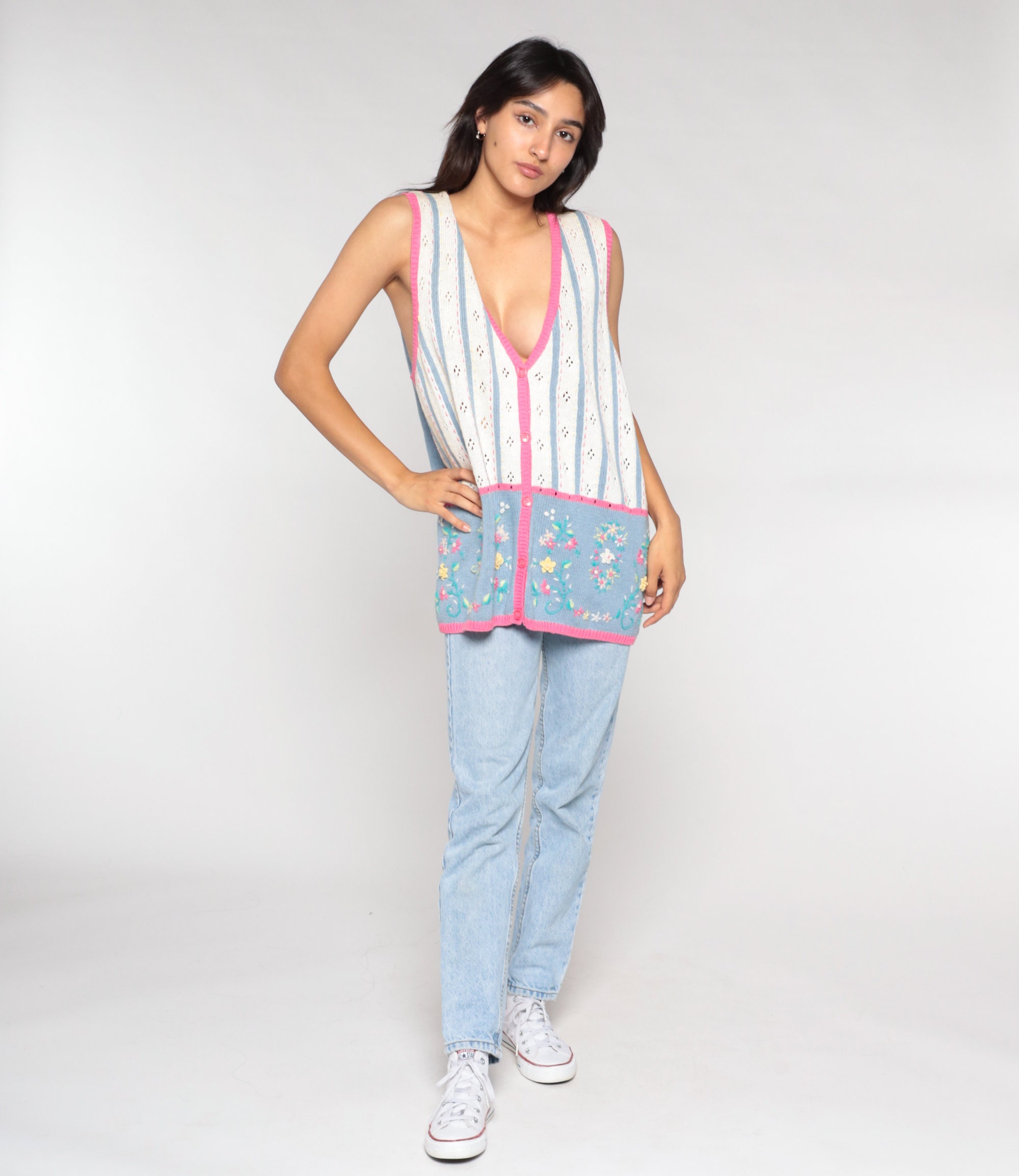 Vintage 90s sweater vest top in blue, pink, and white pointelle knit with a floral design and buttons up the front.