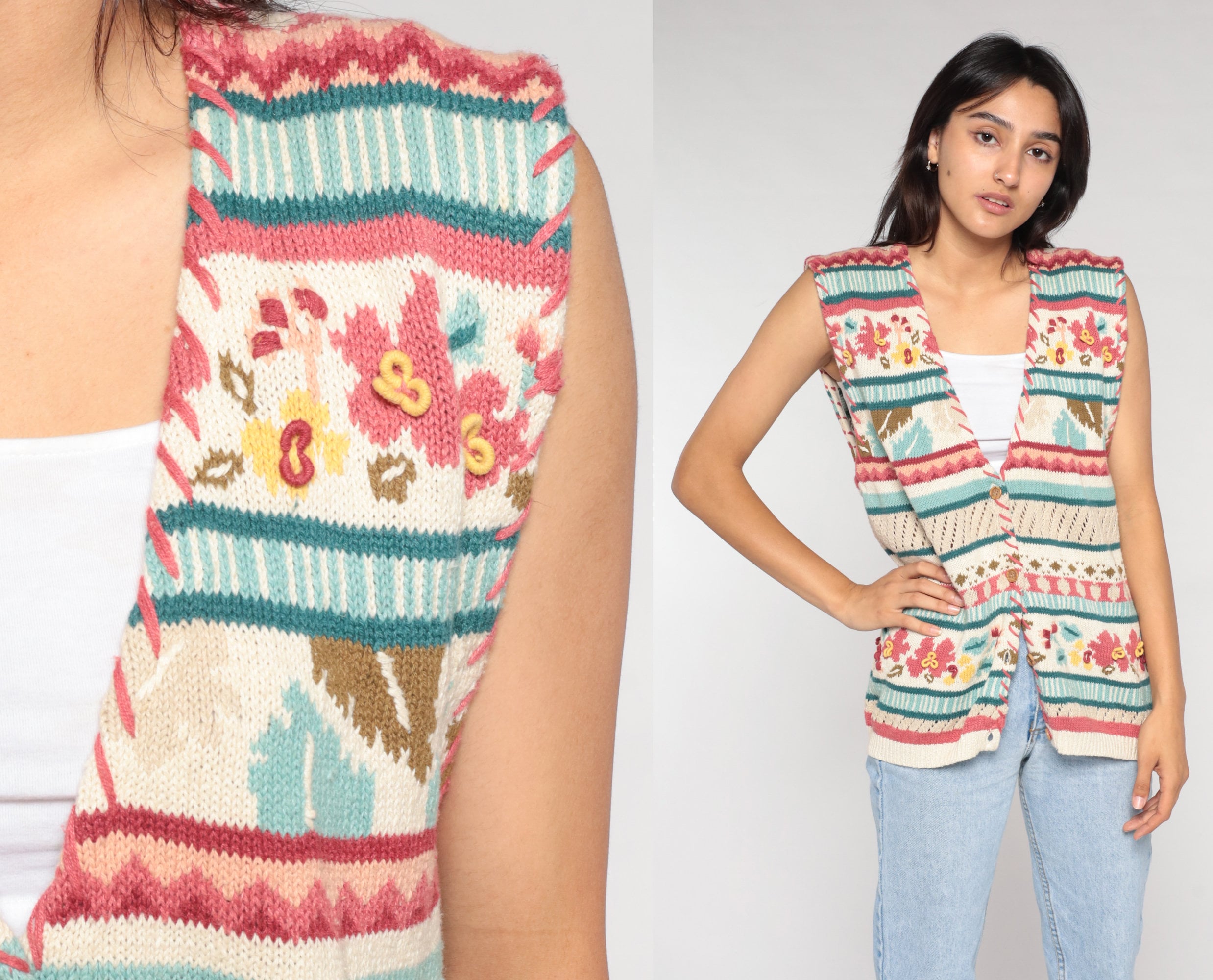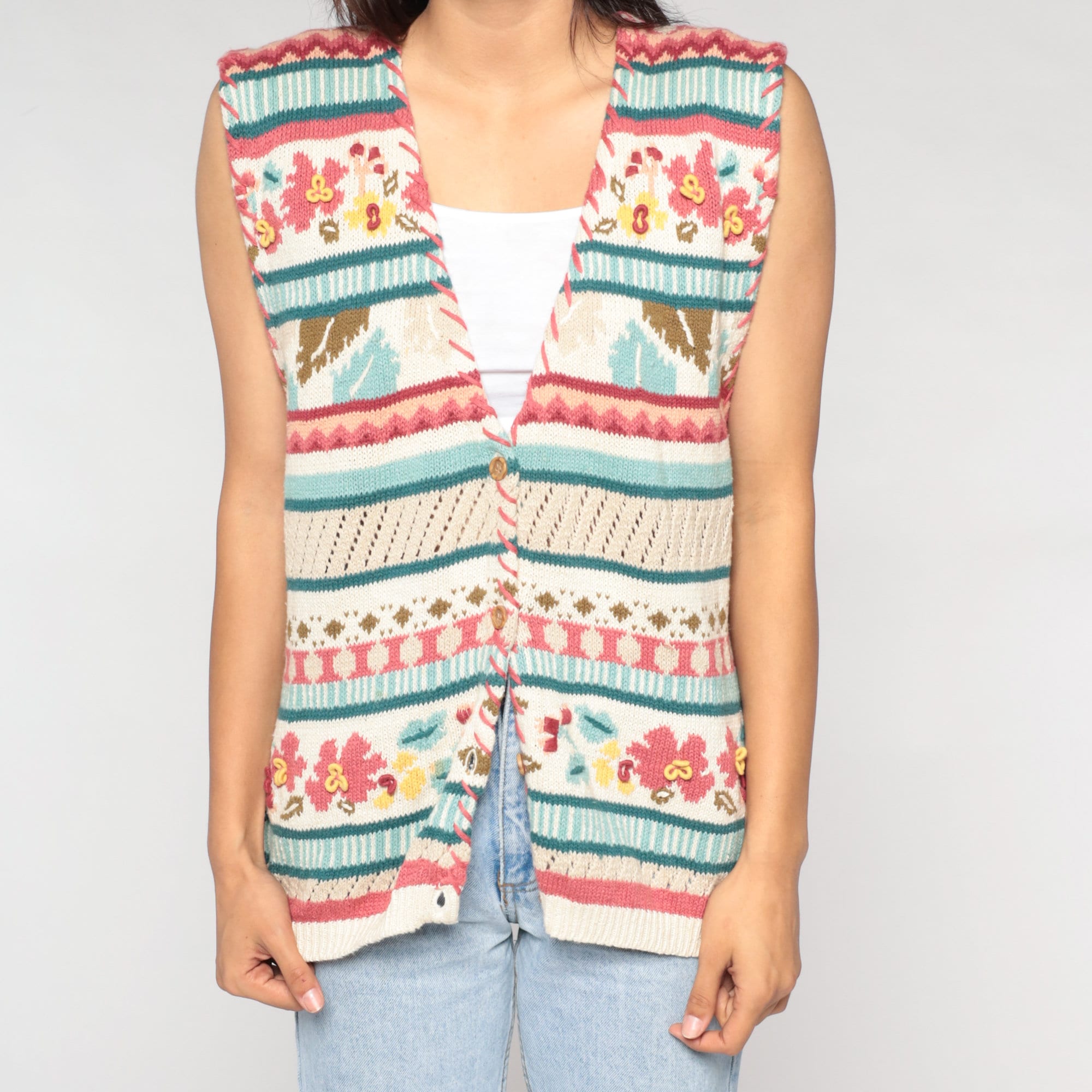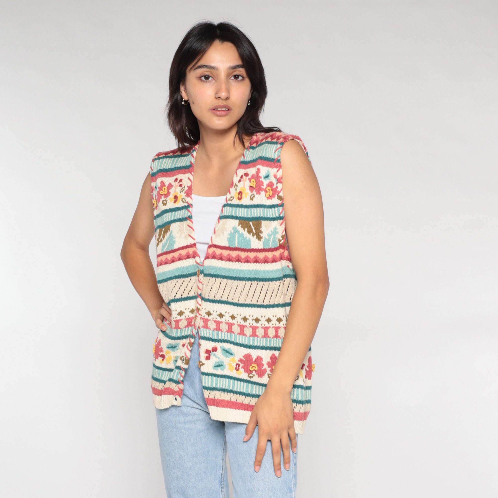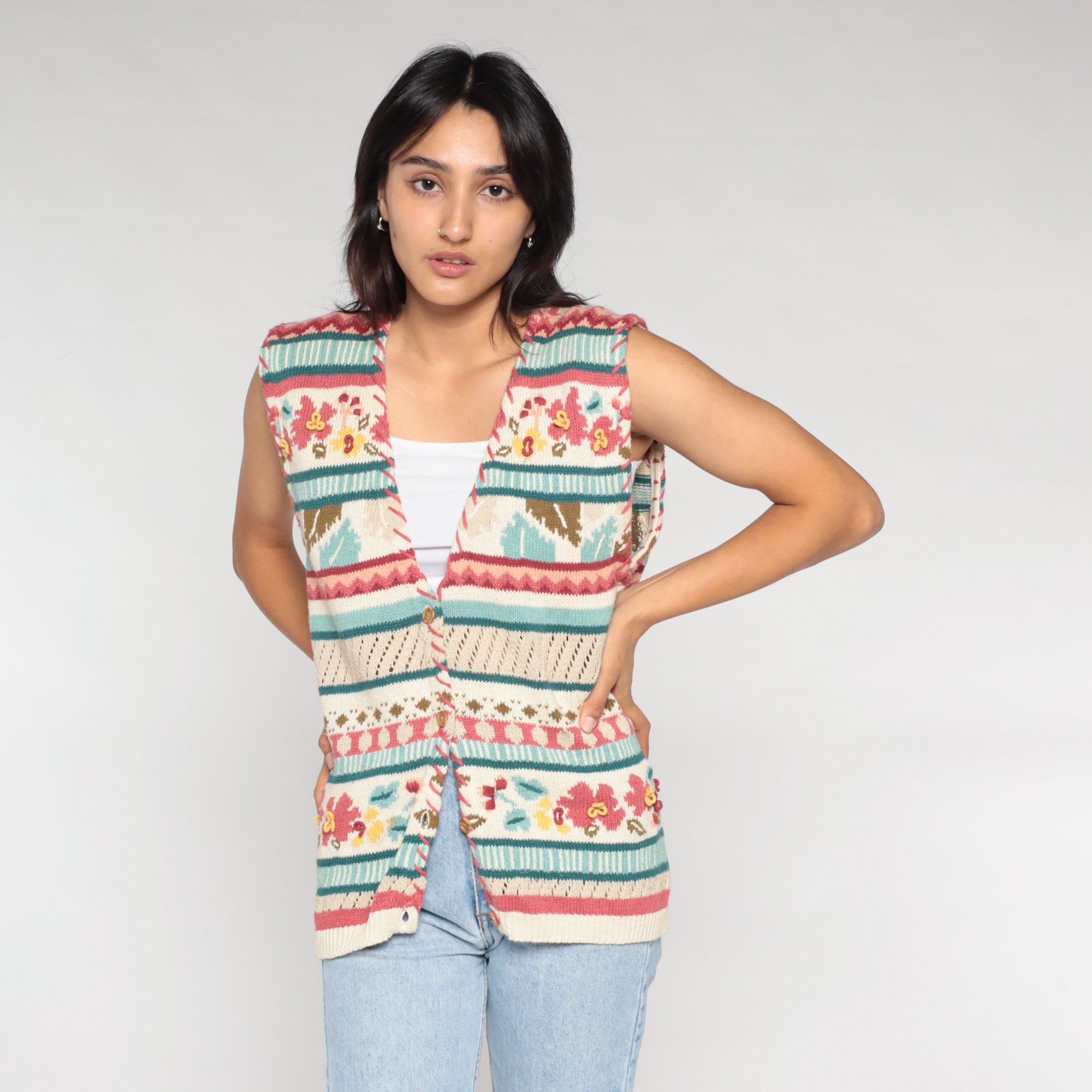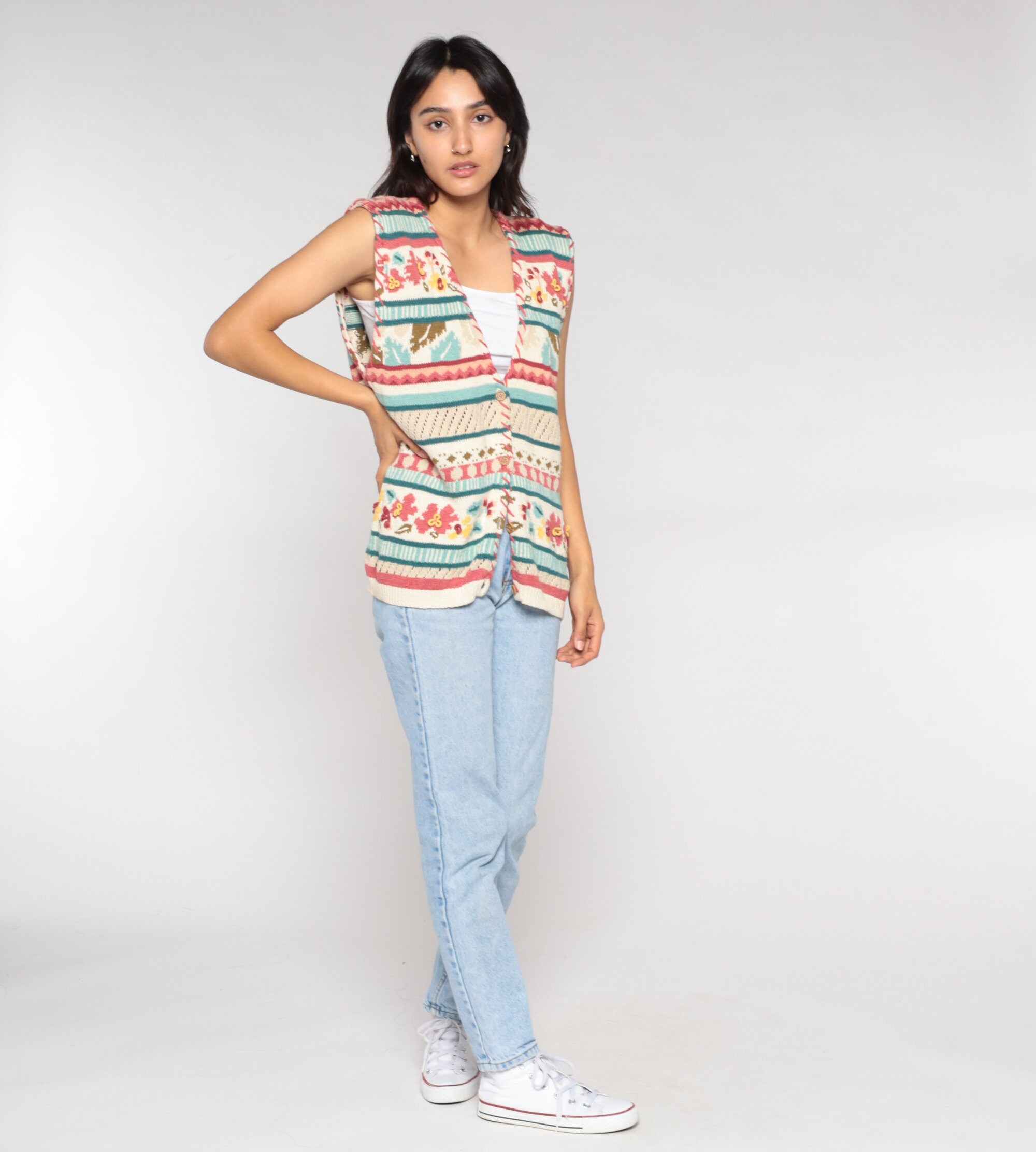 Vintage 90s sweater vest top in a striped floral design with buttons up the front.
