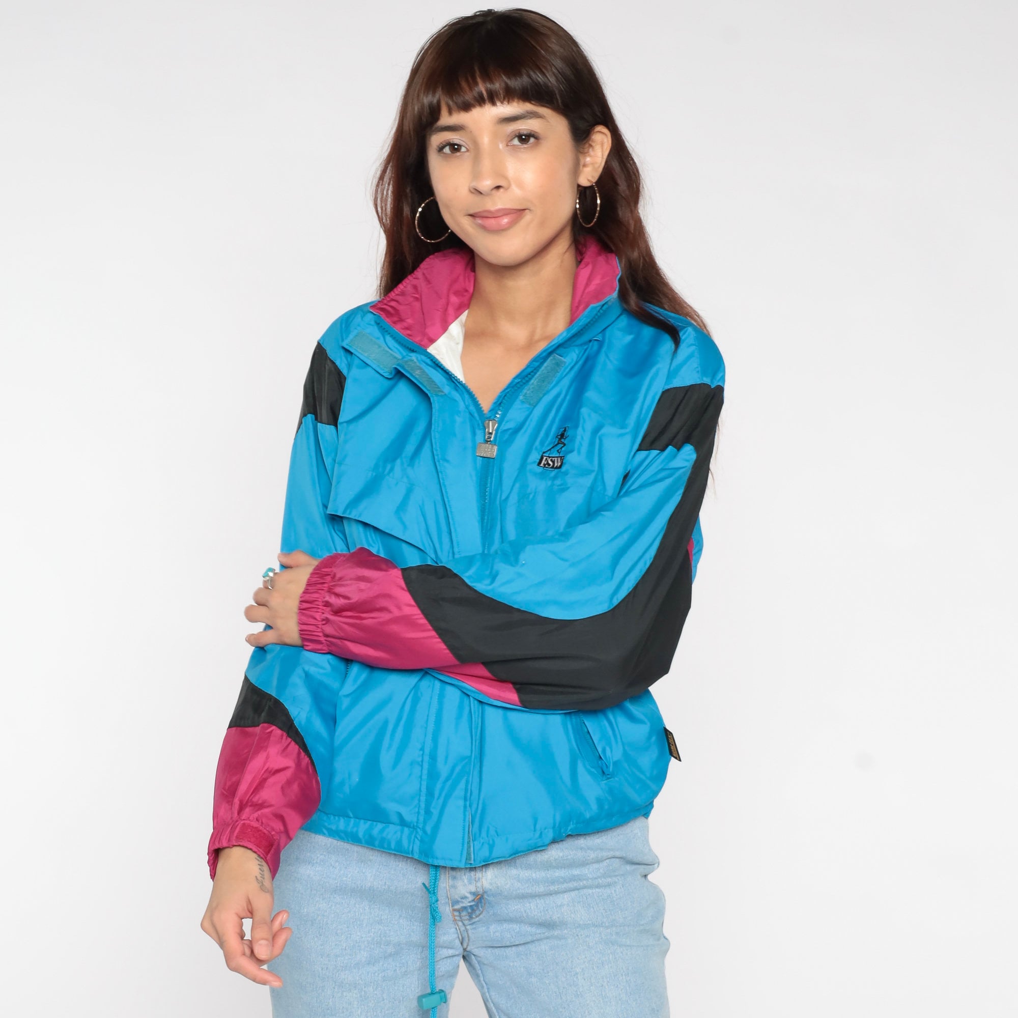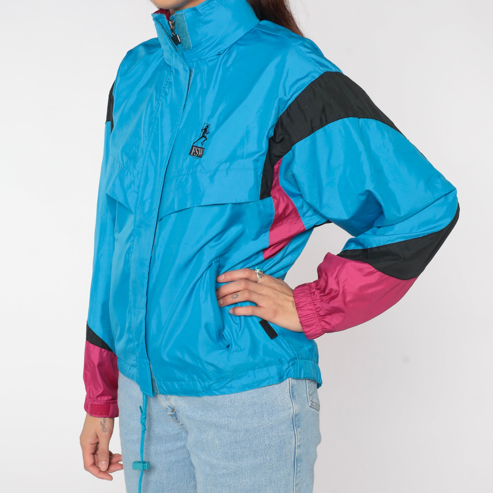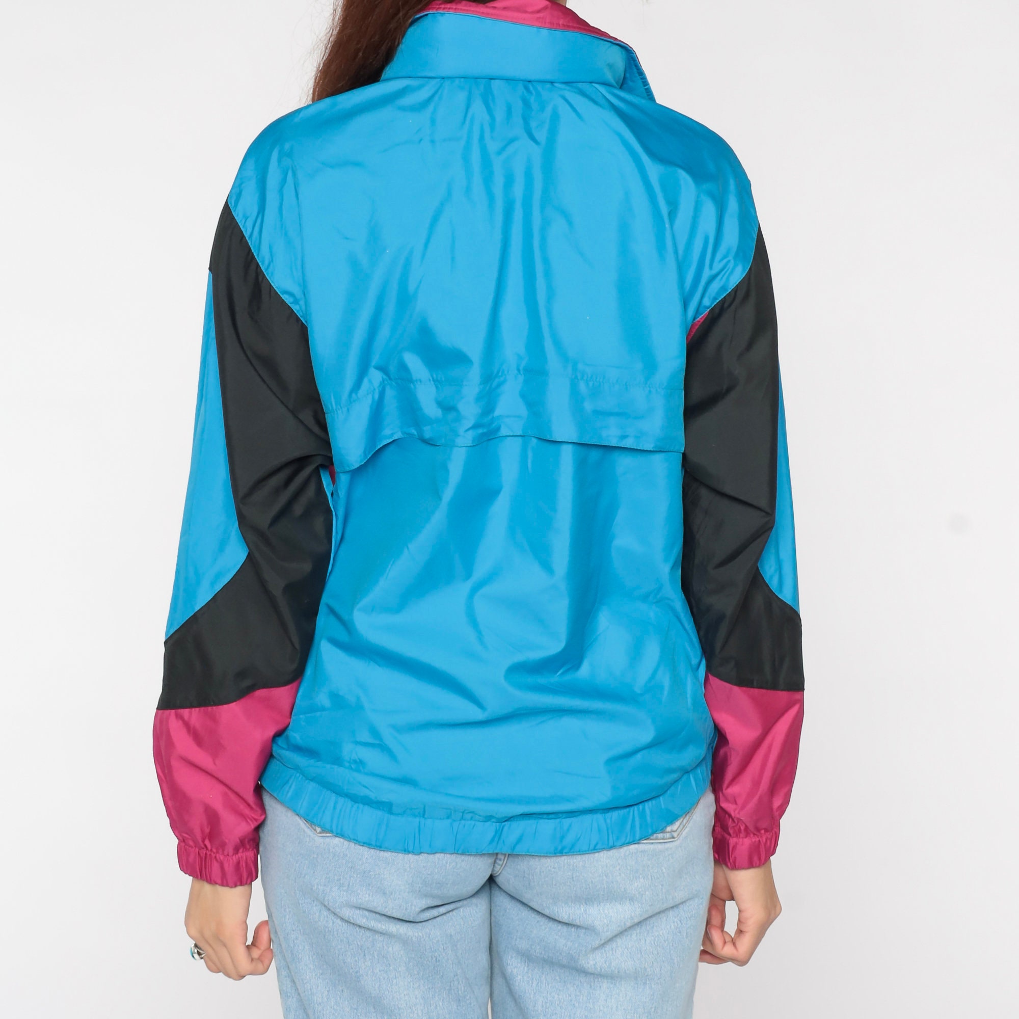 Vintage 90s windbreaker jacket in blue with pink and black trim and a thin hood. Zips up the front.