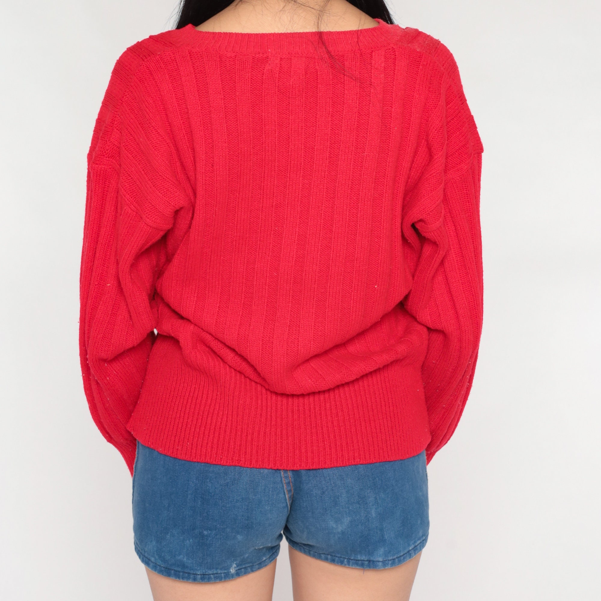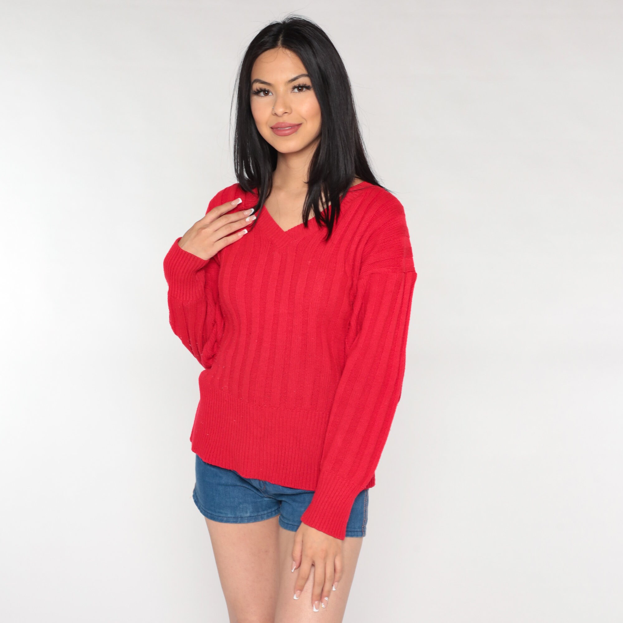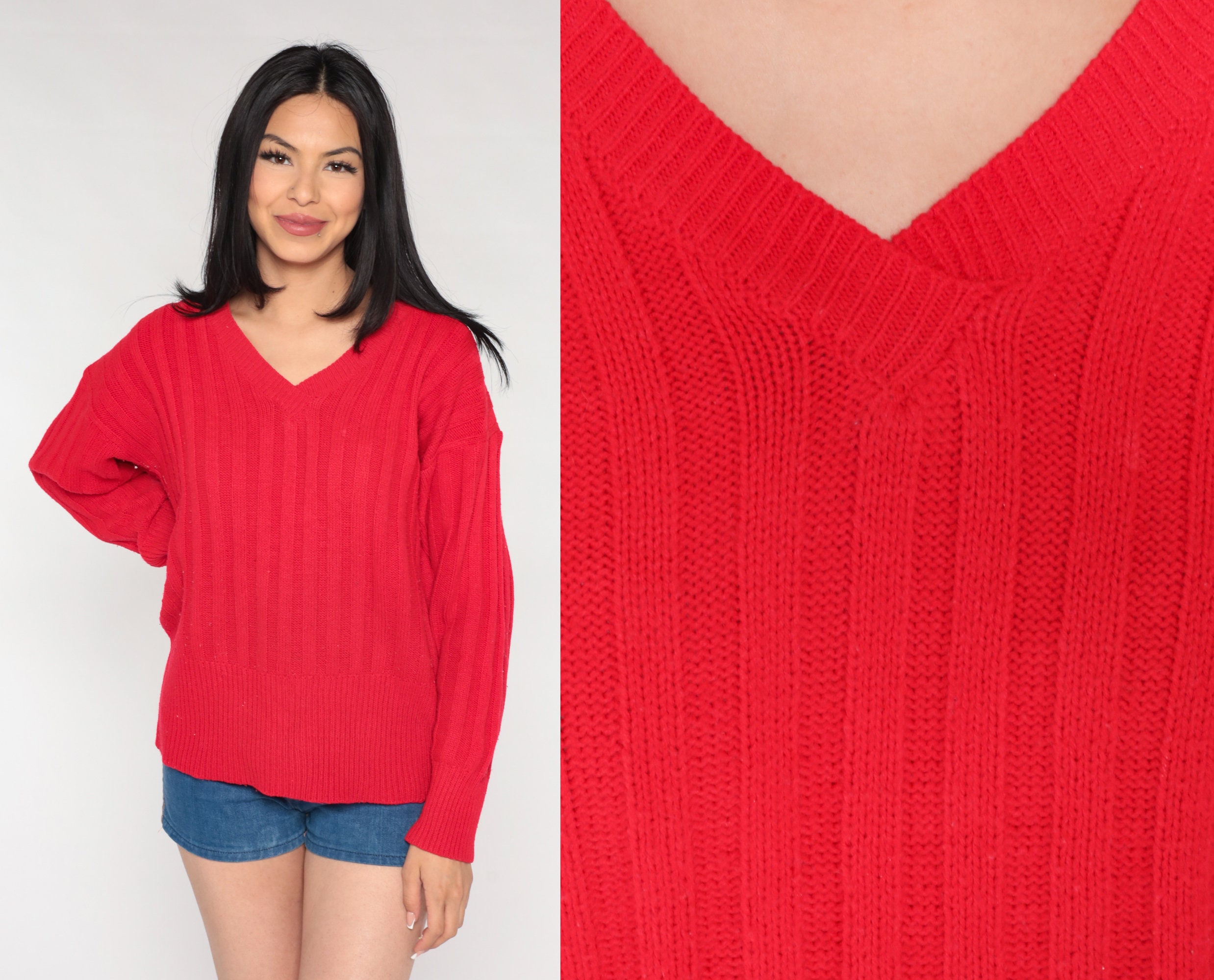 Vintage 80s sweater in red acrylic knit with a v neck.