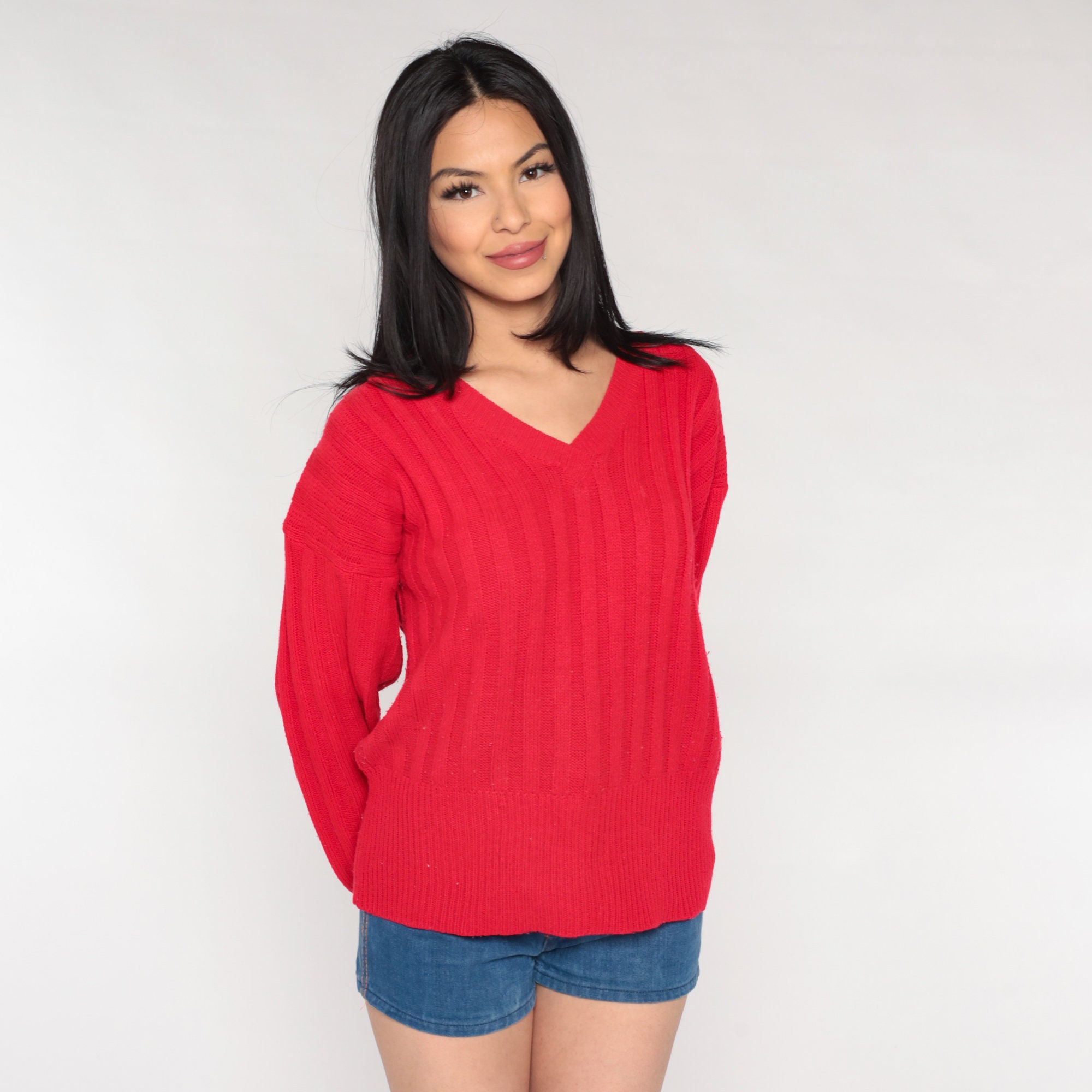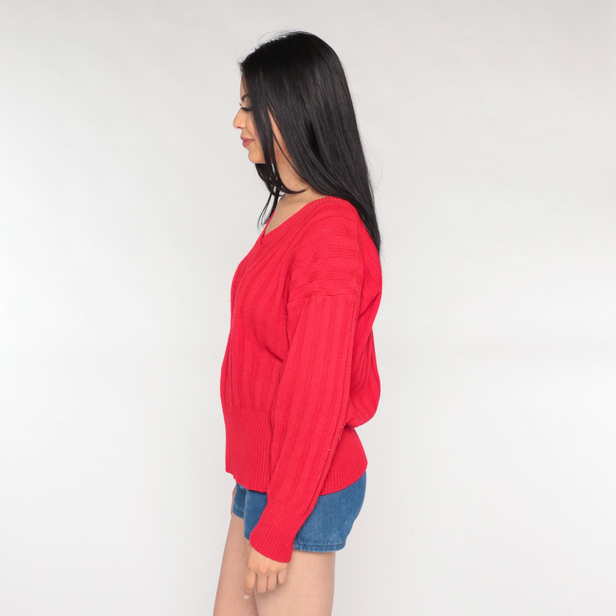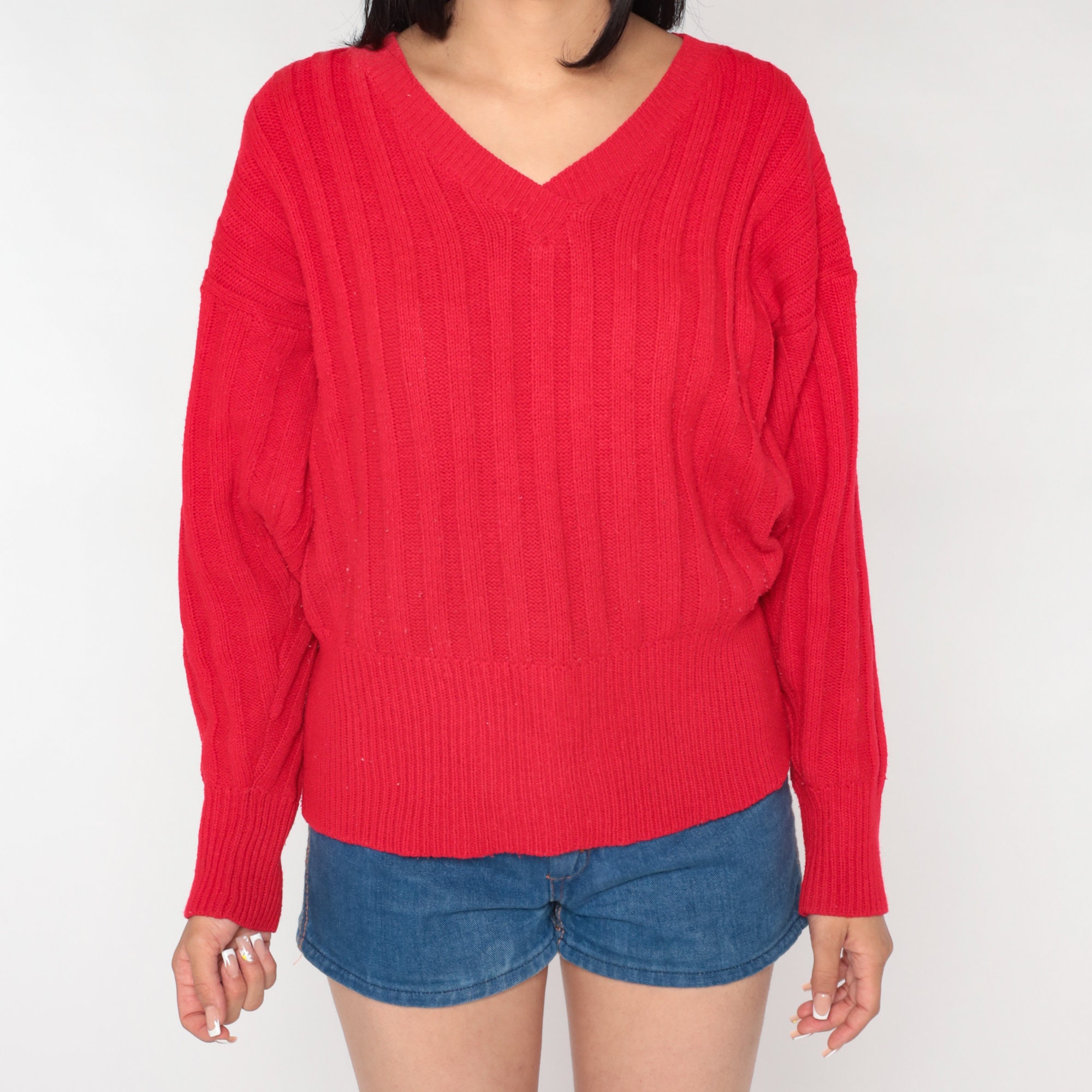 Vintage 80s sweater in red acrylic knit with a v neck.