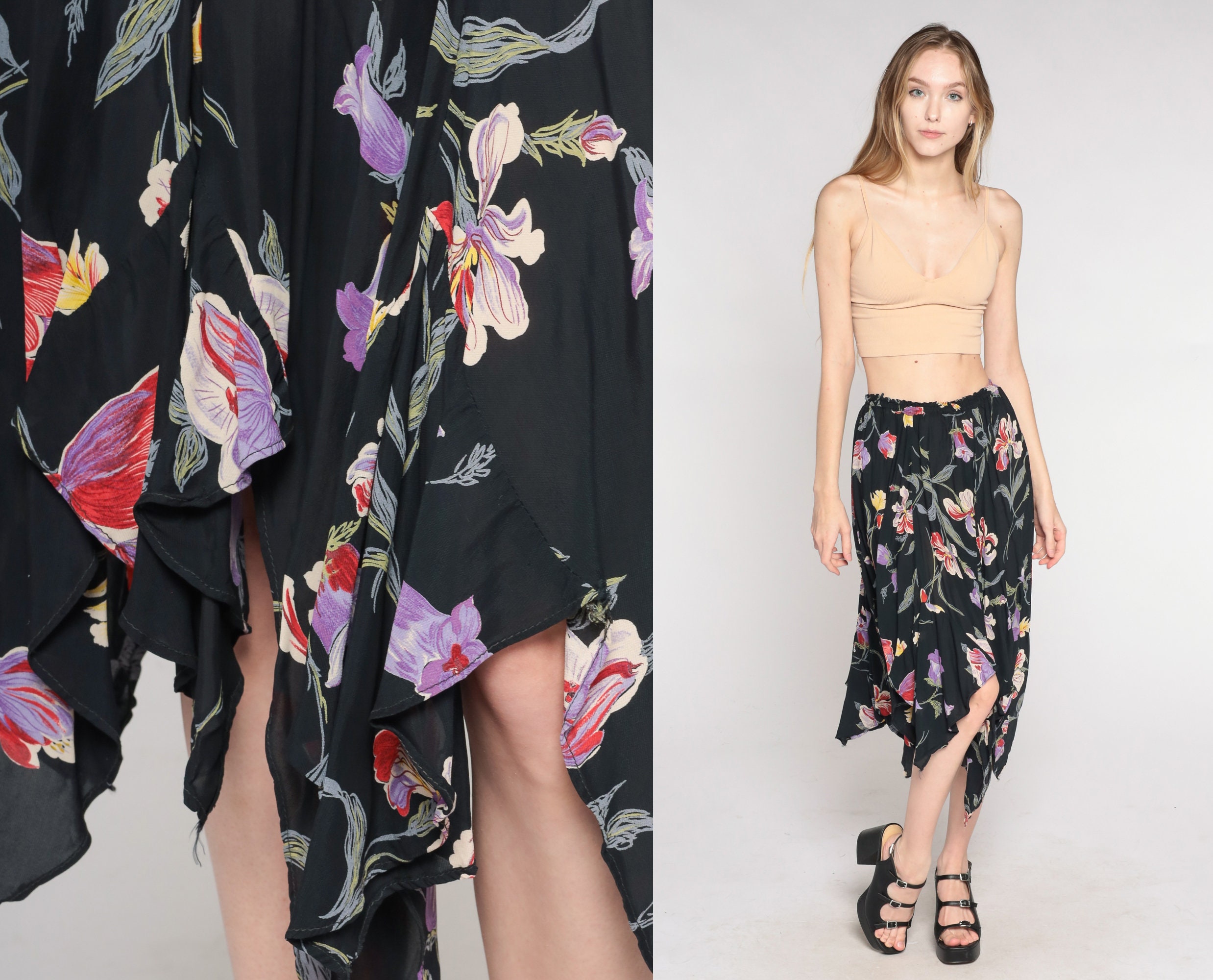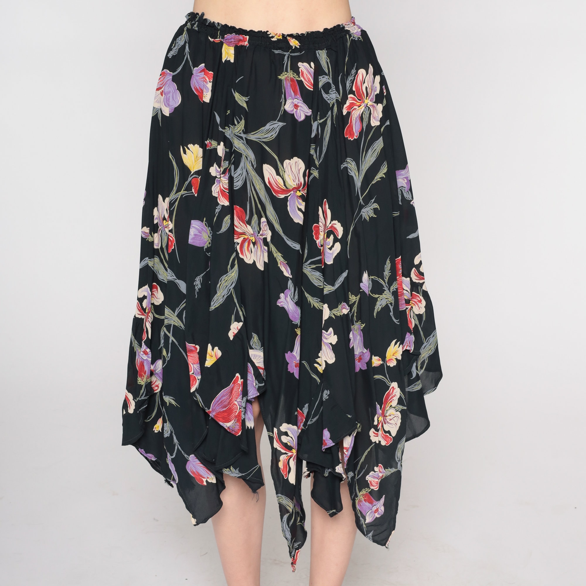 Vintage 00s skirt in a black with a floral print and a handkerchief hem. Midi length with a high elastic waist.