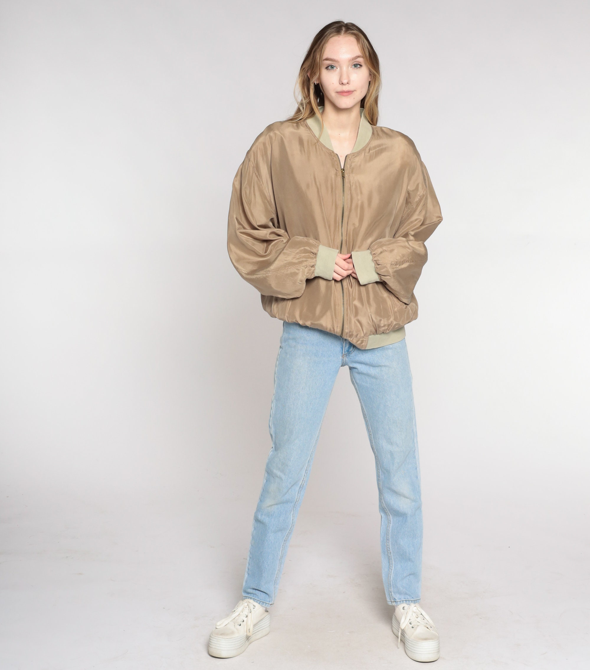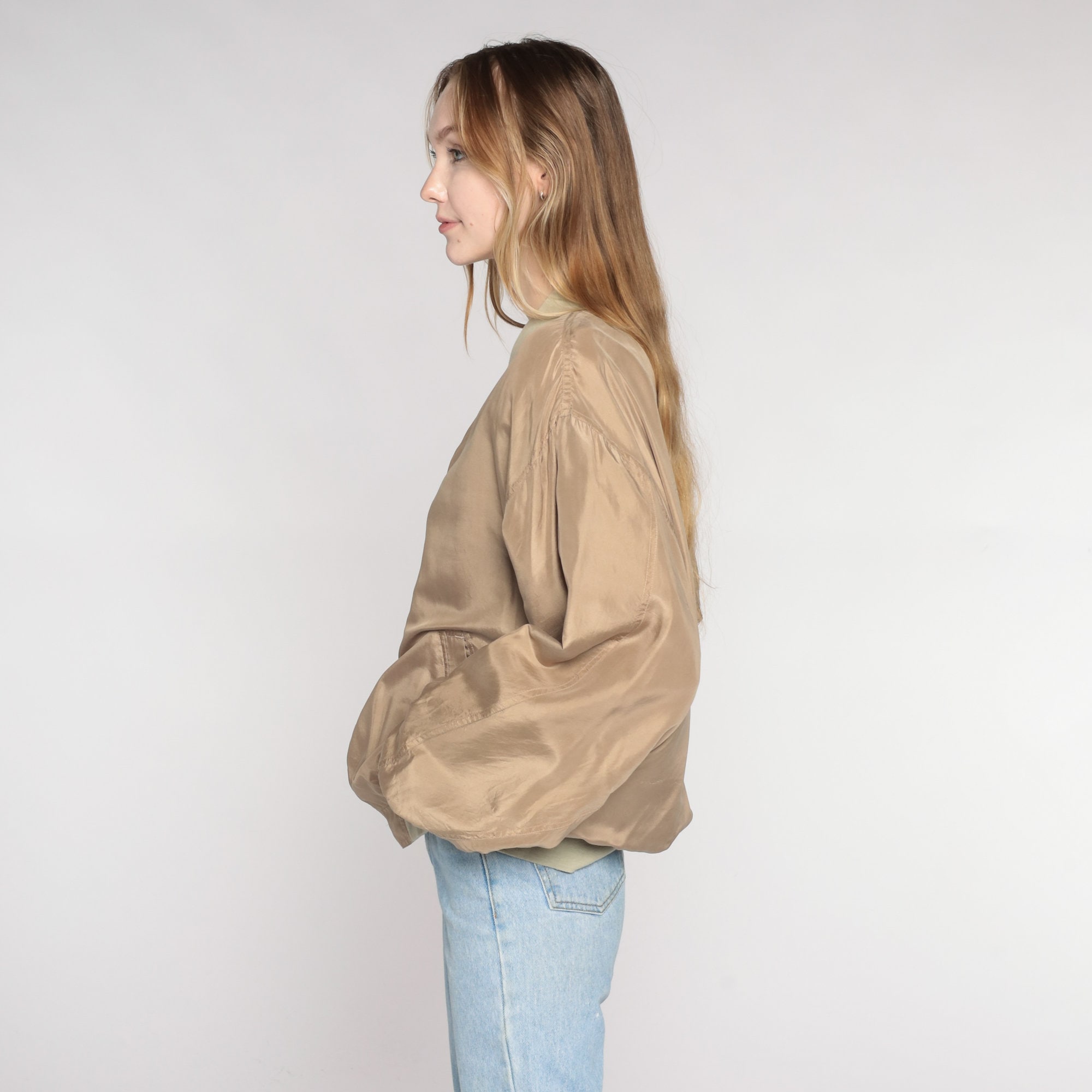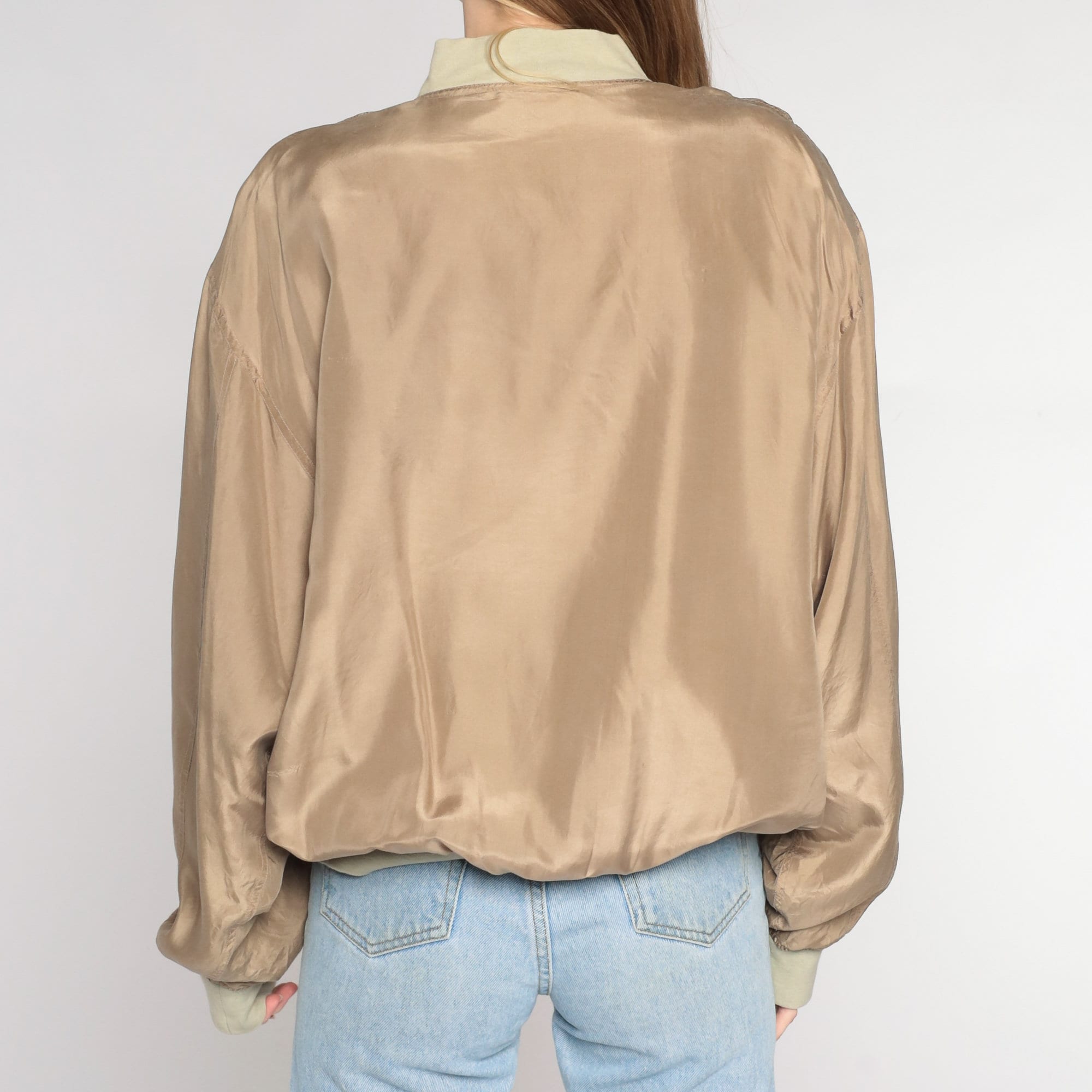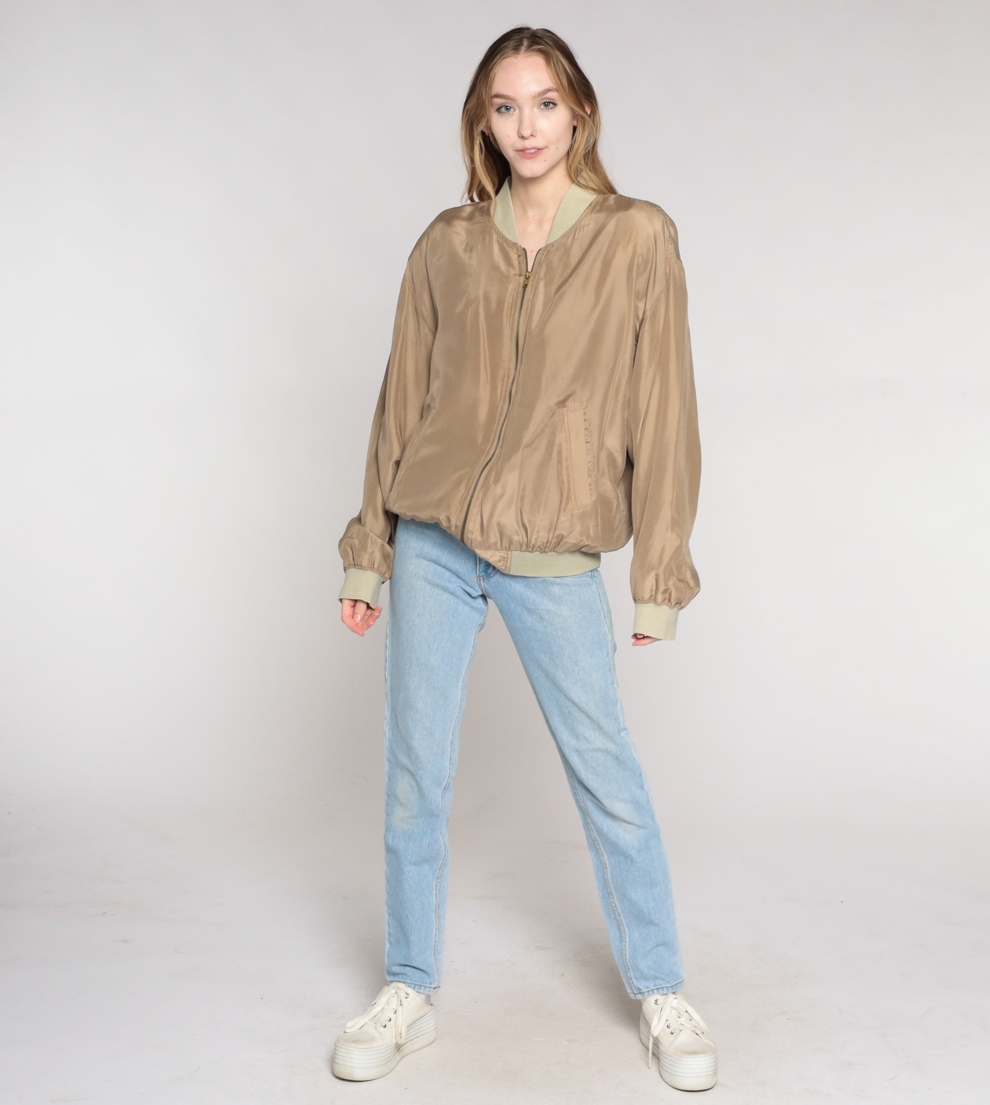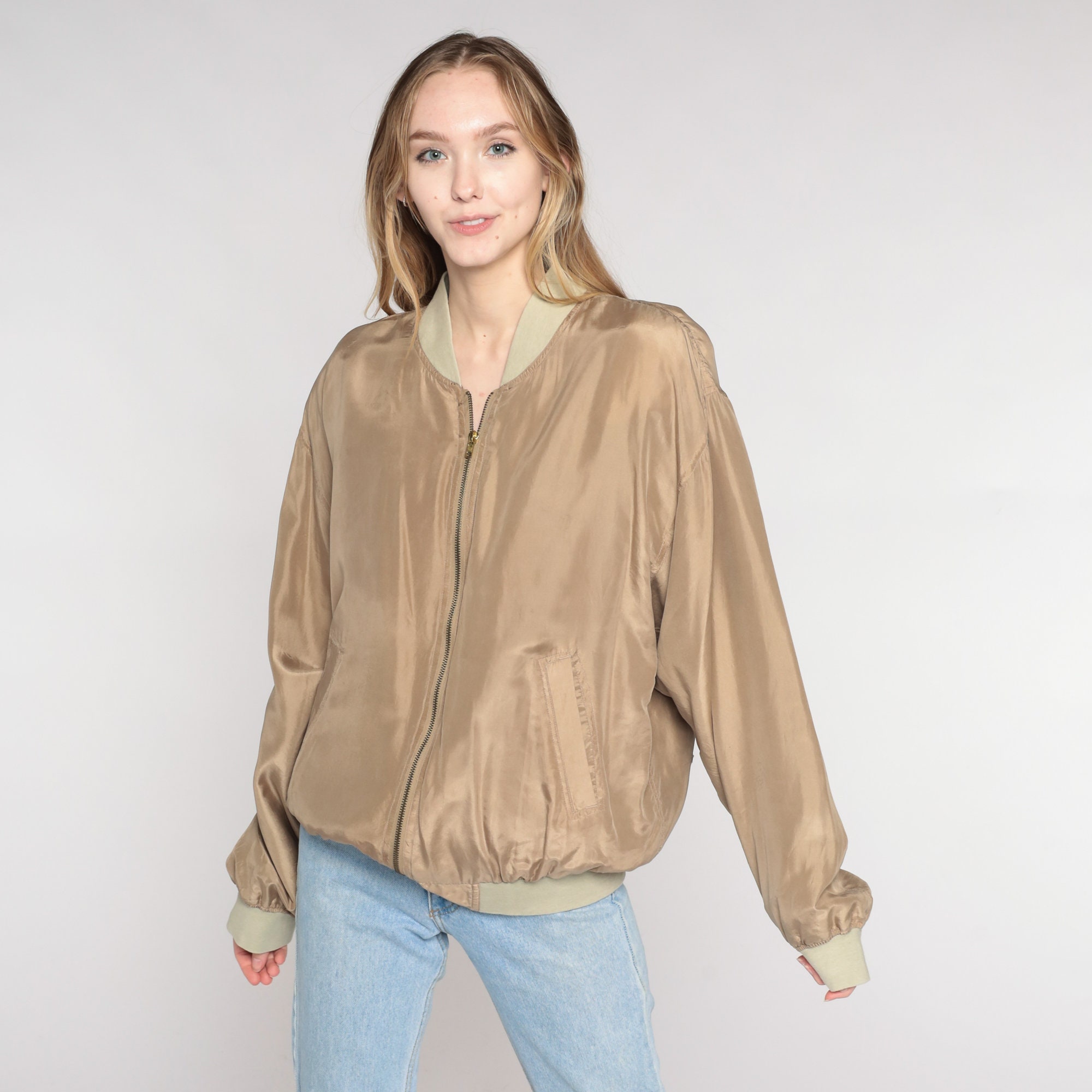 Vintage 00s bomber jacket in brown silk with a zipper up the front.