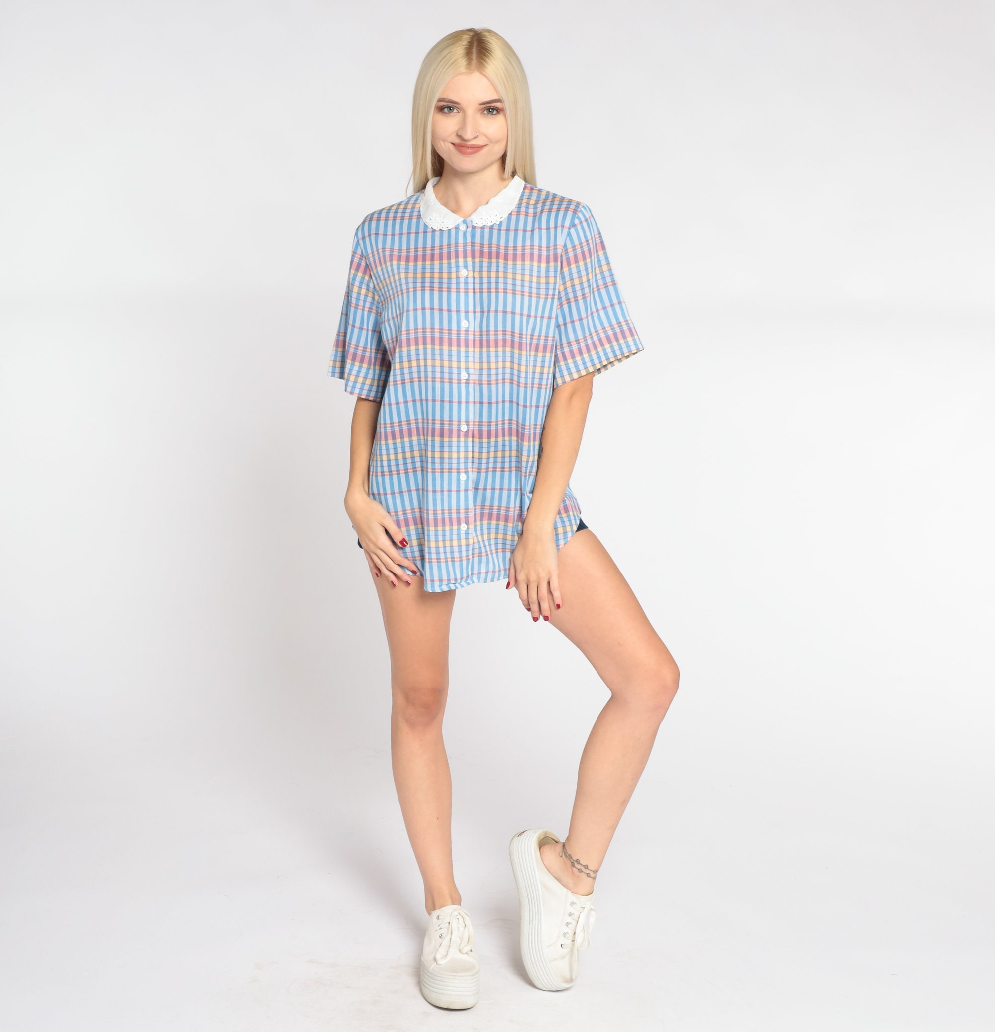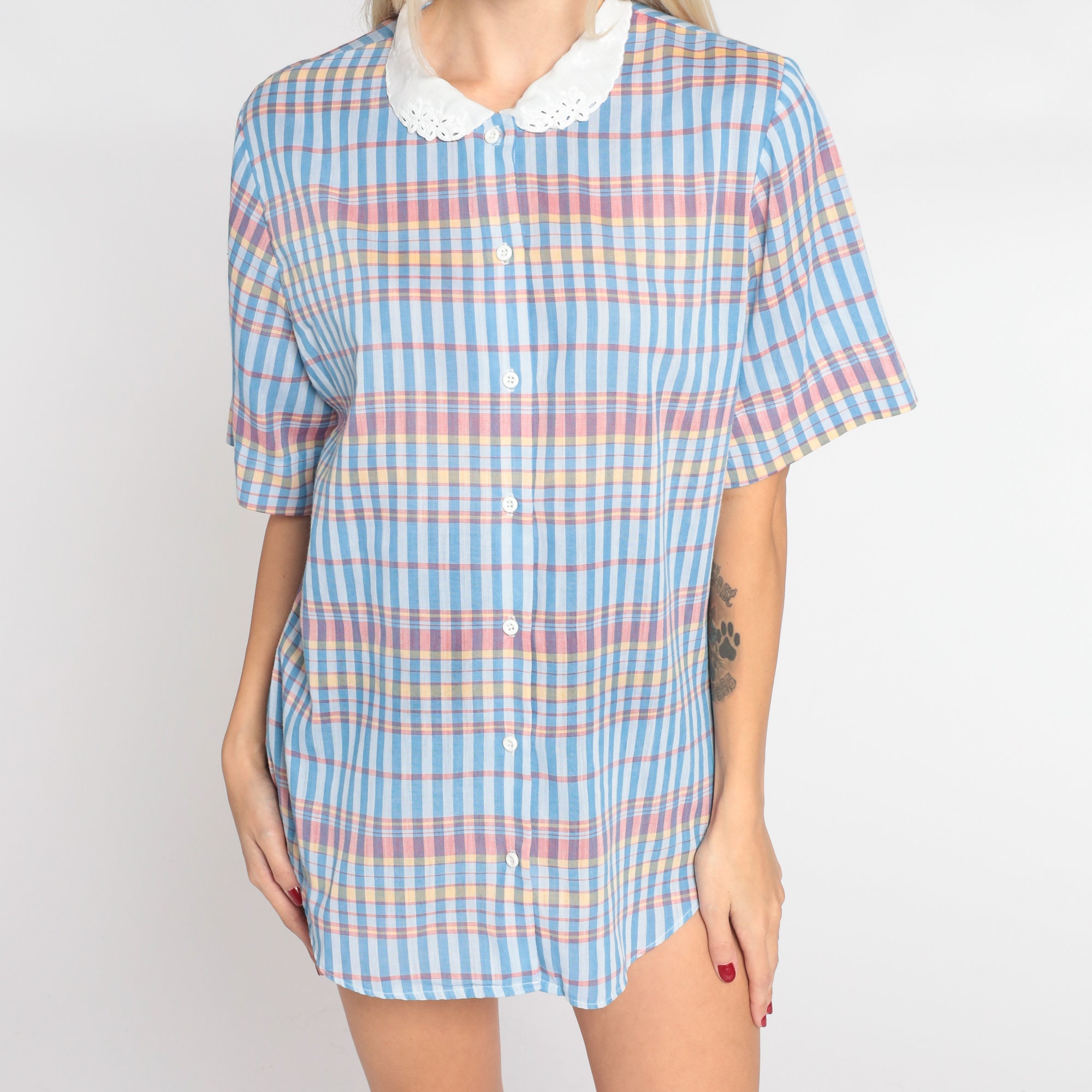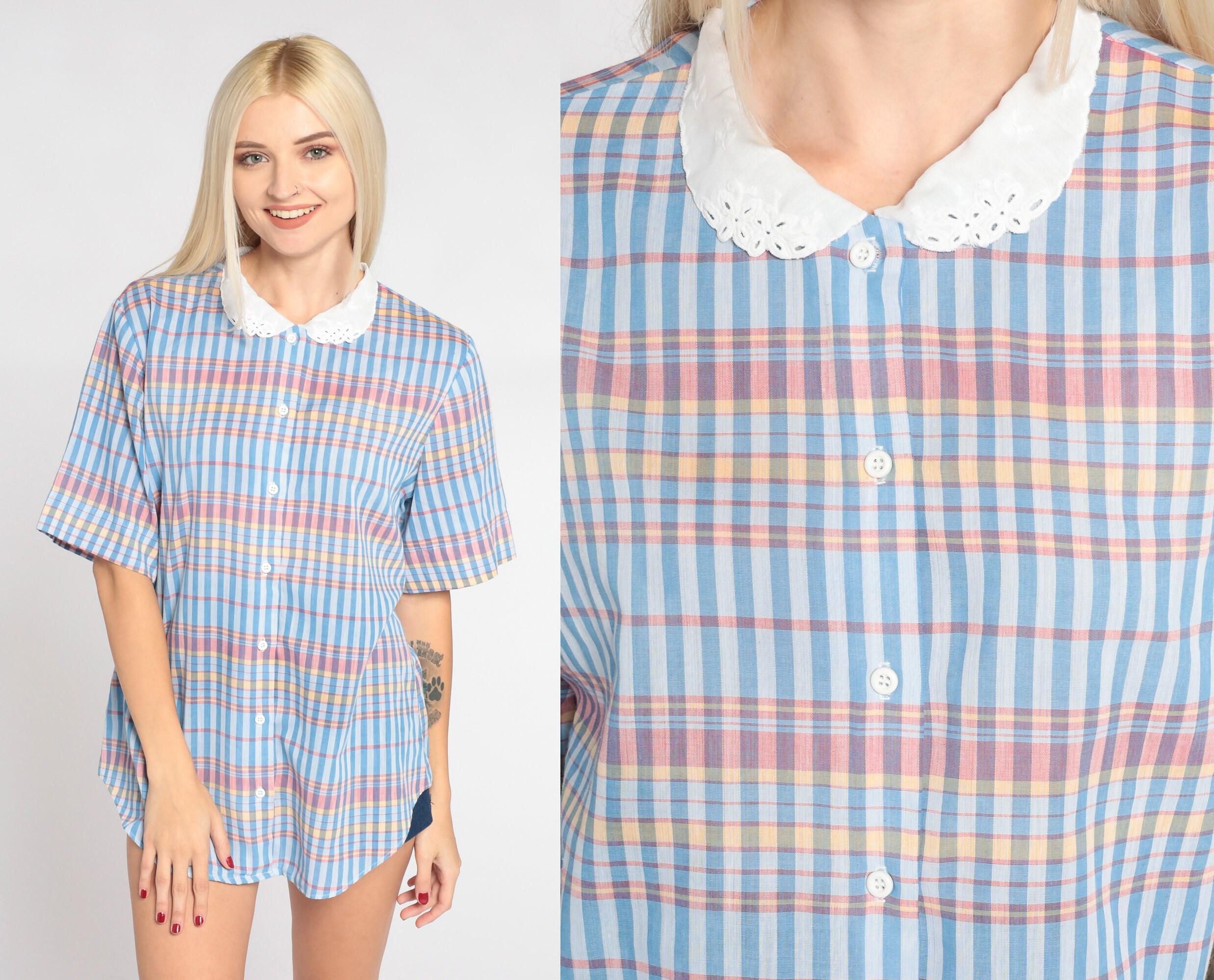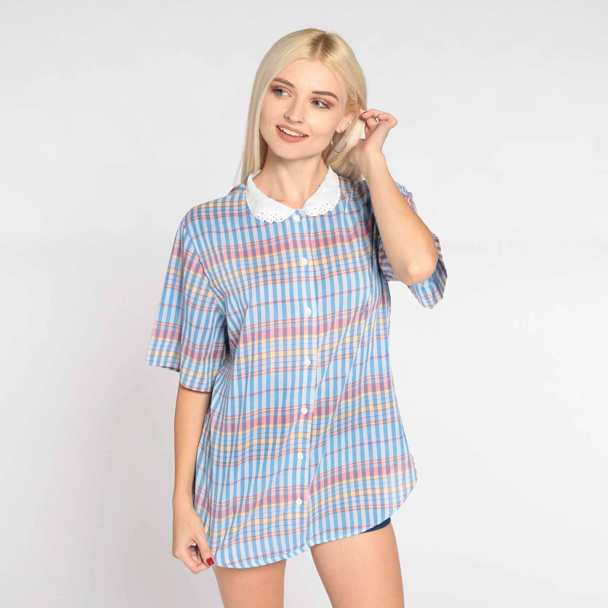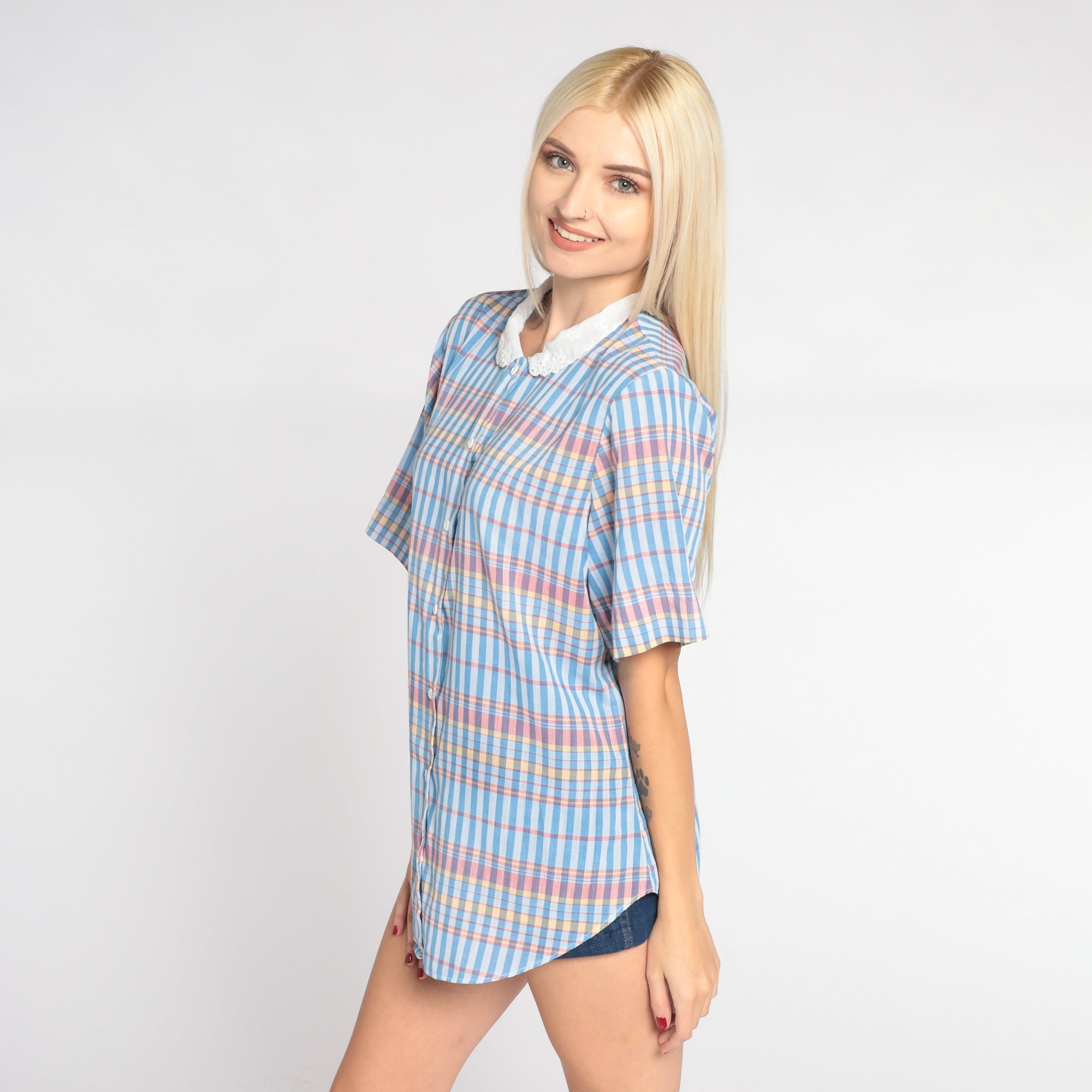 Vintage 80s blouse in a blue checkered print with a white eyelet peter pan collar. It has short sleeves and buttons up the front.