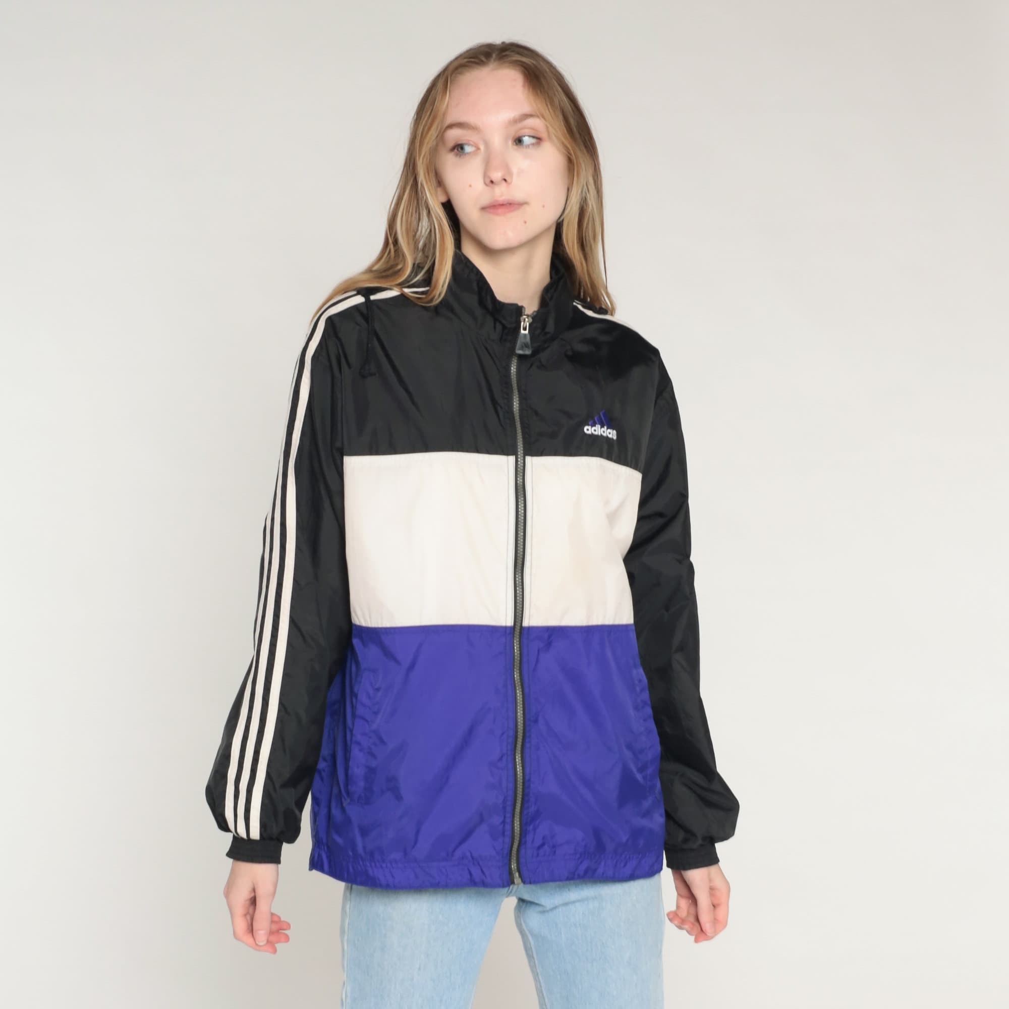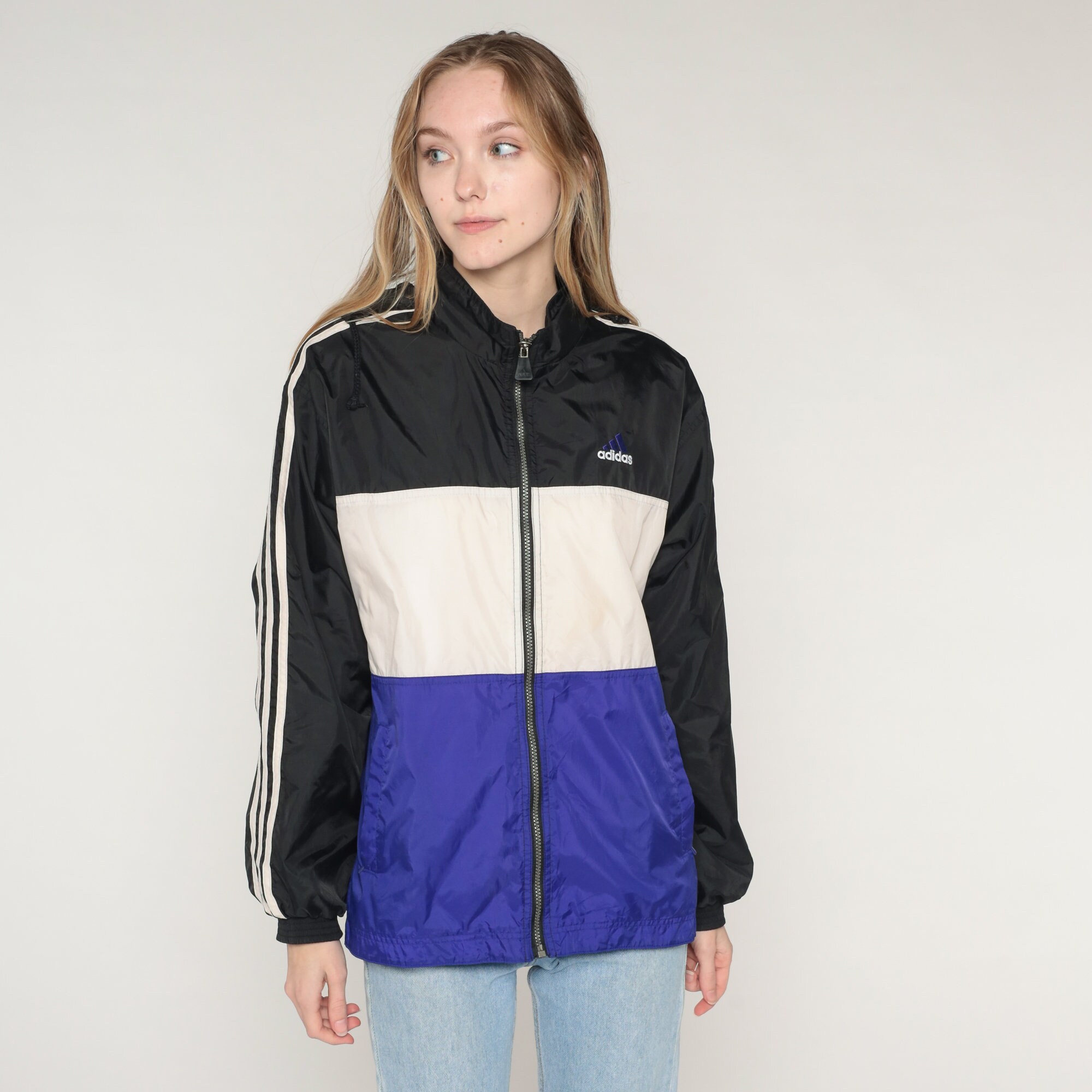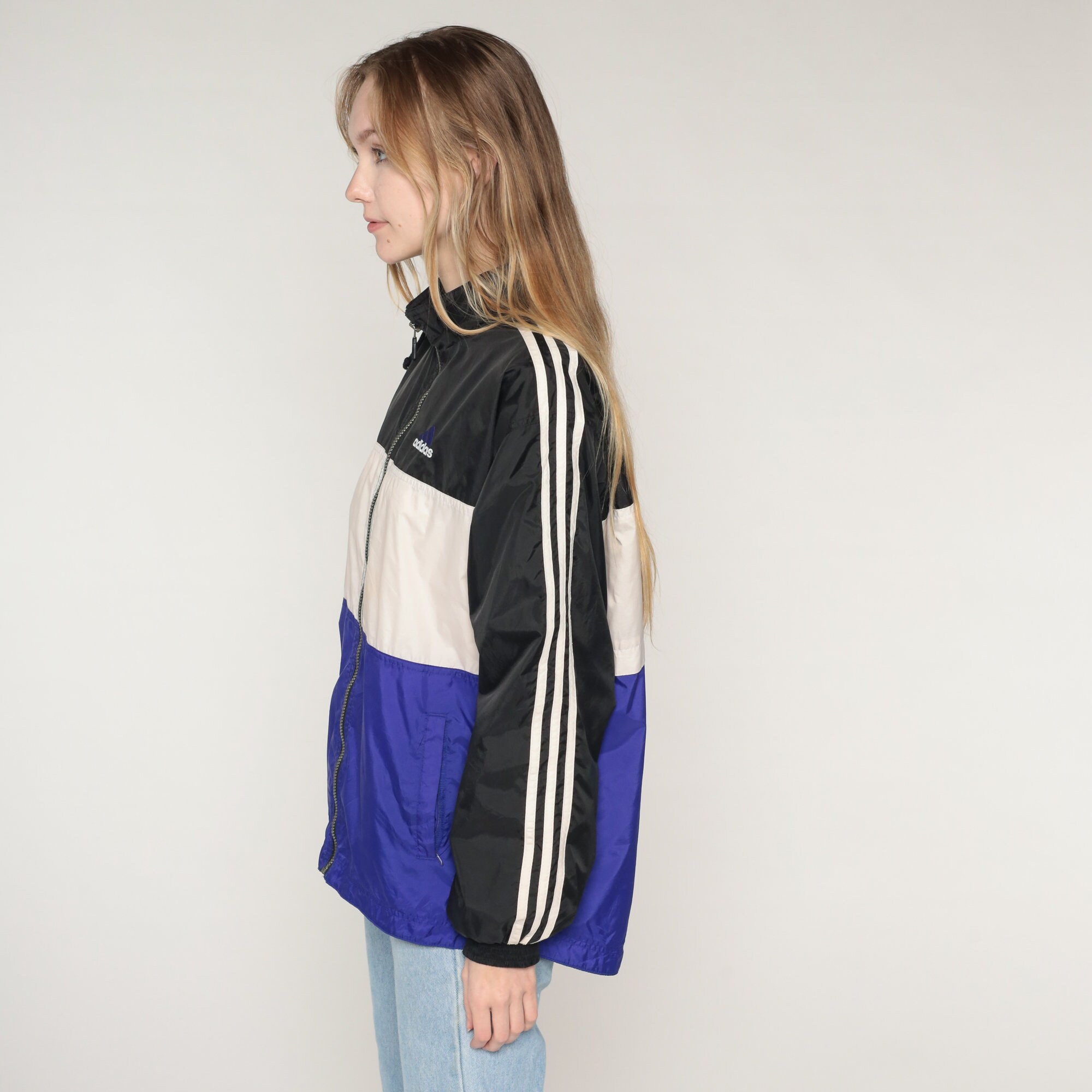 Vintage Y2k windbreaker jacket by Adidas in black white and purple stripes. Zips up the front.