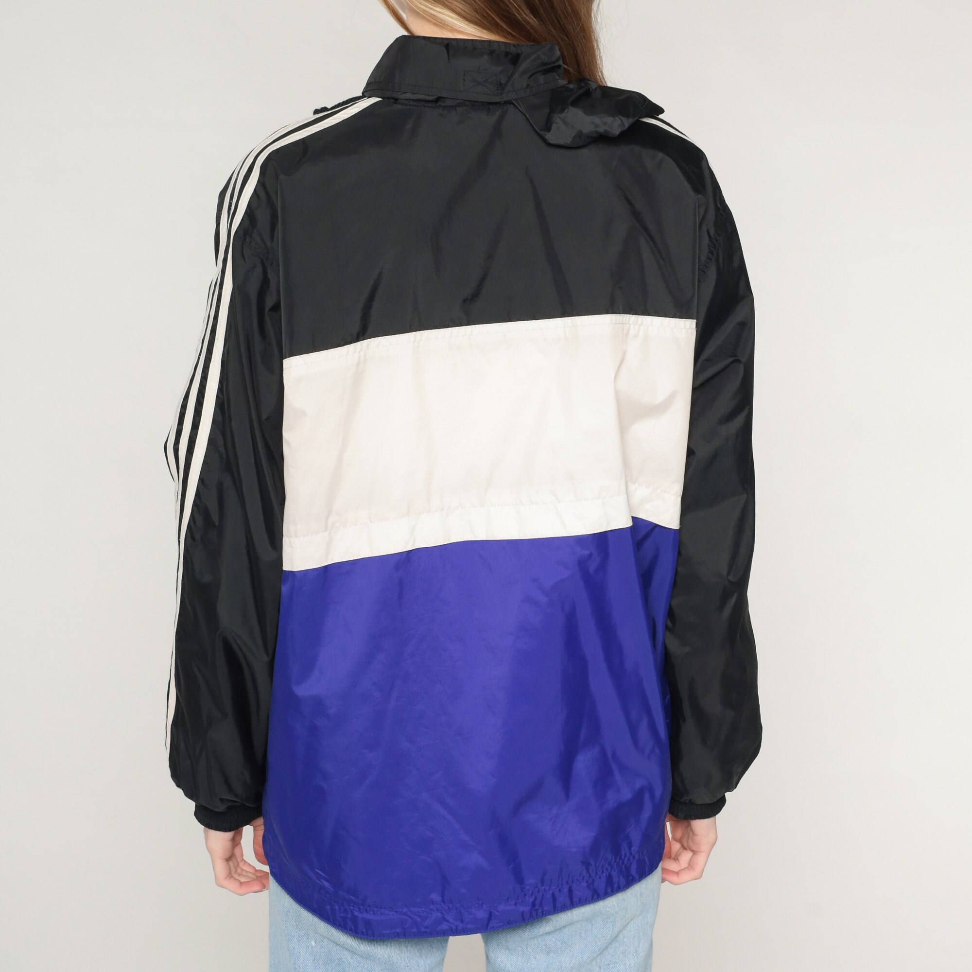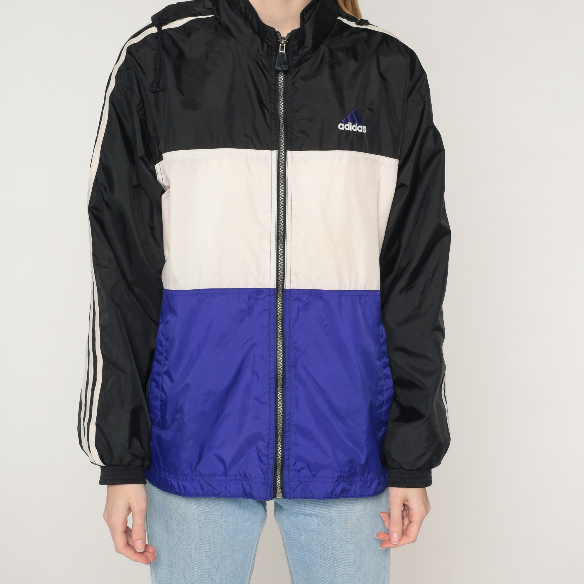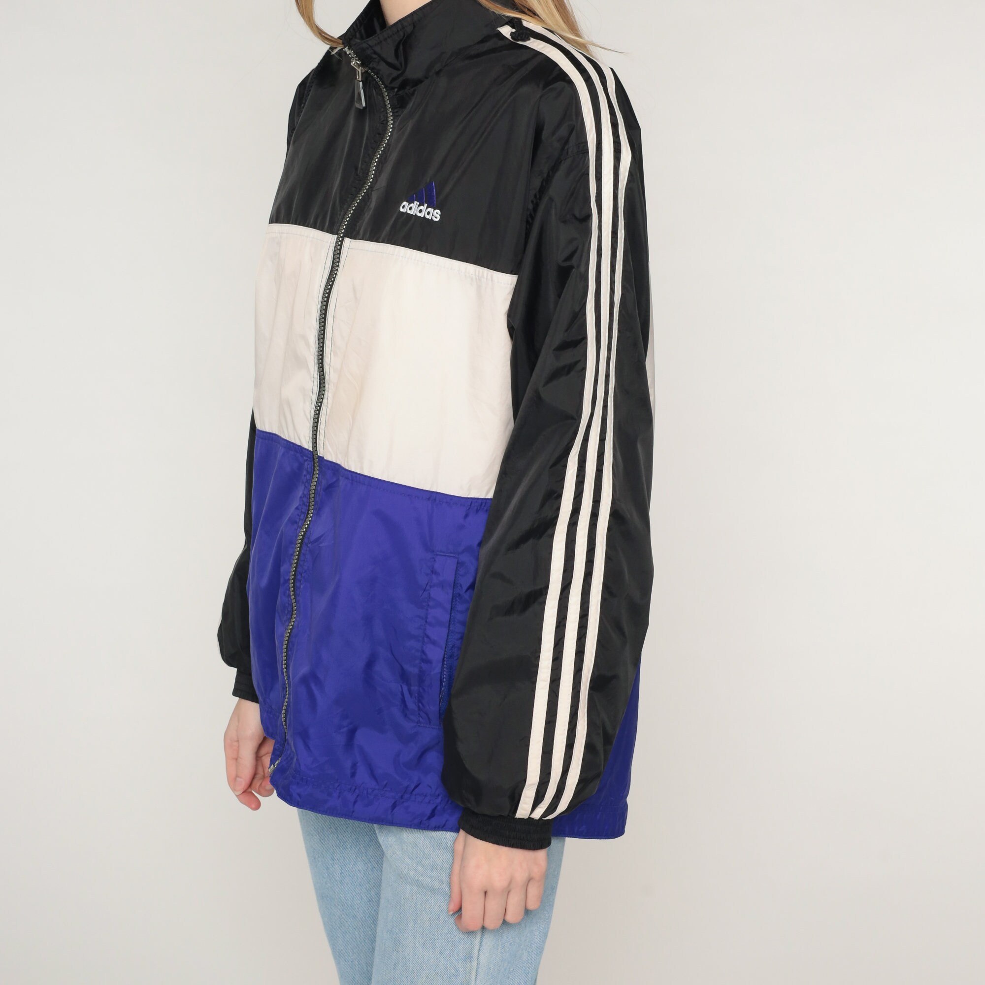 Vintage Y2k windbreaker jacket by Adidas in black white and purple stripes. Zips up the front.