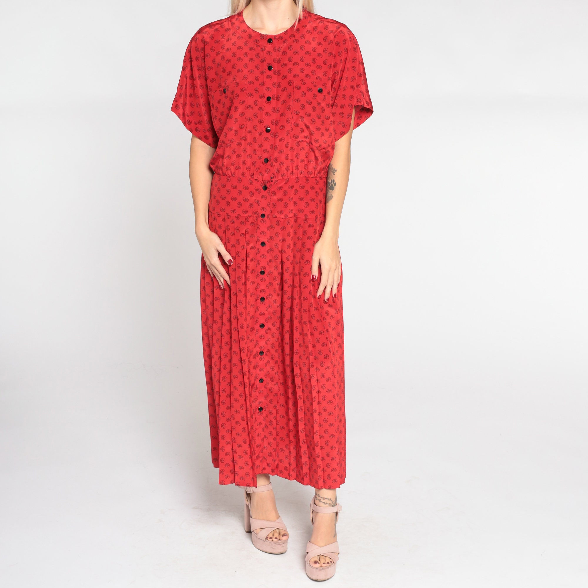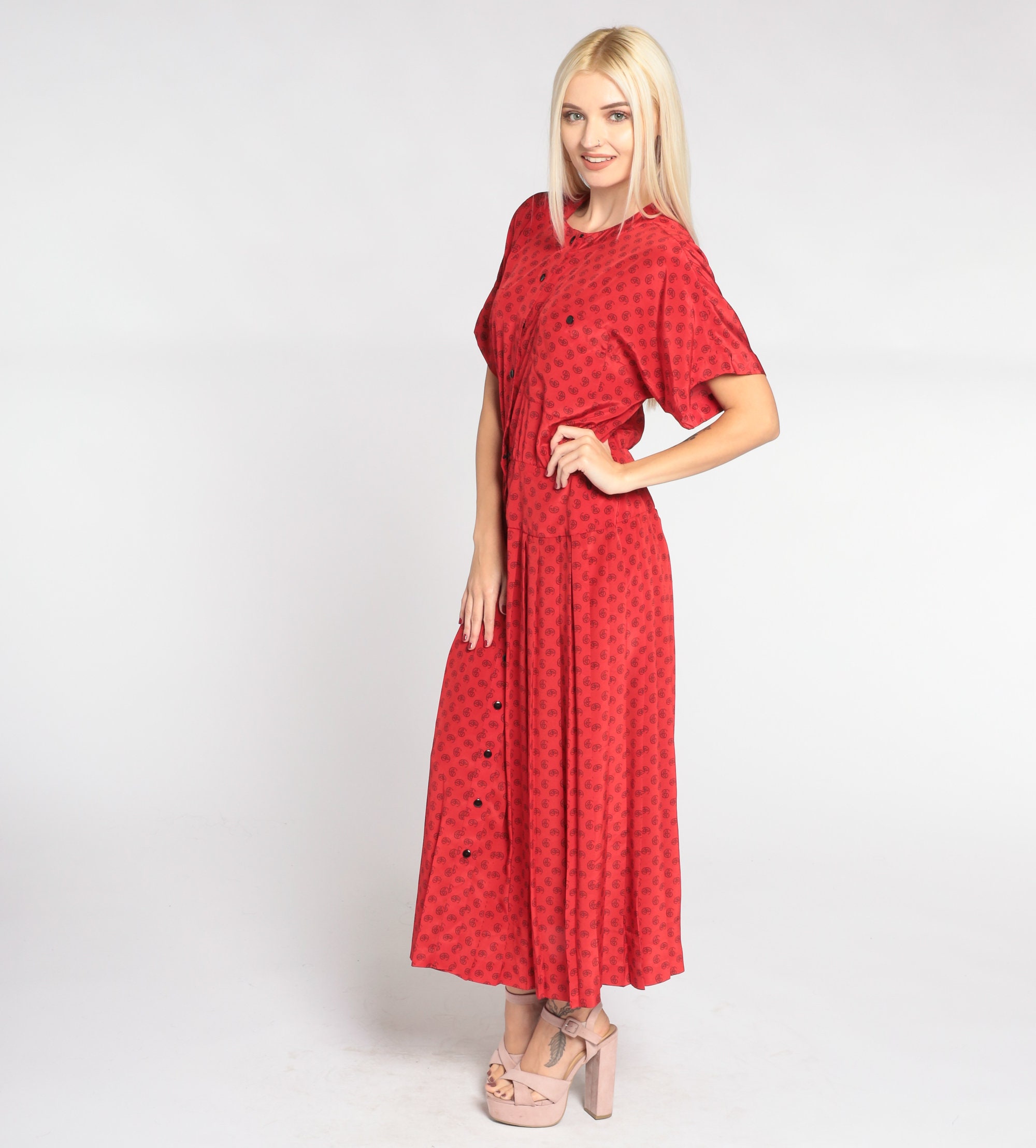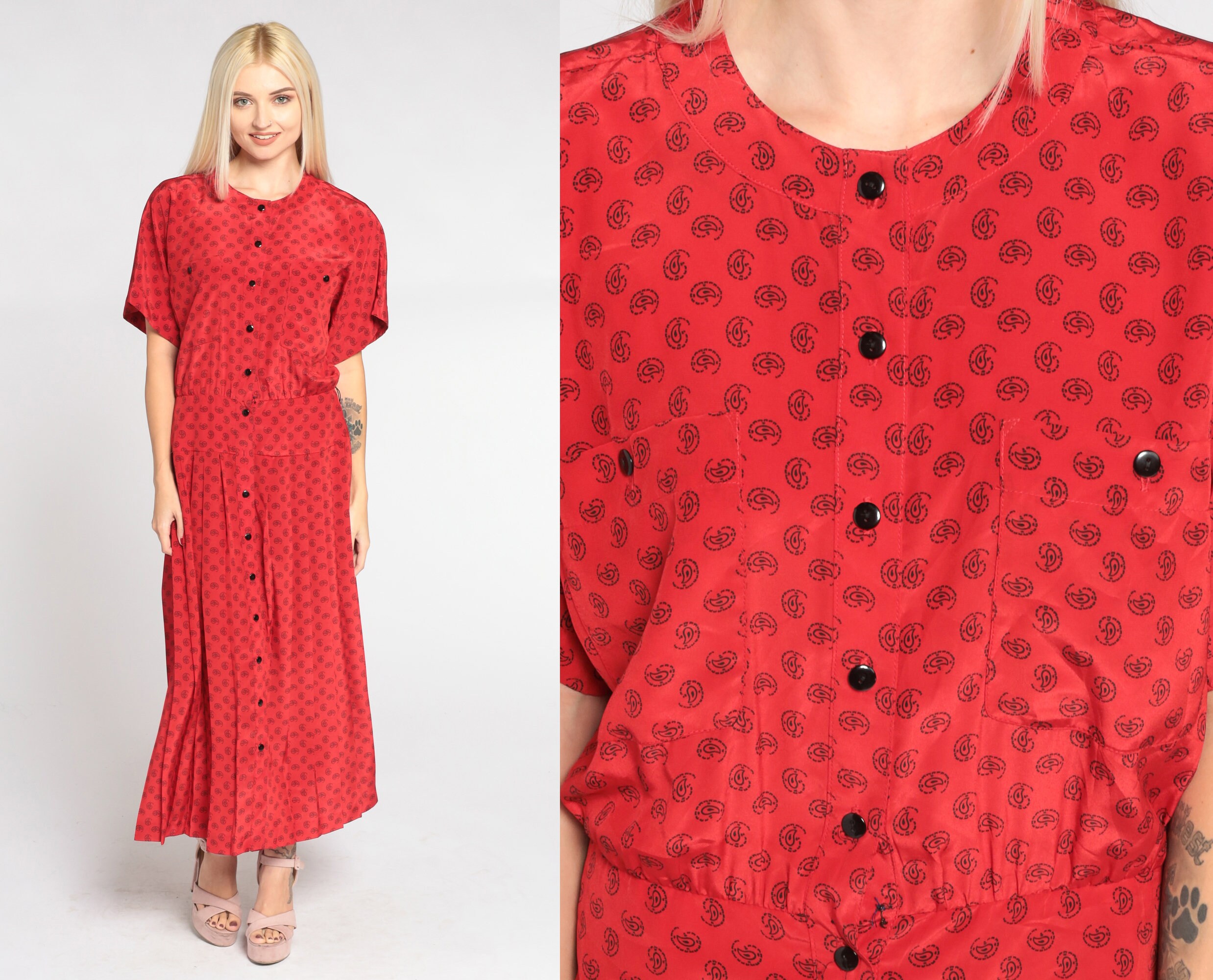 Vintage 90s dress in red with a paisley dot print. It has short sleeves, a pleated skirt, and buttons up the front. Midi length.