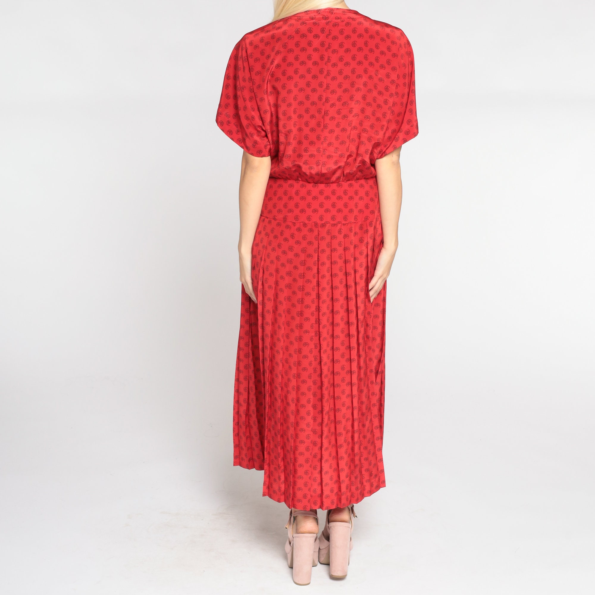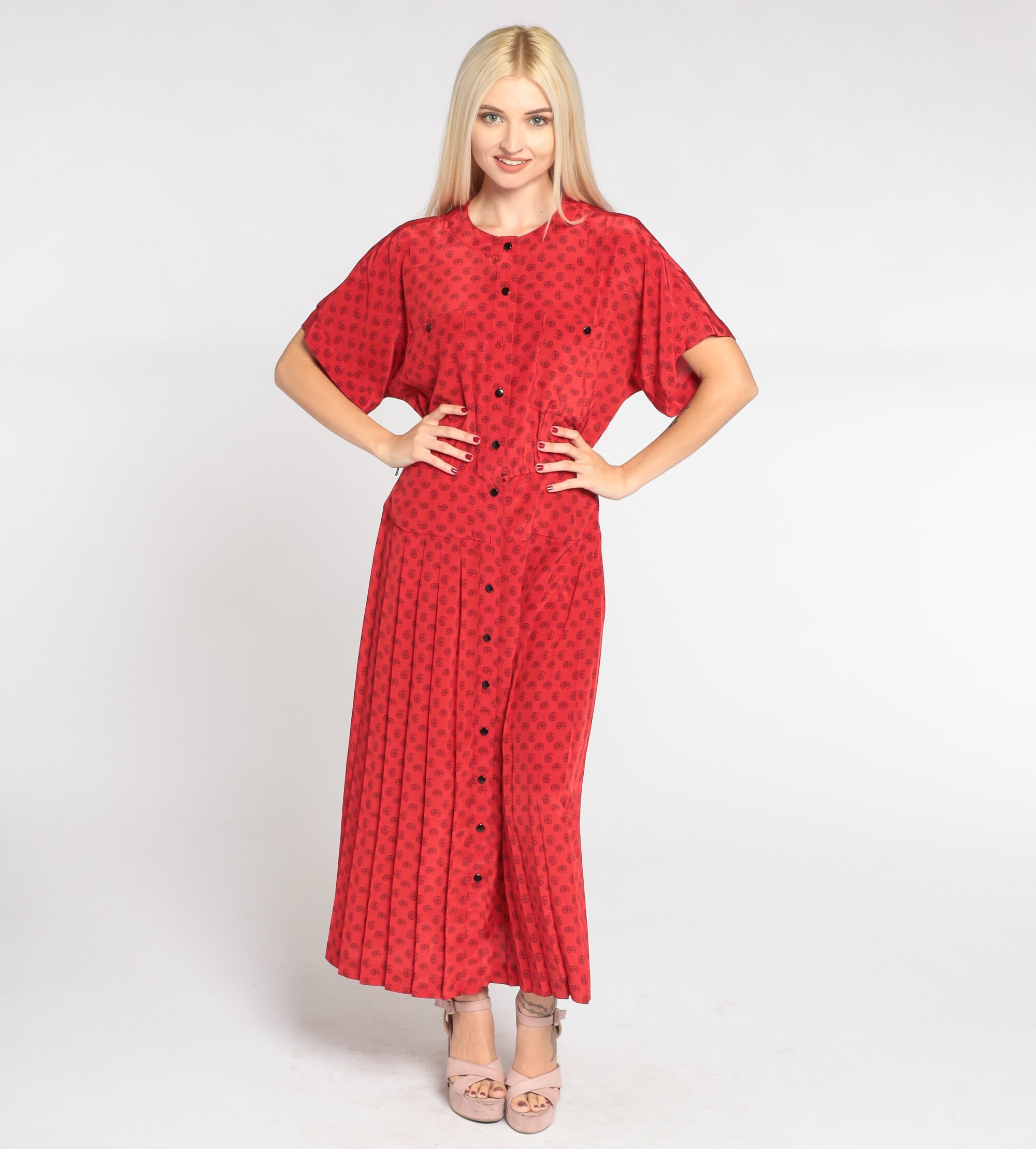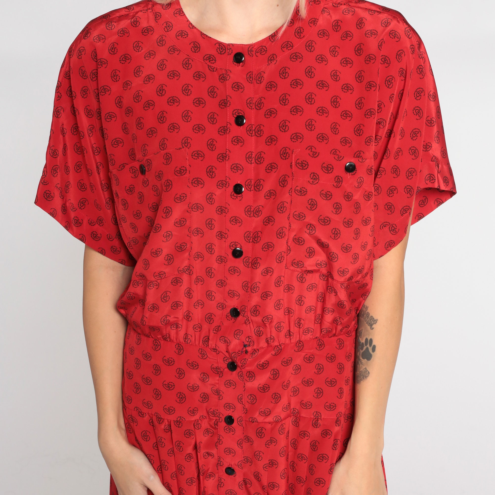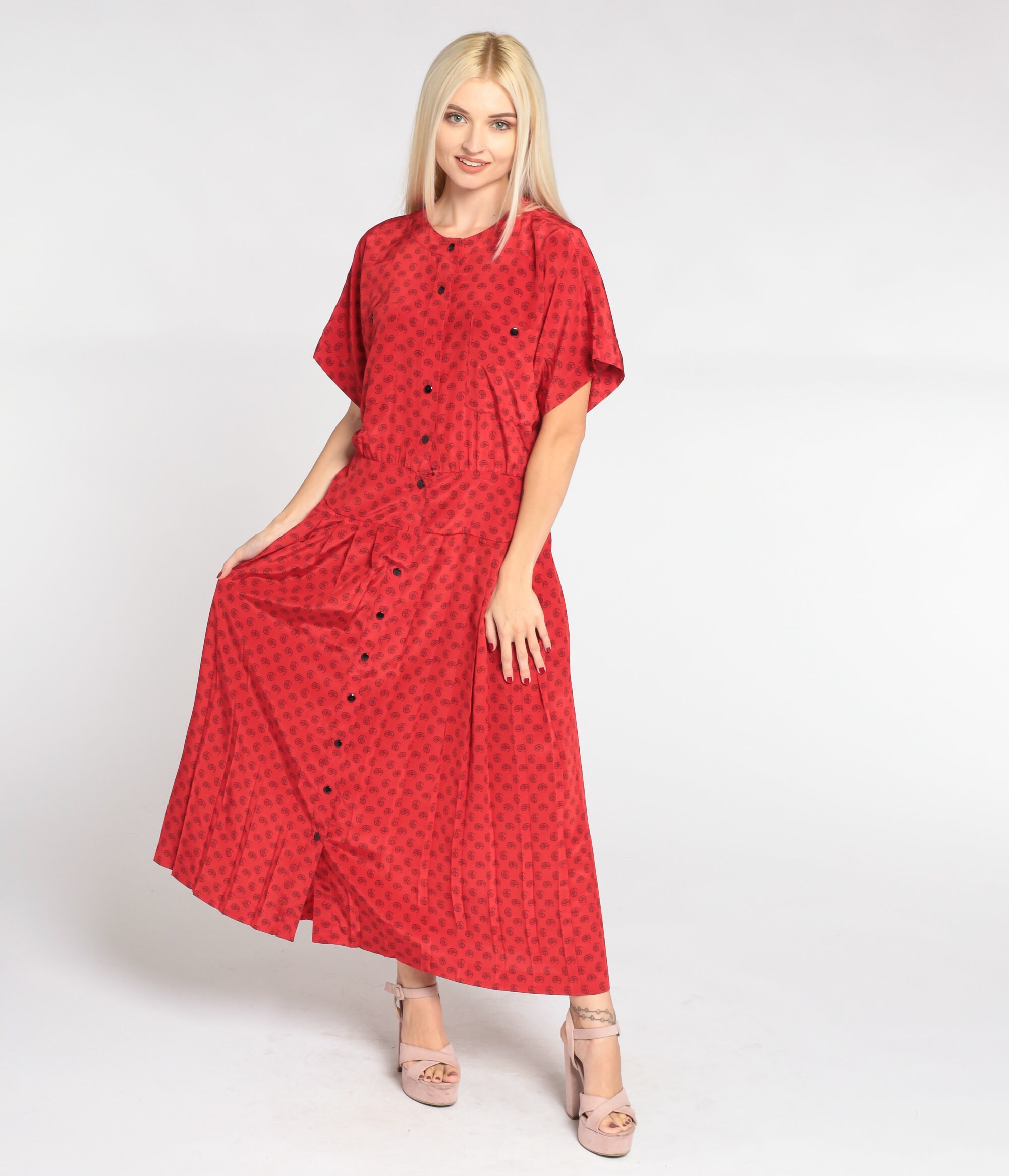 Vintage 90s dress in red with a paisley dot print. It has short sleeves, a pleated skirt, and buttons up the front. Midi length.