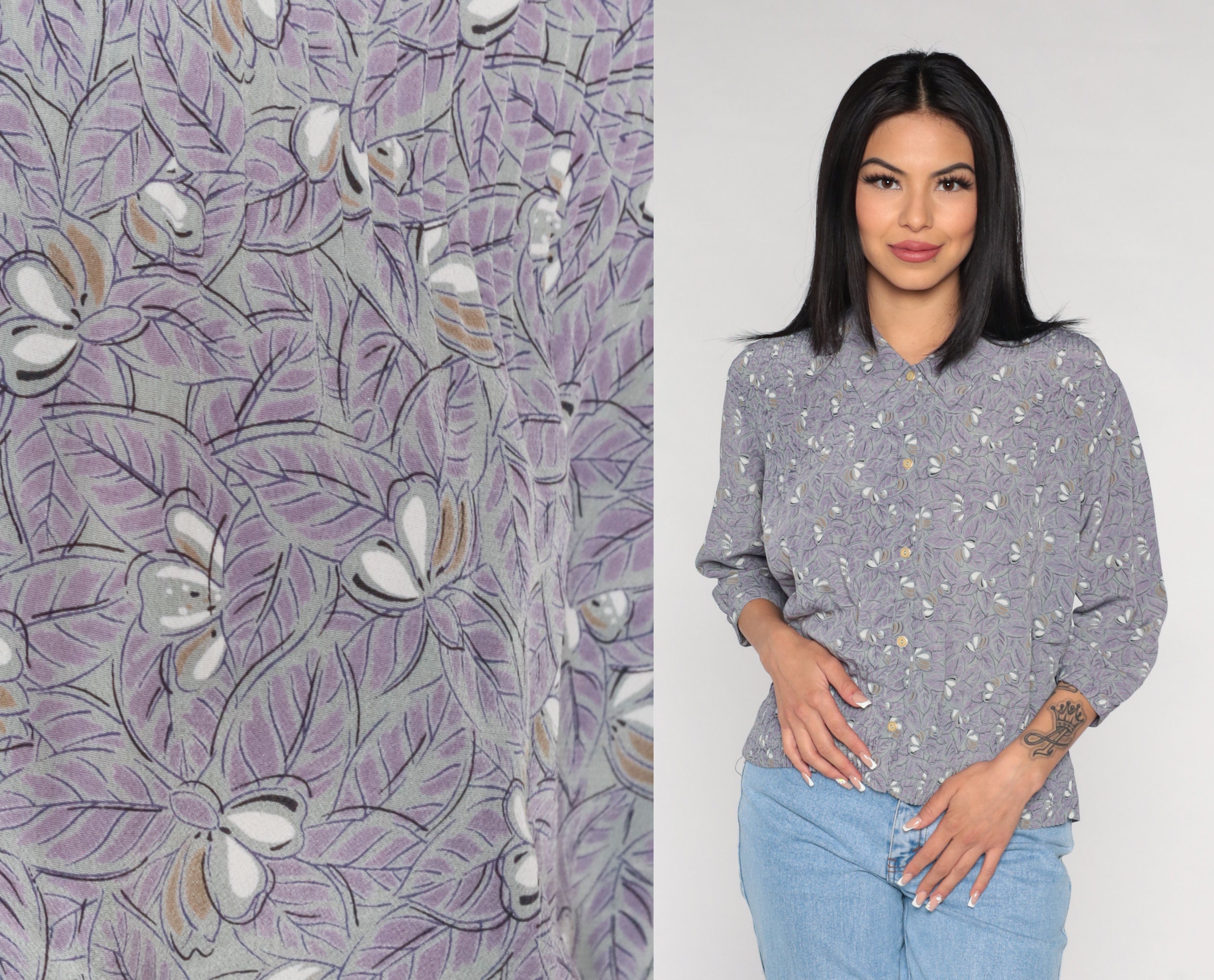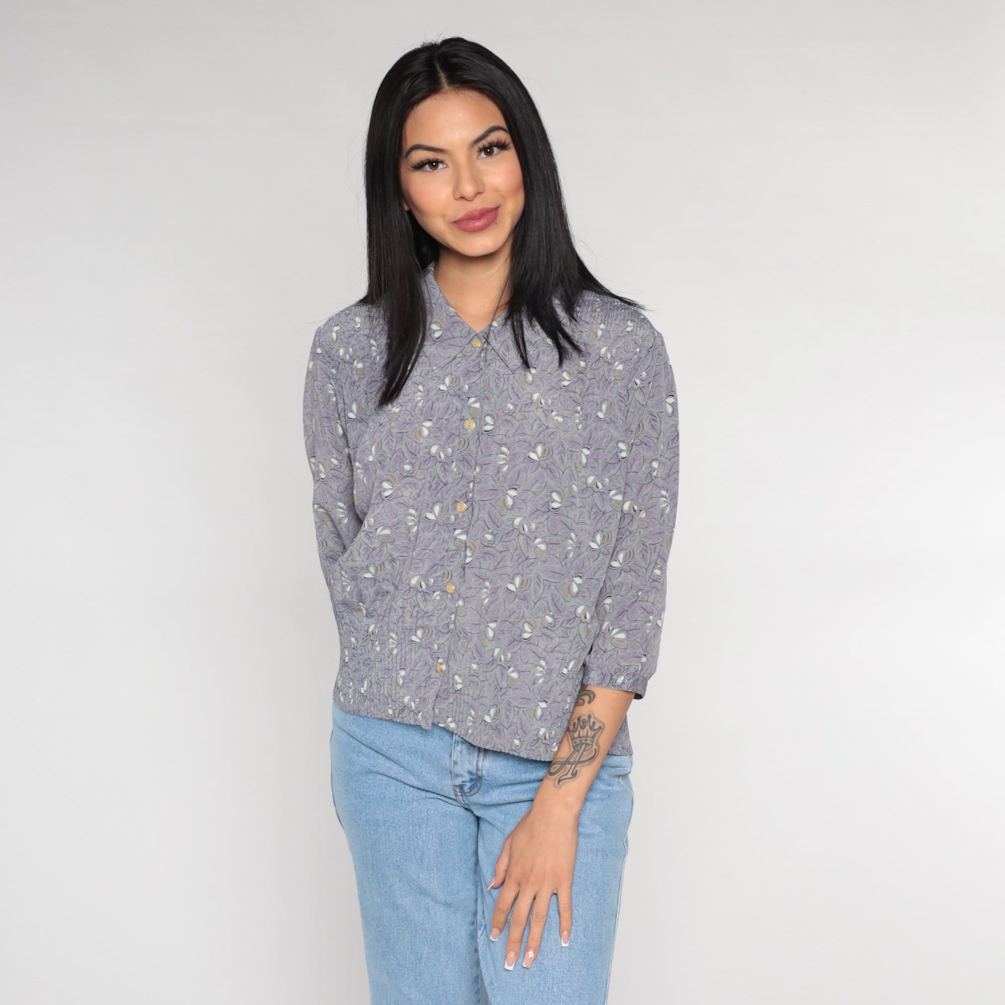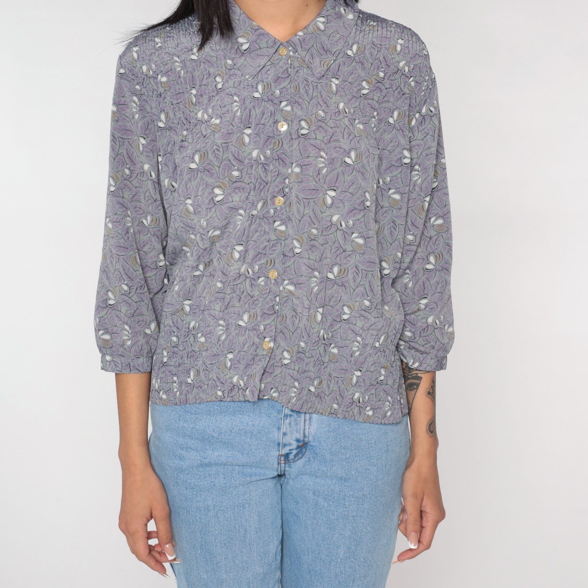 Vintage 90s shirt in purple and grey floral and leaf print with pleats. It has a collar, 3/4 sleeves, and buttons up the front.