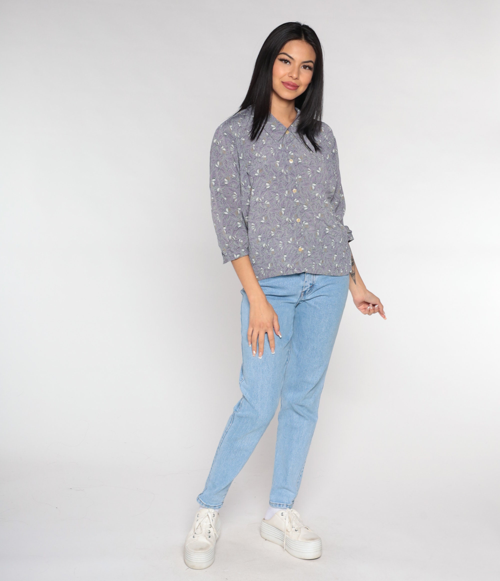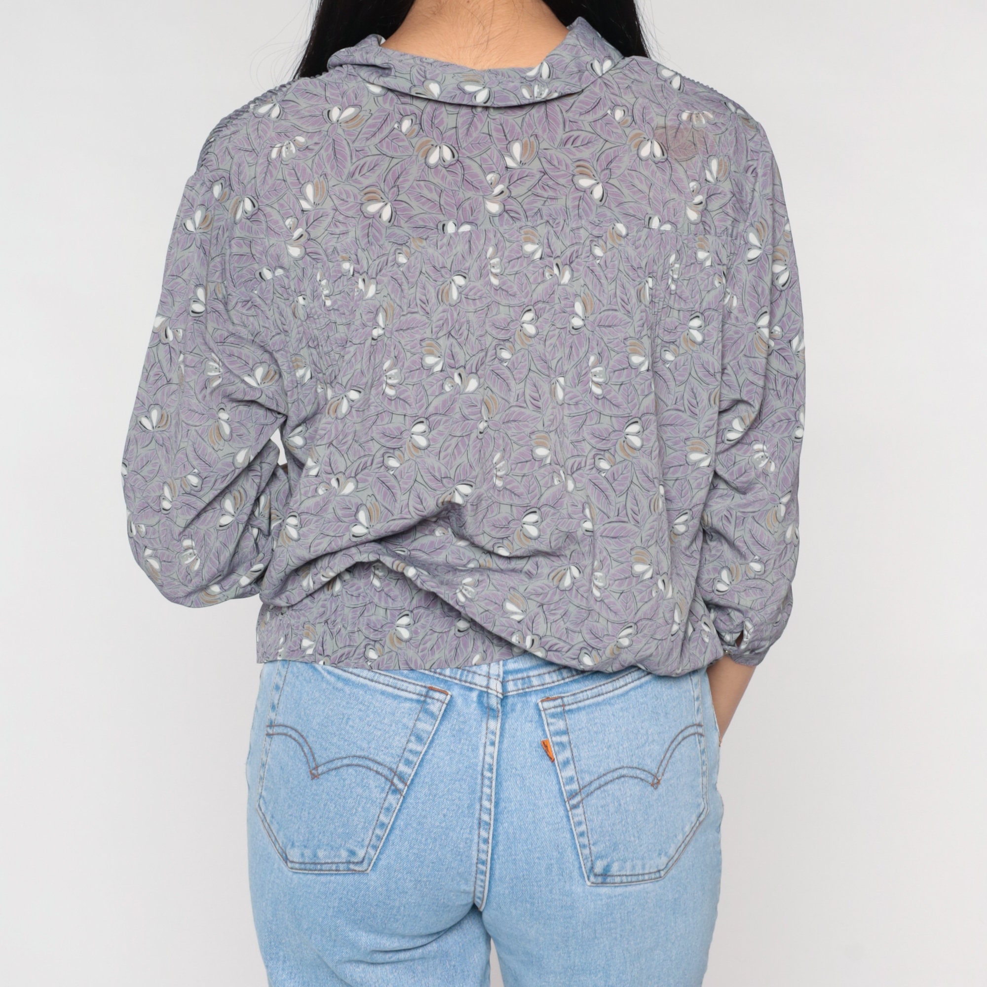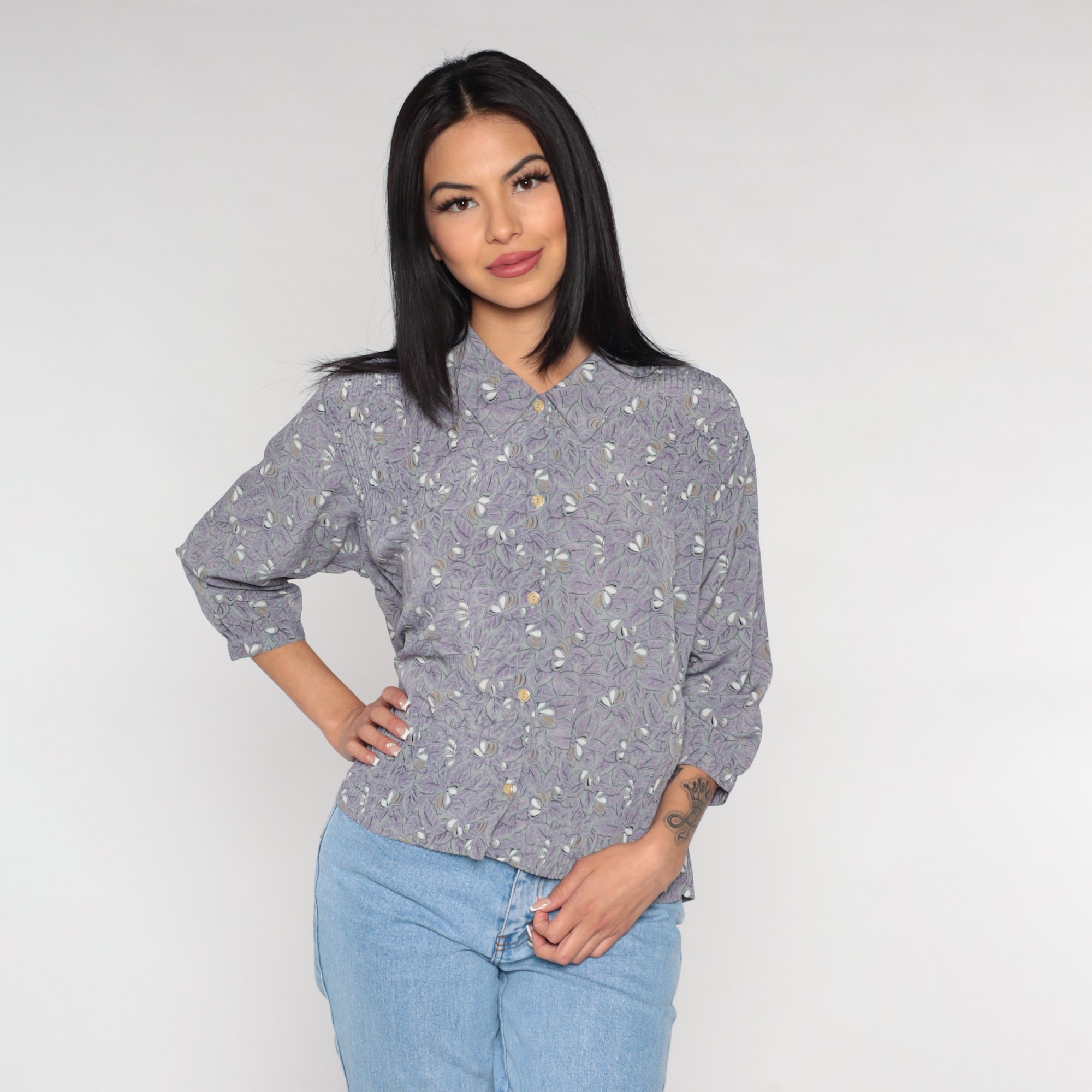 Vintage 90s shirt in purple and grey floral and leaf print with pleats. It has a collar, 3/4 sleeves, and buttons up the front.