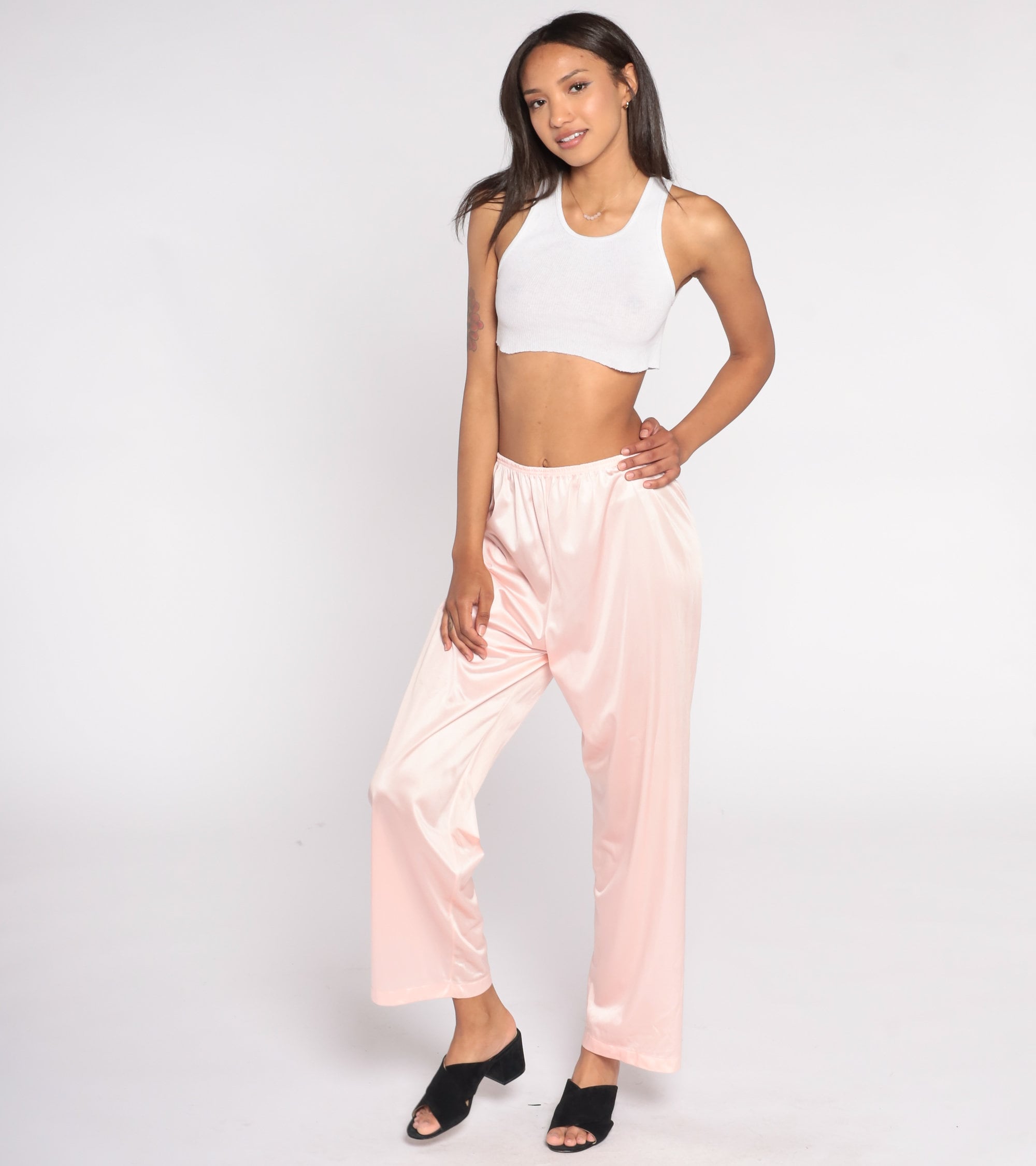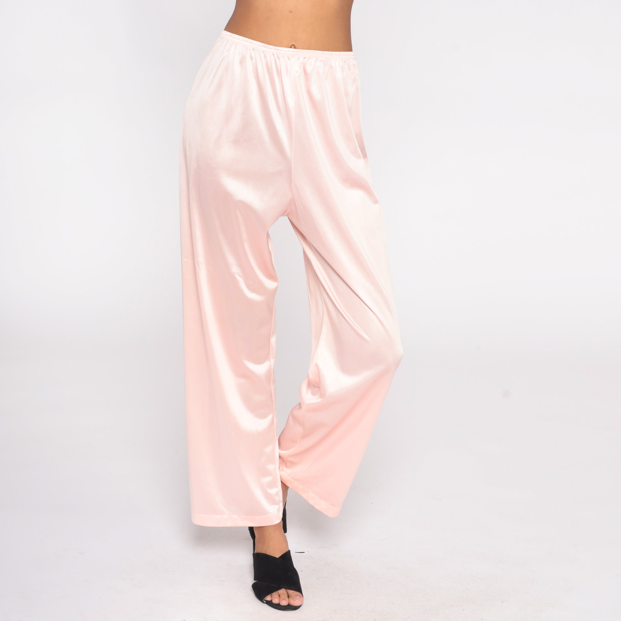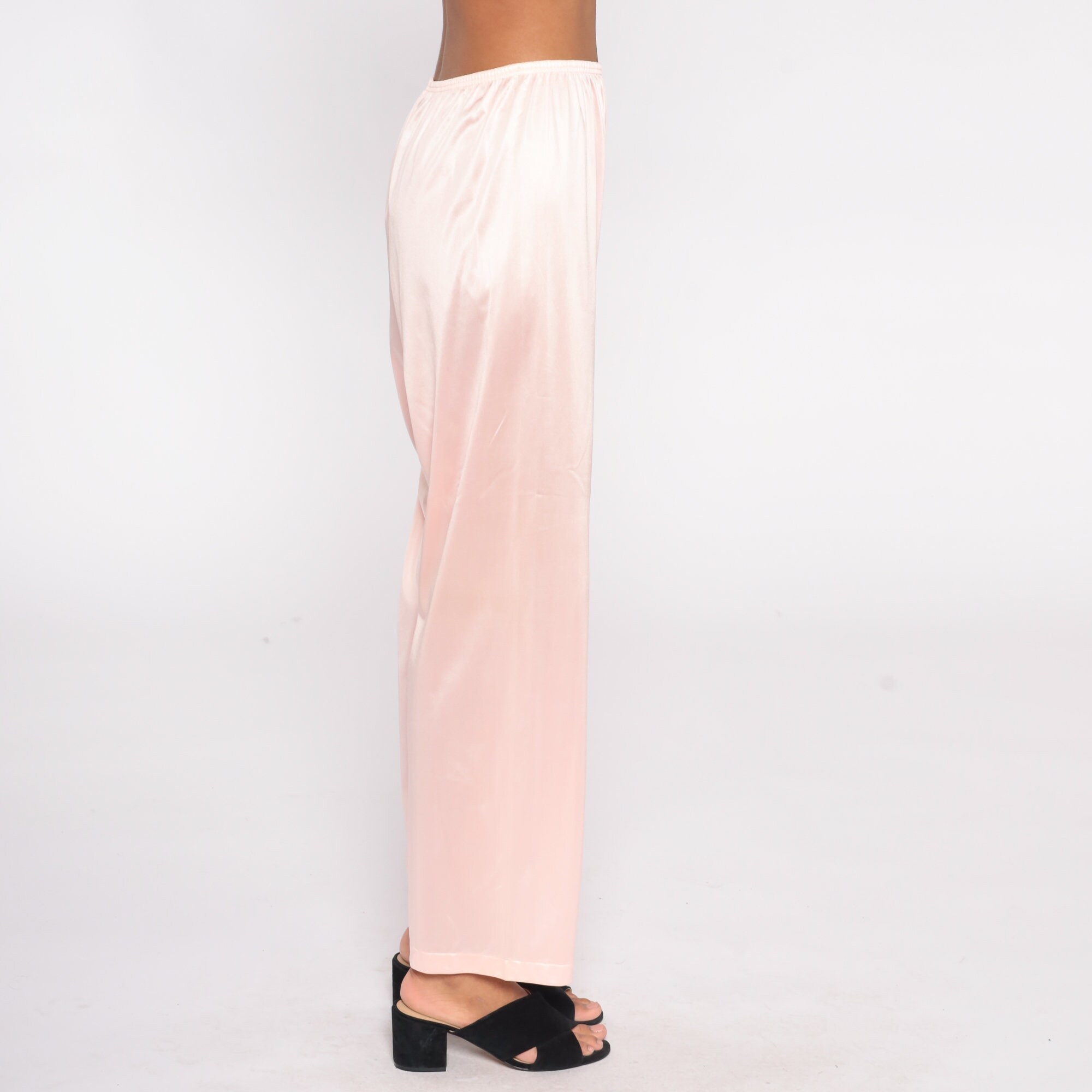 Vintage 70s pants in baby pink nylon with a straight leg and an elastic waist.