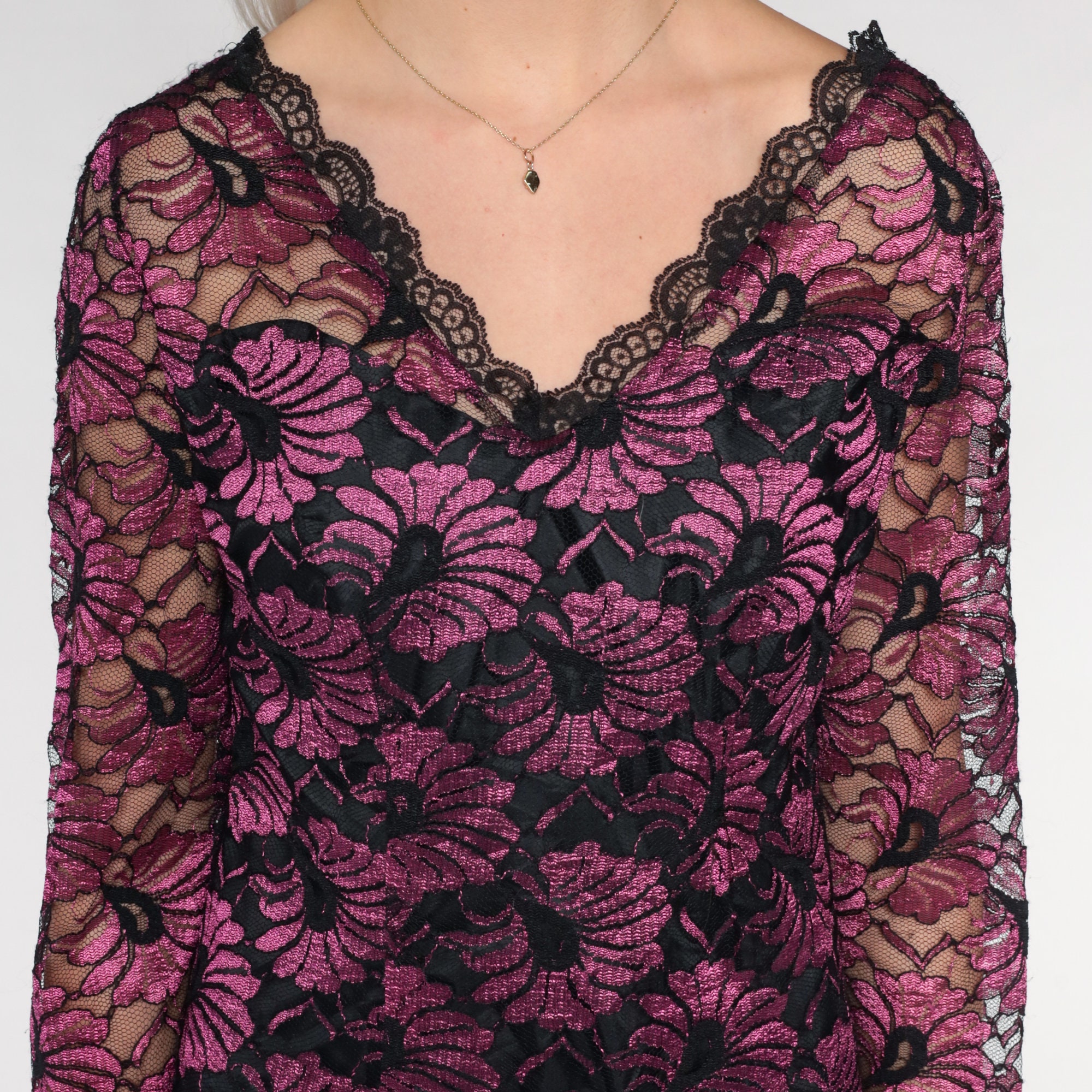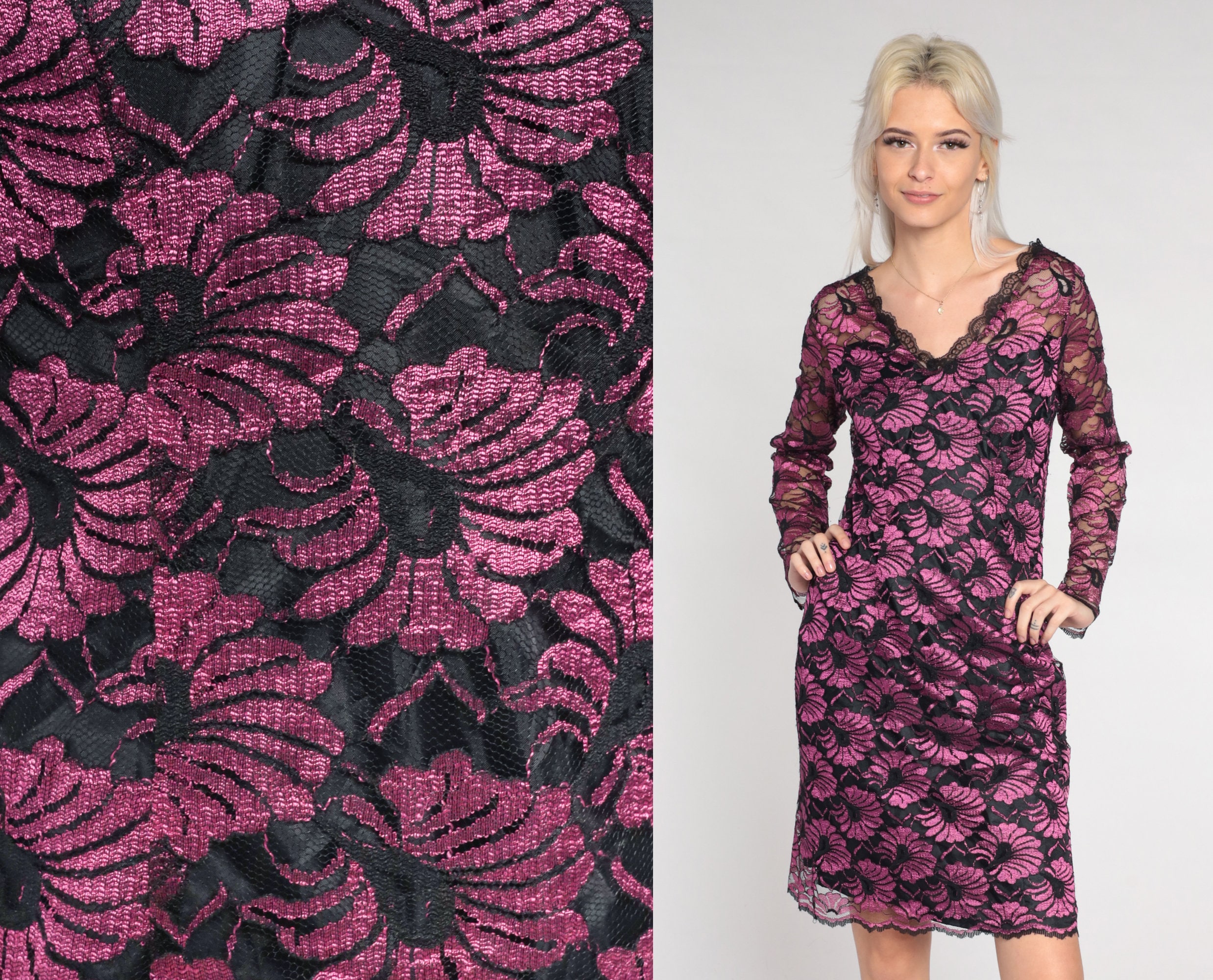 Vintage 90s dress in black and metallic fuchsia floral lace. It has long sheer sleeves and a lace trim v neck. Mini length with a low back and a rear zipper.