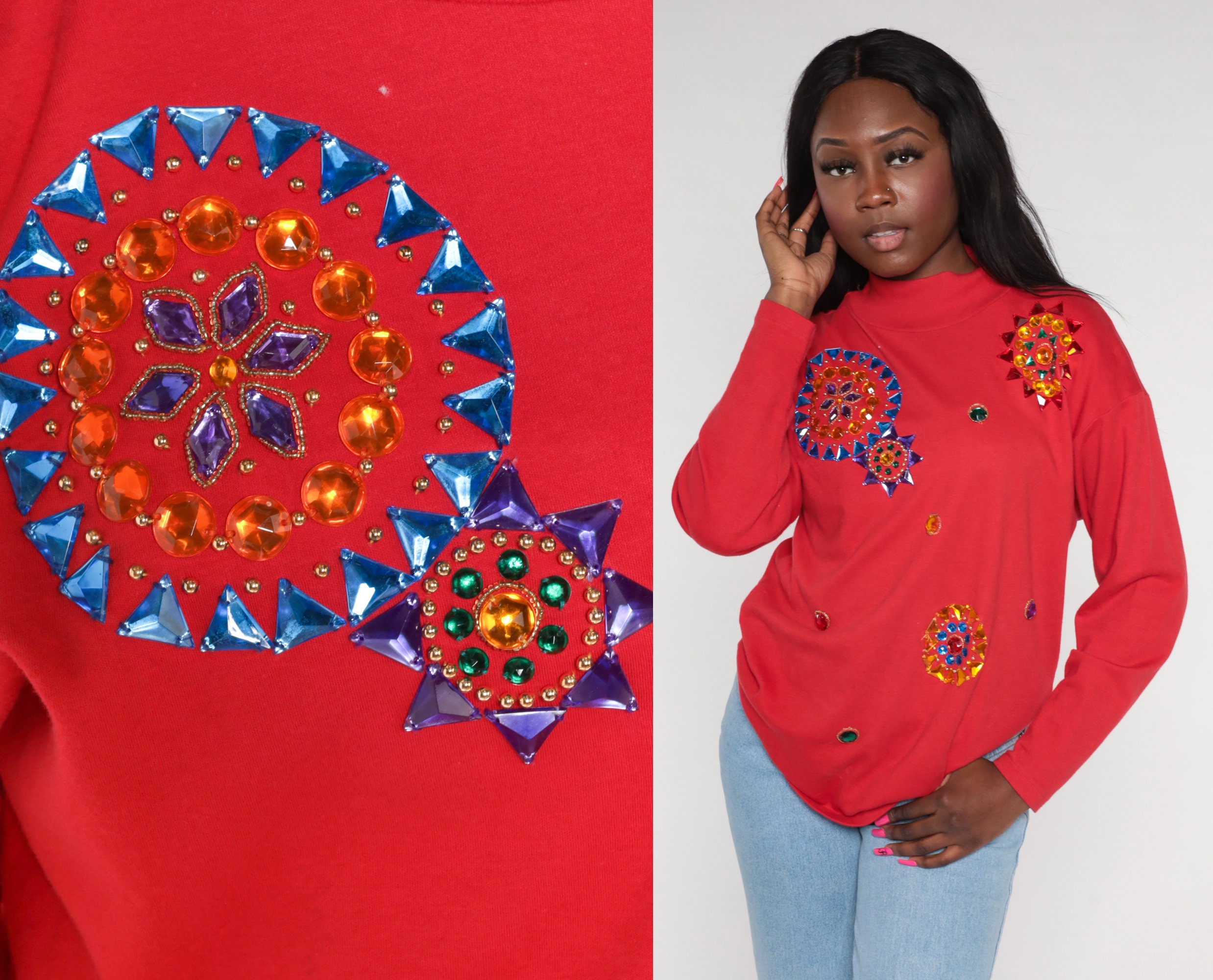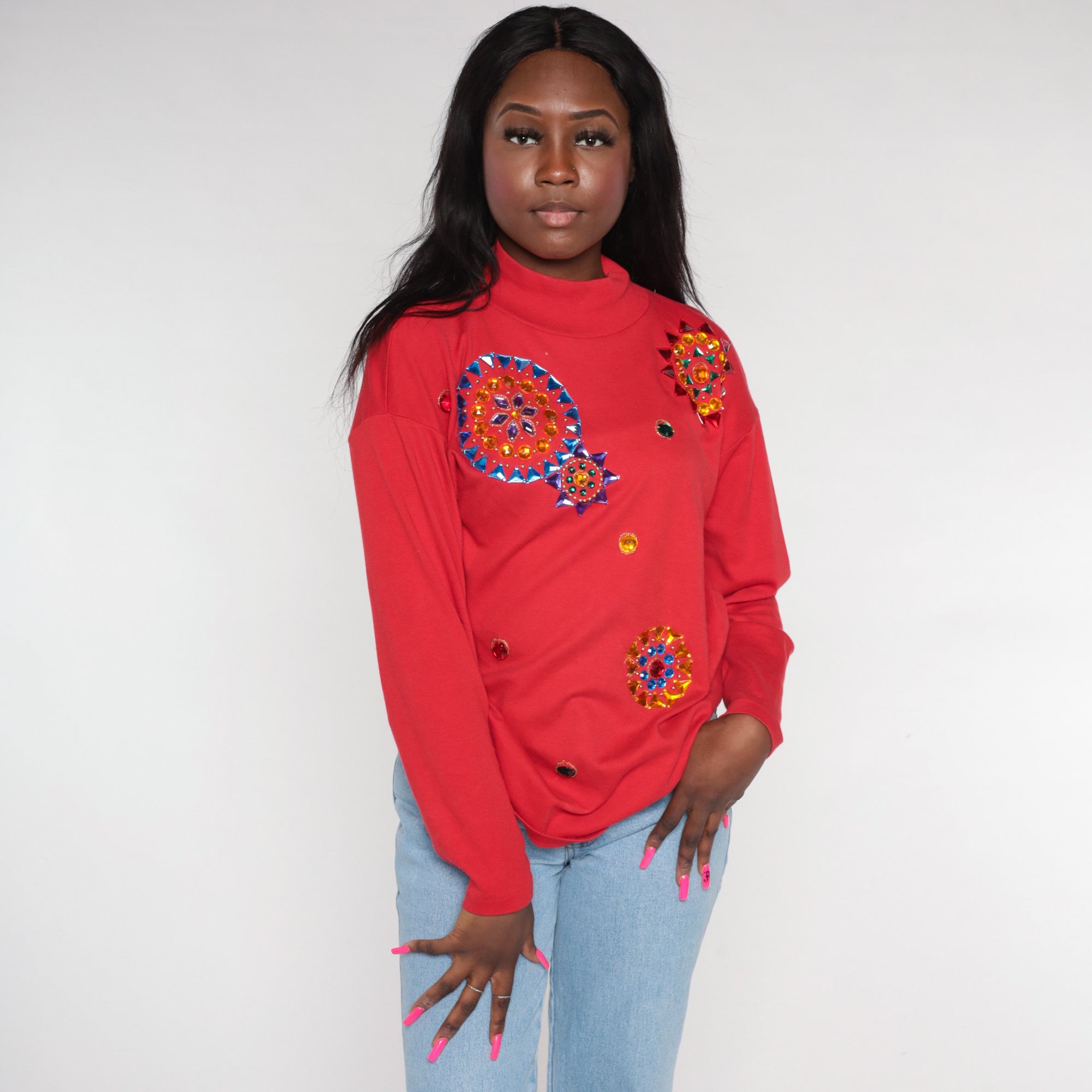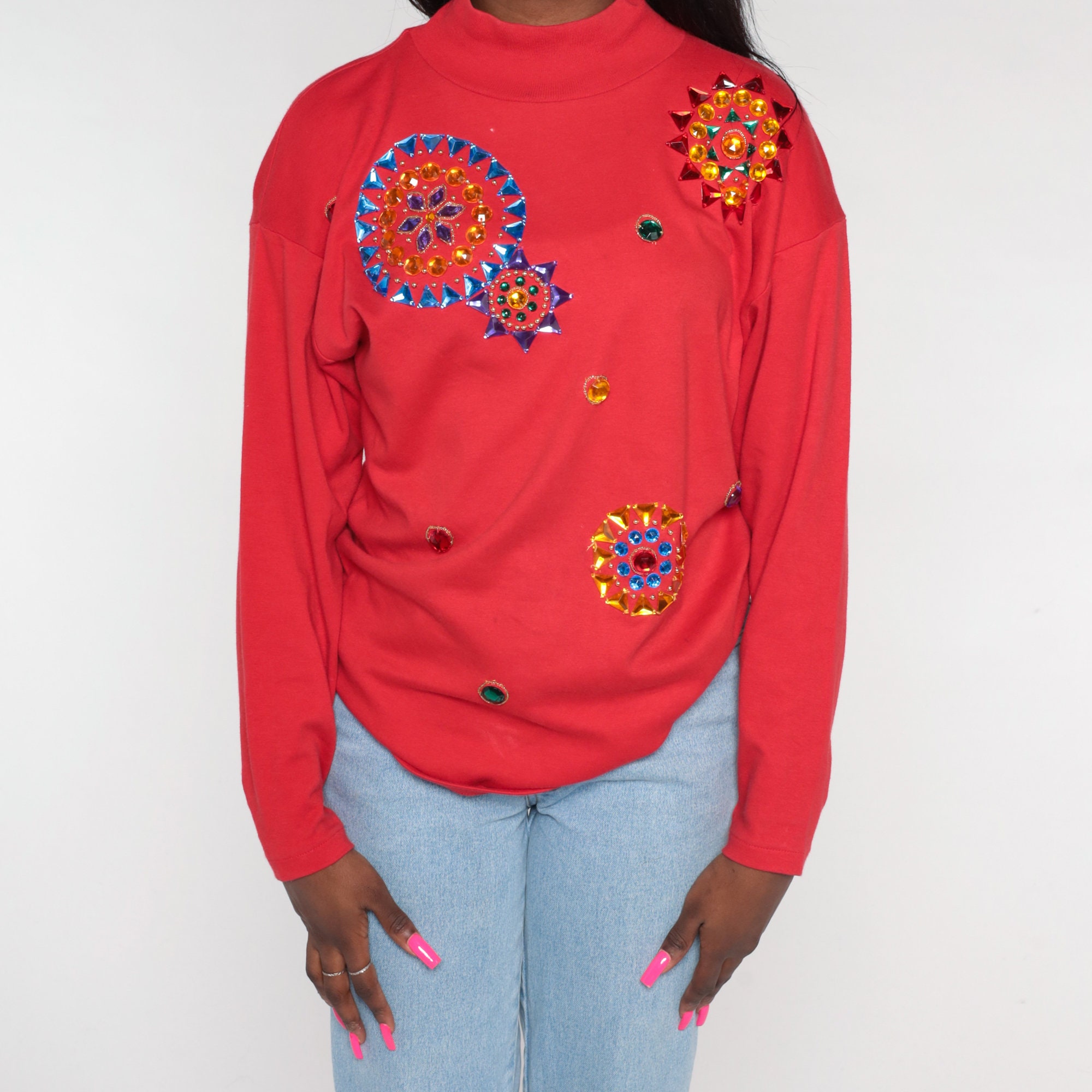 Vintage 90s t shirt in red with long sleeves and rhinestone mandalas.