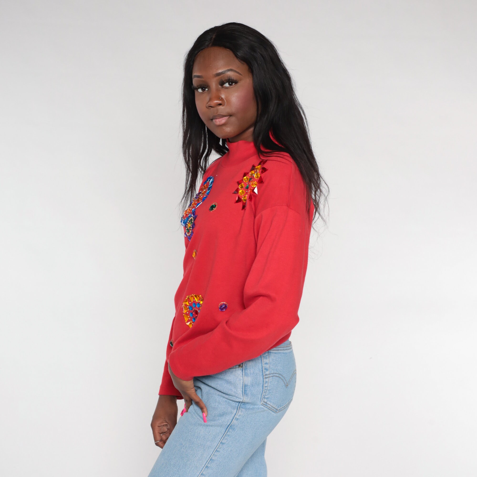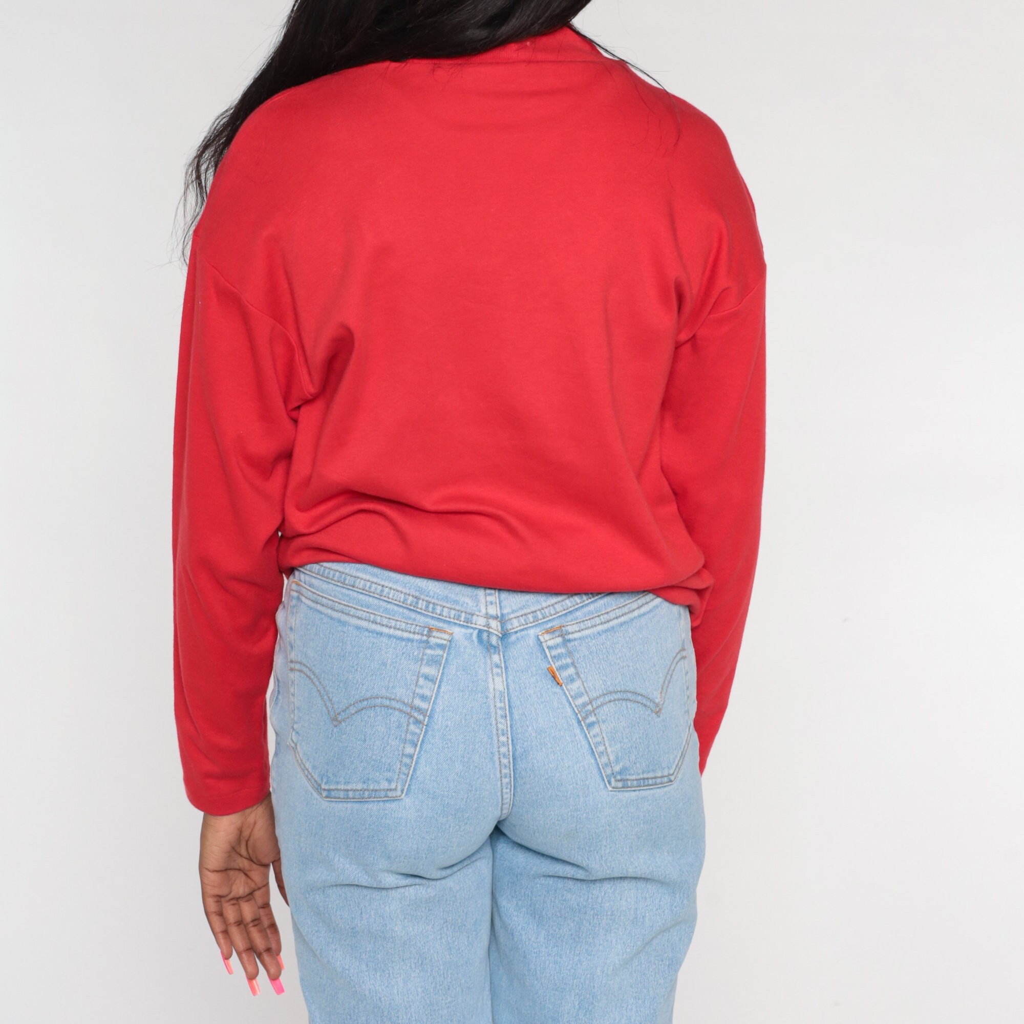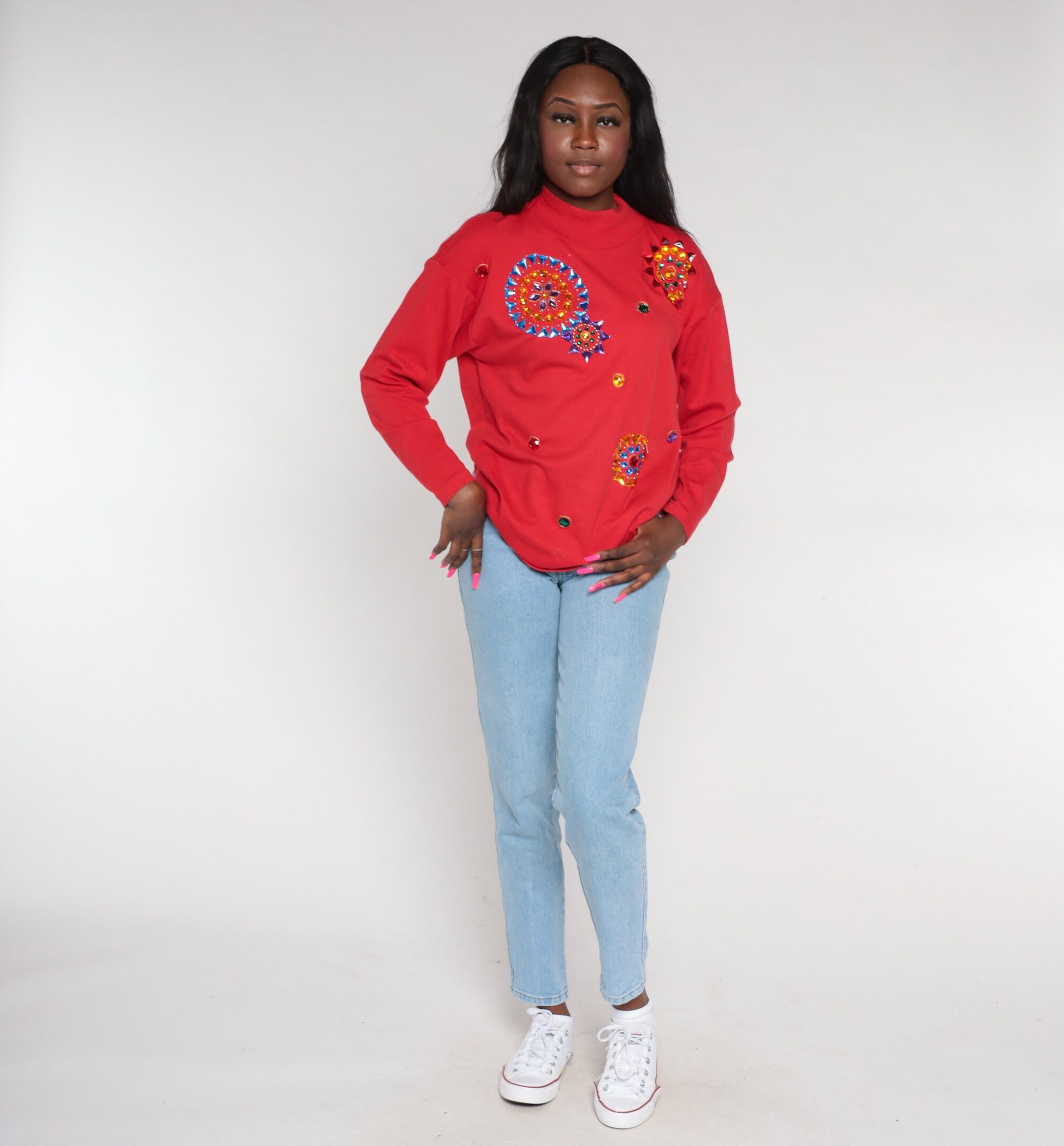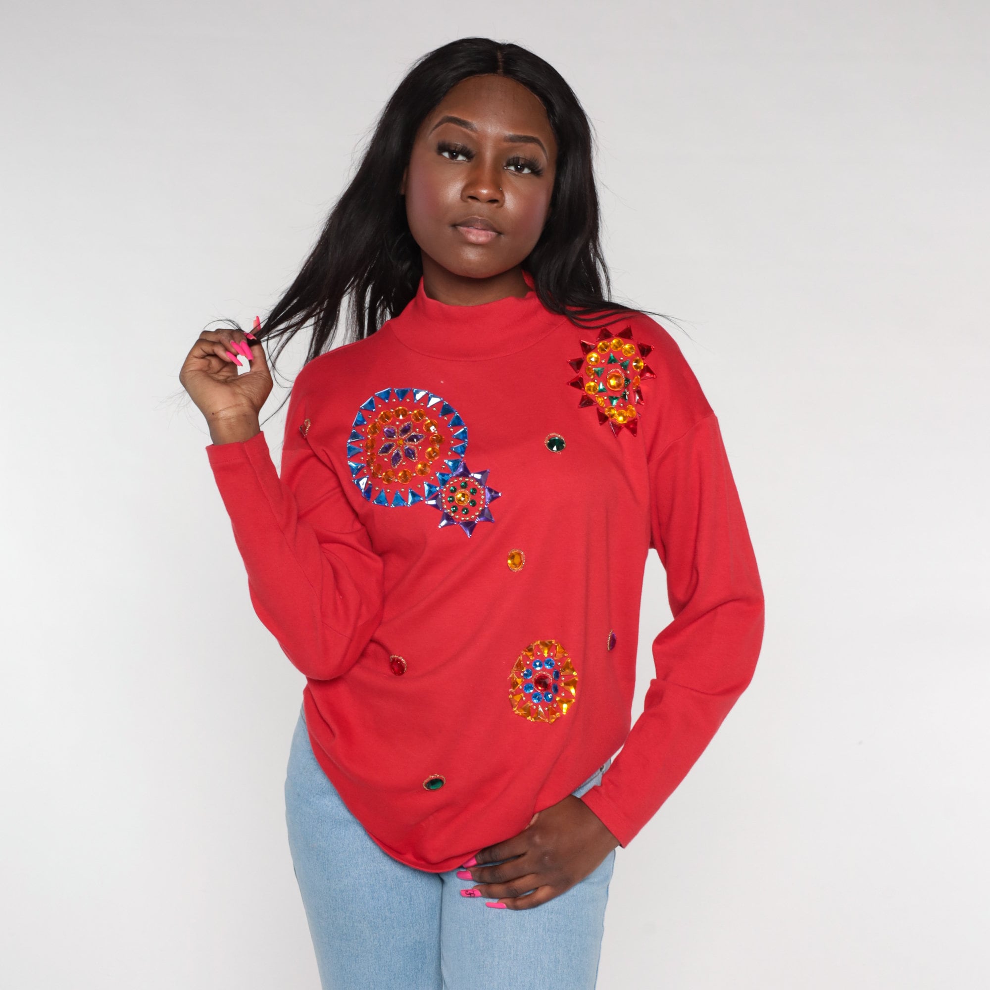 Vintage 90s t shirt in red with long sleeves and rhinestone mandalas.