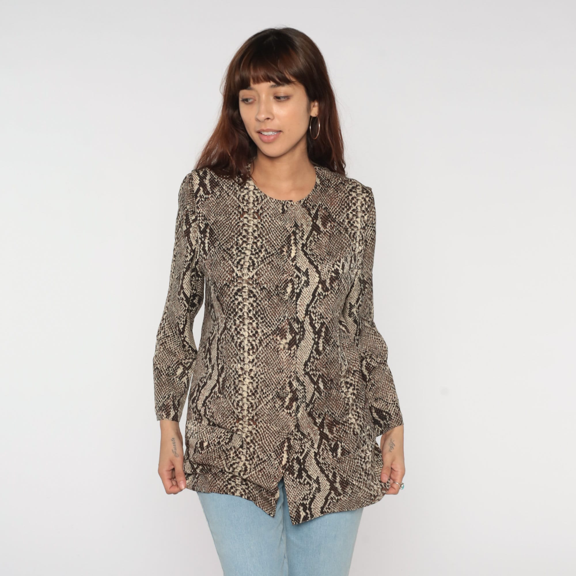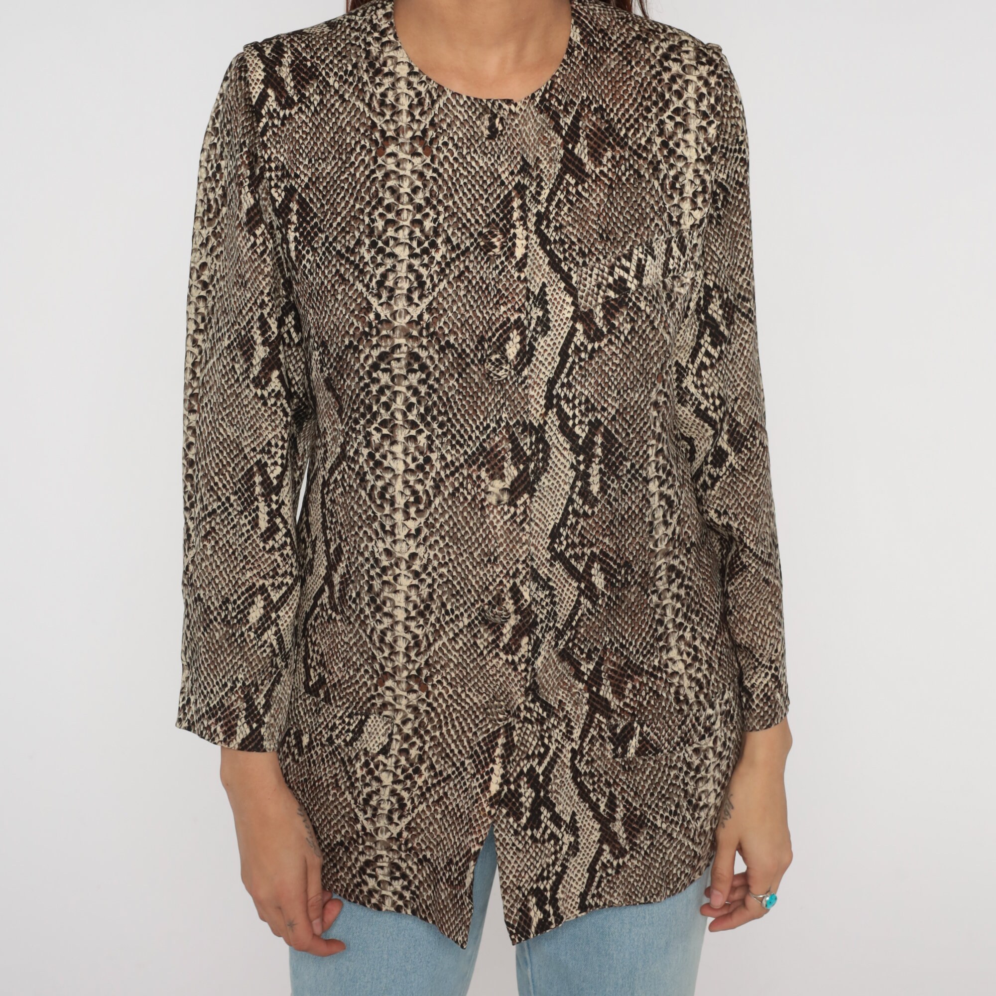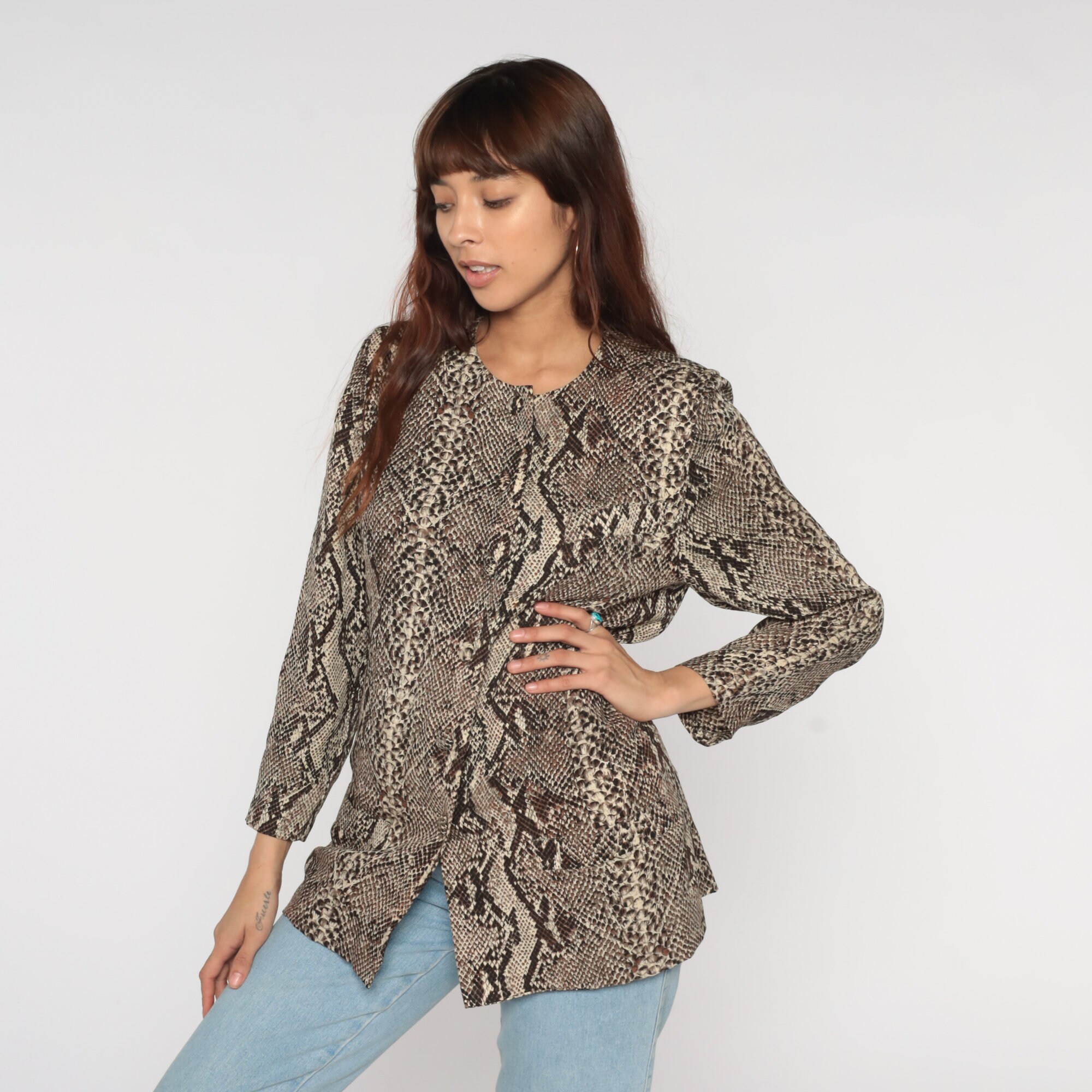 Vintage 80s 90s shirt in a snakeskin scale print with long sleeves and buttons down the front.