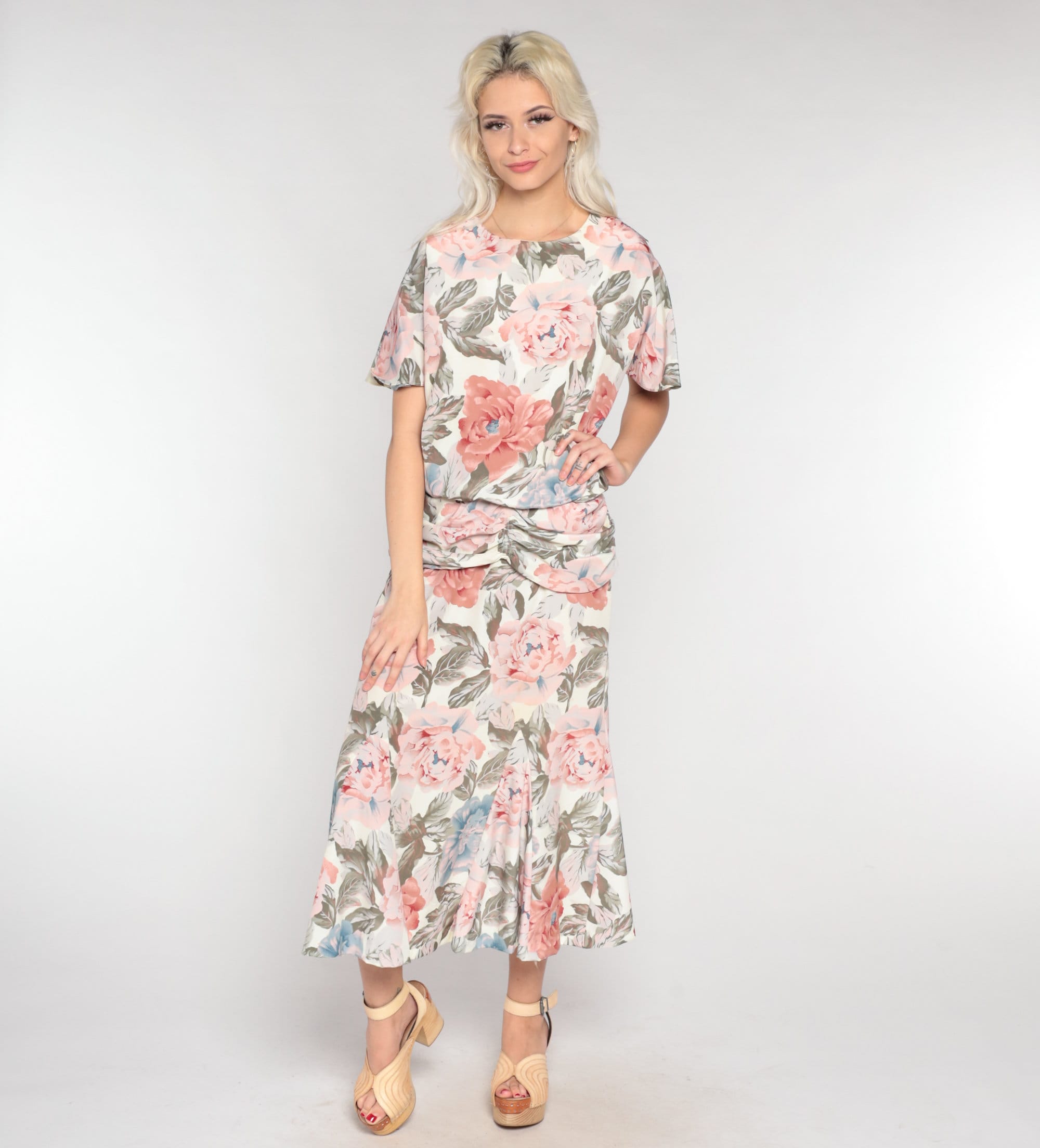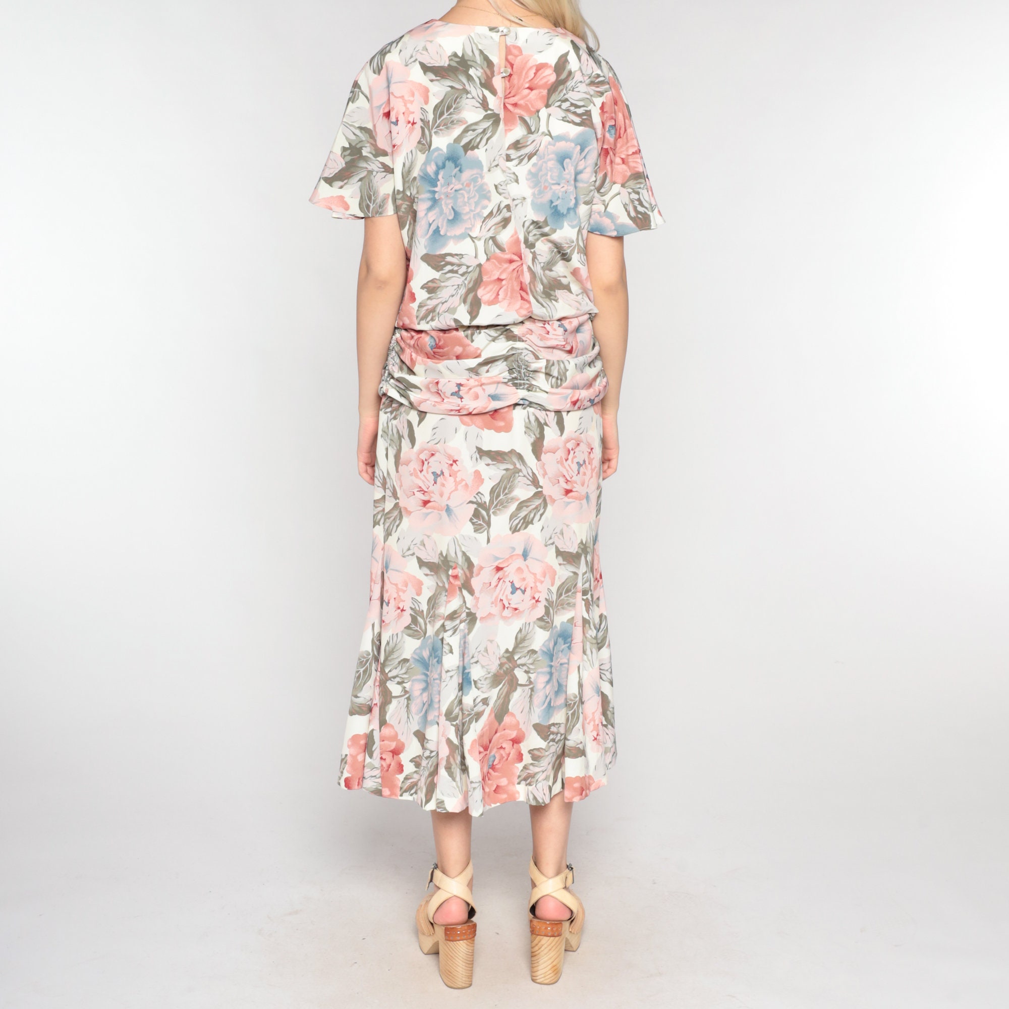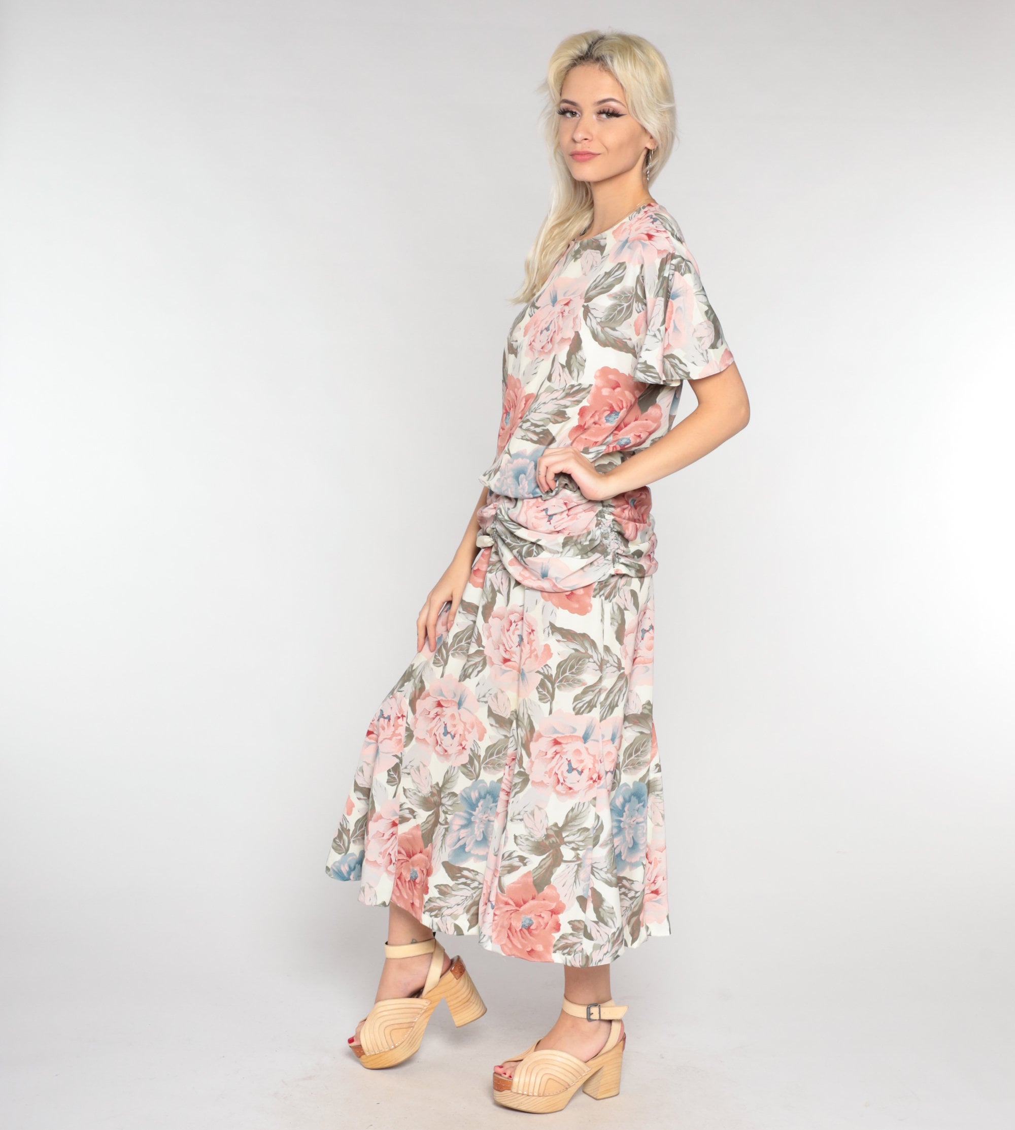 Vintage 90s dress in a floral print with short sleeves and a low draped waist. It has short sleeves and an ankle length skirt with a keyhole button in the back.