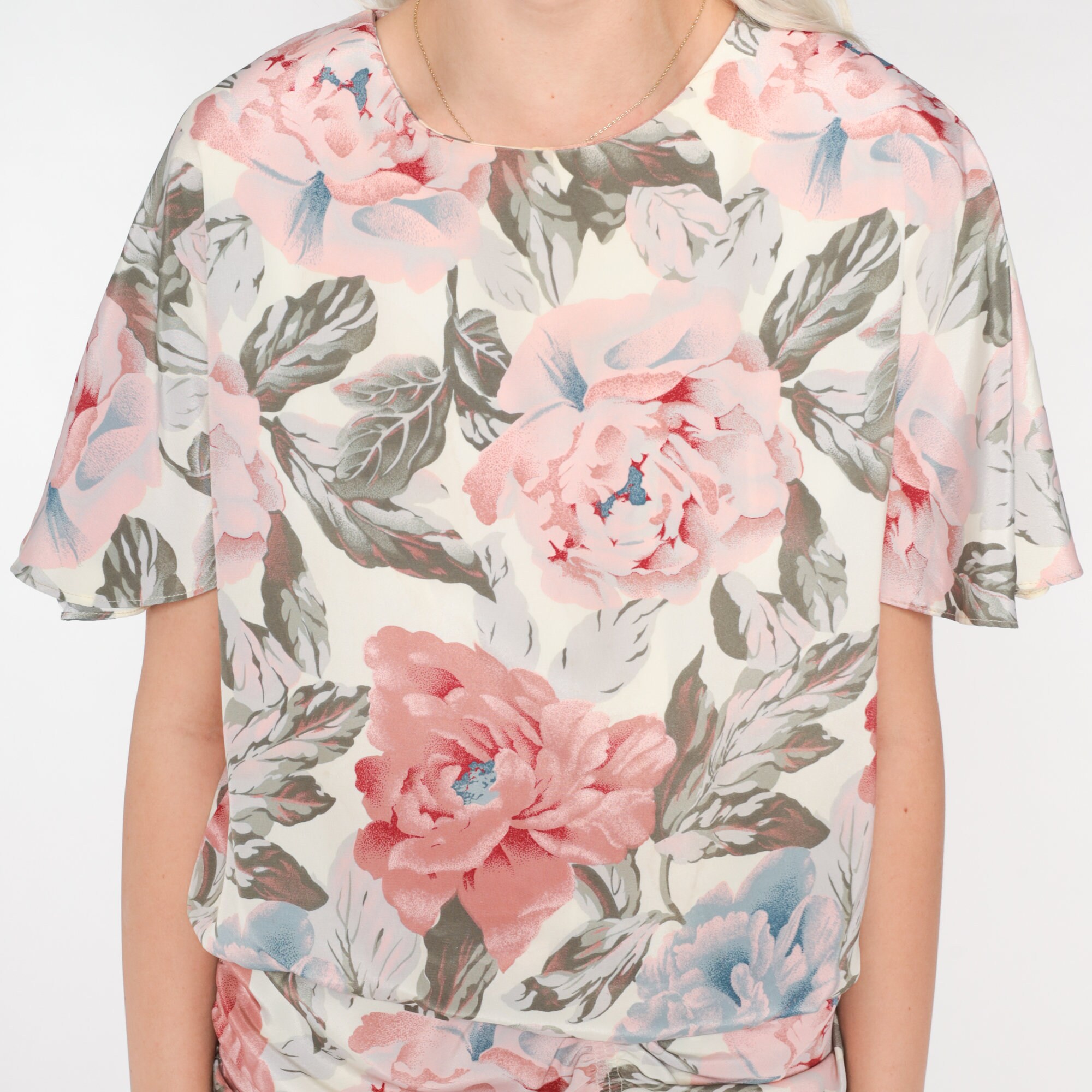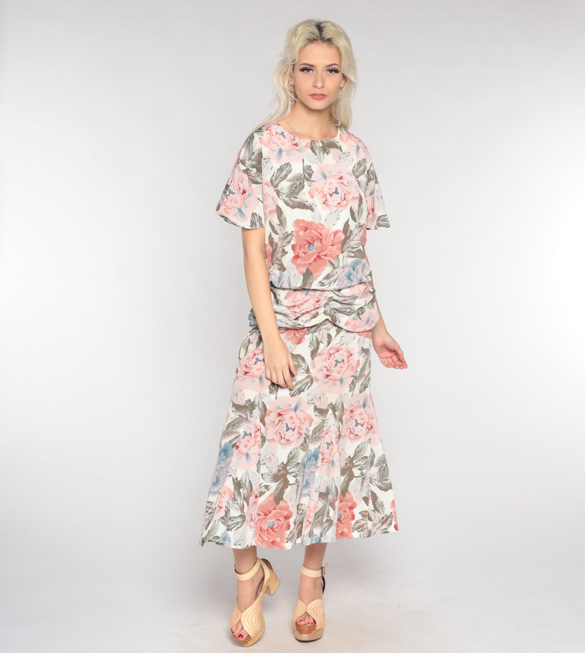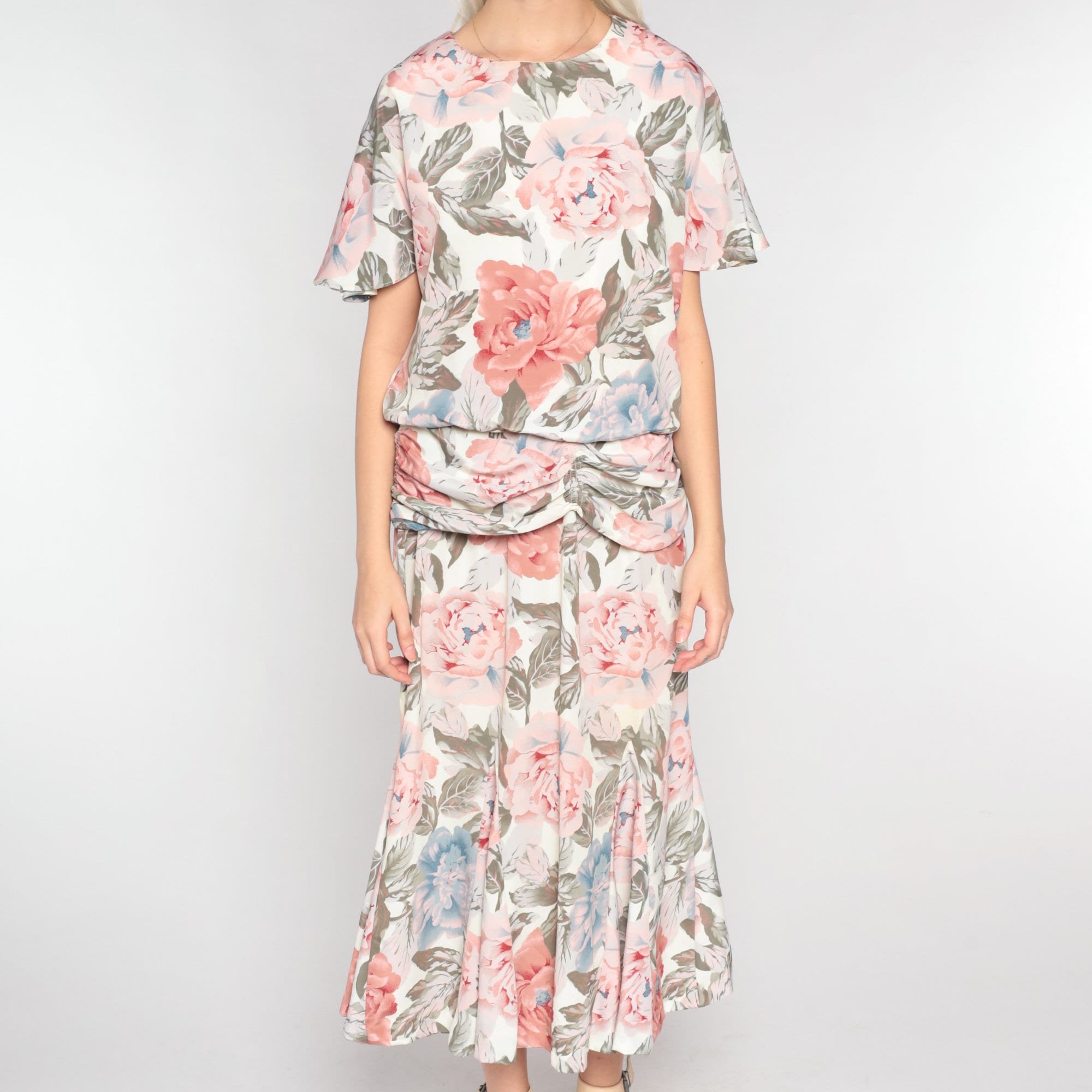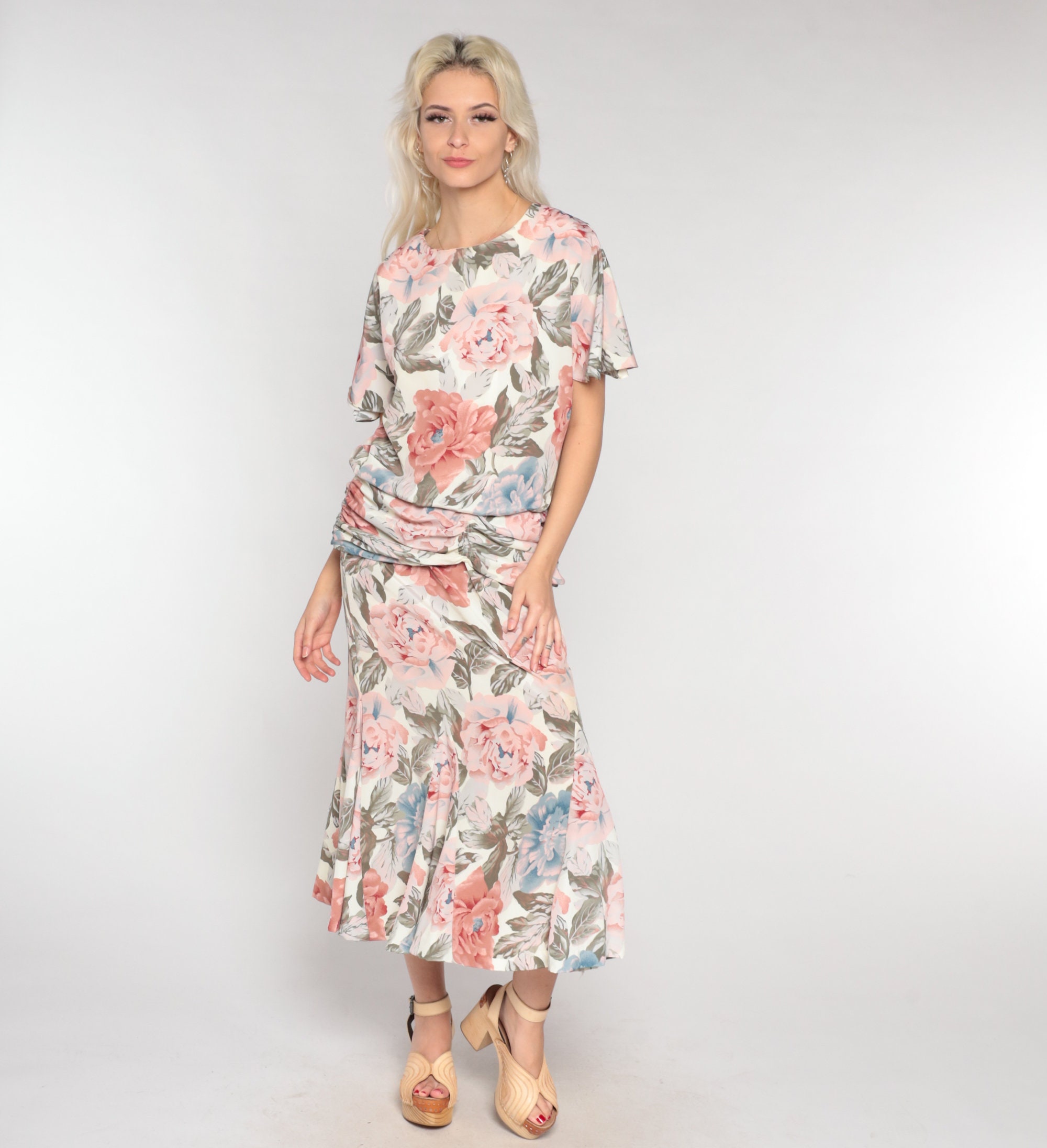 Vintage 90s dress in a floral print with short sleeves and a low draped waist. It has short sleeves and an ankle length skirt with a keyhole button in the back.