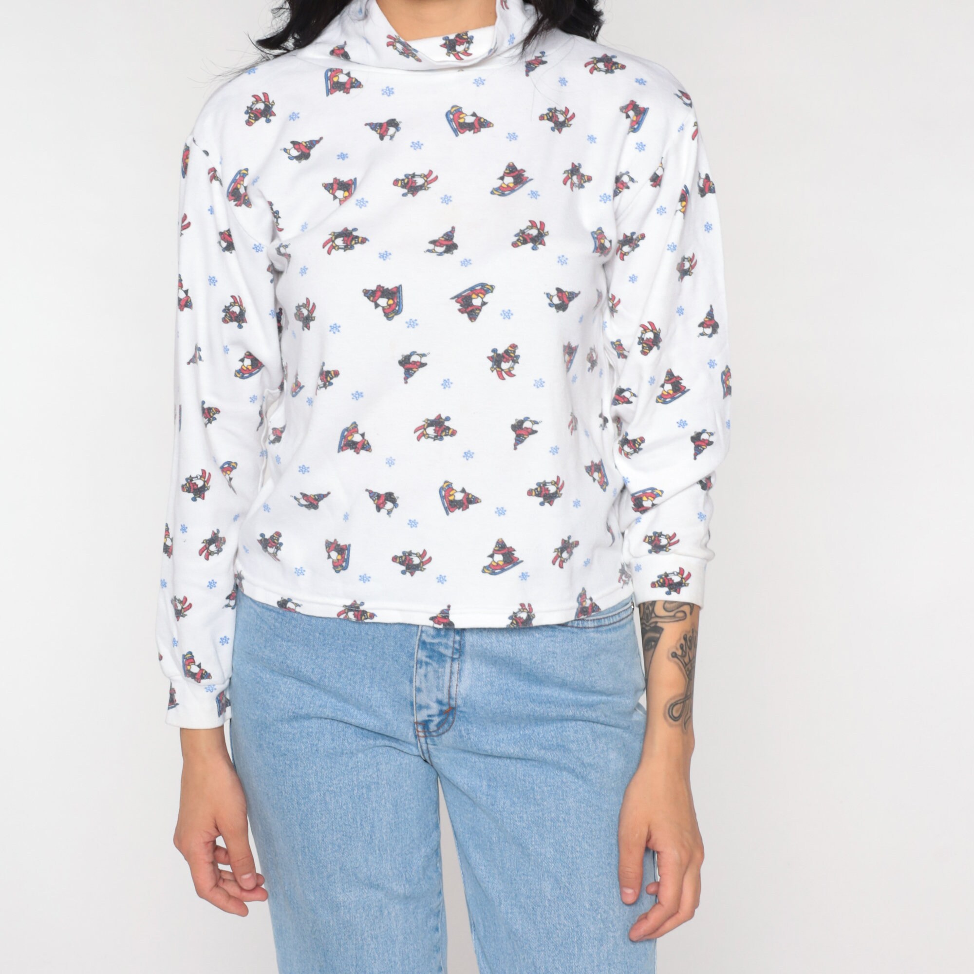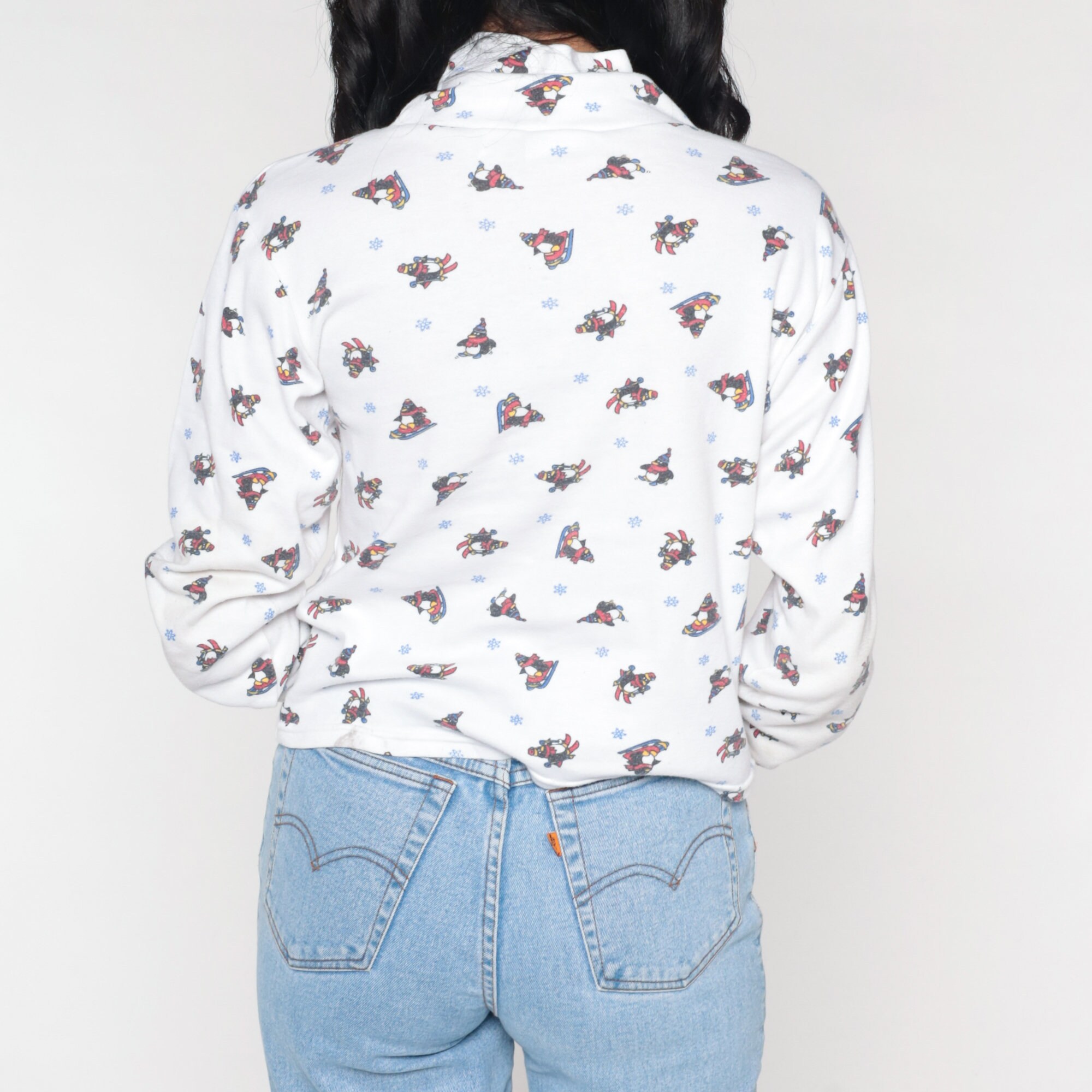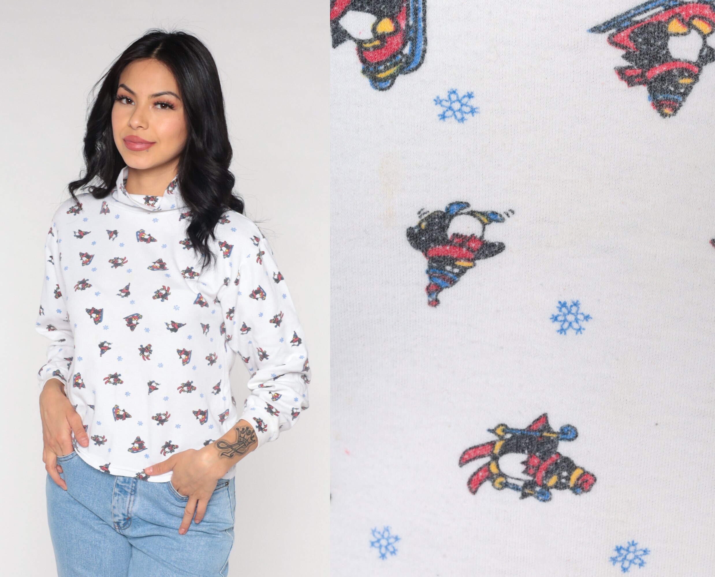 Vintage 00s shirt in white with sledding penguins and snowflakes throughout.