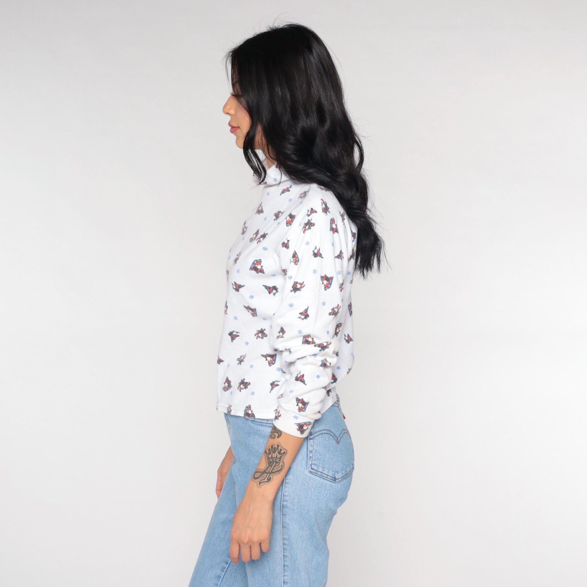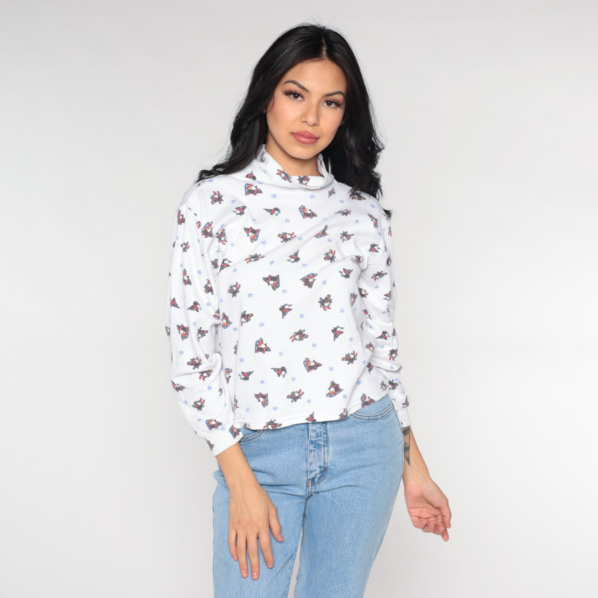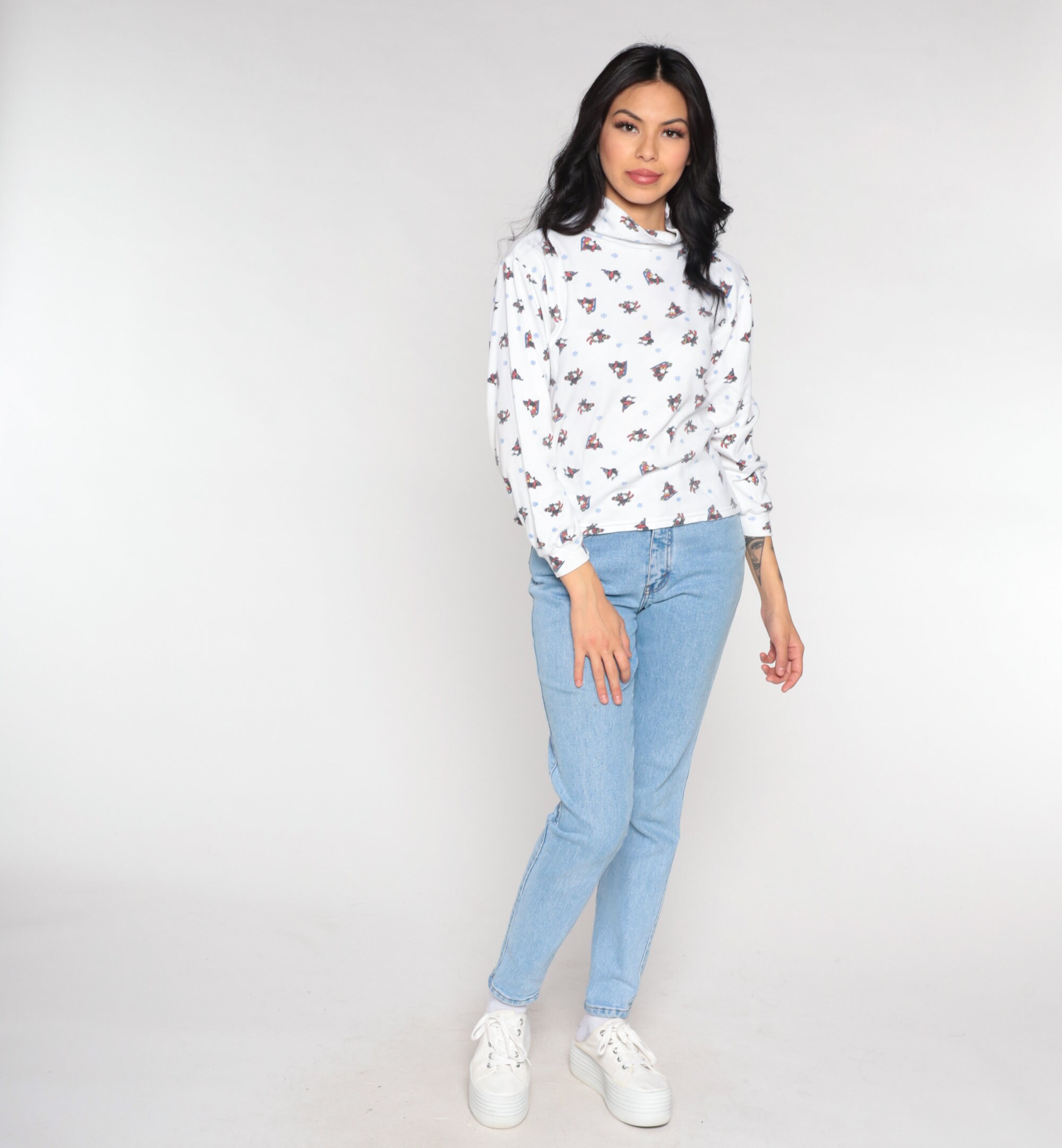 Vintage 00s shirt in white with sledding penguins and snowflakes throughout.