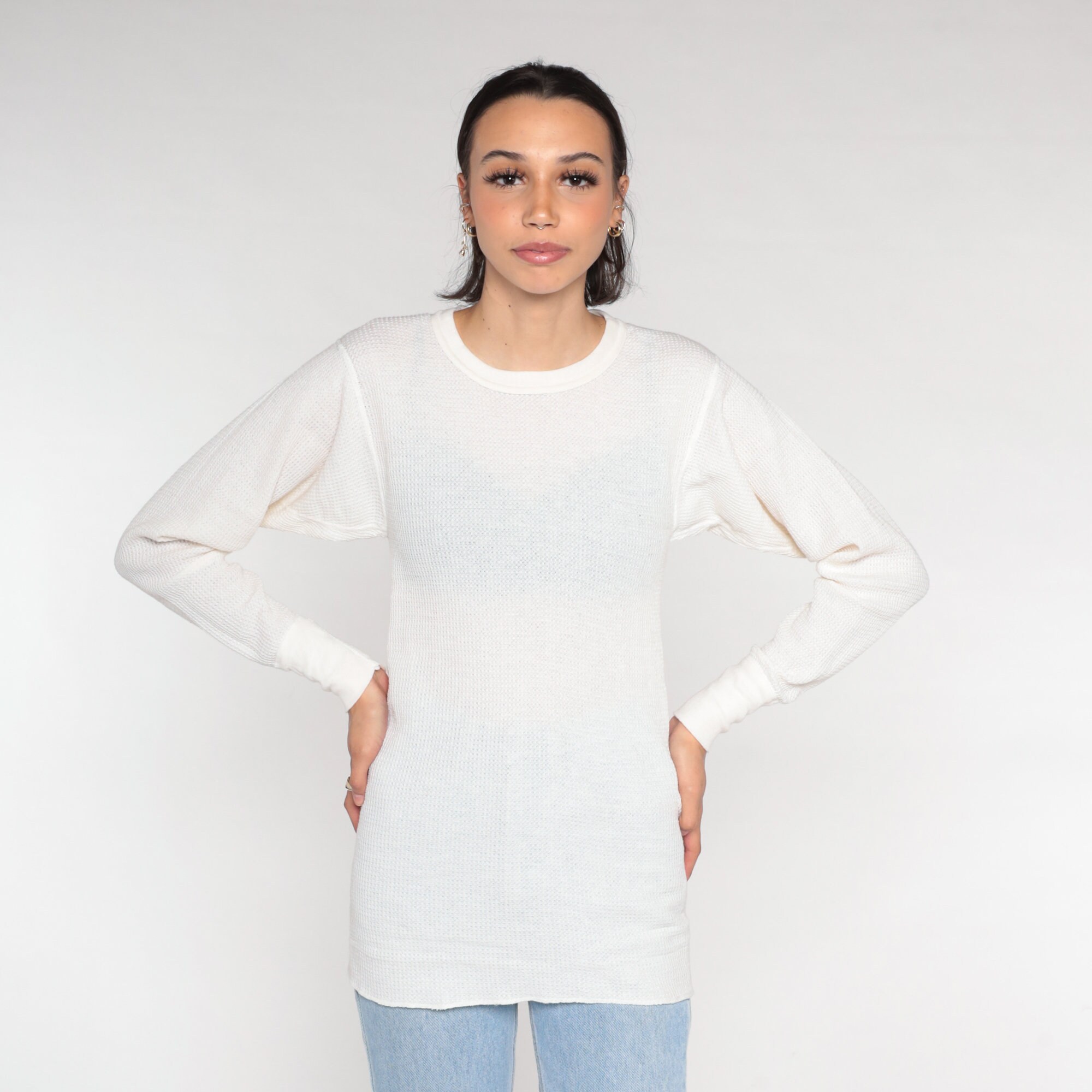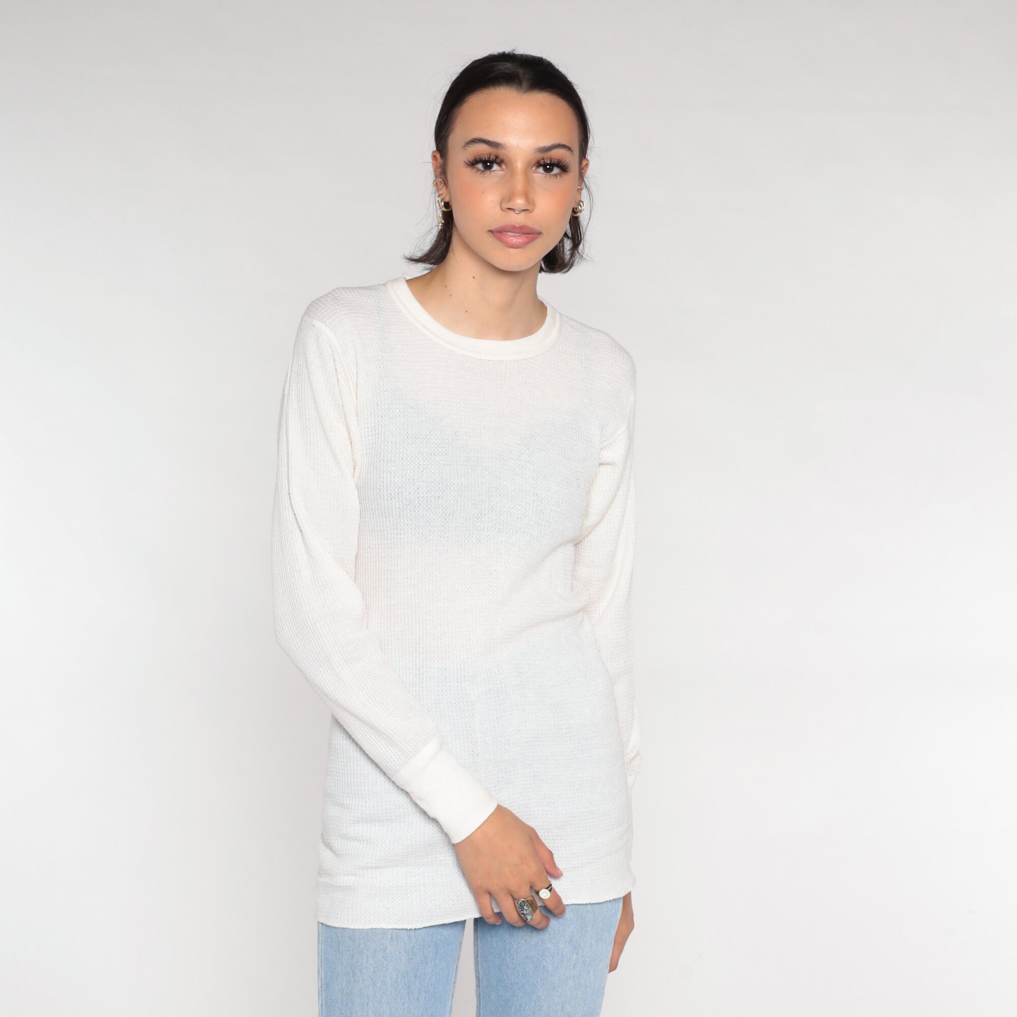 Vintage 80s shirt in white thermal waffle knit.