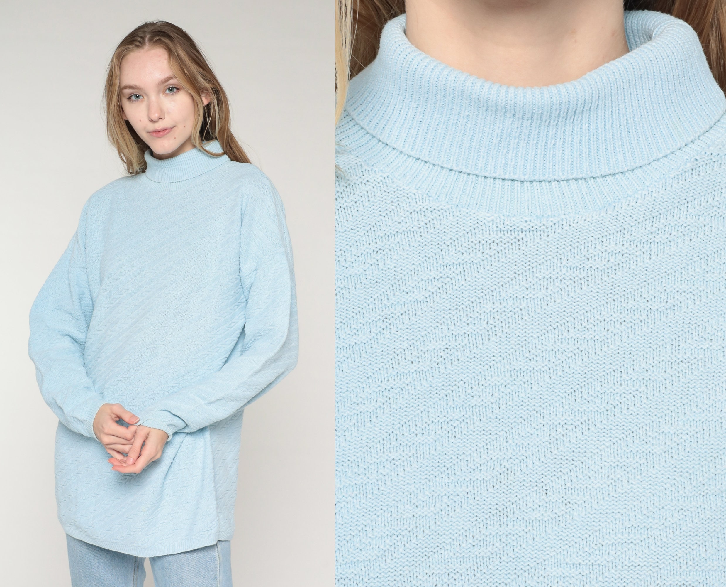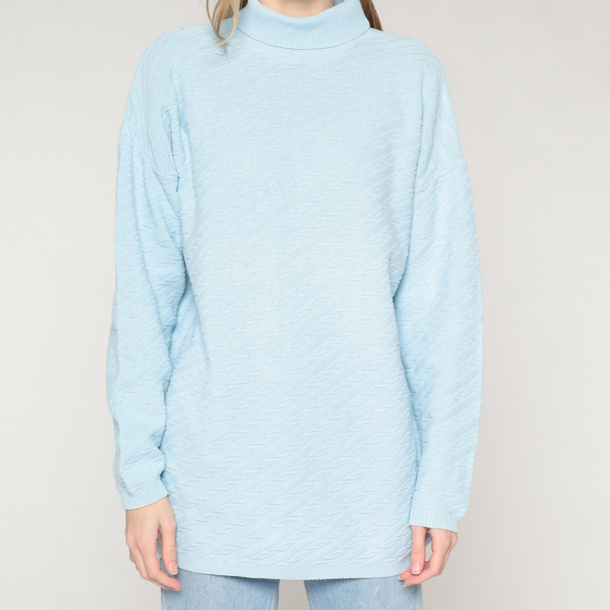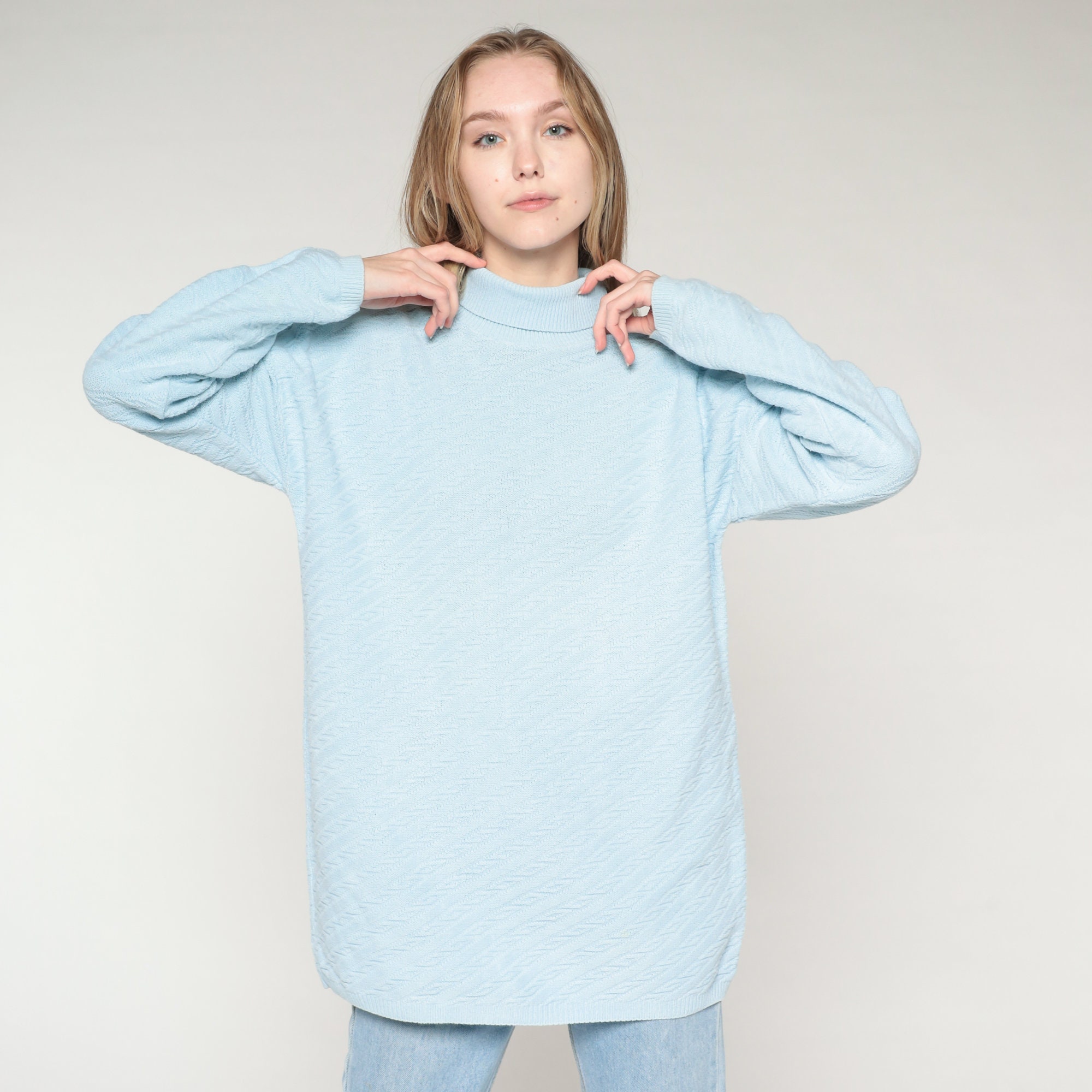 Vintage 90s sweater in sky blue textured knit with a turtleneck.