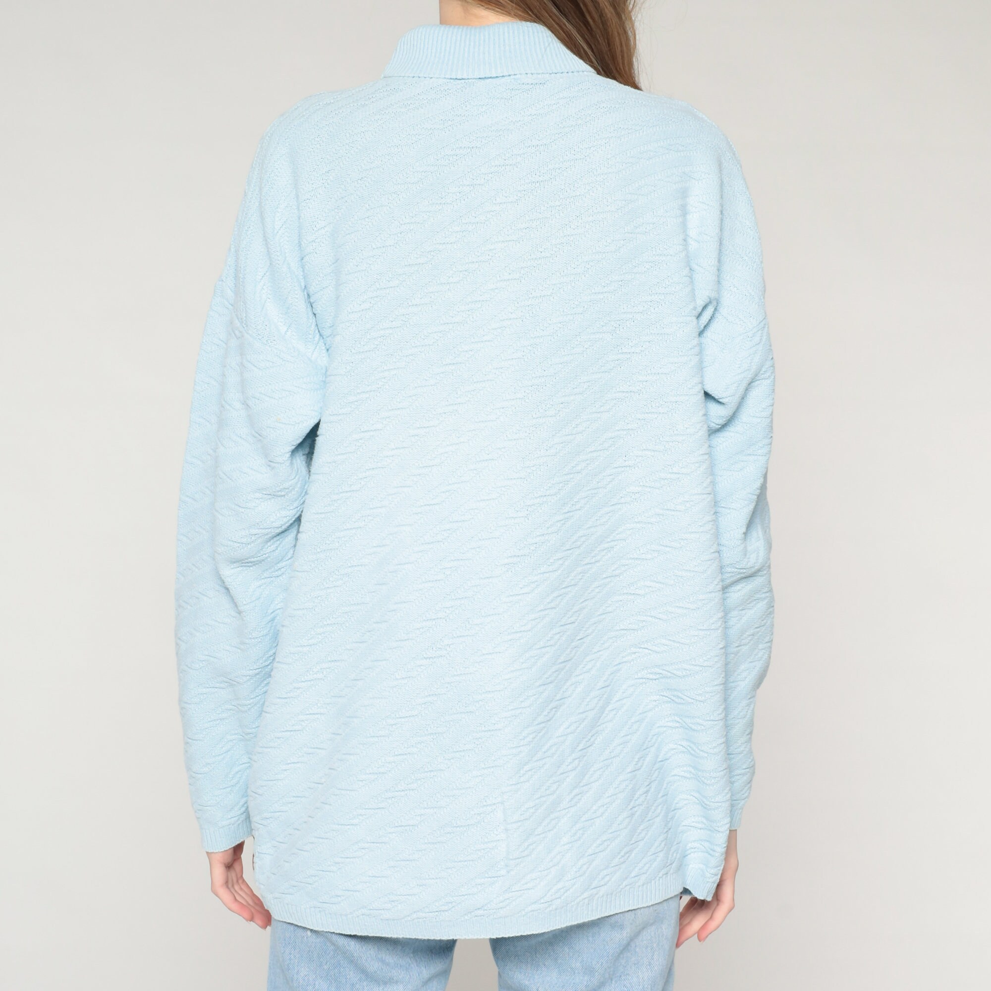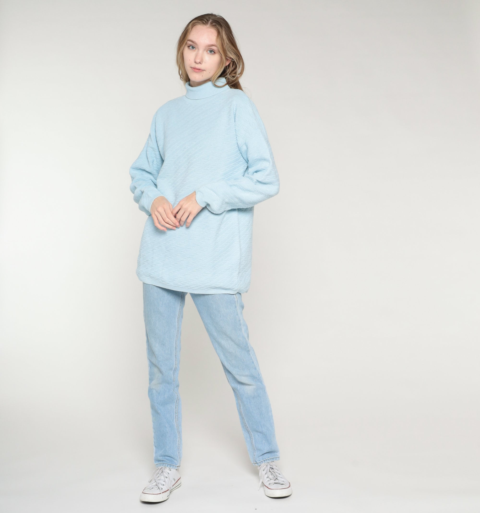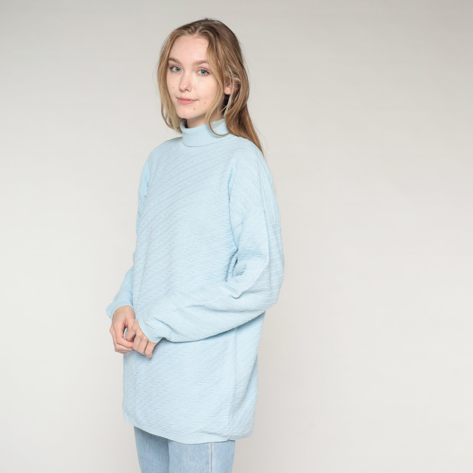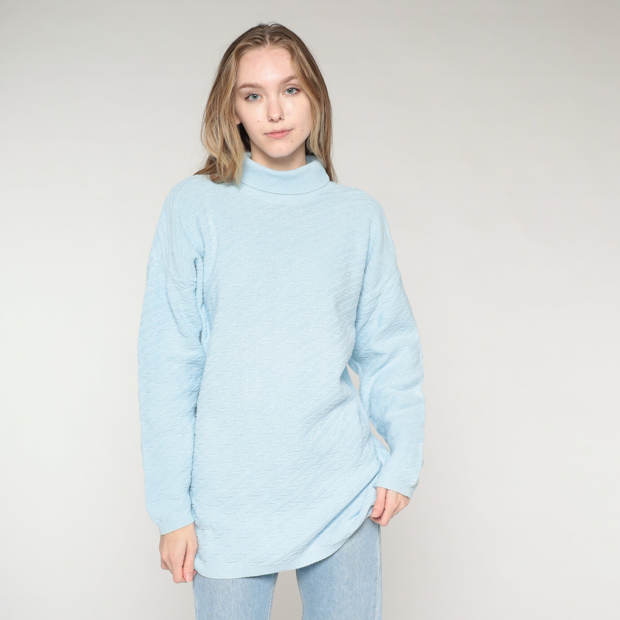 Vintage 90s sweater in sky blue textured knit with a turtleneck.