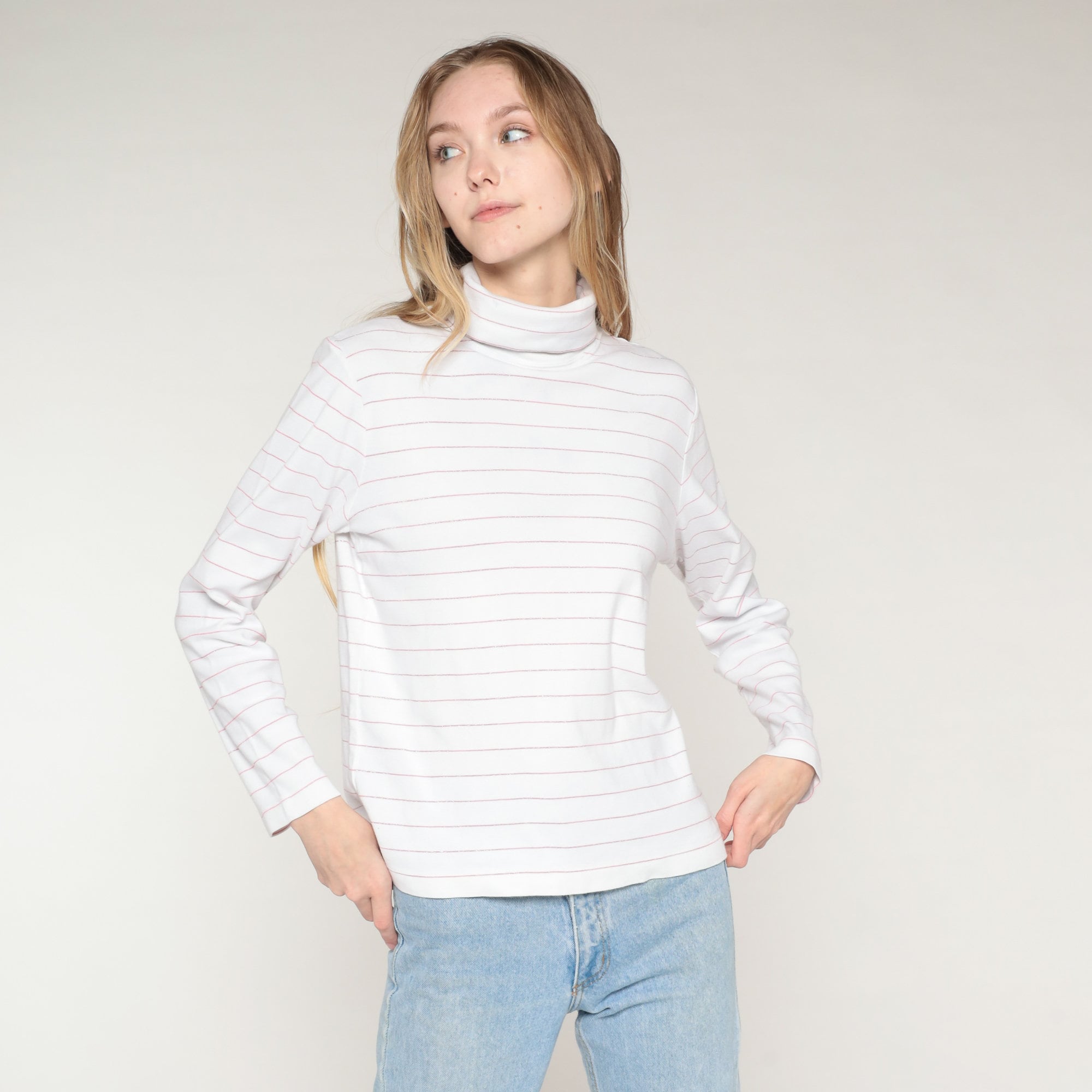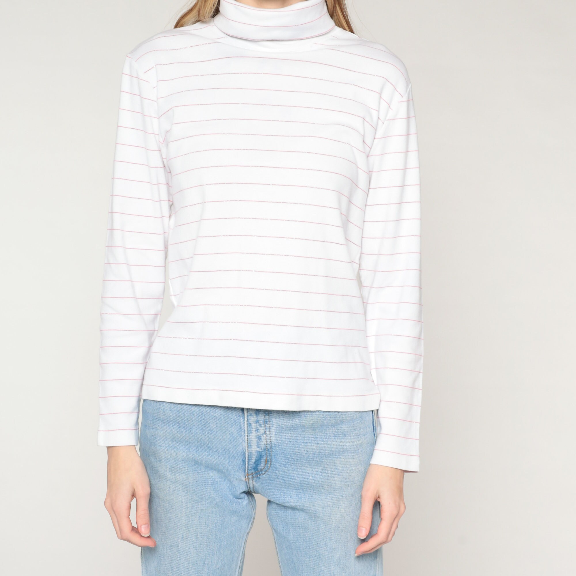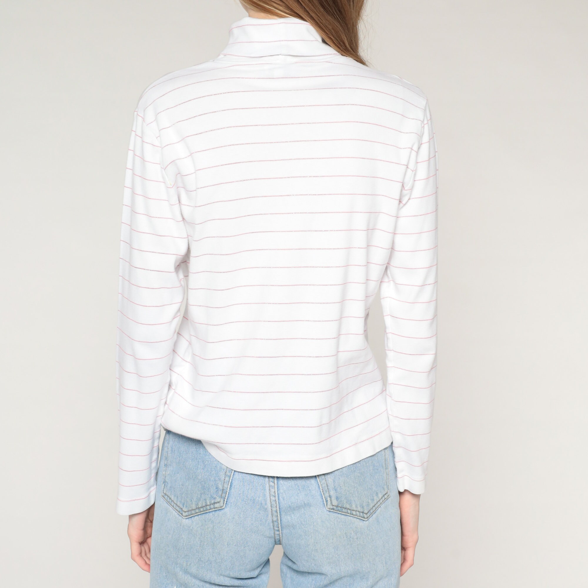 Vintage 90s shirt in white with sparkly pink stripes. It has a turtleneck and long sleeves.